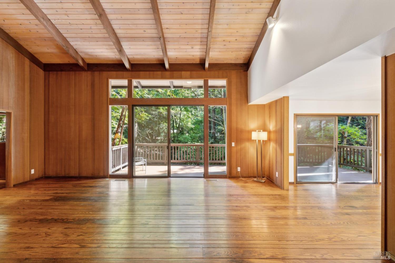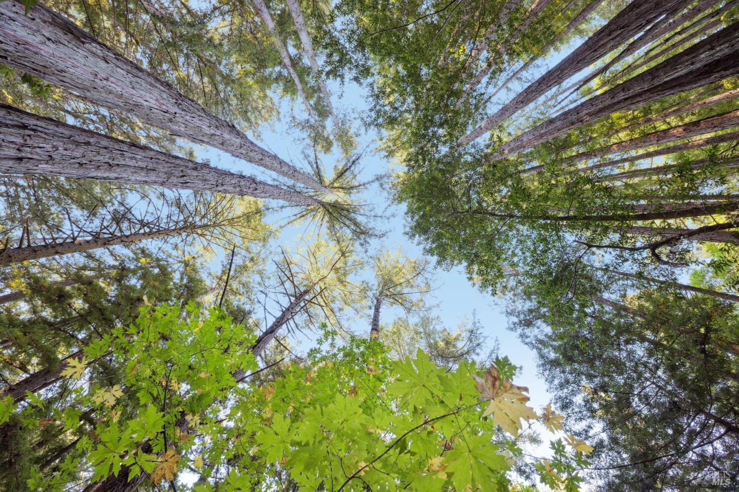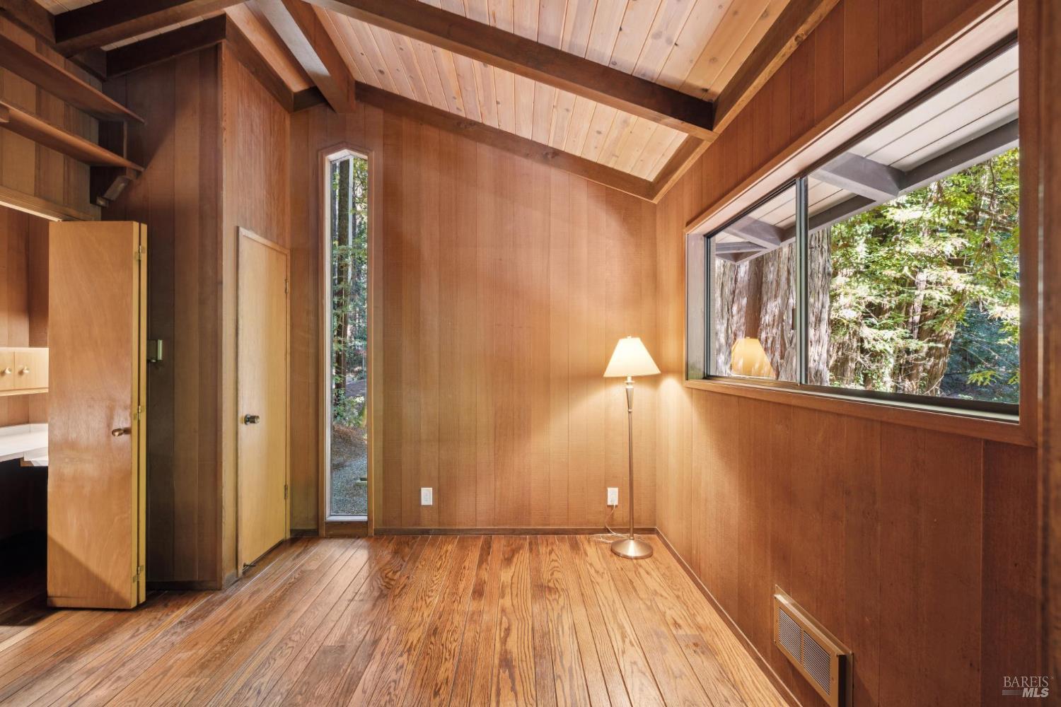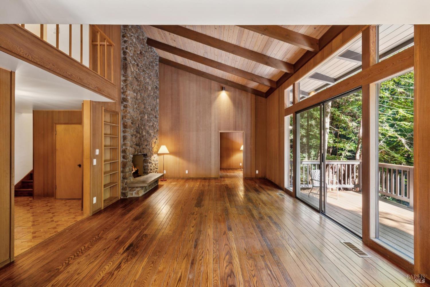 Surrounded by towering redwoods, this architecturally distinct home captures the essence of tranquility and design in a natural setting. Resting on approximately 9.8 acres with a year-round creek, this private retreat combines timeless mid-century style with the serenity of Marin's redwood forest. The two-story residence offers 2,047 sq ft of living space and an additional 1,297 sq ft of versatile structures including a detached workshop, cabin, and shed. Vaulted open-beam ceilings, warm wood paneling, and expansive windows create a stunning focal point in the main living area where natural light floods the space and glass doors open to an inviting wraparound deck. The kitchen offers custom wood cabinetry, tiled counters, and direct deck access for seamless indoor-outdoor living. Upstairs, the primary suite features a private balcony overlooking the forest, while additional bedrooms and an office provide flexible living or workspace options. The property includes a private bridge over the creek, a workshop with skylights, and multiple trails that weave through the redwoods. Offering both peace and inspiration, this nearly 9.8-acre sanctuary feels worlds away yet remains just minutes from Nicasio, West Marin, and Lucas Valley conveniences.