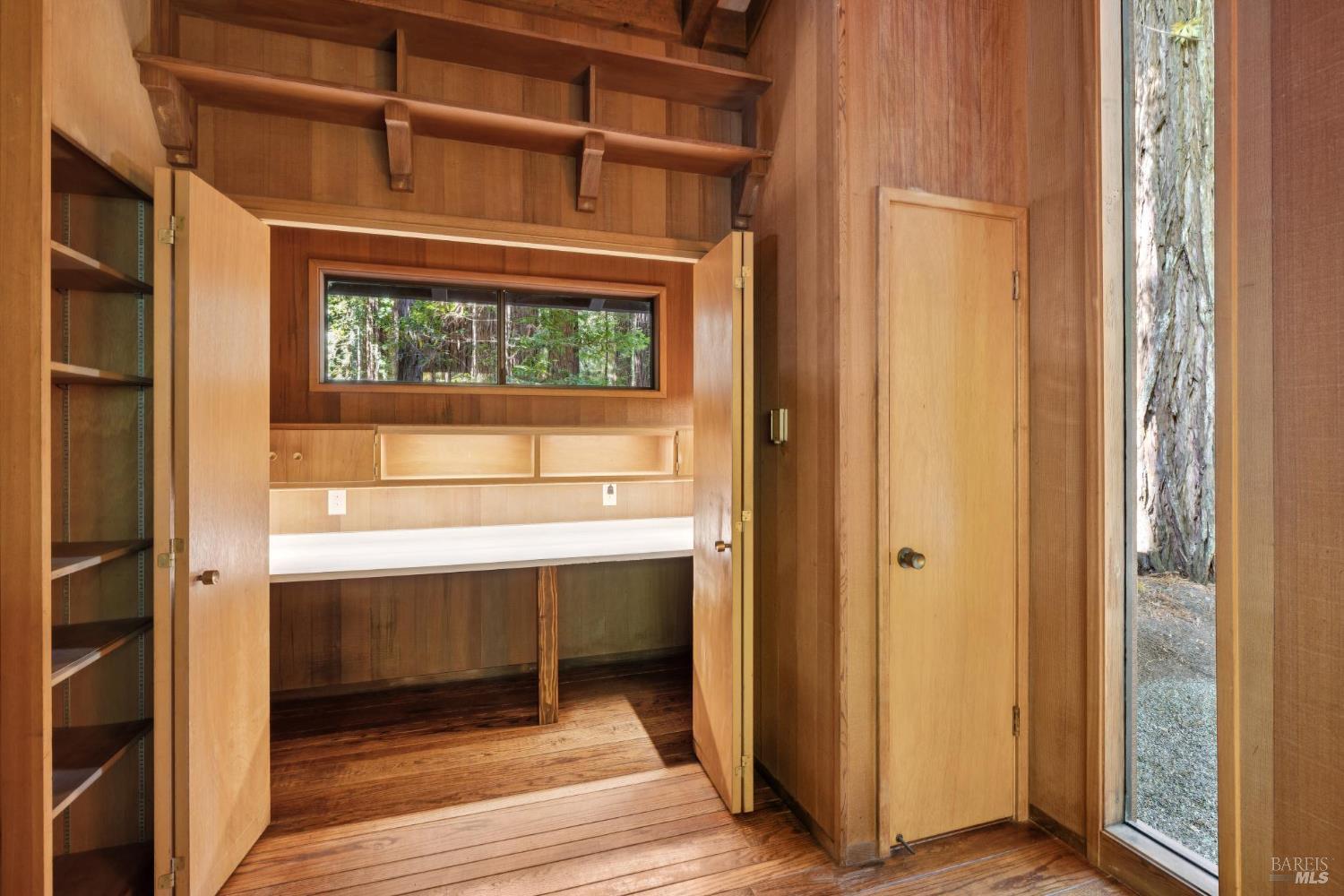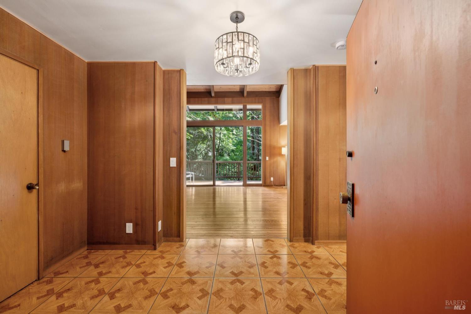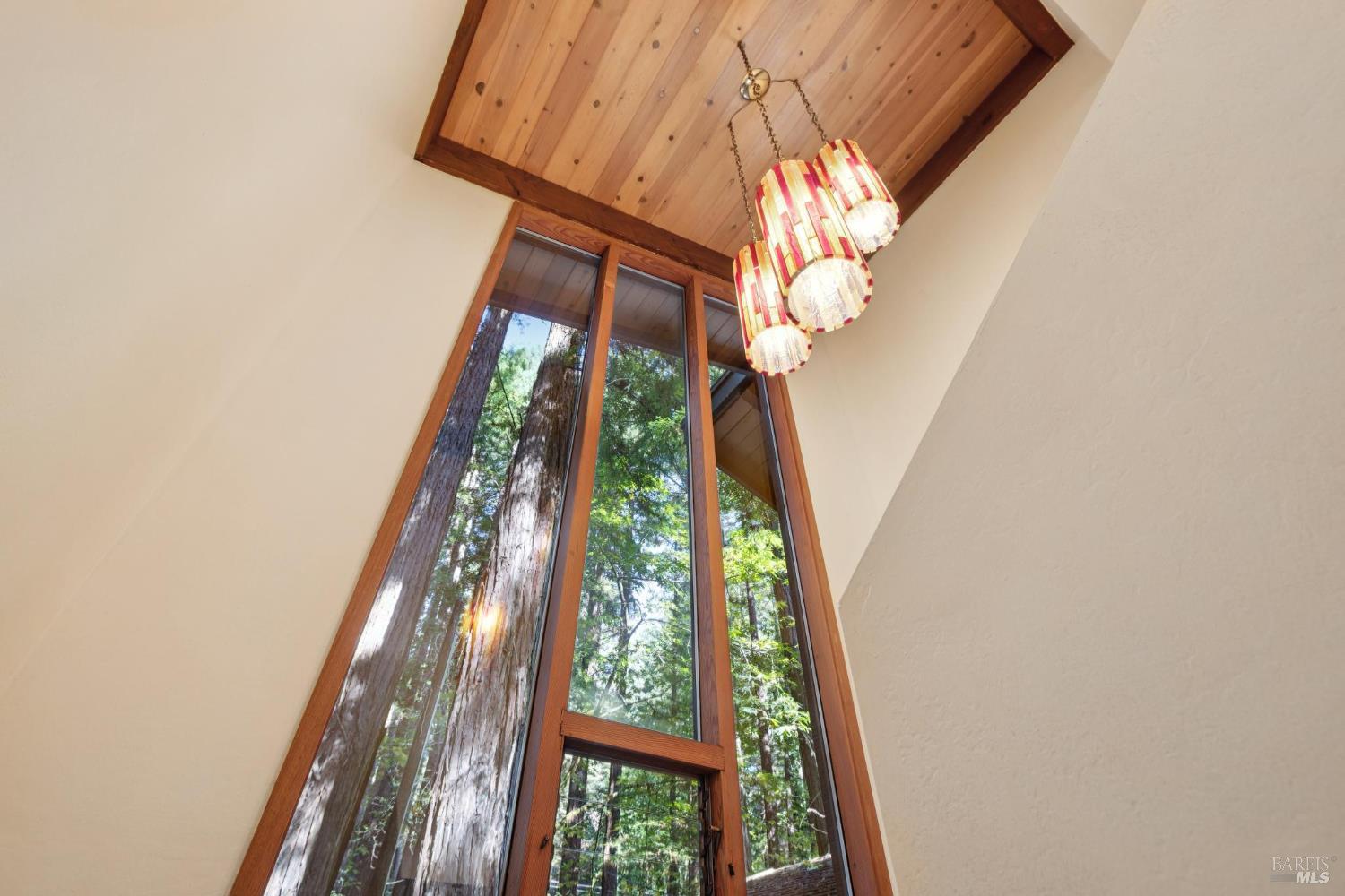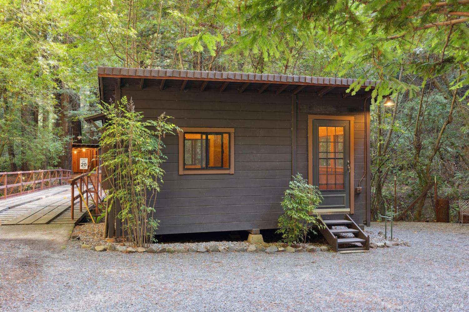Surrounded by towering redwoods, this architecturally distinct home captures the essence of tranquility and design in a natural setting. Resting on approximately 9.8 acres with a year-round creek, this private retreat combines timeless mid-century style with the serenity of Marin's redwood forest. The two-story residence offers 2,047 sq ft of living space and an additional 1,297 sq ft of versatile structures including a detached workshop, cabin, and shed. Vaulted open-beam ceilings, warm wood paneling, and expansive windows create a stunning focal point in the main living area where natural light floods the space and glass doors open to an inviting wraparound deck. The kitchen offers custom wood cabinetry, tiled counters, and direct deck access for seamless indoor-outdoor living. Upstairs, the primary suite features a private balcony overlooking the forest, while additional bedrooms and an office provide flexible living or workspace options. The property includes a private bridge over the creek, a workshop with skylights, and multiple trails that weave through the redwoods. Offering both peace and inspiration, this nearly 9.8-acre sanctuary feels worlds away yet remains just minutes from Nicasio, West Marin, and Lucas Valley conveniences.