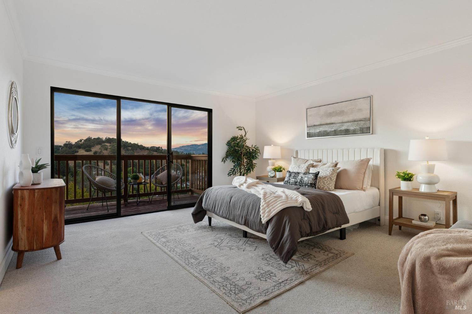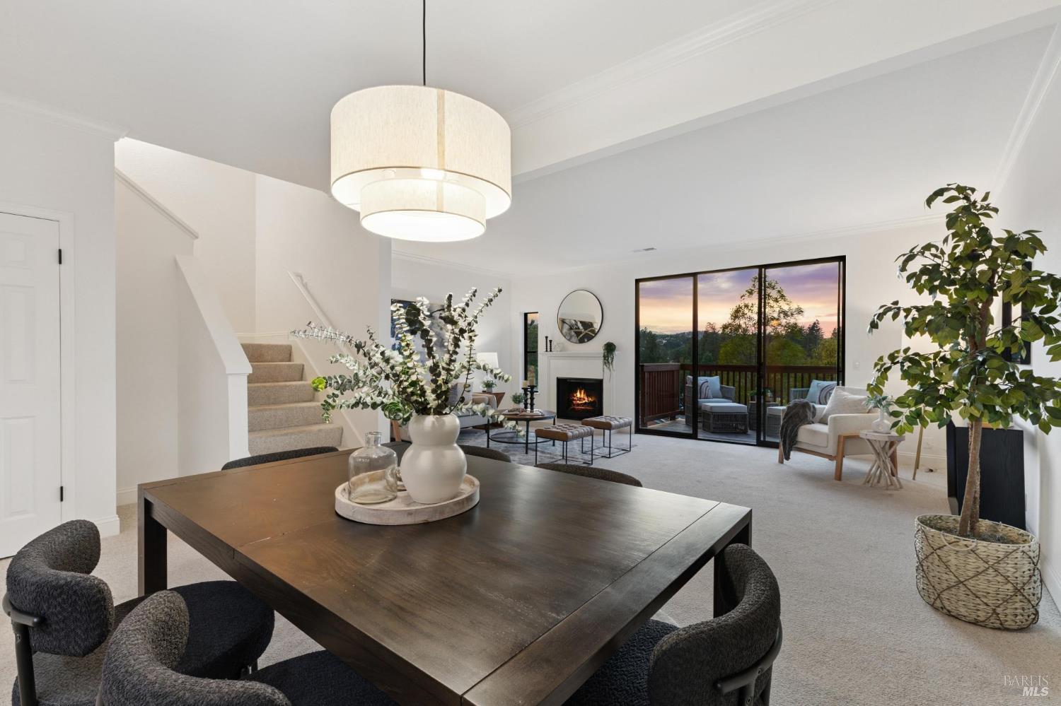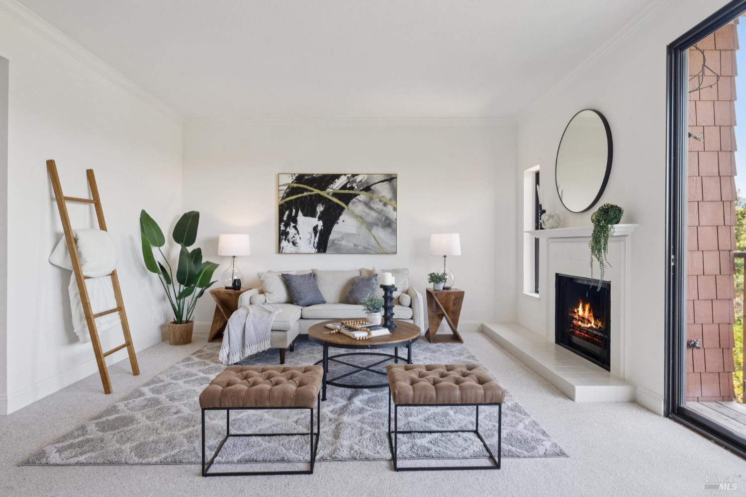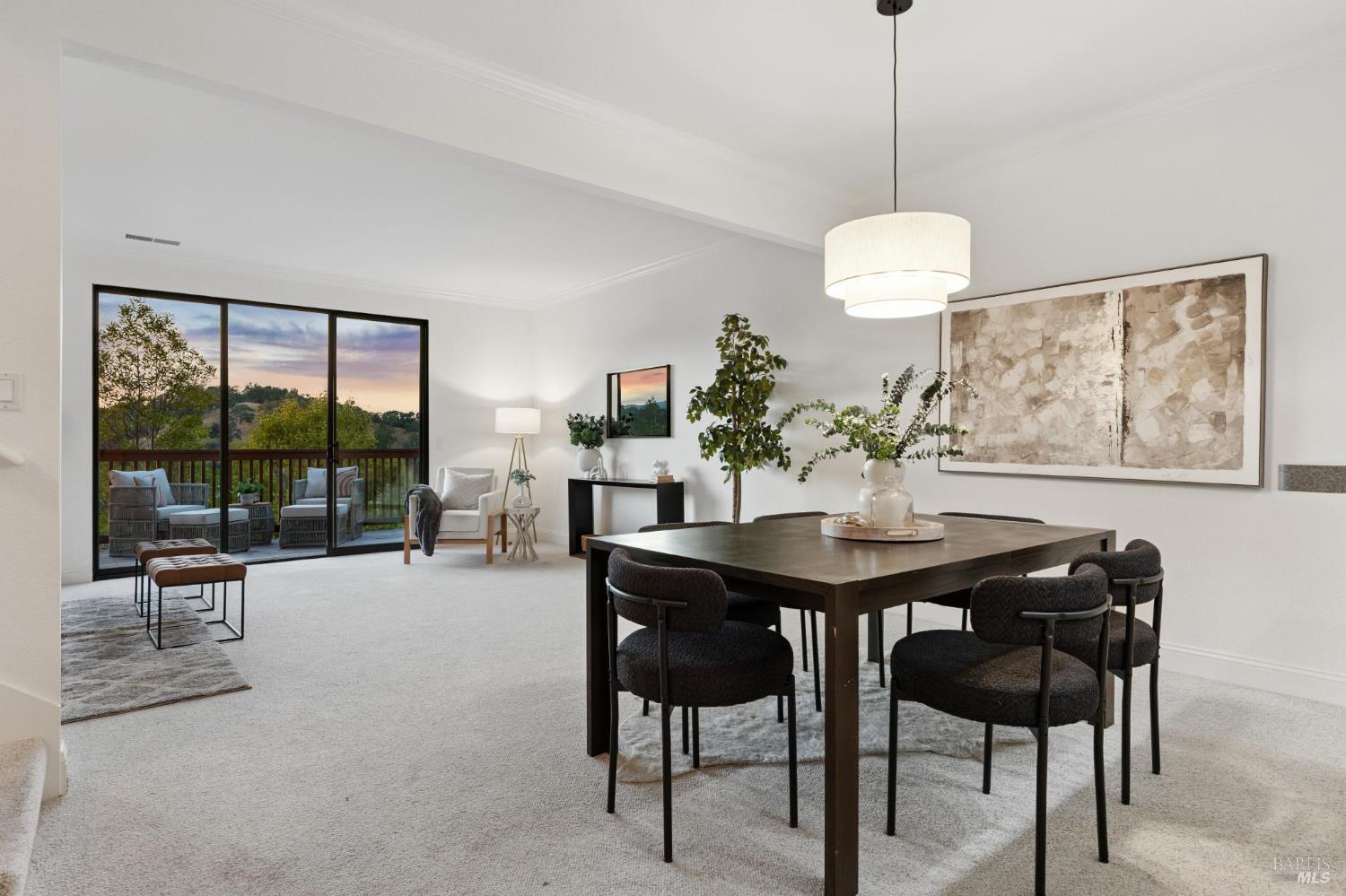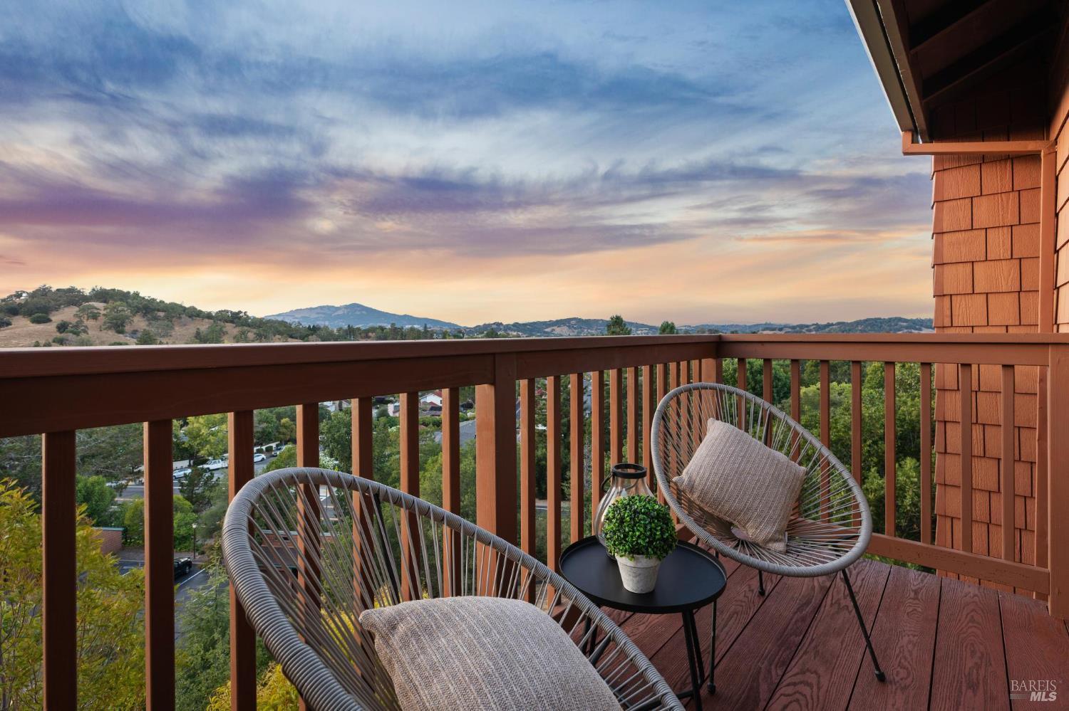 Welcome to a bright and inviting two-level townhome with sweeping hillside views, including Mount Burdell. The main level features an open floor plan with a spacious living room centered by a cozy fireplace, large windows, and access to a private deck. The dining area flows seamlessly into the kitchen, complete with ample cabinetry and a cheerful breakfast nook. A half bath and full laundry room add everyday convenience. Upstairs, the primary suite offers a walk-in closet, ensuite bath, and its own private deck to enjoy the views. Two additional bedrooms and a full bath provide flexibility for guests, family, or work-from-home. Fresh paint, updated lighting, and plush carpet enhance the move-in ready feel. Outdoor living is expanded with multiple decks, while a detached garage provides secure parking and storage. Ideally located near Novato shops, dining, and parks, this home blends comfort, function, and picturesque scenery.