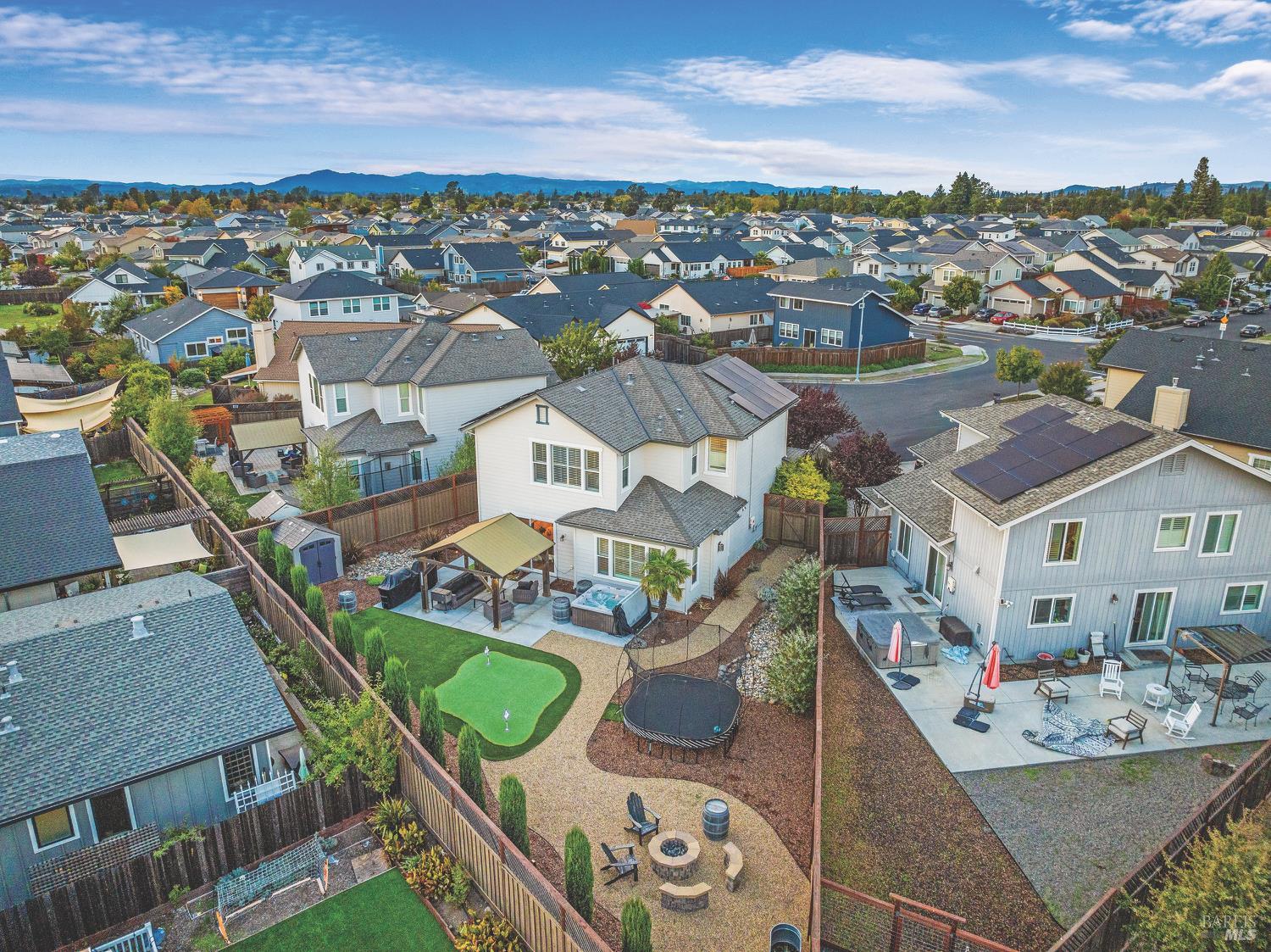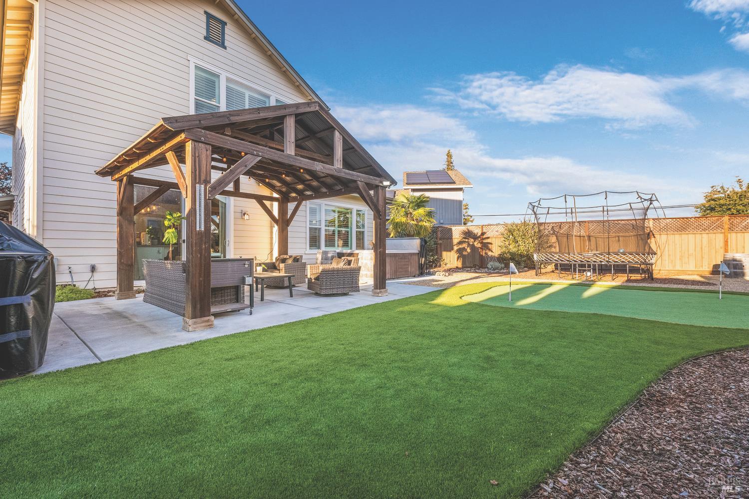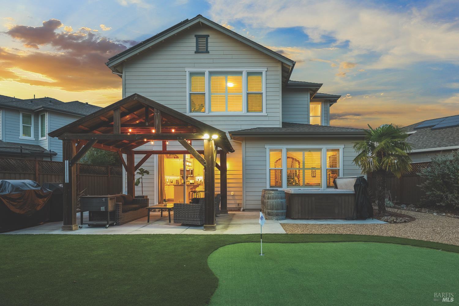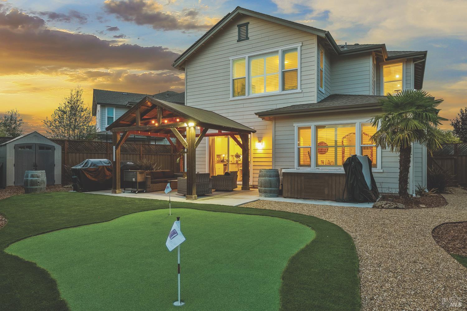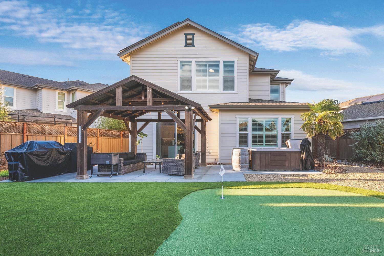 Your Coffey Park Oasis Awaits! Cheerful and homey vibes greet you upon entering 3686 Hillary Court. Filled with an abundance of natural light the great room showcases a comfortable fireplace setting and cozy living area. The adjoining dining room connects to the stylish kitchen. With quartz countertops, stainless steel appliances, a generous island, and seamless indoor-outdoor flow this is the perfect setting for gatherings, big and small. The main level features a versatile den or 4th bedroom with an adjacent full bath offering flexibility for guests, office, or multigenerational living. Upstairs, are three bedrooms including the spacious primary suite which feels like a true retreat with a spa-inspired bath featuring a dual vanity, radiant heat, soaking tub, a walk-in shower and closet. A thoughtfully designed yard blends relaxation and recreation. Entertain under the pergola, gather around the fire pit, practice your short game on the putting green, or unwind in the hot tub in complete privacy. Solar, an EV charger, garage storage, and an interior temp controlled wine cellar add to the home's efficiency and convenience. Ideally located near Coffey Park, shopping, Smart Rail, and major commute routes this is where style meets substance, and every day feels like paradise!