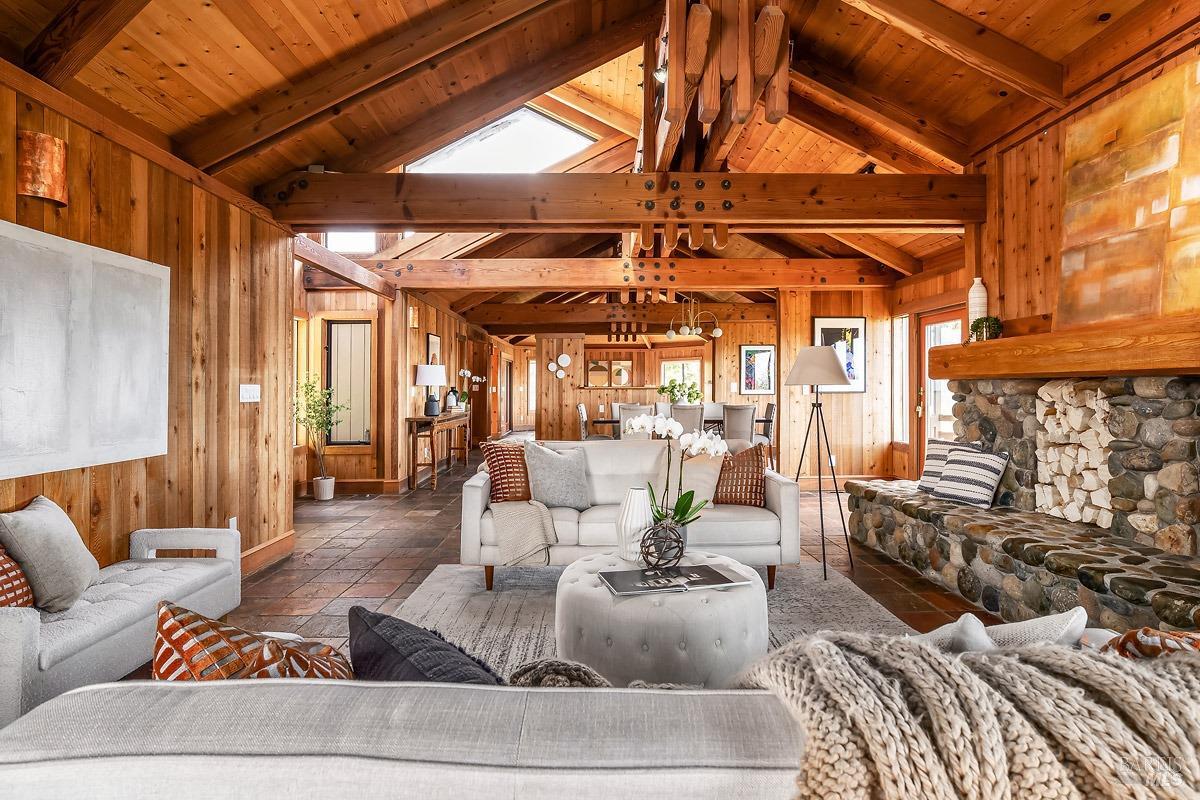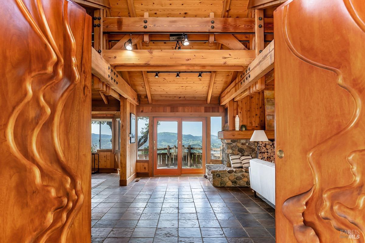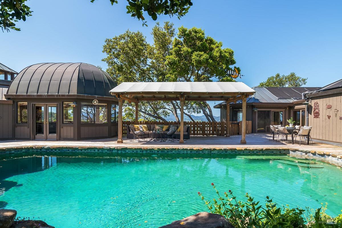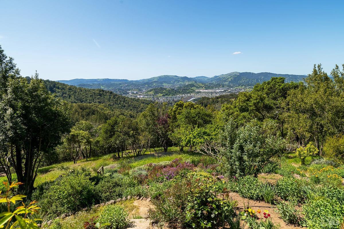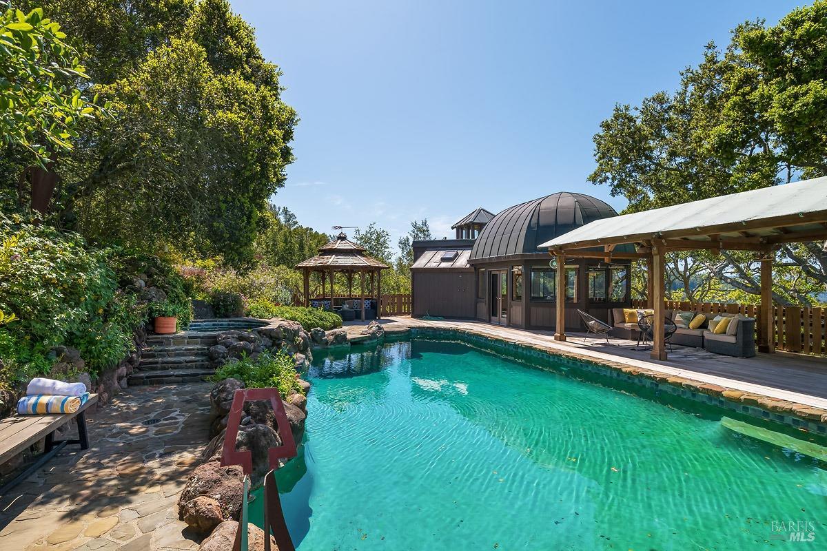 One-of-a-kind, custom master-built estate on 8.6 acres. A true tribute to the harmony of humankind and nature. This 5BR/6BA legacy home offers total privacy, incredible grounds, a breathtaking pool, a separate pool house, panoramic views and miles of hiking, biking and riding trails. With upwards of 7500 sq. ft. (6595 per tax record), this light-filled, window-rich home is solid, dramatic and welcoming, designed for every experience. Circular driveway, hand-carved walnut doors and a full copper roof set the tone. Approx. 1,000 sq. ft. main-floor primary suite with two fireplaces, sunny Ipe deck, walk-in closet with built-ins and a meditation/workout room. The primary bathroom offers a domed ceiling, natural light and spa-like ambiance. The lower level features a large playroom, three generous bedrooms, three full bathrooms, laundry, wine storage, art space, workshop, and a grand office with separate entrance. Finished in 1994 and once owned by Dr. Dean Edell, the home offers direct access to China Camp's expansive trail network. Bay views are just across the way, connected by a network of hidden paths that make this setting feel like a private sanctuary. This is a destination property for the discerning buyer who values privacy, top craftsmanship and a