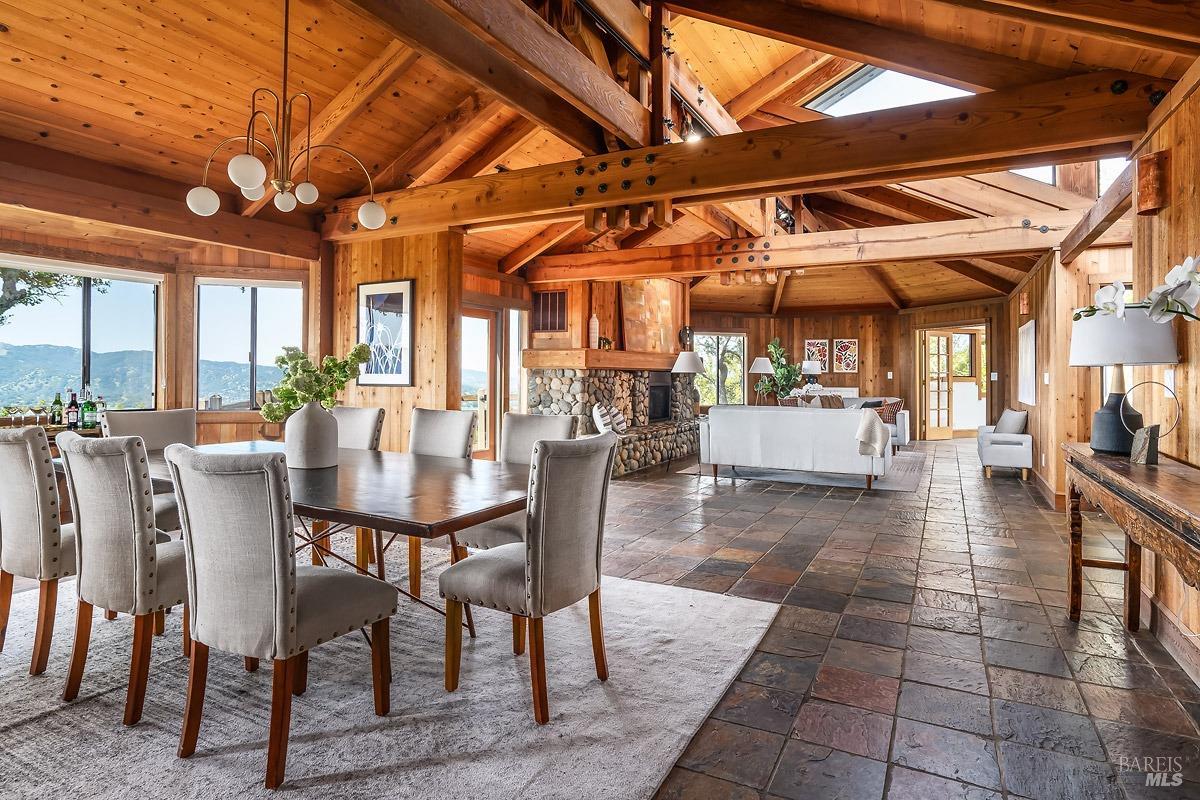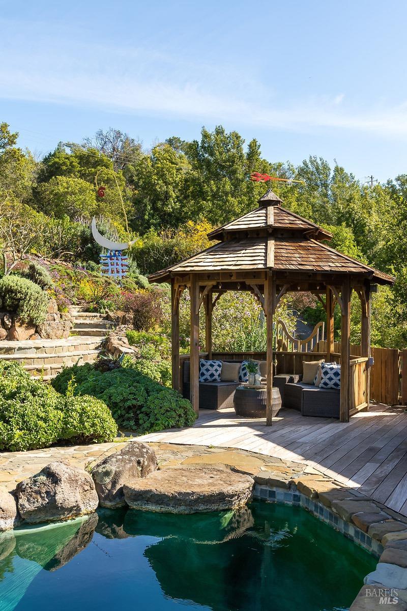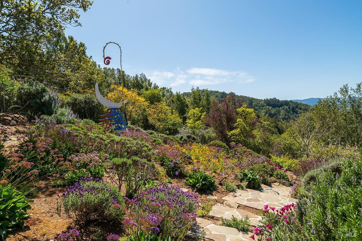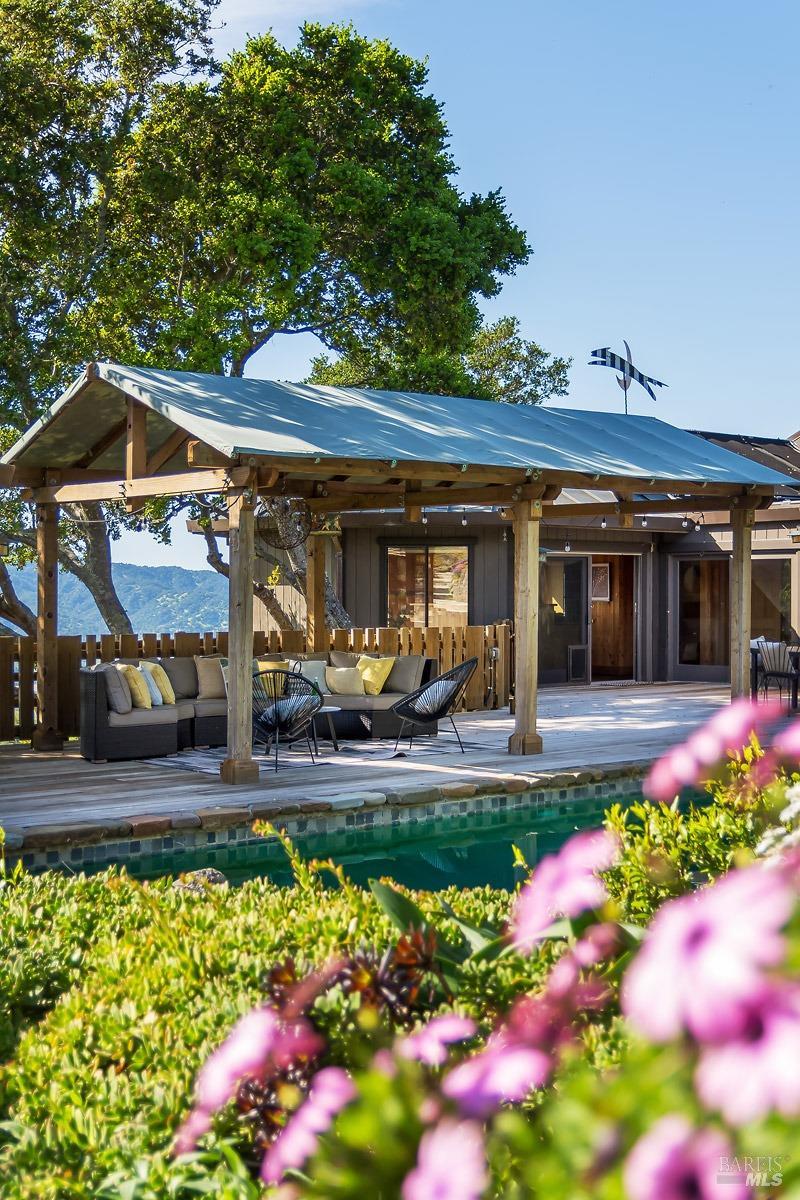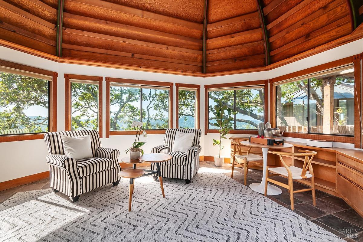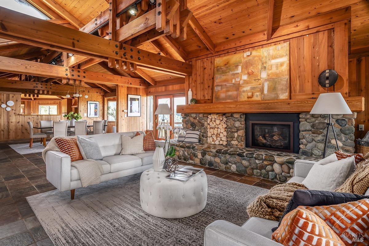 One-of-a-kind, custom master-built estate on 8.6 acres. A true tribute to the harmony of humankind and nature. This 5BR/6BA legacy home offers total privacy, incredible grounds, a breathtaking pool, a separate pool house, panoramic views and miles of hiking, biking and riding trails. With upwards of 7500 sq. ft. (6595 per tax record), this light-filled, window-rich home is solid, dramatic and welcoming, designed for every experience. Circular driveway, hand-carved walnut doors and a full copper roof set the tone. Approx. 1,000 sq. ft. main-floor primary suite with two fireplaces, sunny Ipe deck, walk-in closet with built-ins and a meditation/workout room. The primary bathroom offers a domed ceiling, natural light and spa-like ambiance. The lower level features a large playroom, three generous bedrooms, three full bathrooms, laundry, wine storage, art space, workshop, and a grand office with separate entrance. Finished in 1994 and once owned by Dr. Dean Edell, the home offers direct access to China Camp's expansive trail network. Bay views are just across the way, connected by a network of hidden paths that make this setting feel like a private sanctuary. This is a destination property for the discerning buyer who values privacy, top craftsmanship and a