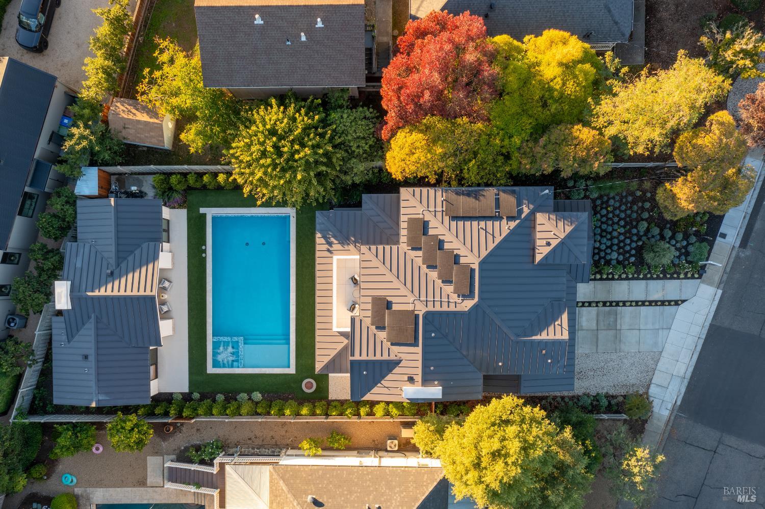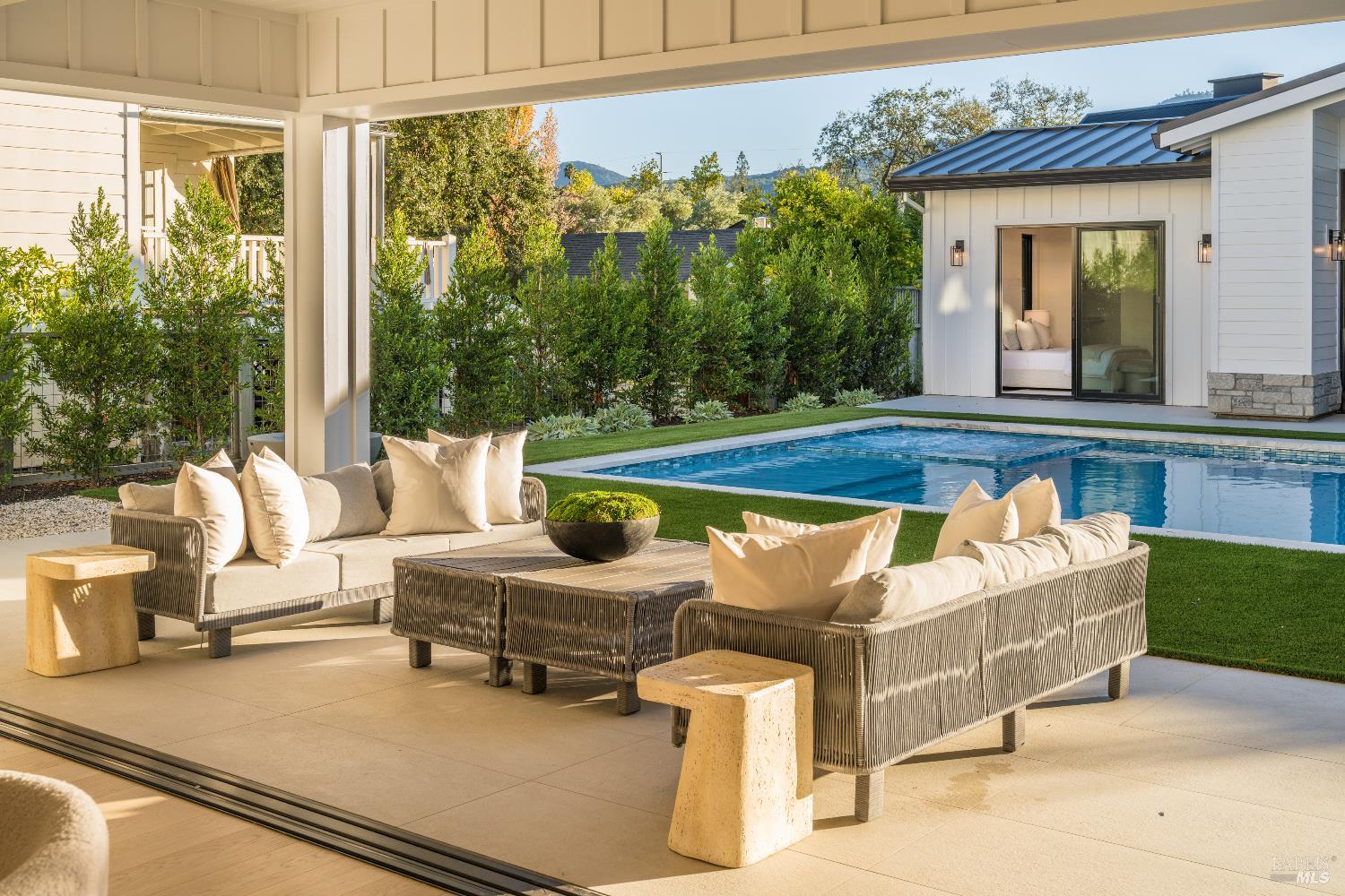 Located in the heart of St. Helena, this newly built gem blends luxury and functionality across a 3,800 SF main residence + ADU on a beautifully landscaped in-town lot. The 5BD, 5BA property showcases white oak cabinetry and floors, 11-foot ceilings, and custom finishes throughout. A sliding glass wall seamlessly connects the great room to a private outdoor retreat featuring a 38x20 pool with spa and Baja shelf, outdoor kitchen with Sedona grill, and a built-in fire pit. The primary suite enjoys a private terrace with views of the Mayacama mountains, a spa inspired bath, and a generous walk-in closet. Additional amenities include a flexible office/gym space and a fully appointed ADU. A rare in-town St. Helena offering for those seeking modern design with effortless indoor-outdoor living in one of Napa Valley's most desirable locations.