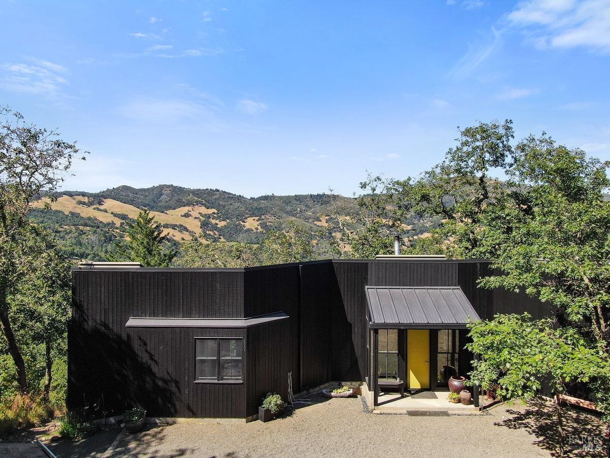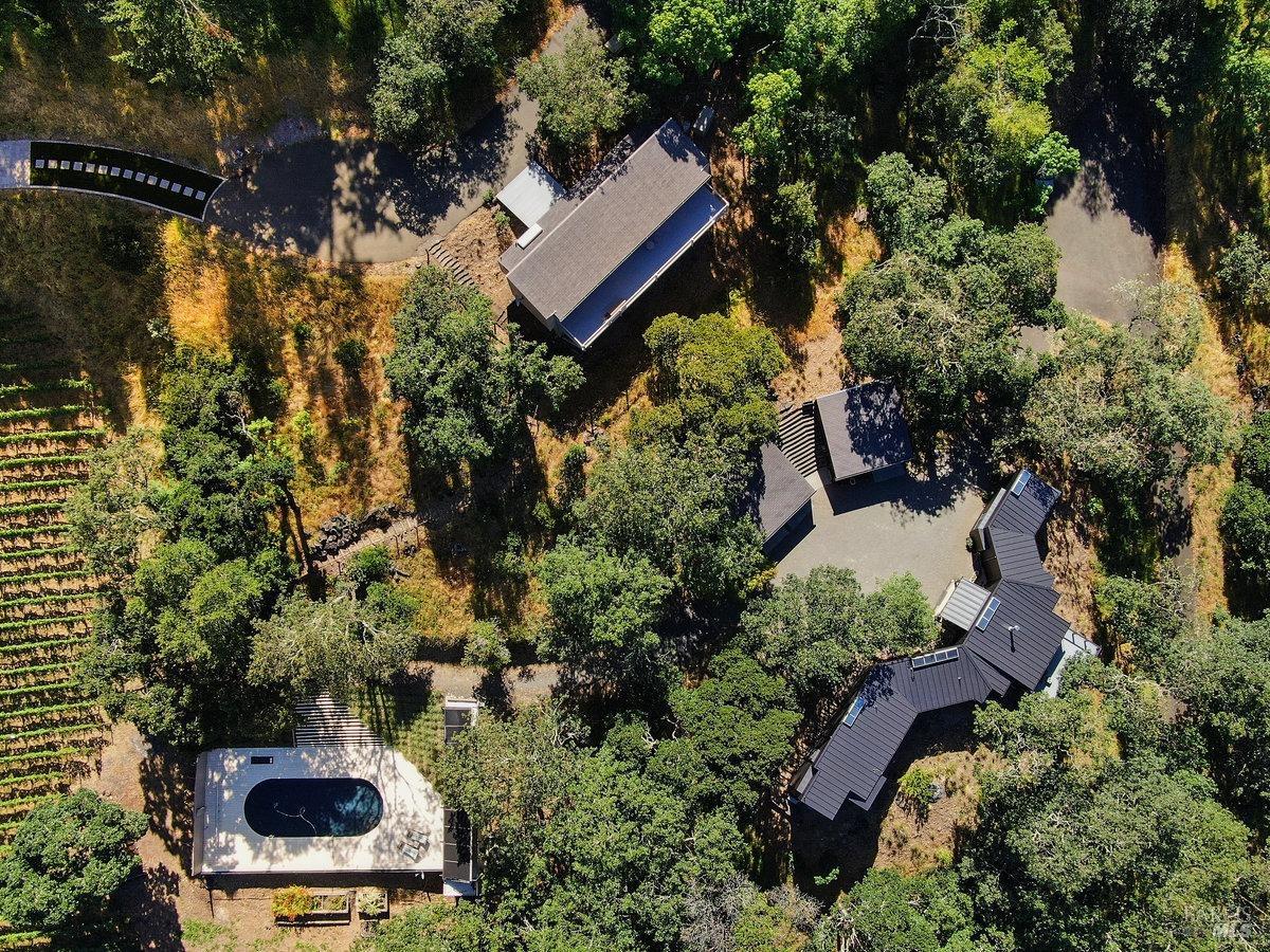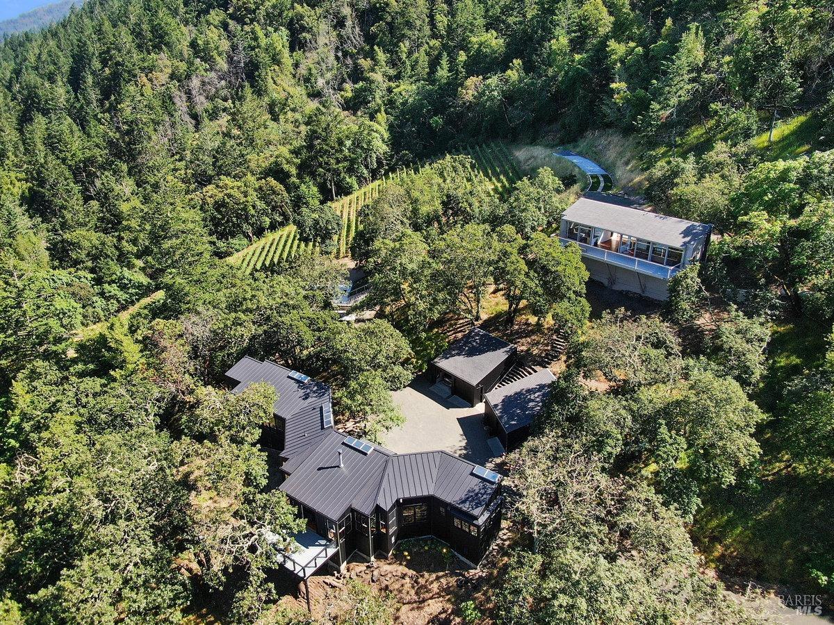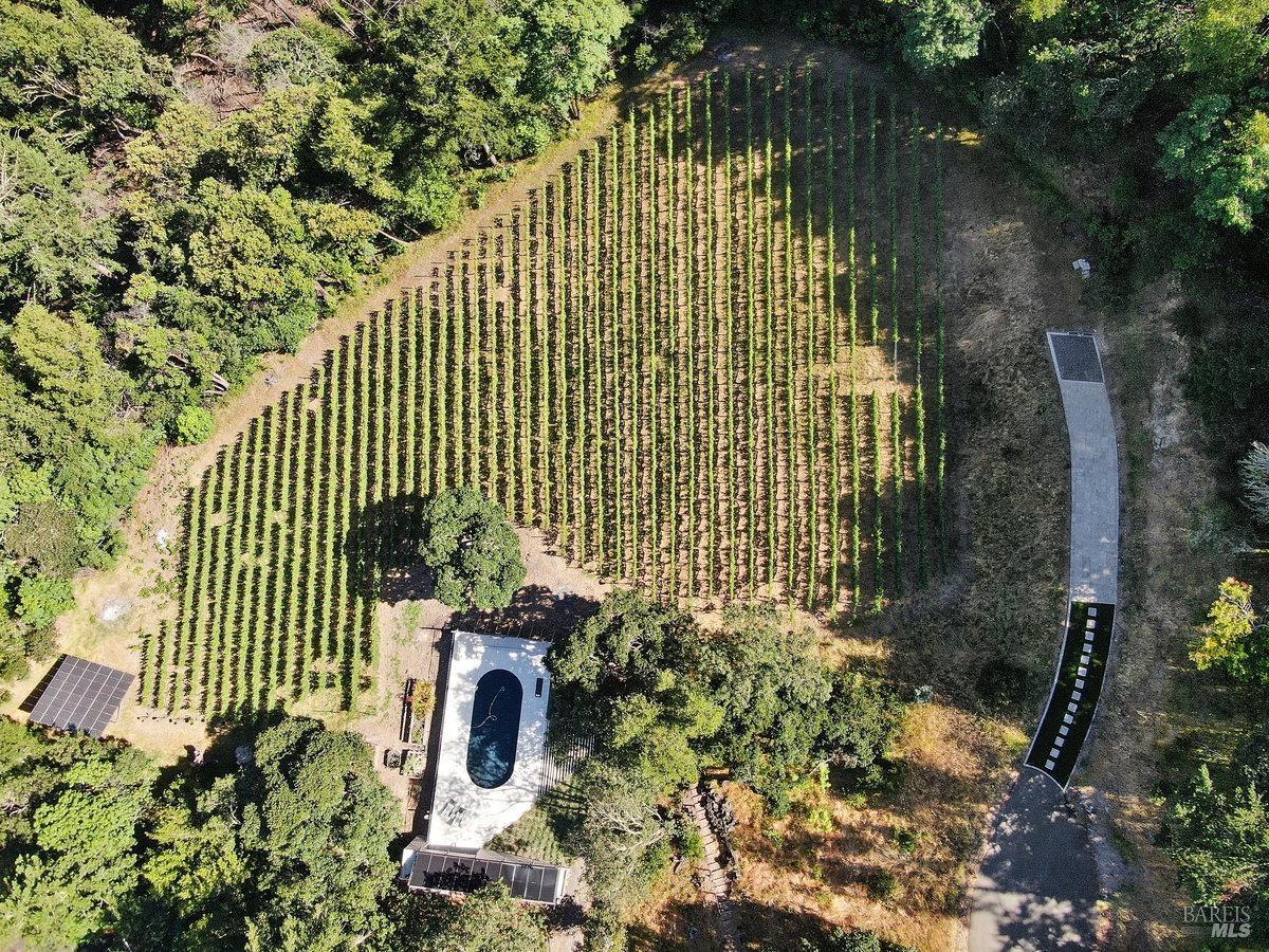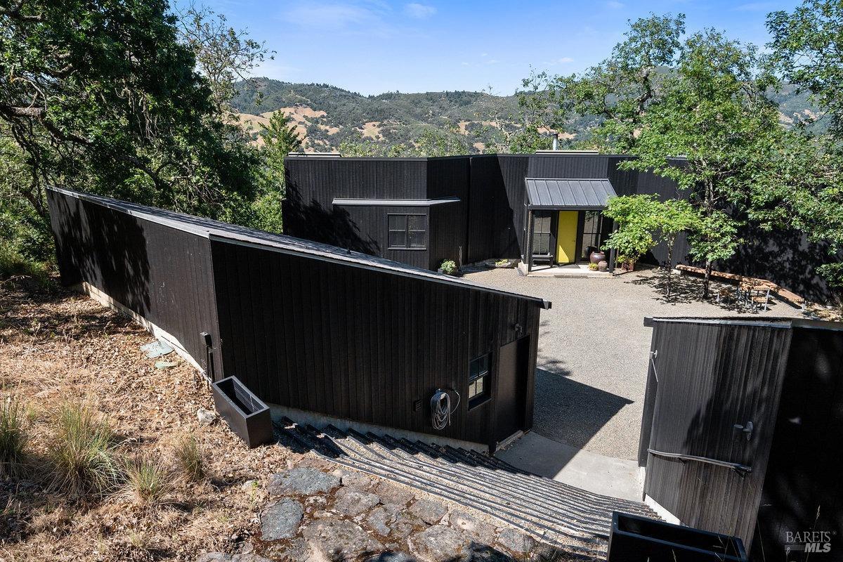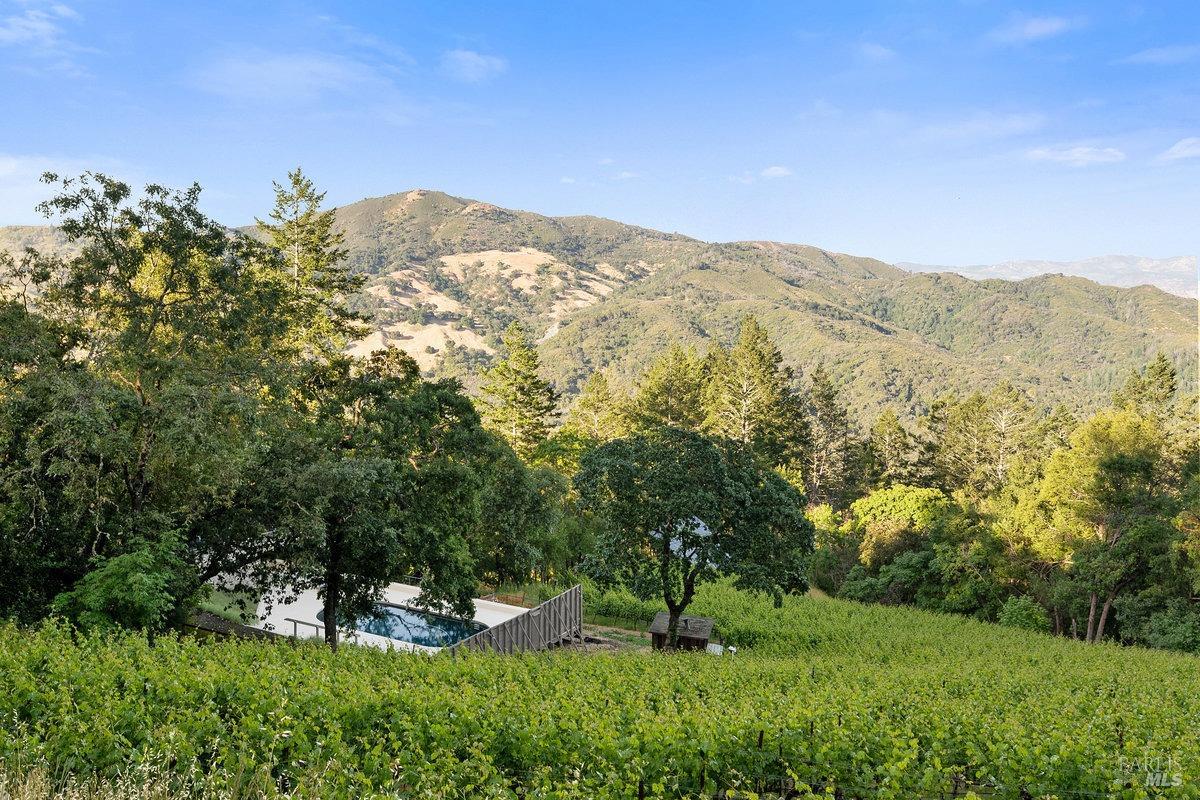 Designed by renowned architect William Turnbull, the 2,500-square-foot main house seamlessly integrates with the surrounding landscape. Unparalleled sanctuary spread across over 47 acres of pristine land. Unique blend of natural splendor, architectural distinction modern amenities, making it an ideal haven for discerning buyers who value privacy, a great reputation and potential. The driveway leads up from the valley below to a courtyard formed by 2 separate garages and by the tall wall of the house. A masterpiece of design featuring two spacious bedrooms, open floorpan with gourmet kitchen - SubZero fridge, Dacor gas range, Miele dishwasher & wood burning fireplace. A detached 1bdr 1ba 1,995-square-foot guest house with full kitchen and a basement, designed by SF modernists Marquis & Stoller, offers additional accommodation and is complemented by a private large deck with breathtaking panoramic views. An outdoor pool and a pool house designed by architect Dan Solomon. Embrace the essence of wine country living with 1,3 acre of Cab Sauvignon producing grapes -3 vineyard blocks planted in high-altitude vineyard (1400-1600ft elevation), Mt. Veeder AVA. Explore the private hiking trail leading to the summit of the mountains, offering panoramic views of Sonoma & Napa valleys.