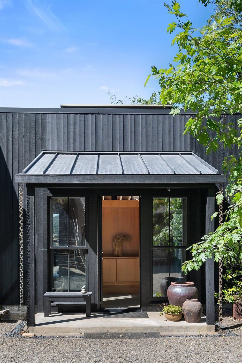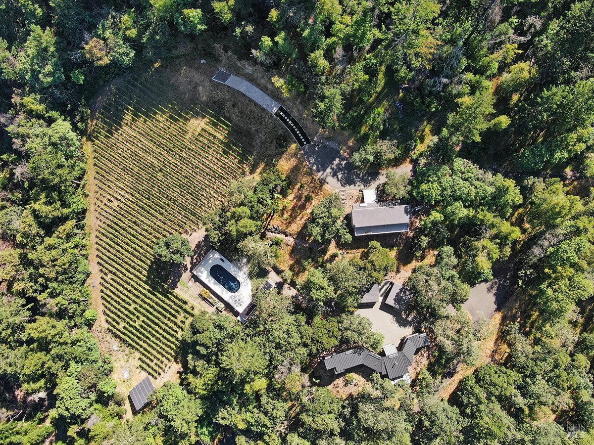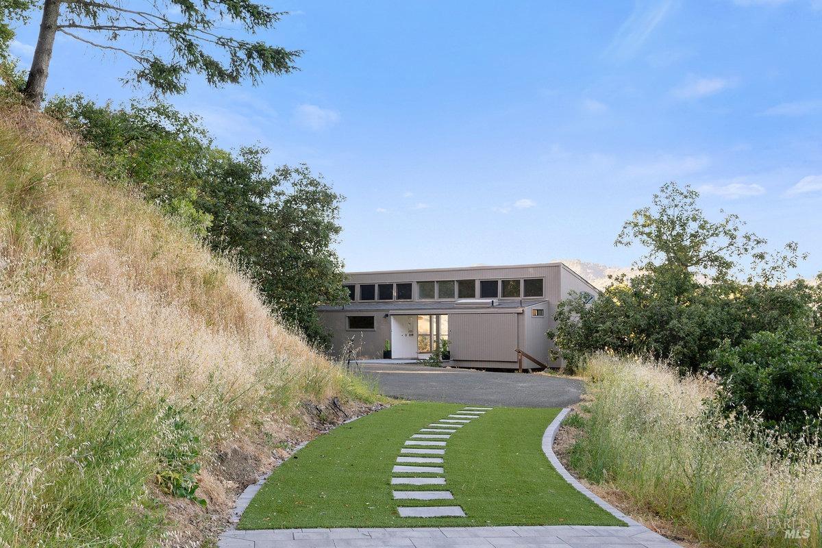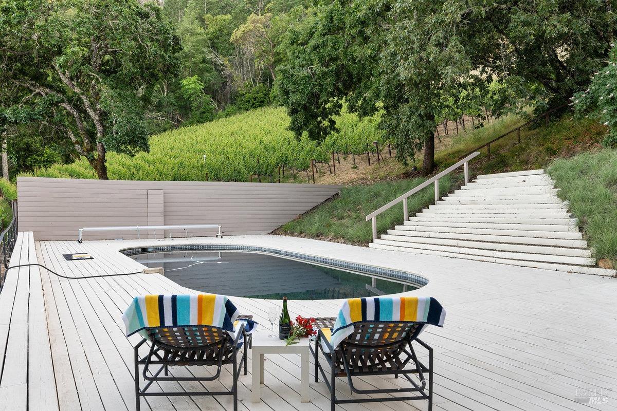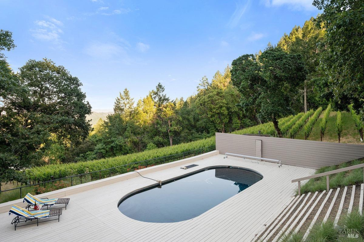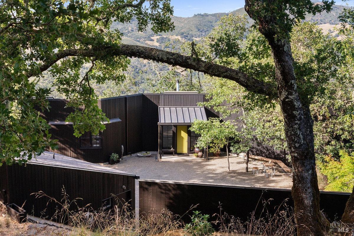 Designed by renowned architect William Turnbull, the 2,500-square-foot main house seamlessly integrates with the surrounding landscape. Unparalleled sanctuary spread across over 47 acres of pristine land. Unique blend of natural splendor, architectural distinction modern amenities, making it an ideal haven for discerning buyers who value privacy, a great reputation and potential. The driveway leads up from the valley below to a courtyard formed by 2 separate garages and by the tall wall of the house. A masterpiece of design featuring two spacious bedrooms, open floorpan with gourmet kitchen - SubZero fridge, Dacor gas range, Miele dishwasher & wood burning fireplace. A detached 1bdr 1ba 1,995-square-foot guest house with full kitchen and a basement, designed by SF modernists Marquis & Stoller, offers additional accommodation and is complemented by a private large deck with breathtaking panoramic views. An outdoor pool and a pool house designed by architect Dan Solomon. Embrace the essence of wine country living with 1,3 acre of Cab Sauvignon producing grapes -3 vineyard blocks planted in high-altitude vineyard (1400-1600ft elevation), Mt. Veeder AVA. Explore the private hiking trail leading to the summit of the mountains, offering panoramic views of Sonoma & Napa valleys.