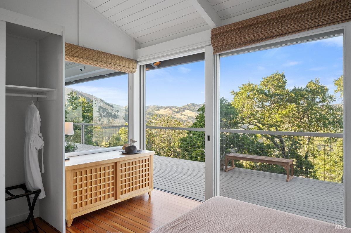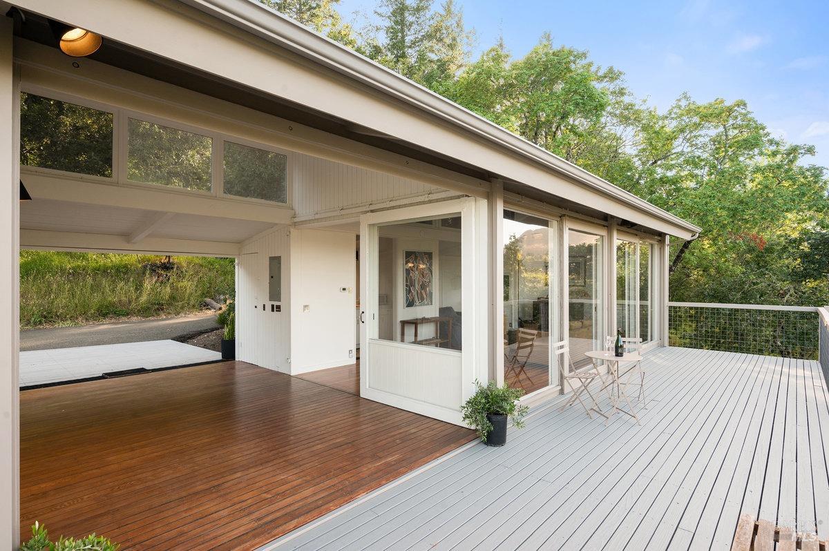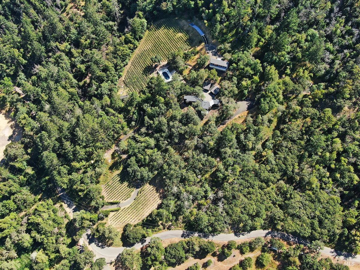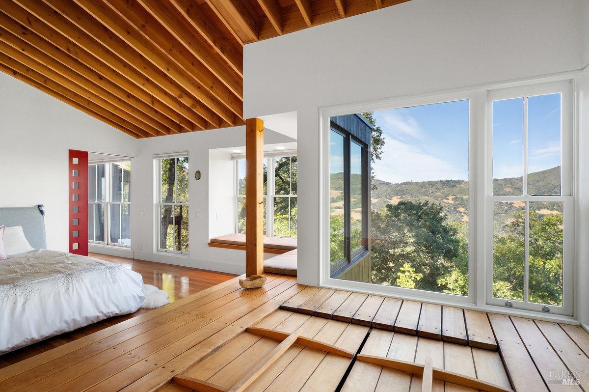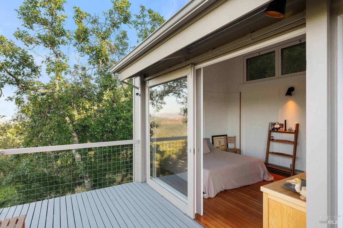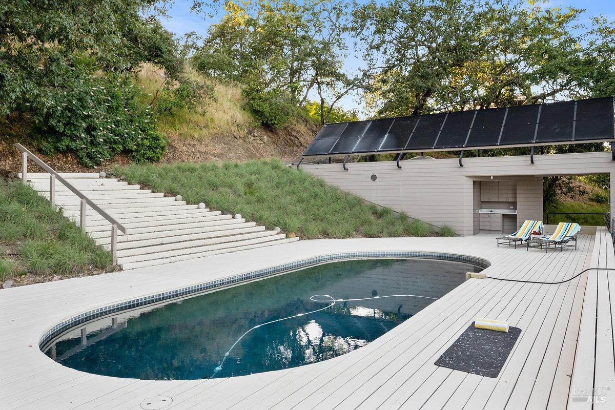 Designed by renowned architect William Turnbull, the 2,500-square-foot main house seamlessly integrates with the surrounding landscape. Unparalleled sanctuary spread across over 47 acres of pristine land. Unique blend of natural splendor, architectural distinction modern amenities, making it an ideal haven for discerning buyers who value privacy, a great reputation and potential. The driveway leads up from the valley below to a courtyard formed by 2 separate garages and by the tall wall of the house. A masterpiece of design featuring two spacious bedrooms, open floorpan with gourmet kitchen - SubZero fridge, Dacor gas range, Miele dishwasher & wood burning fireplace. A detached 1bdr 1ba 1,995-square-foot guest house with full kitchen and a basement, designed by SF modernists Marquis & Stoller, offers additional accommodation and is complemented by a private large deck with breathtaking panoramic views. An outdoor pool and a pool house designed by architect Dan Solomon. Embrace the essence of wine country living with 1,3 acre of Cab Sauvignon producing grapes -3 vineyard blocks planted in high-altitude vineyard (1400-1600ft elevation), Mt. Veeder AVA. Explore the private hiking trail leading to the summit of the mountains, offering panoramic views of Sonoma & Napa valleys.