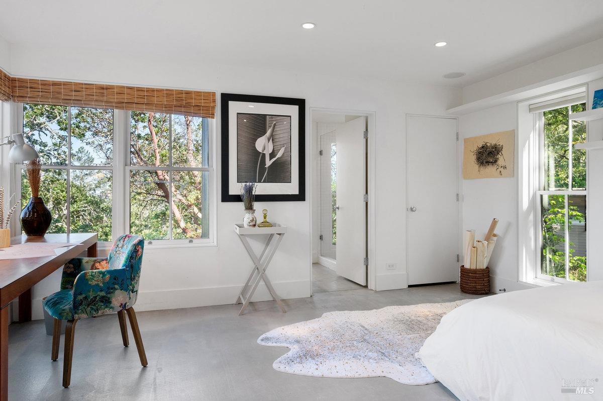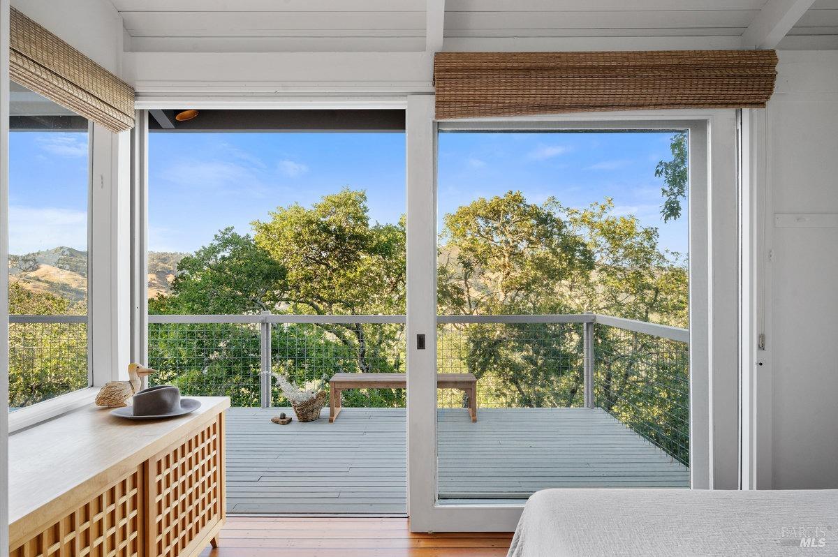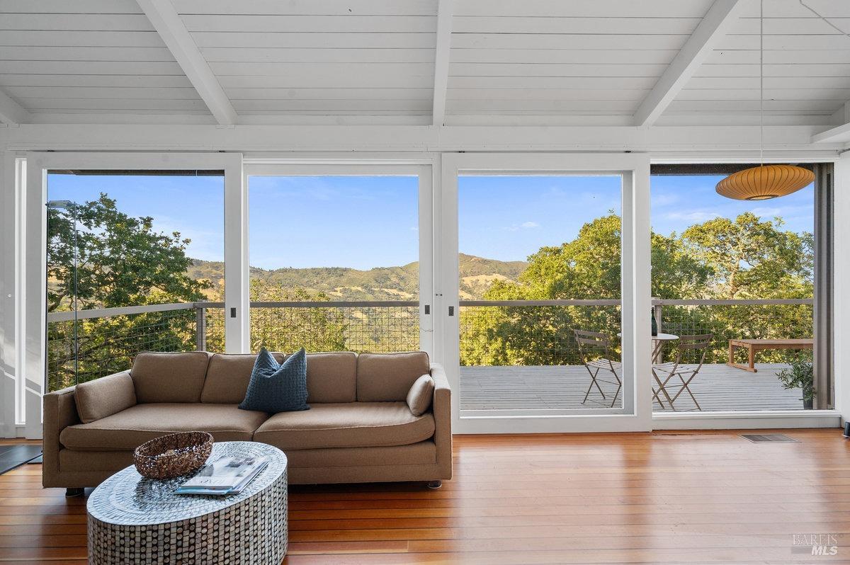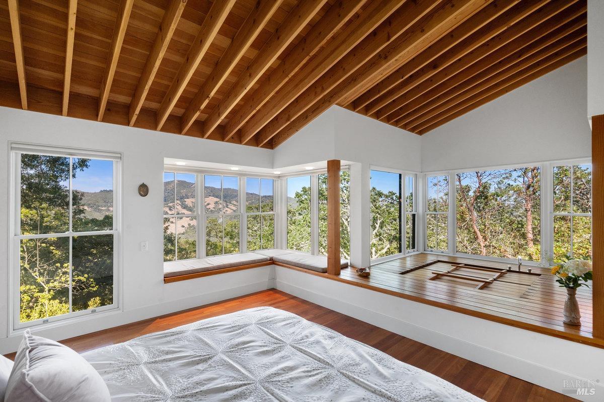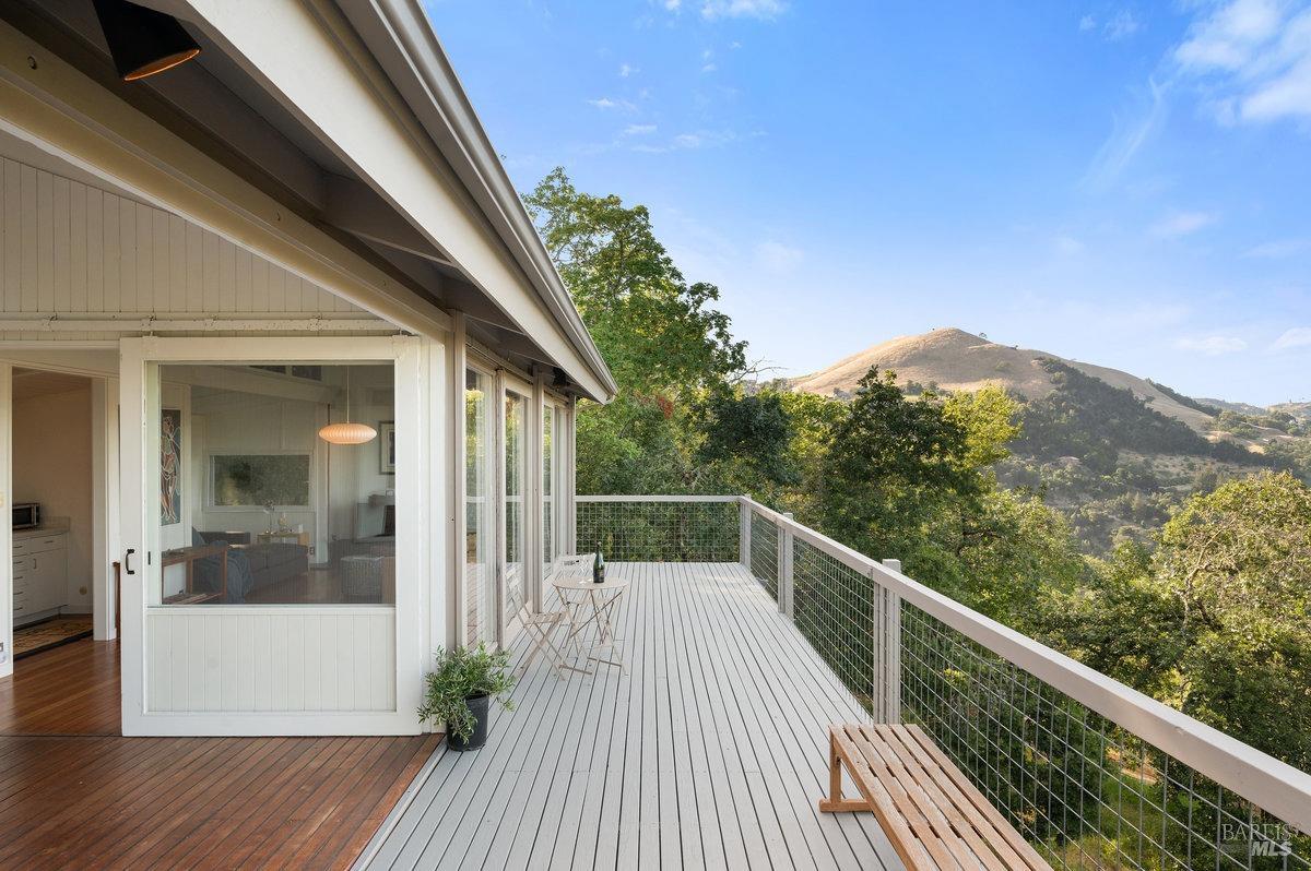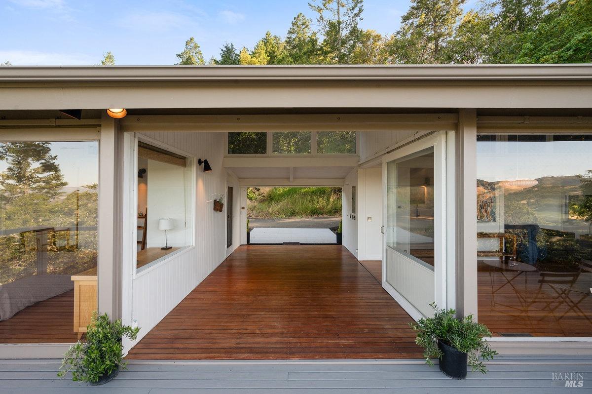 Designed by renowned architect William Turnbull, the 2,500-square-foot main house seamlessly integrates with the surrounding landscape. Unparalleled sanctuary spread across over 47 acres of pristine land. Unique blend of natural splendor, architectural distinction modern amenities, making it an ideal haven for discerning buyers who value privacy, a great reputation and potential. The driveway leads up from the valley below to a courtyard formed by 2 separate garages and by the tall wall of the house. A masterpiece of design featuring two spacious bedrooms, open floorpan with gourmet kitchen - SubZero fridge, Dacor gas range, Miele dishwasher & wood burning fireplace. A detached 1bdr 1ba 1,995-square-foot guest house with full kitchen and a basement, designed by SF modernists Marquis & Stoller, offers additional accommodation and is complemented by a private large deck with breathtaking panoramic views. An outdoor pool and a pool house designed by architect Dan Solomon. Embrace the essence of wine country living with 1,3 acre of Cab Sauvignon producing grapes -3 vineyard blocks planted in high-altitude vineyard (1400-1600ft elevation), Mt. Veeder AVA. Explore the private hiking trail leading to the summit of the mountains, offering panoramic views of Sonoma & Napa valleys.