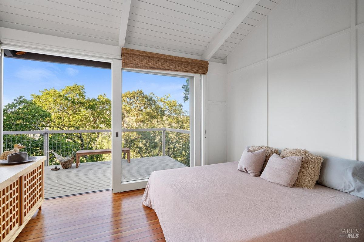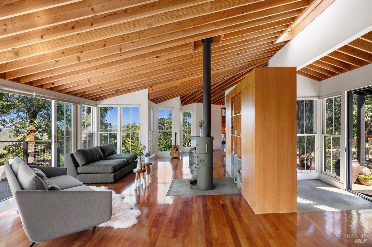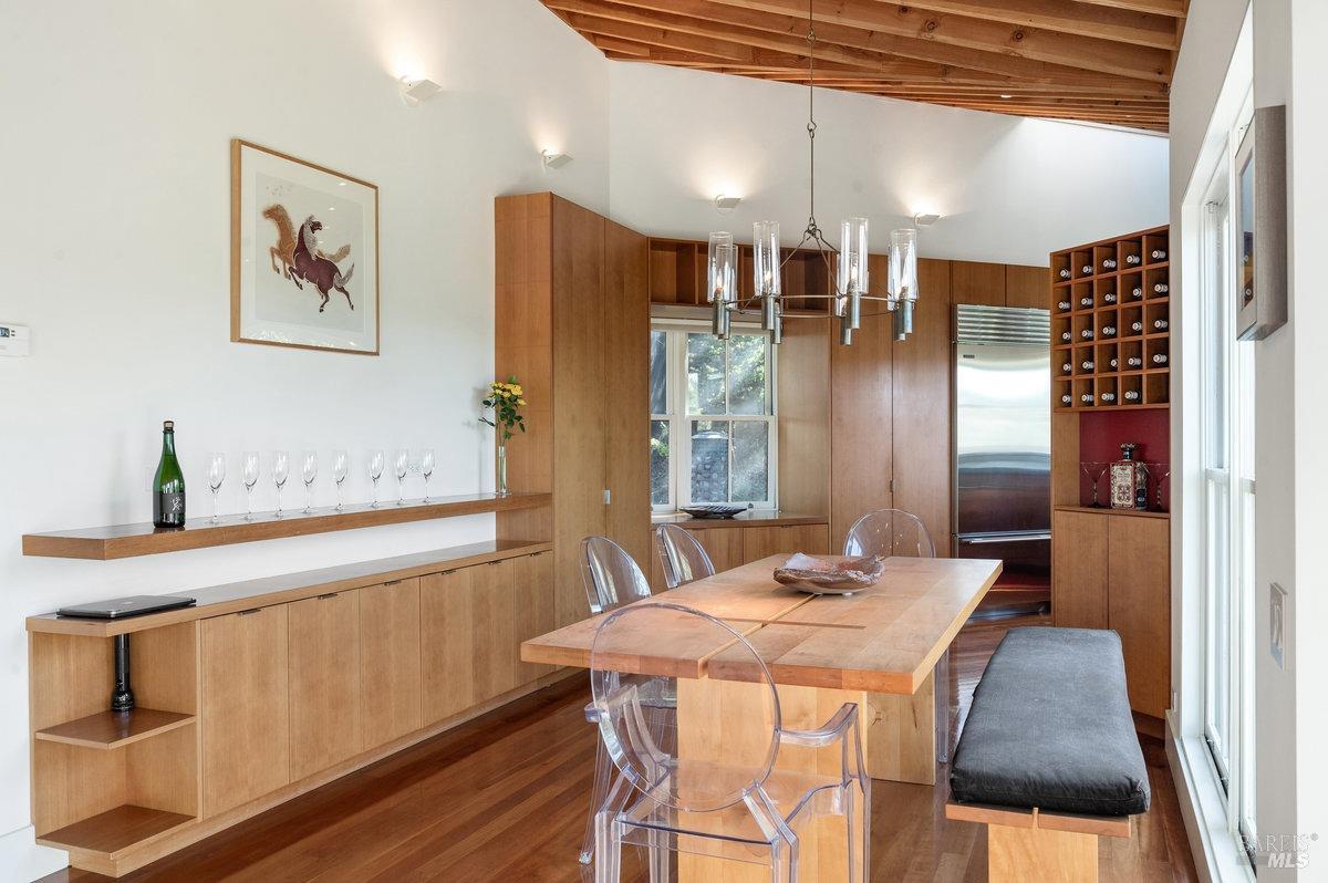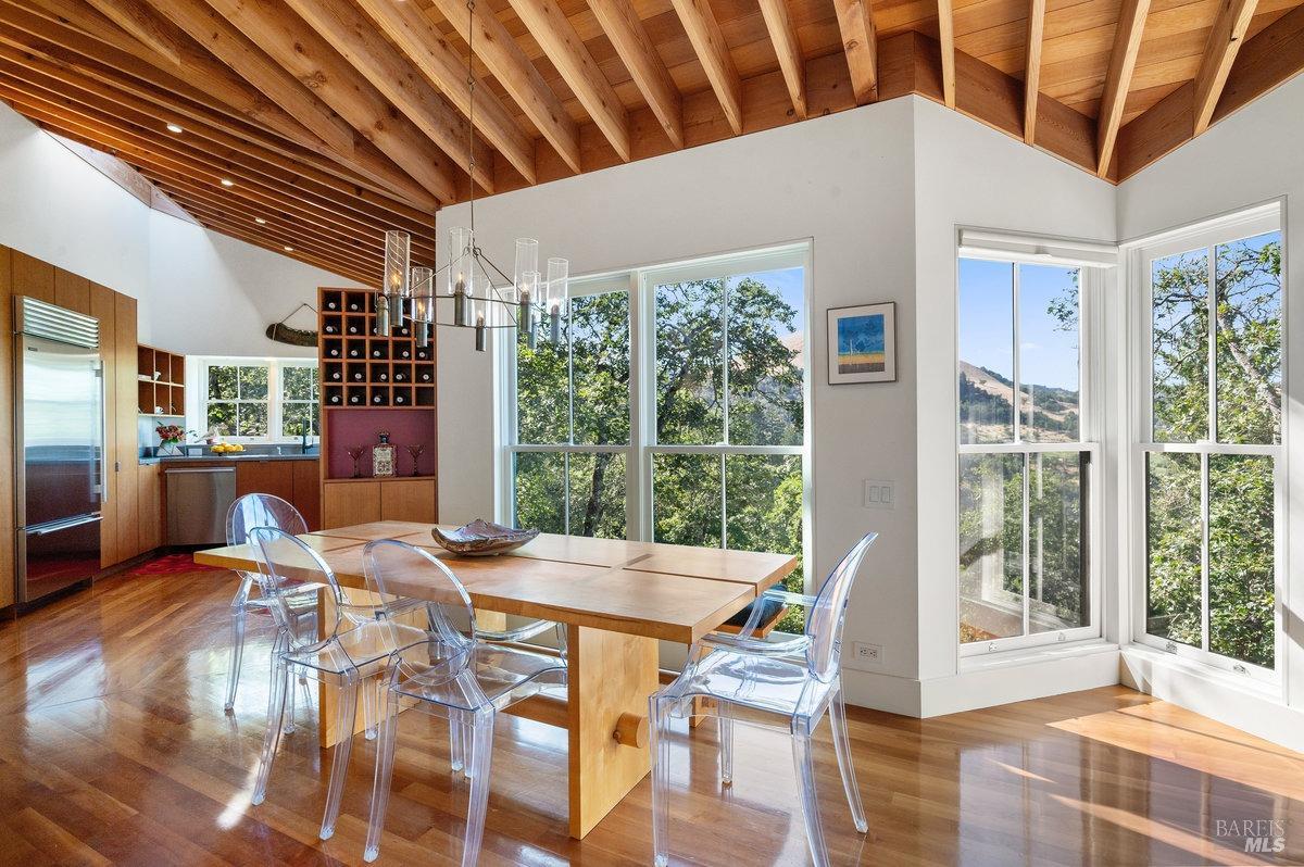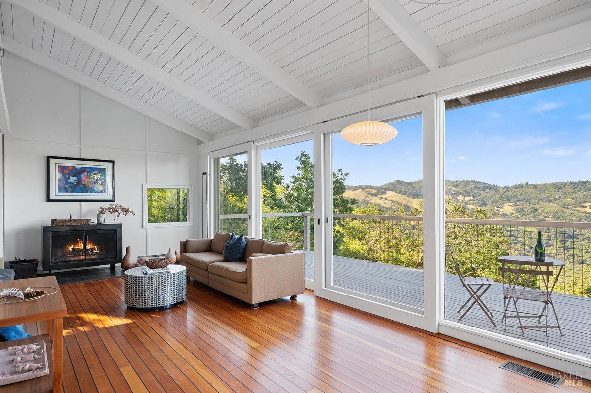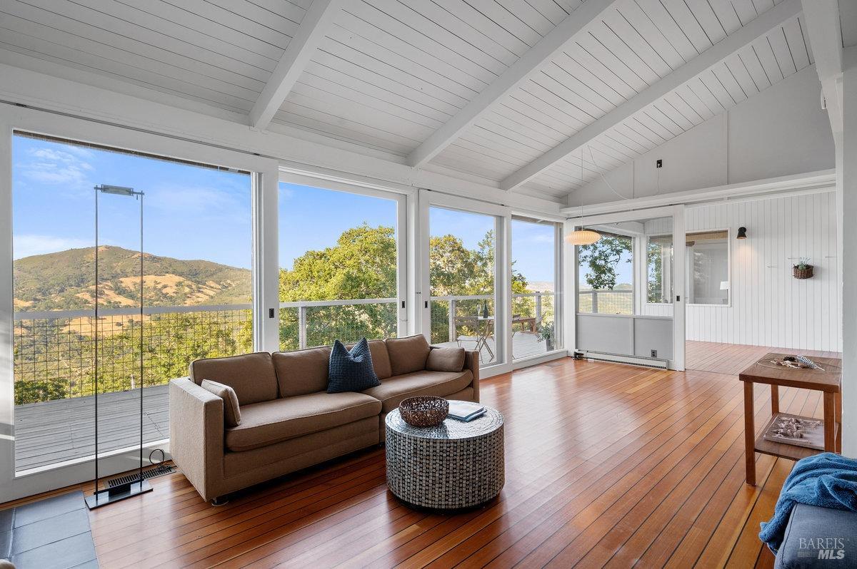 Designed by renowned architect William Turnbull, the 2,500-square-foot main house seamlessly integrates with the surrounding landscape. Unparalleled sanctuary spread across over 47 acres of pristine land. Unique blend of natural splendor, architectural distinction modern amenities, making it an ideal haven for discerning buyers who value privacy, a great reputation and potential. The driveway leads up from the valley below to a courtyard formed by 2 separate garages and by the tall wall of the house. A masterpiece of design featuring two spacious bedrooms, open floorpan with gourmet kitchen - SubZero fridge, Dacor gas range, Miele dishwasher & wood burning fireplace. A detached 1bdr 1ba 1,995-square-foot guest house with full kitchen and a basement, designed by SF modernists Marquis & Stoller, offers additional accommodation and is complemented by a private large deck with breathtaking panoramic views. An outdoor pool and a pool house designed by architect Dan Solomon. Embrace the essence of wine country living with 1,3 acre of Cab Sauvignon producing grapes -3 vineyard blocks planted in high-altitude vineyard (1400-1600ft elevation), Mt. Veeder AVA. Explore the private hiking trail leading to the summit of the mountains, offering panoramic views of Sonoma & Napa valleys.