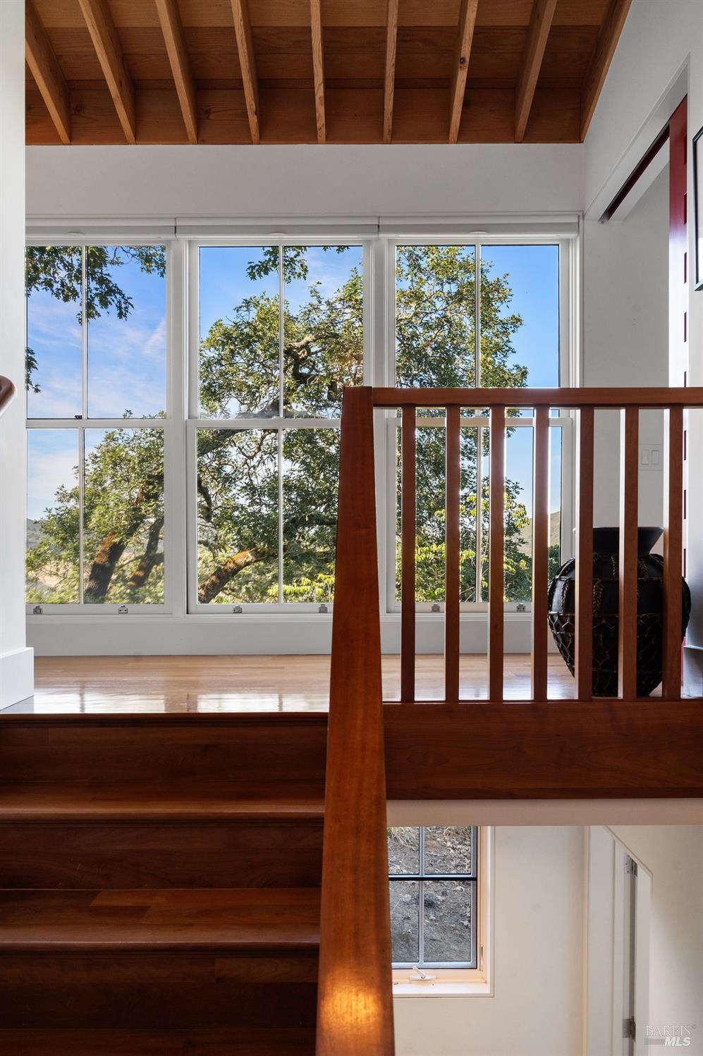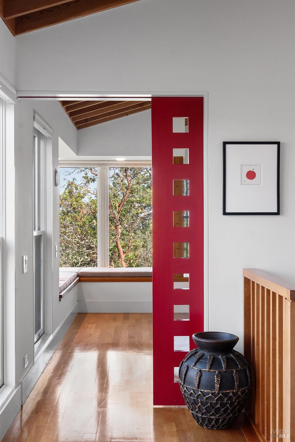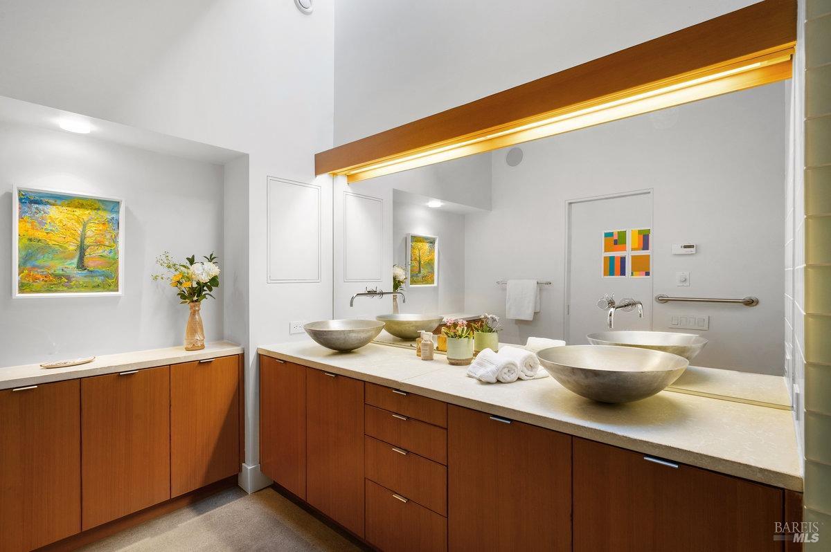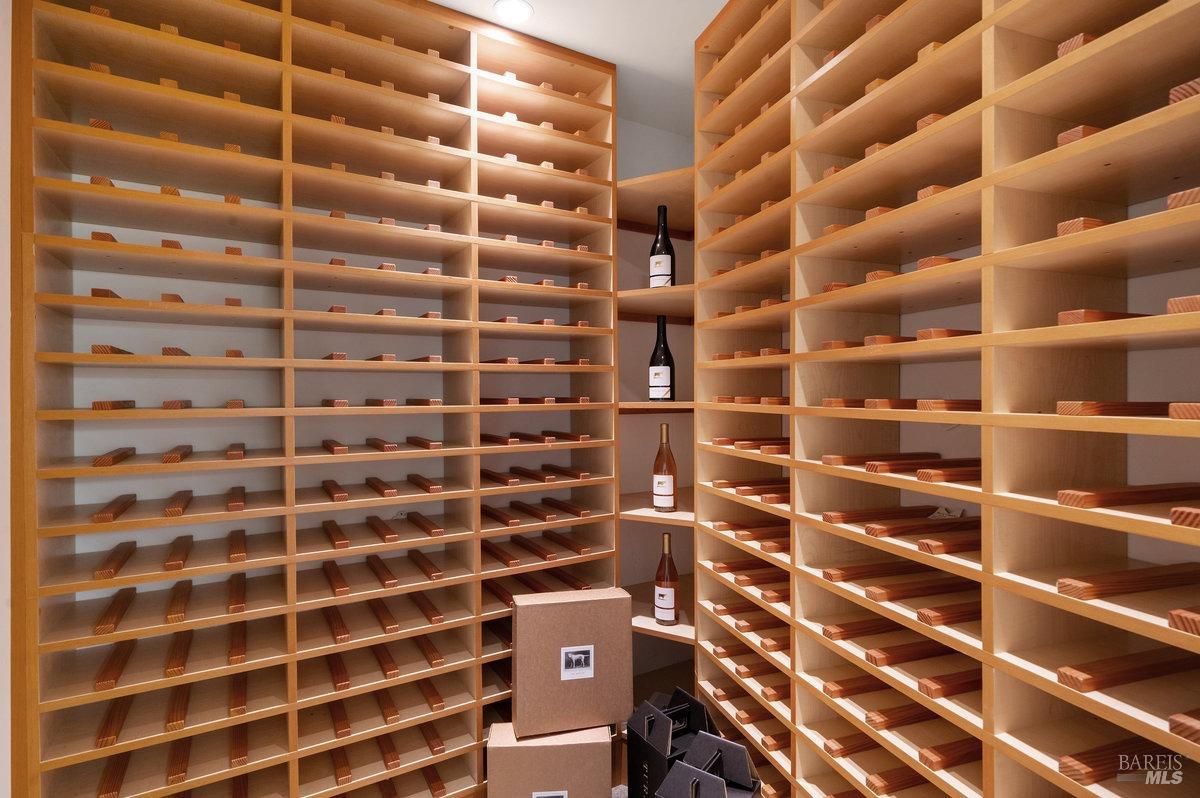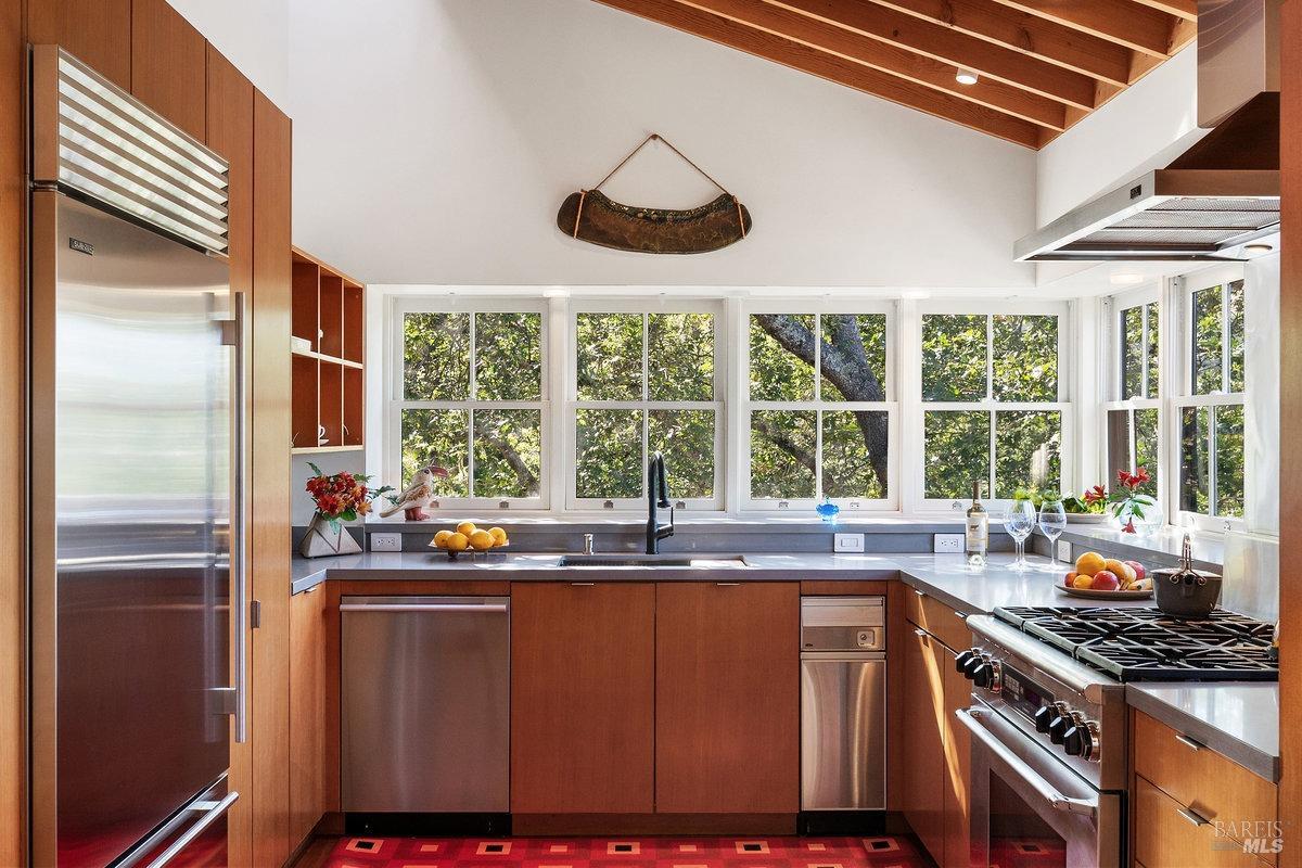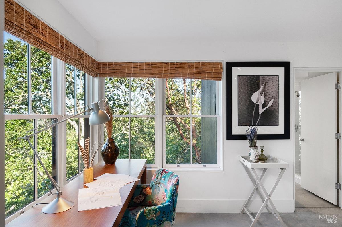 Designed by renowned architect William Turnbull, the 2,500-square-foot main house seamlessly integrates with the surrounding landscape. Unparalleled sanctuary spread across over 47 acres of pristine land. Unique blend of natural splendor, architectural distinction modern amenities, making it an ideal haven for discerning buyers who value privacy, a great reputation and potential. The driveway leads up from the valley below to a courtyard formed by 2 separate garages and by the tall wall of the house. A masterpiece of design featuring two spacious bedrooms, open floorpan with gourmet kitchen - SubZero fridge, Dacor gas range, Miele dishwasher & wood burning fireplace. A detached 1bdr 1ba 1,995-square-foot guest house with full kitchen and a basement, designed by SF modernists Marquis & Stoller, offers additional accommodation and is complemented by a private large deck with breathtaking panoramic views. An outdoor pool and a pool house designed by architect Dan Solomon. Embrace the essence of wine country living with 1,3 acre of Cab Sauvignon producing grapes -3 vineyard blocks planted in high-altitude vineyard (1400-1600ft elevation), Mt. Veeder AVA. Explore the private hiking trail leading to the summit of the mountains, offering panoramic views of Sonoma & Napa valleys.