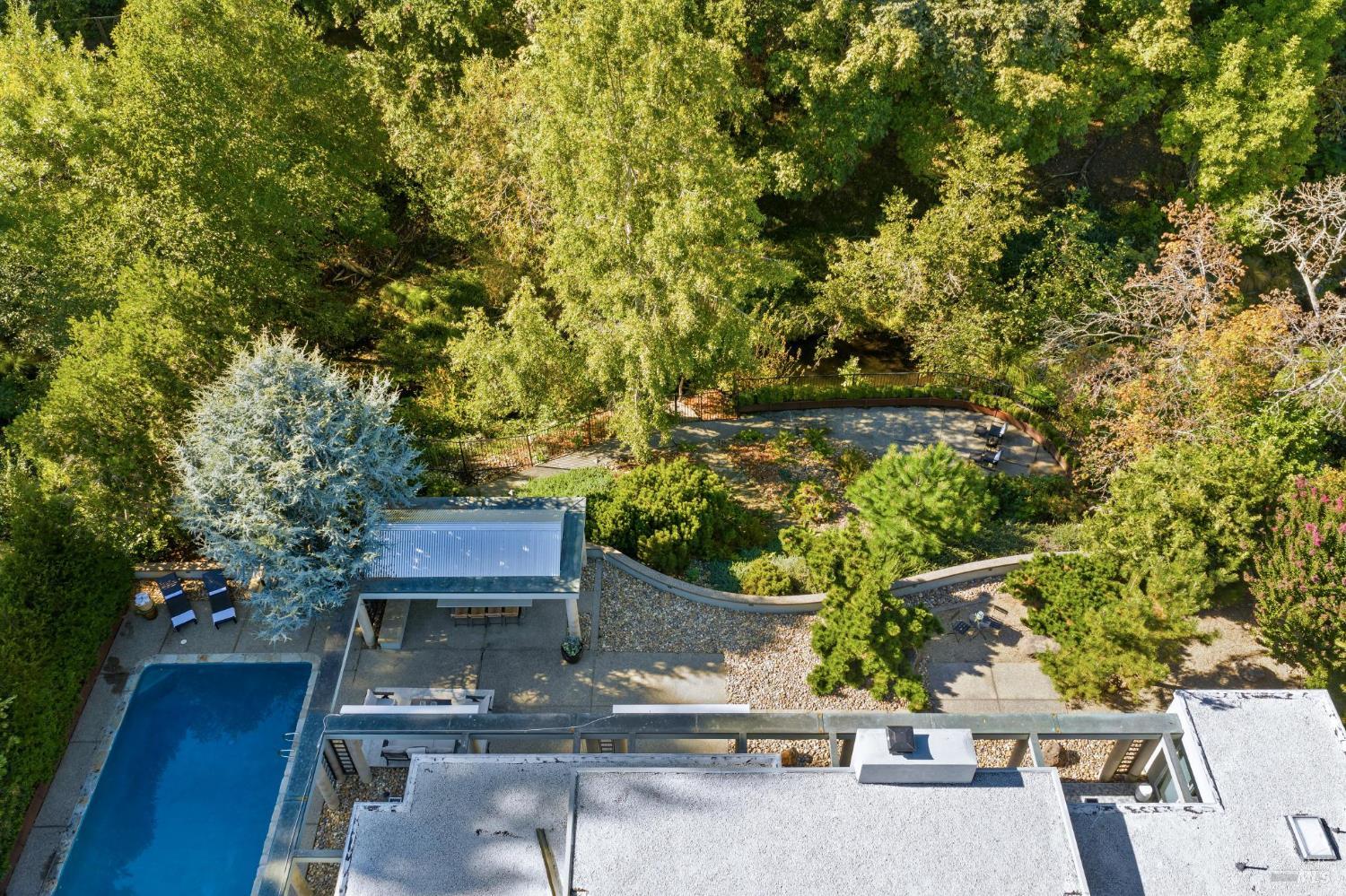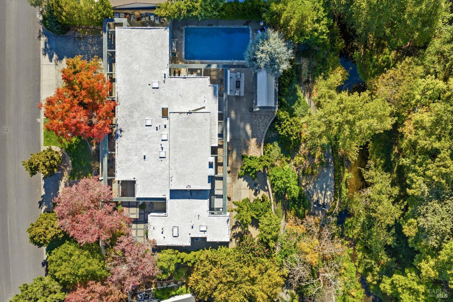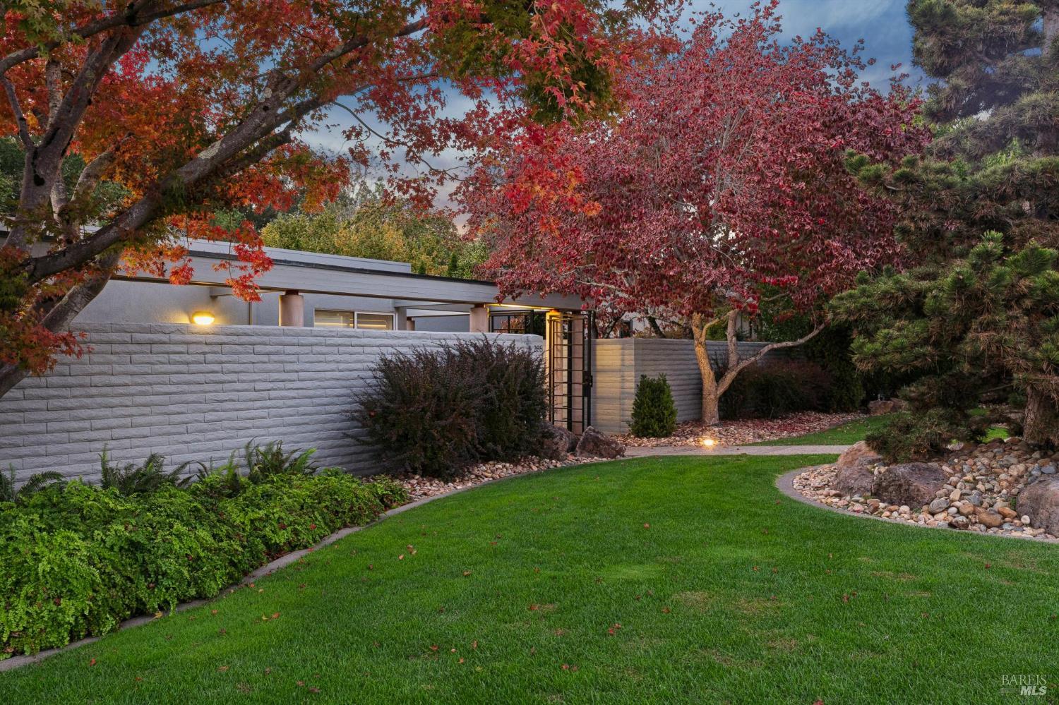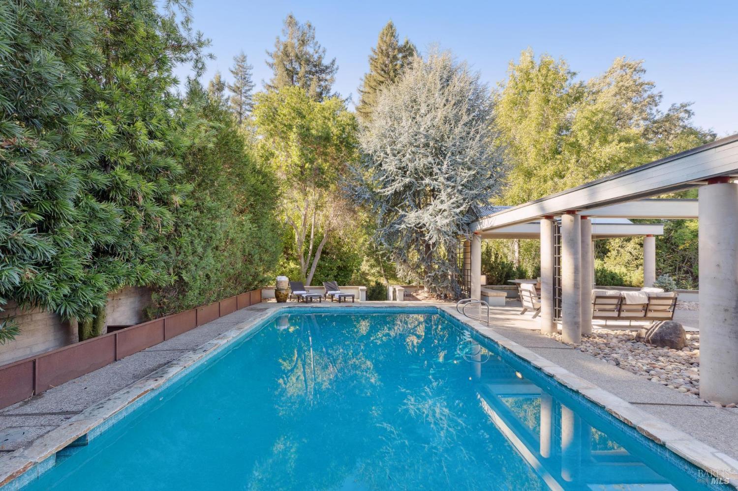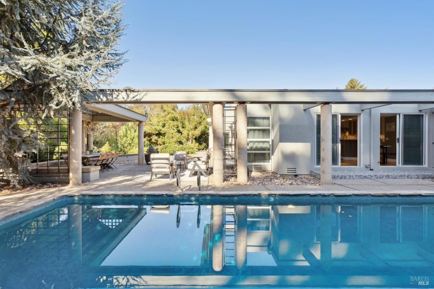 Single level mid-century modern 4 BR 3.5 BA 2831 sq ft home designed by highly acclaimed architect, Hank Bruce located in a beautiful & private creekside setting on .45 +/- acre with all city services minutes to downtown Napa & Yountville. Well designed with indoor/outdoor living in mind featuring series of glass doors that open to outdoor entertaining area with heated pool, lighted dining pavilion, creekside patio & multiple seating areas. Open floorplan encompasses 2 great rooms: one with formal living & dining featuring dramatic elevated exposed wood beam ceiling with transom windows, gas fireplace & built-in bar. The other great room features family room opening to delightful kitchen with counter seating, informal dining & stainless appliances. All 4 BRs; one of which is currently used as an office with custom built-ins, offer glass doors that open to private seating areas. Spacious main ensuite features large walk-in closet with skylight, 2 full baths & a bonus room currently used as yoga & exercise retreat. Hardwood floors throughout all main living areas & BRs, elevated ceilings, transom windows, skylights, retractable awnings, newer tankless water heater & HVAC. Enjoy Silverado Resort & Spa with golf, tennis, restaurants, & cafe with Starbucks! No HOA dues!