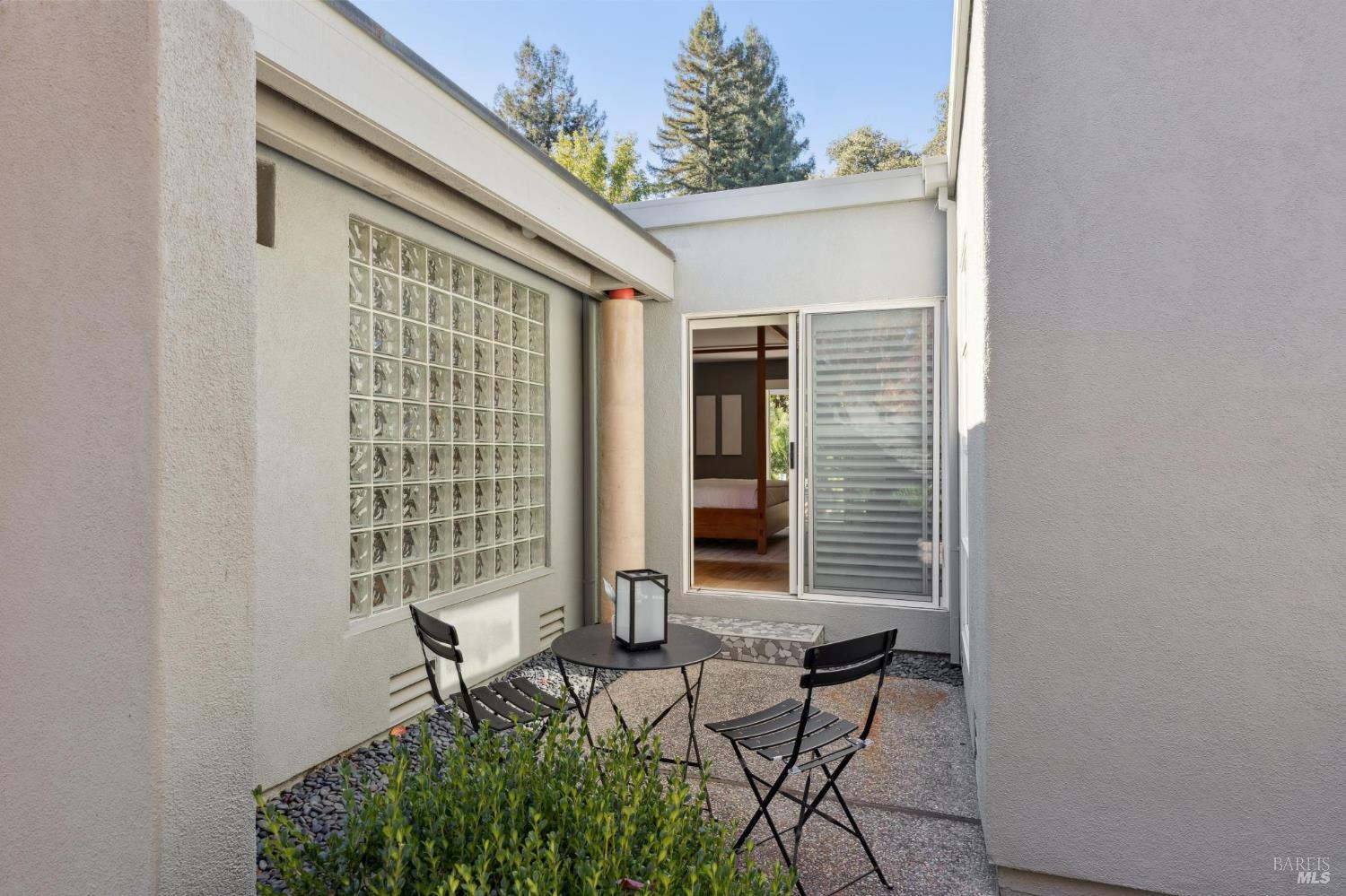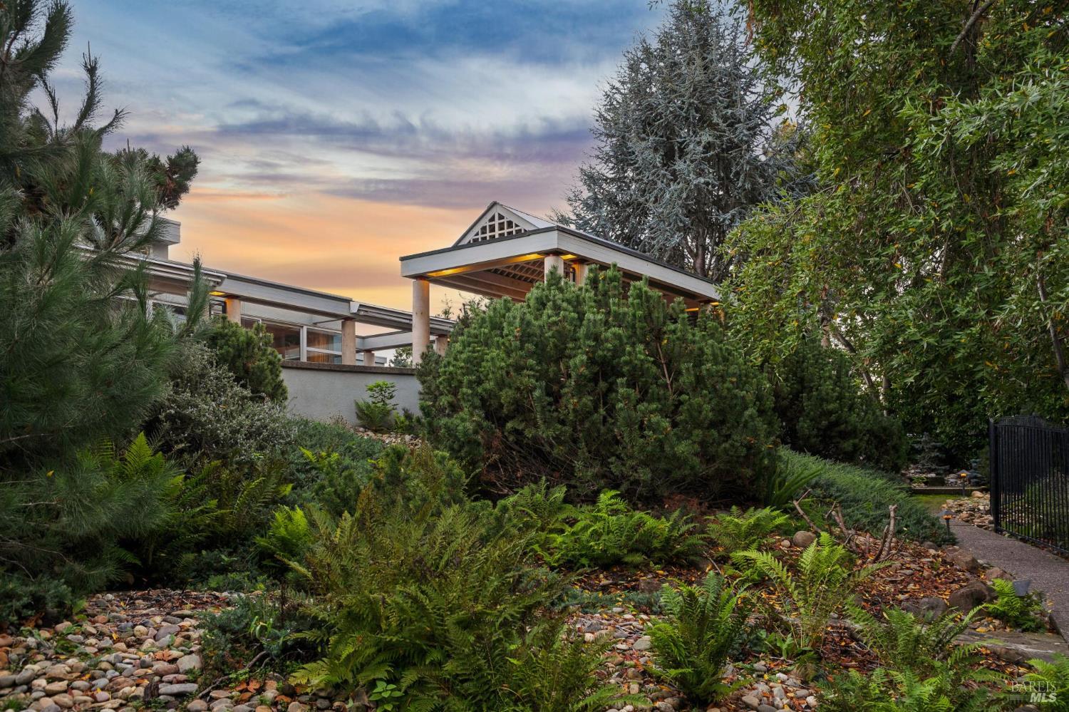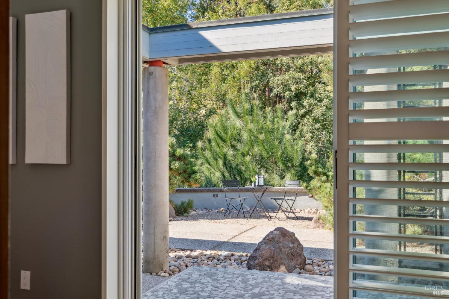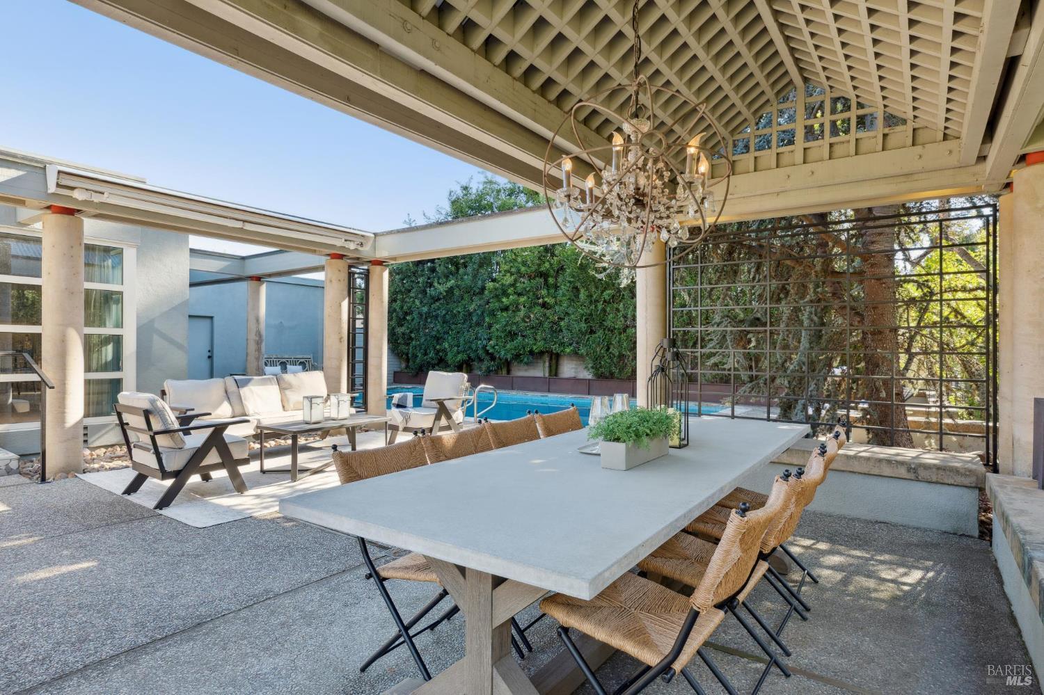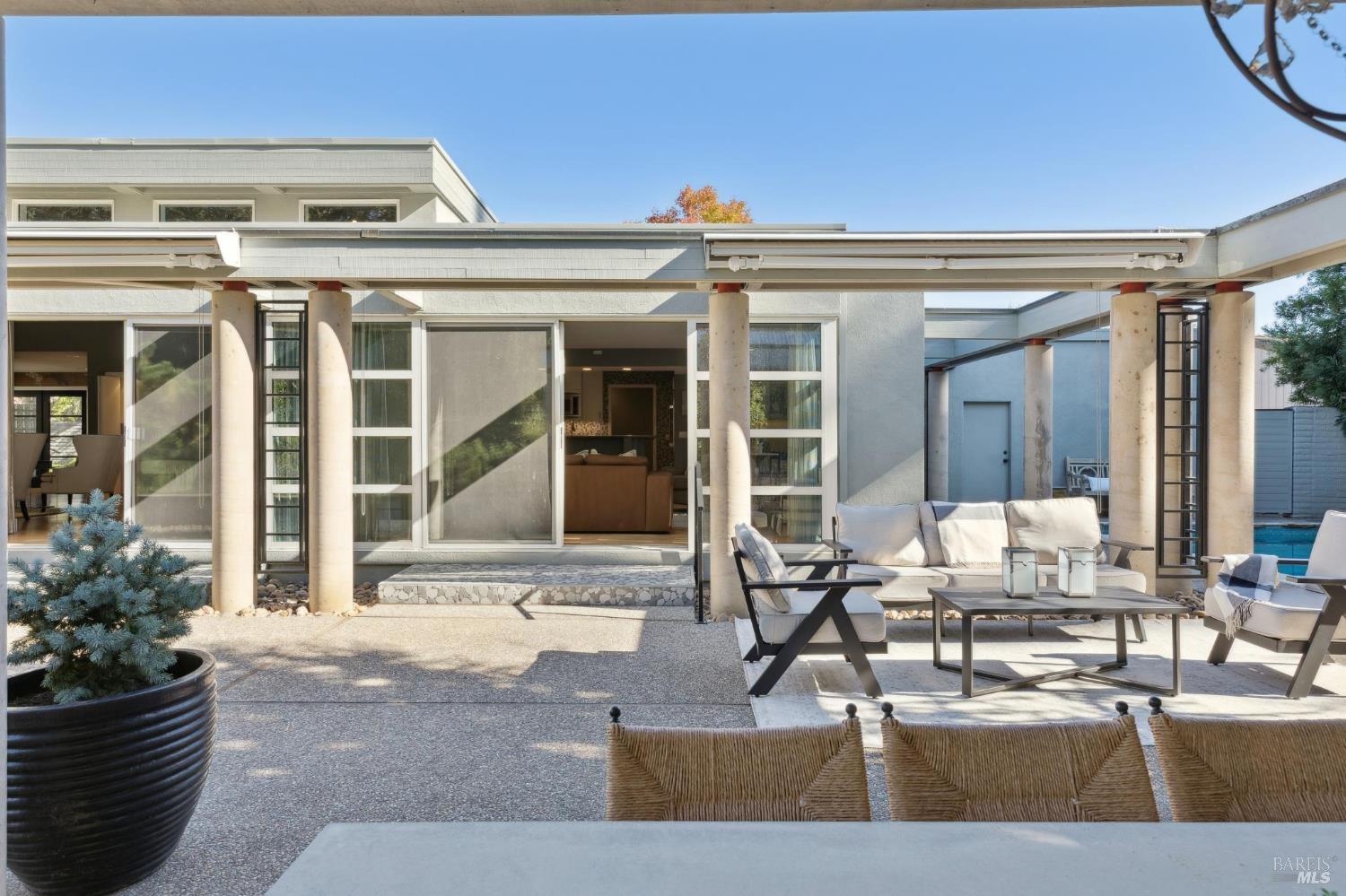 Single level mid-century modern 4 BR 3.5 BA 2831 sq ft home designed by highly acclaimed architect, Hank Bruce located in a beautiful & private creekside setting on .45 +/- acre with all city services minutes to downtown Napa & Yountville. Well designed with indoor/outdoor living in mind featuring series of glass doors that open to outdoor entertaining area with heated pool, lighted dining pavilion, creekside patio & multiple seating areas. Open floorplan encompasses 2 great rooms: one with formal living & dining featuring dramatic elevated exposed wood beam ceiling with transom windows, gas fireplace & built-in bar. The other great room features family room opening to delightful kitchen with counter seating, informal dining & stainless appliances. All 4 BRs; one of which is currently used as an office with custom built-ins, offer glass doors that open to private seating areas. Spacious main ensuite features large walk-in closet with skylight, 2 full baths & a bonus room currently used as yoga & exercise retreat. Hardwood floors throughout all main living areas & BRs, elevated ceilings, transom windows, skylights, retractable awnings, newer tankless water heater & HVAC. Enjoy Silverado Resort & Spa with golf, tennis, restaurants, & cafe with Starbucks! No HOA dues!