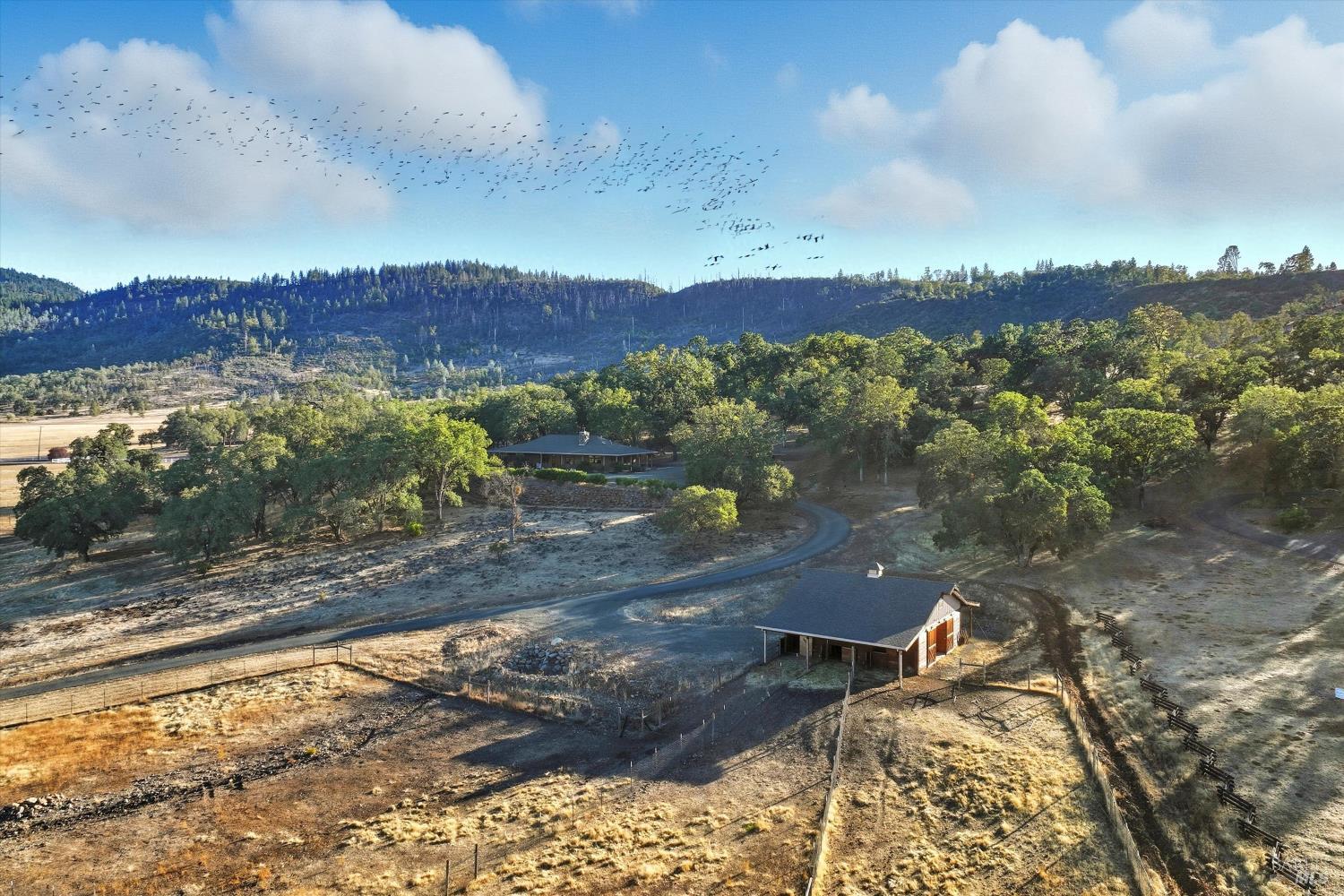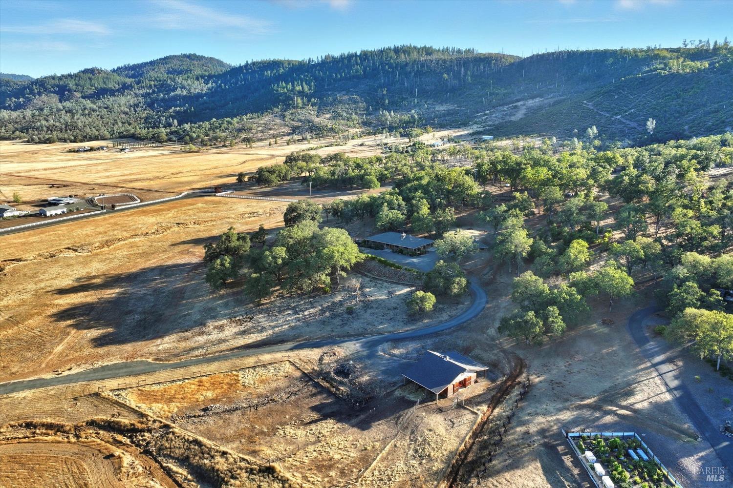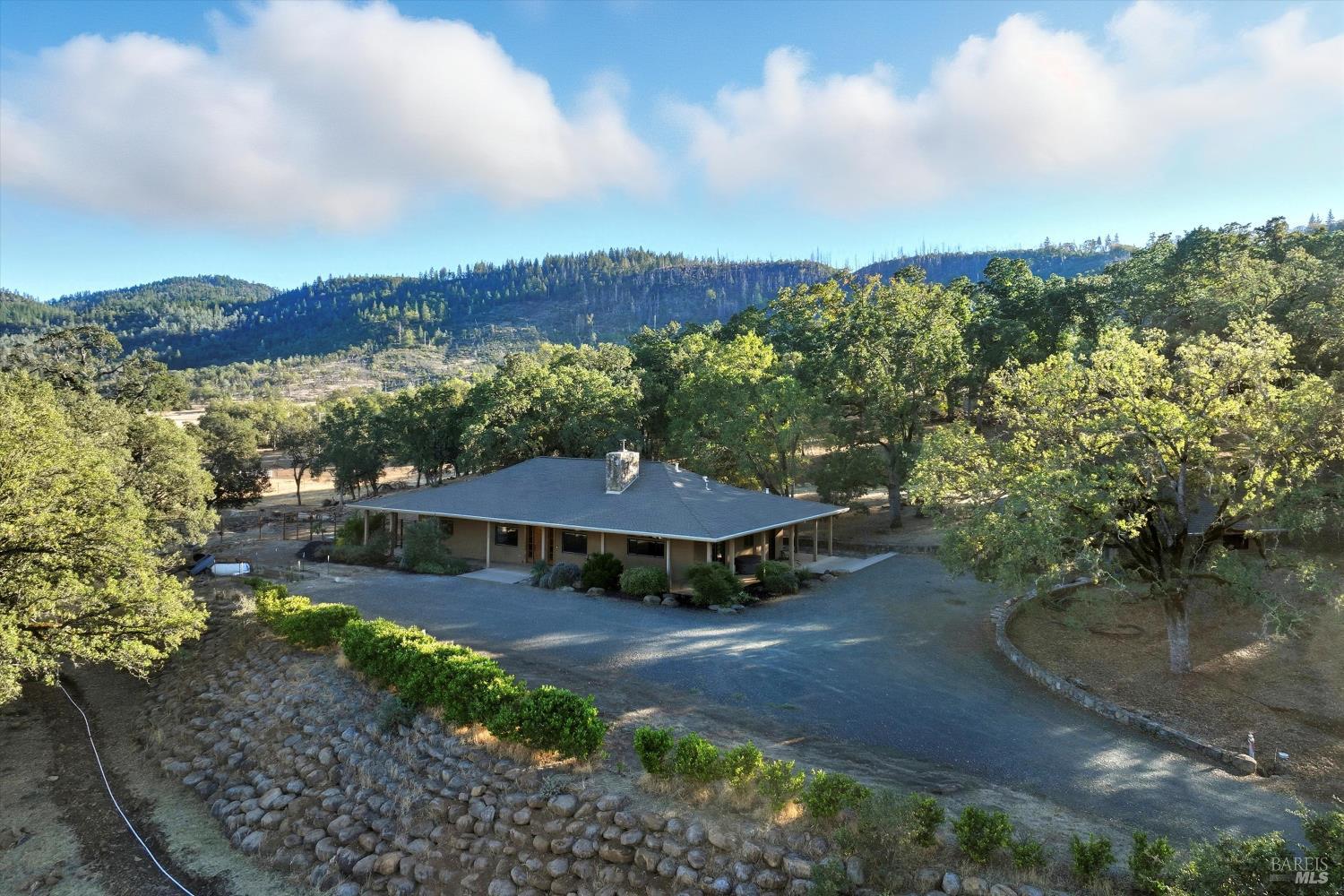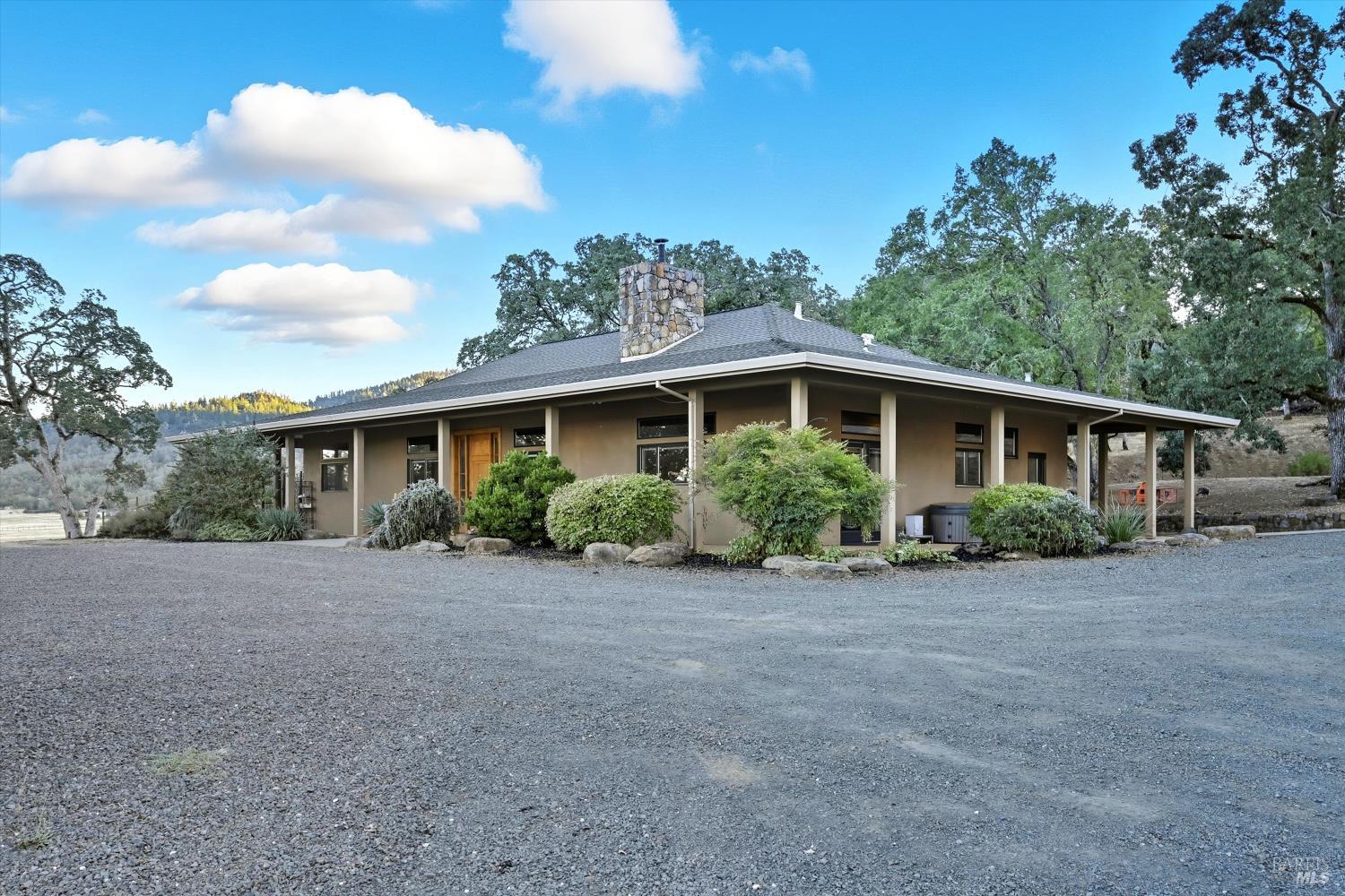 Welcome to this stunning single-level modern stucco home on 23.57 acres of serene land with beautiful oak trees and breathtaking meadow views. This property blends contemporary design with natural beauty, creating an ideal sanctuary. The spacious open floor plan features soaring ceilings and elegant heated vinyl plank flooring. The chef's kitchen is a culinary dream with a sleek European-style hood, a center island with built-in seating, wireless charging, and a wet sink. The dining room offers custom lighting and stunning views through slider doors leading to the expansive private backyard. The luxurious main bedroom suite boasts 10' ceilings, a large slider/picture window door to the side yard, and a spa-style bath with a sunny walk-in custom tile shower, dual sink vanity, and a spacious walk-in closet. Two additional bedrooms share a hall bath with dual sink areas and a custom tiled tub/shower. The property includes a 32-panel solar system with two Tesla Power Wall 3s. Outdoor living features sprawling wrap-around patios and walkways. A 3.5-acre fenced area includes walking paths and a chicken area. The estate also features a 1,700 sq ft barn with horse stalls, a tack room, and a hayloft. Located in the upscale Black Oak Hill Estates community in Lake County.