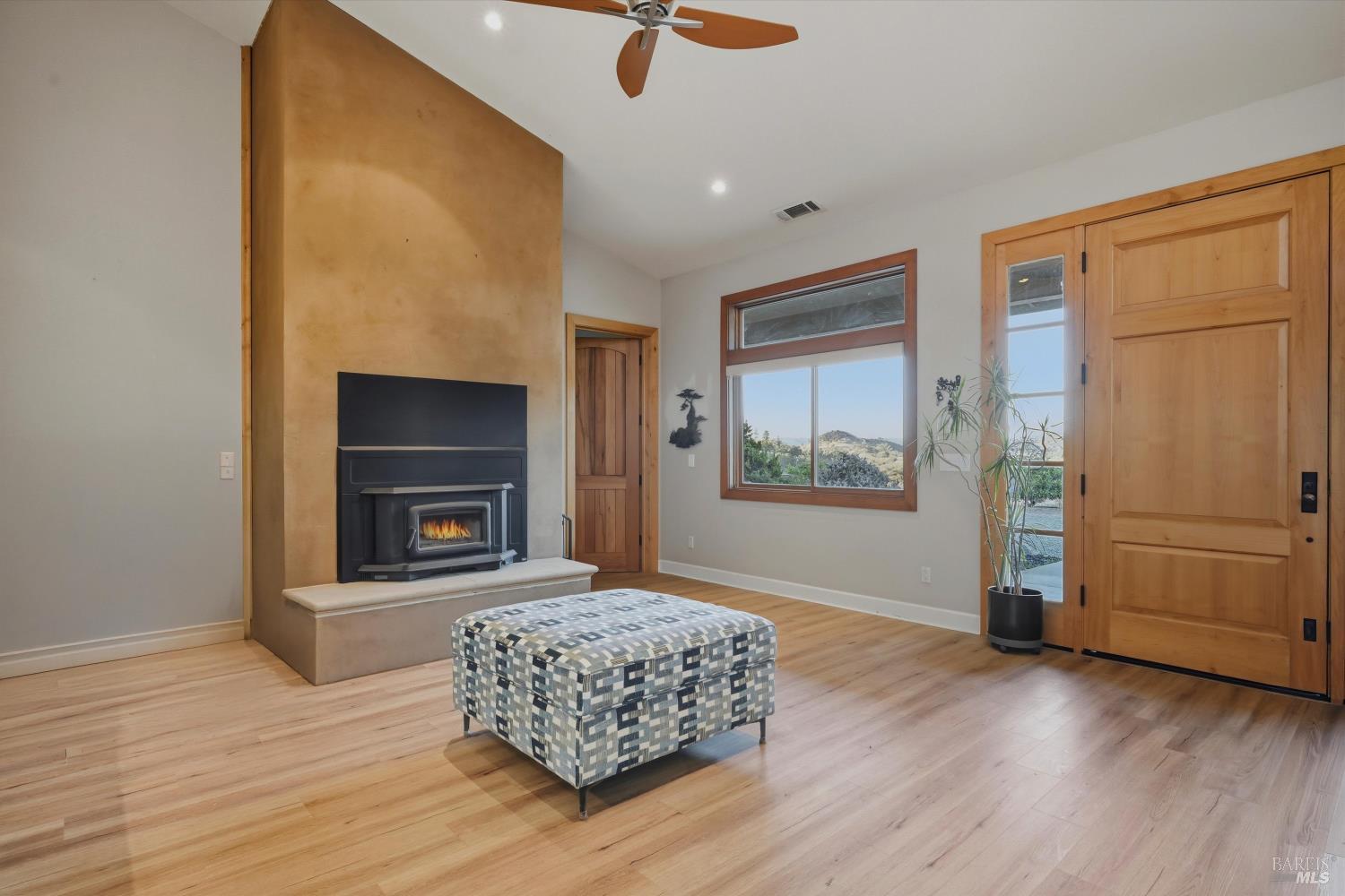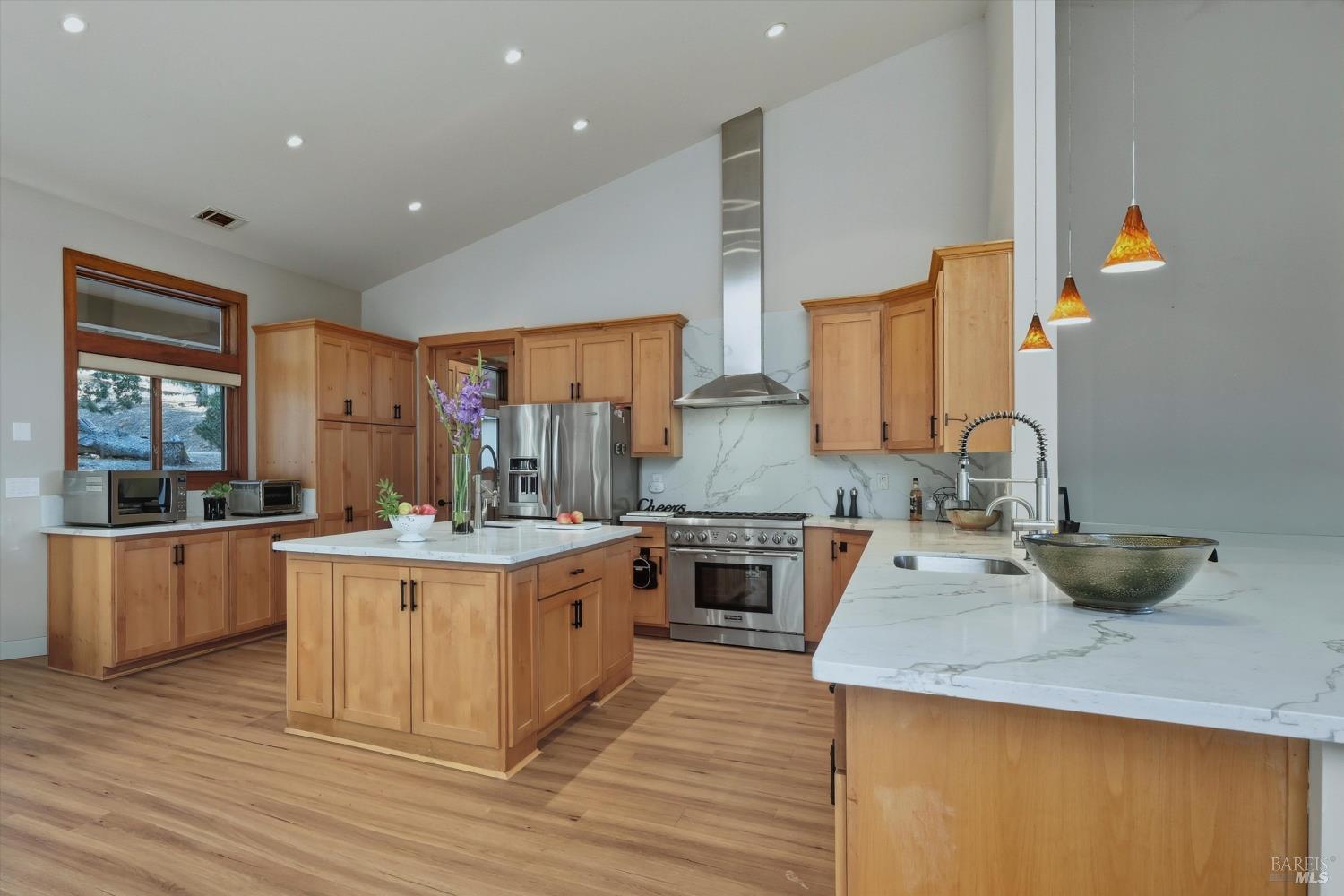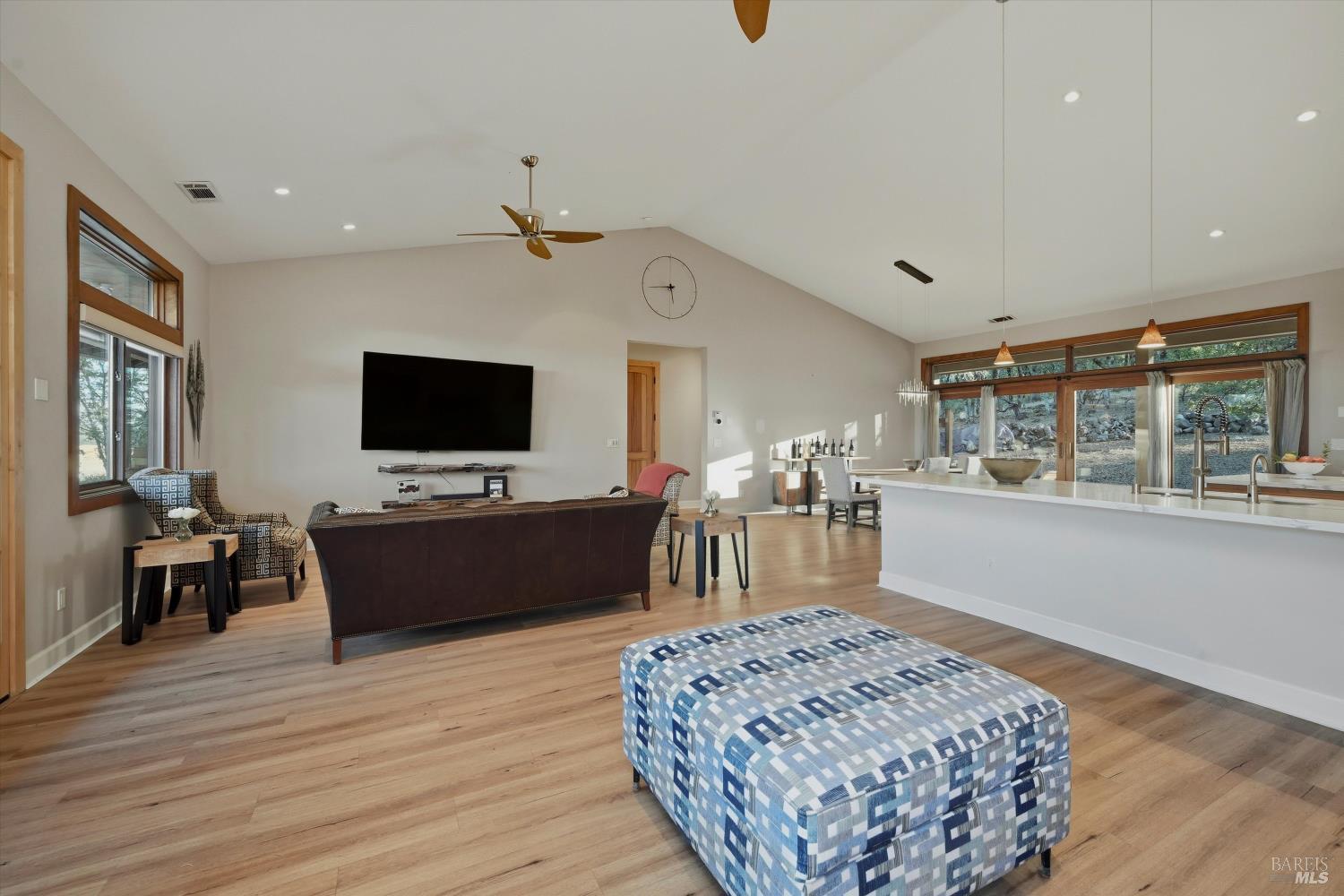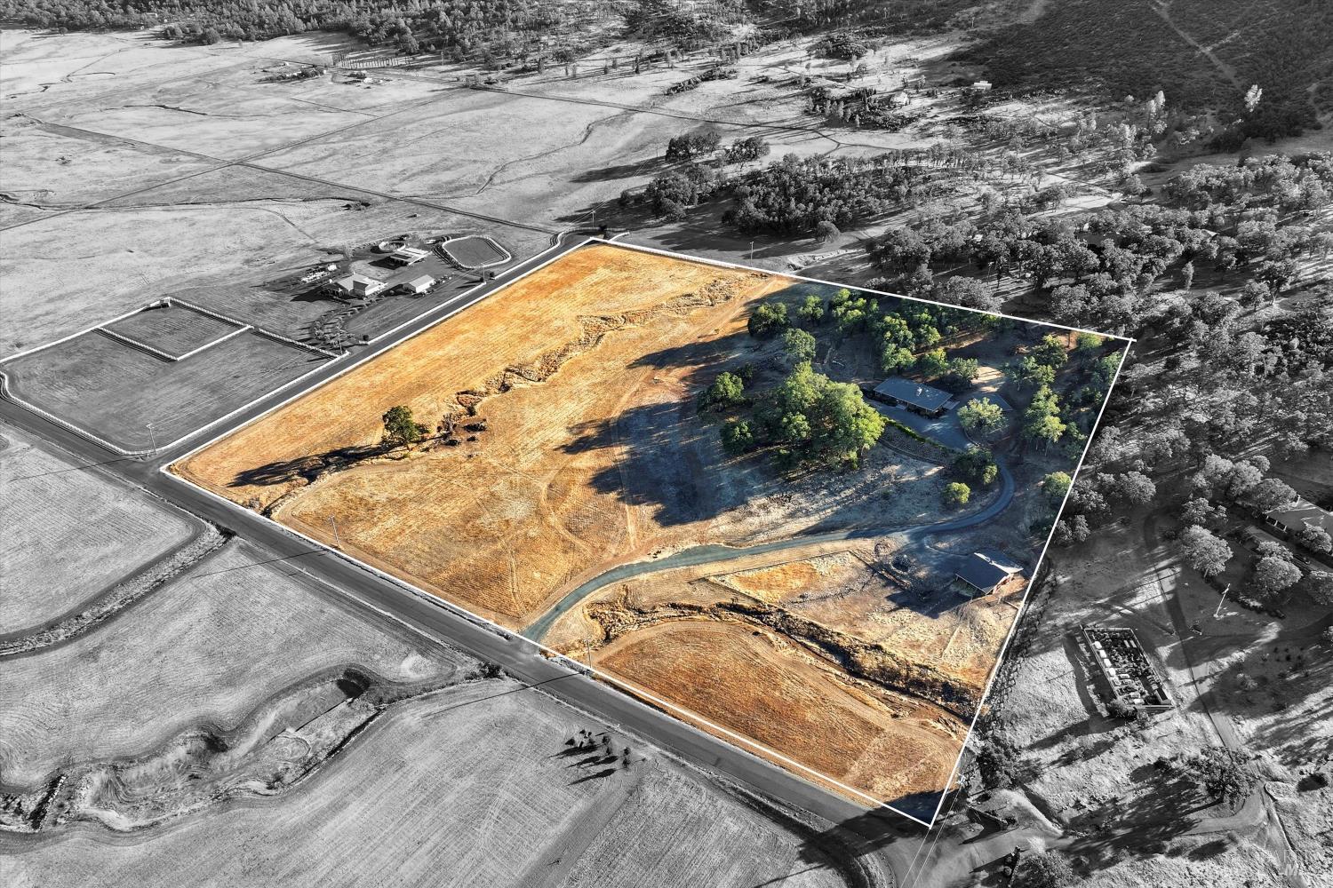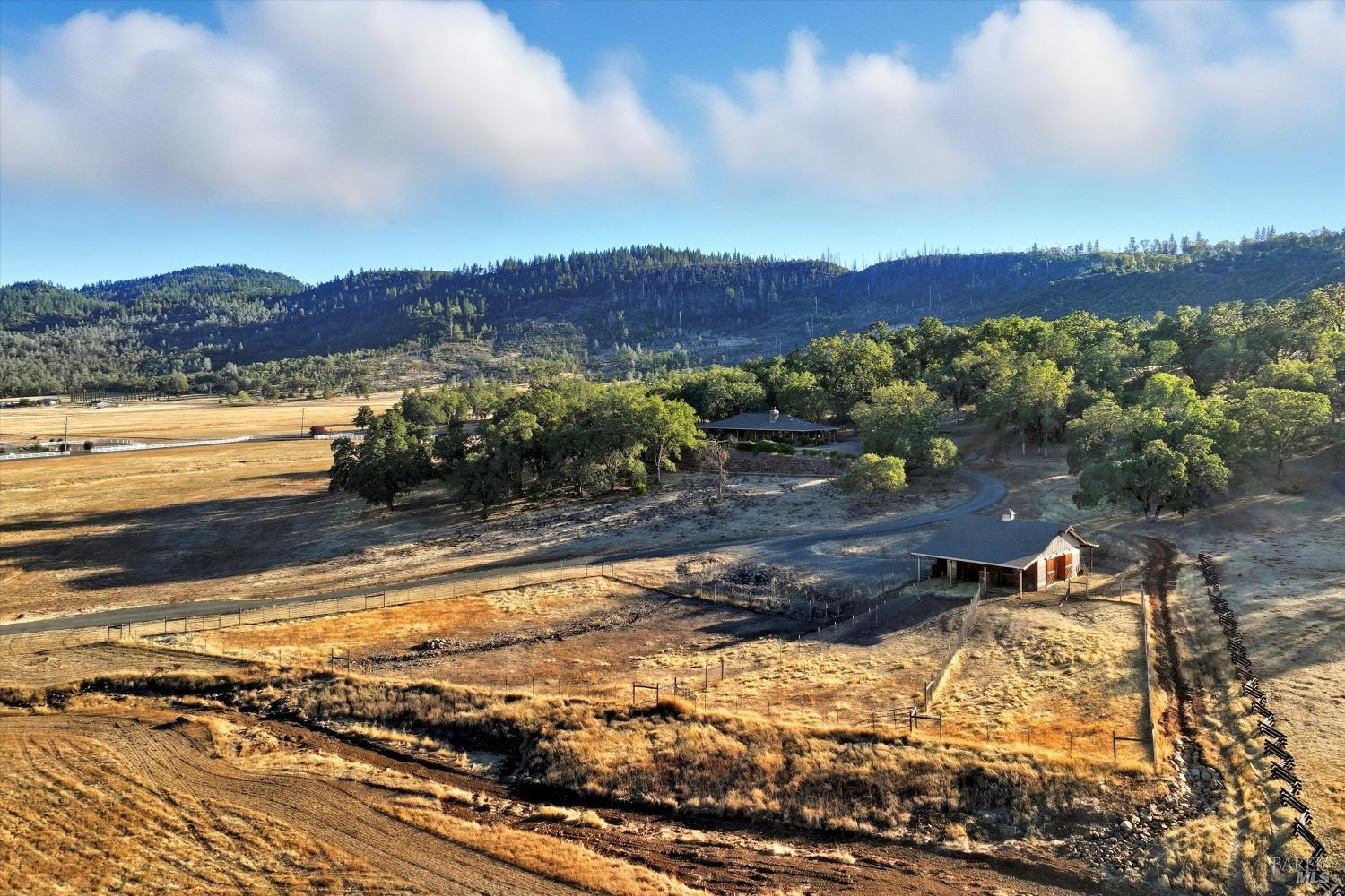 Welcome to this stunning single-level modern stucco home on 23.57 acres of serene land with beautiful oak trees and breathtaking meadow views. This property blends contemporary design with natural beauty, creating an ideal sanctuary. The spacious open floor plan features soaring ceilings and elegant heated vinyl plank flooring. The chef's kitchen is a culinary dream with a sleek European-style hood, a center island with built-in seating, wireless charging, and a wet sink. The dining room offers custom lighting and stunning views through slider doors leading to the expansive private backyard. The luxurious main bedroom suite boasts 10' ceilings, a large slider/picture window door to the side yard, and a spa-style bath with a sunny walk-in custom tile shower, dual sink vanity, and a spacious walk-in closet. Two additional bedrooms share a hall bath with dual sink areas and a custom tiled tub/shower. The property includes a 32-panel solar system with two Tesla Power Wall 3s. Outdoor living features sprawling wrap-around patios and walkways. A 3.5-acre fenced area includes walking paths and a chicken area. The estate also features a 1,700 sq ft barn with horse stalls, a tack room, and a hayloft. Located in the upscale Black Oak Hill Estates community in Lake County.