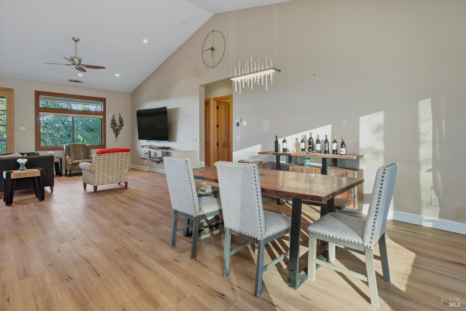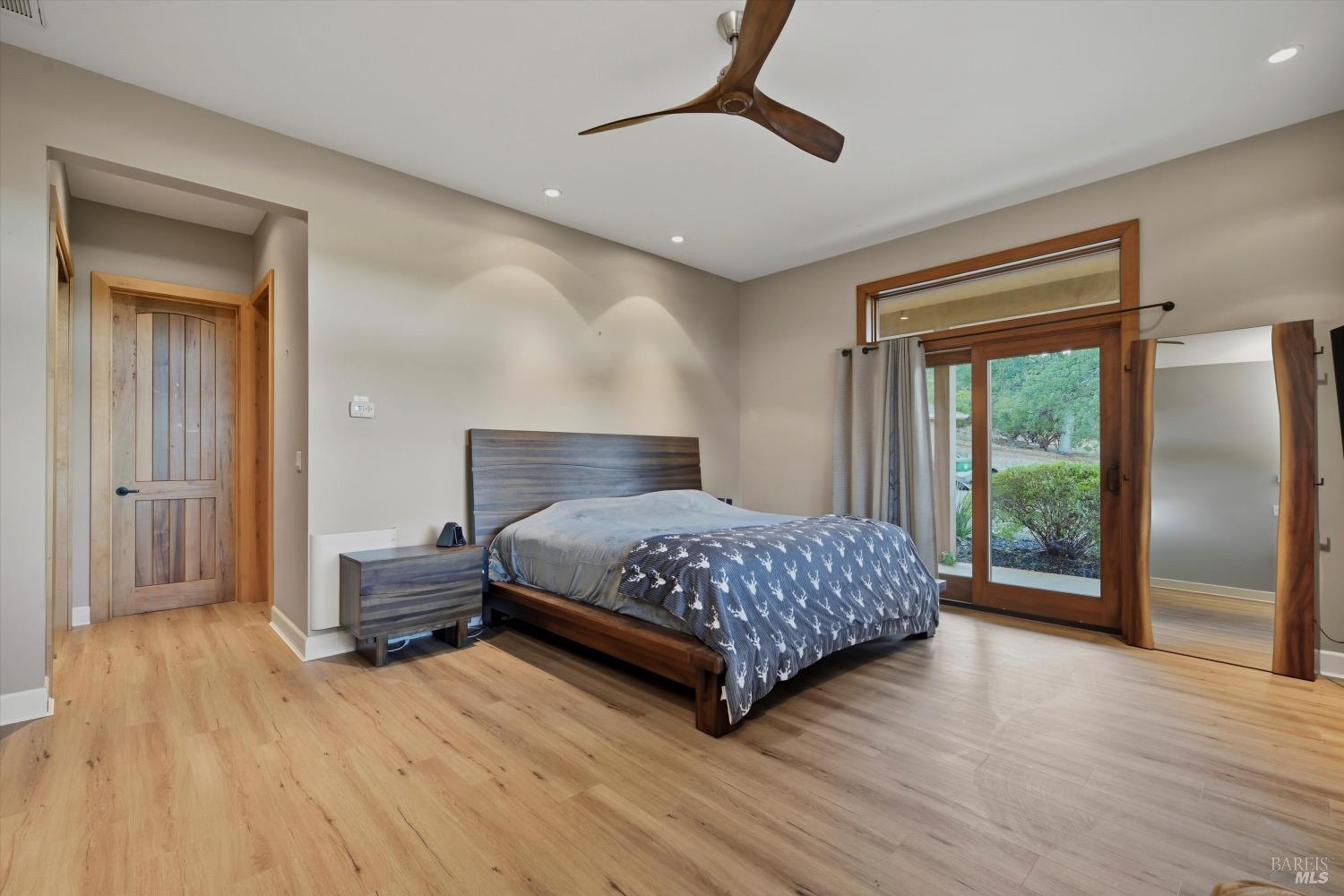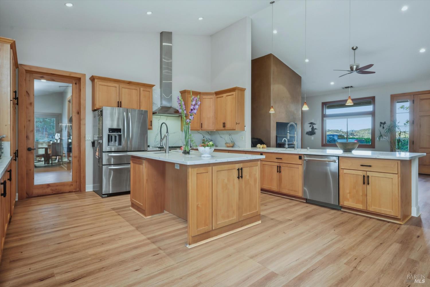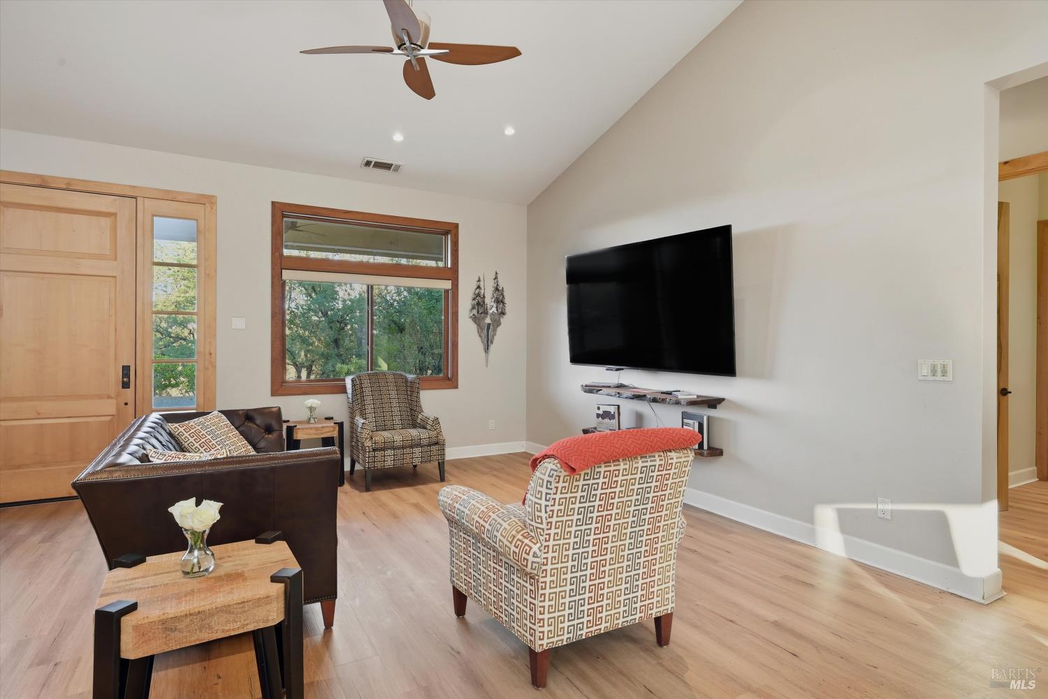 Welcome to this stunning single-level modern stucco home on 23.57 acres of serene land with beautiful oak trees and breathtaking meadow views. This property blends contemporary design with natural beauty, creating an ideal sanctuary. The spacious open floor plan features soaring ceilings and elegant heated vinyl plank flooring. The chef's kitchen is a culinary dream with a sleek European-style hood, a center island with built-in seating, wireless charging, and a wet sink. The dining room offers custom lighting and stunning views through slider doors leading to the expansive private backyard. The luxurious main bedroom suite boasts 10' ceilings, a large slider/picture window door to the side yard, and a spa-style bath with a sunny walk-in custom tile shower, dual sink vanity, and a spacious walk-in closet. Two additional bedrooms share a hall bath with dual sink areas and a custom tiled tub/shower. The property includes a 32-panel solar system with two Tesla Power Wall 3s. Outdoor living features sprawling wrap-around patios and walkways. A 3.5-acre fenced area includes walking paths and a chicken area. The estate also features a 1,700 sq ft barn with horse stalls, a tack room, and a hayloft. Located in the upscale Black Oak Hill Estates community in Lake County.