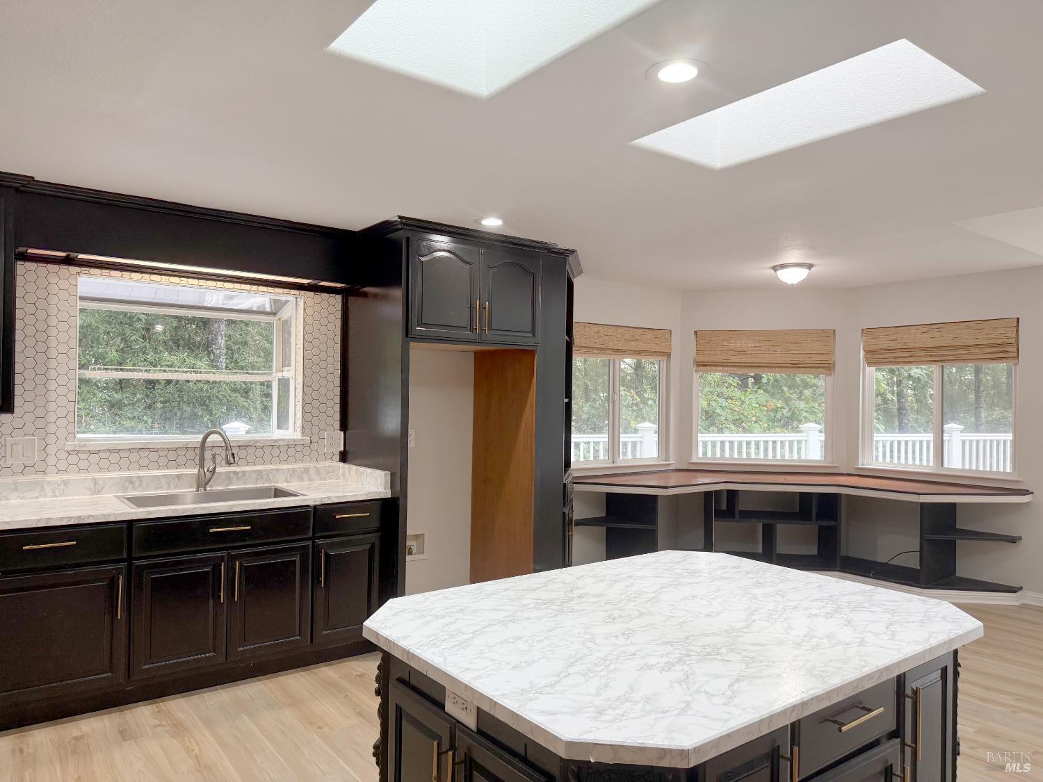 Step into this super clean large two-story home situated on just under a half acre in a sunny Brooktrails location. The kitchen is well designed with ample counterspace, cabinetry, and an island with skylights above. You will appreciate the built in oven, cooktop, new dishwasher, large sink with green house window above, and sizeable pantry closet. In the dining and living areas you will find a fireplace with a gorgeous carved mantle and access to a large wrap-around deck. Enjoy scenic views from the large windows in the living room. With 4 bedrooms and 2.5 baths the home is designed to accommodate a range of lifestyles and uses. The primary suite provides direct access to the back deck, two walk-in closets and an ensuite bath featuring dual sinks. Recent improvements to the house include fresh interior paint, new flooring in some rooms, and a new hot water heater. Additional features include central heating and air conditioning, a fenced garden area with raised beds, an attached 2-car garage, and an outbuilding that offers extra storage. The lower level offers its own private access to an additional bedroom, a half bath, and a bonus room with lots of storage and cabinetry. An exceptional opportunity awaits its new owners.
