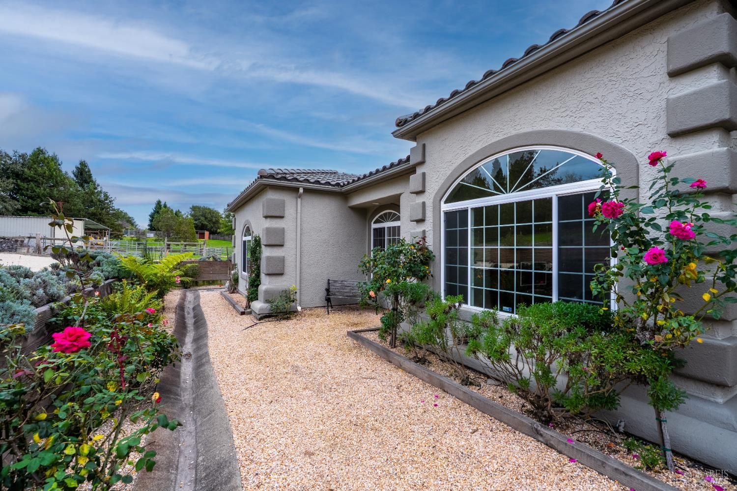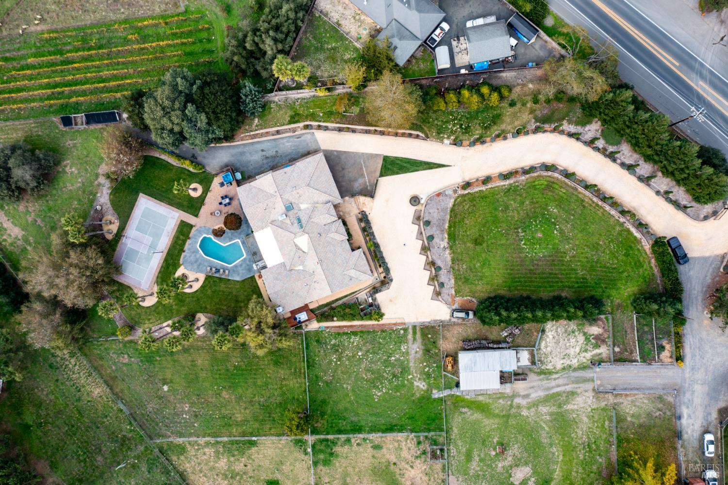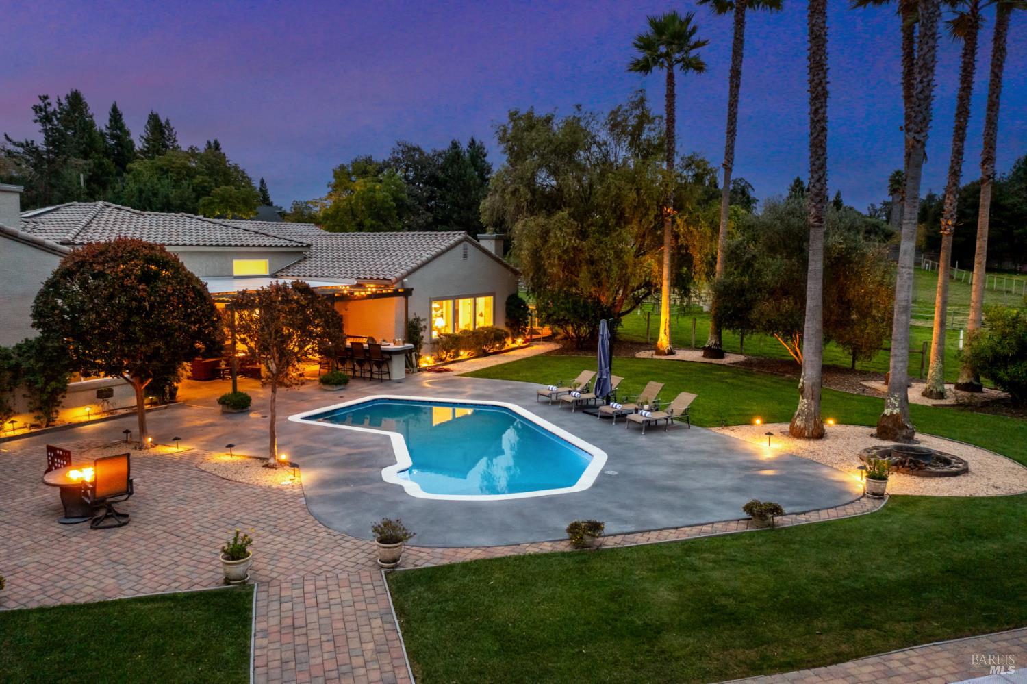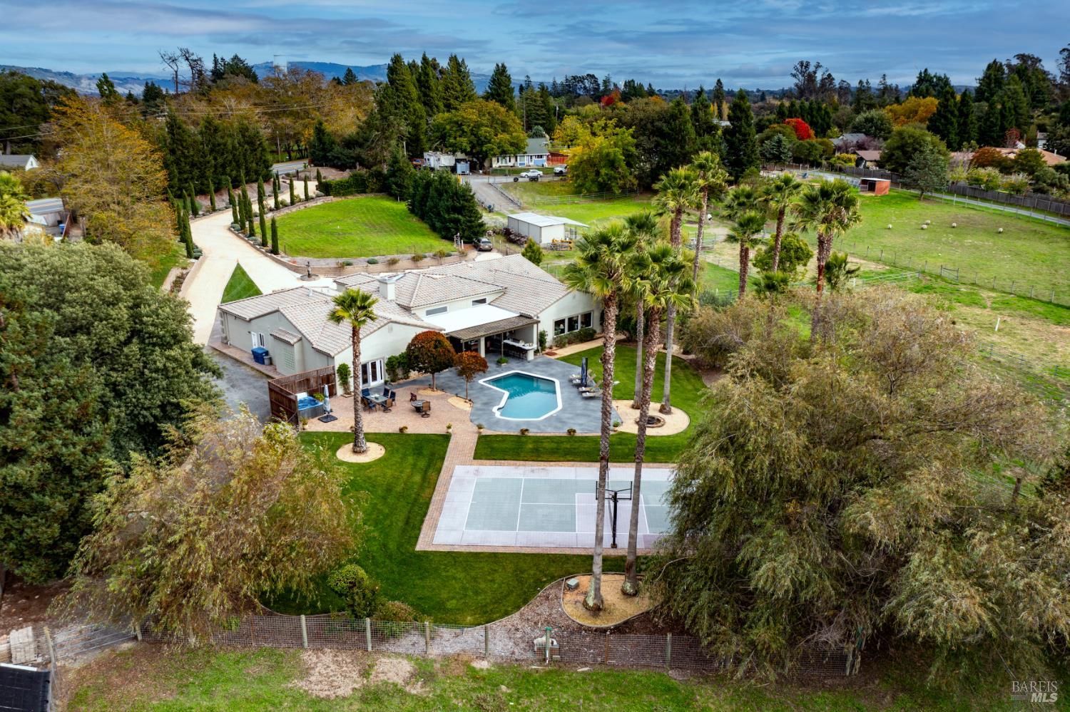 Nestled along a private, cypress-lined gated drive in Sebastopol, this Mediterranean estate blends privacy, elegance, and resort-style living on over 2 acres. Spanning approximately 4,500 sq. ft. with 4 bedrooms and 4.5 baths, the home exudes elegance and comfort with grand open spaces, high ceilings, and seamless indoor-outdoor flow, and a seamless open-concept layout. The grand great room invites you in with a tiled fireplace, built-in wet bar, and walls of windows that flood the space with natural light. The kitchen connects to the family and dining areas, creating the perfect flow for entertaining. The primary suite features French doors to the patio, a jetted soaking tub, a walk-in closet, a private fitness room, and a serene sitting area. Step outside to your own Sonoma County oasiscomplete with a sparkling pool, spa, covered outdoor kitchen, and multiple patios for al fresco dining. Enjoy a lighted sport court, cozy firepit, and fountains framed by majestic palm trees. A three-car garage with a temperature-controlled wine vault and ample RV and boat parking add to the property's appeal. Experience resort living every day with poolside sunsets, elegant gatherings, and peaceful privacyall just minutes from the heart of Sebastopol.