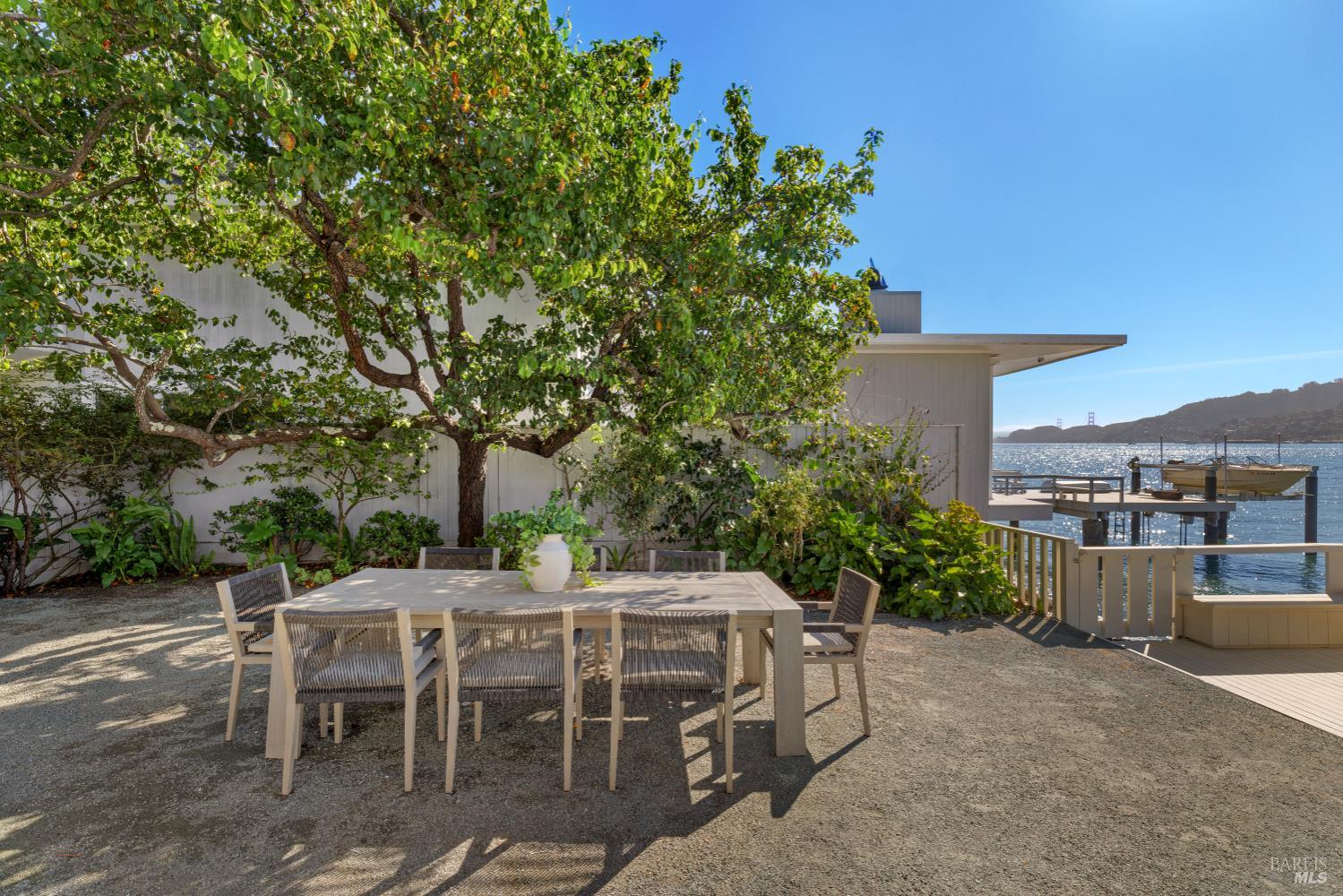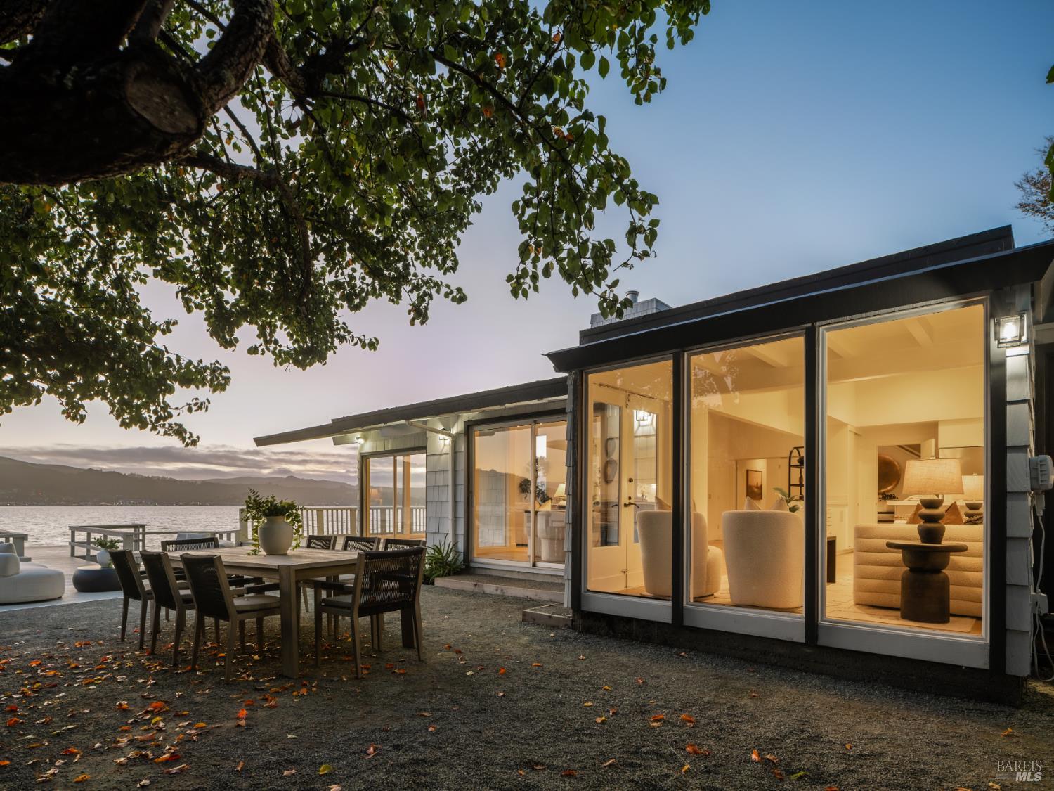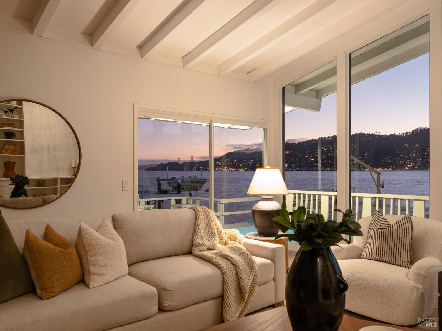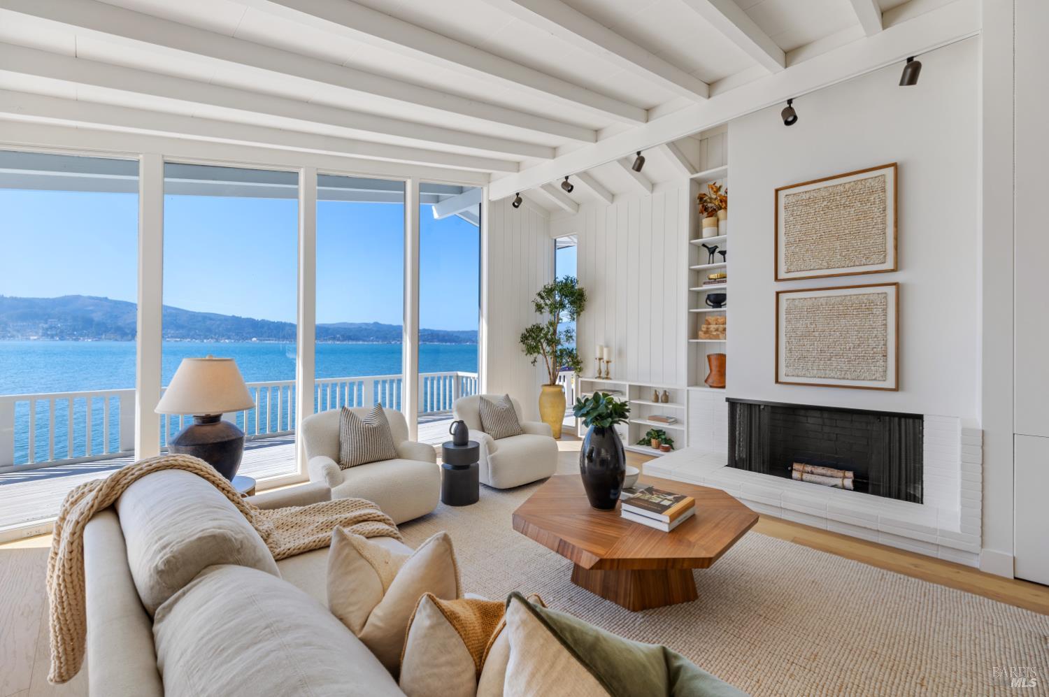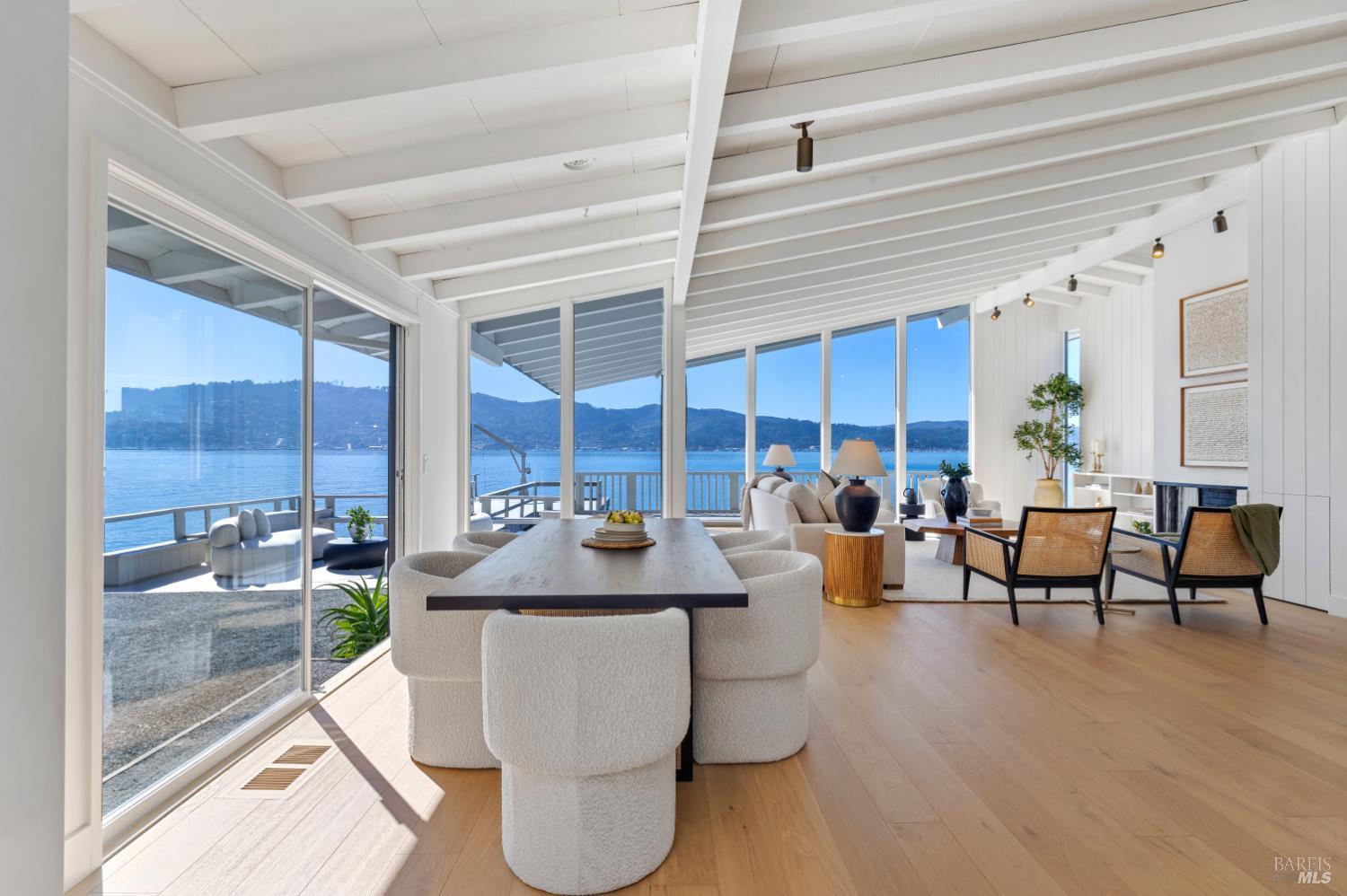 Situated along one of Belvedere's most exclusive waterfront streets, this inviting waterfront residence captures views of San Francisco, the Golden Gate Bridge, Sausalito, and Mount Tamalpais. Exuding a beach-inspired mid-century vibe, the home is designed for effortless indoor-outdoor living, with open, light-filled interiors that flow naturally to expansive decks, a gated yard with a turf lawn, outdoor dining areas, and a private dock, creating the ideal setting for relaxed waterfront living. New white oak hardwood floors on both levels. The light-filled living room features soaring vaulted ceilings, floor-to-ceiling windows that frame breathtaking views, a fireplace, and access to the expansive waterfront deck. Positioned to capture stunning water views, the dining room features large windows and sliding glass doors that open to the outdoors. The updated kitchen features quartz countertops, a peninsula with counter seating, and stainless steel appliances. Rare main-level primary suite with a private deck, a walk-in closet, and captivating views. A comfortable guest bedroom, a full bath, a laundry room, and a powder room complete the main level. The upper level features three bedrooms and a full bath. Attached two-car garage.
