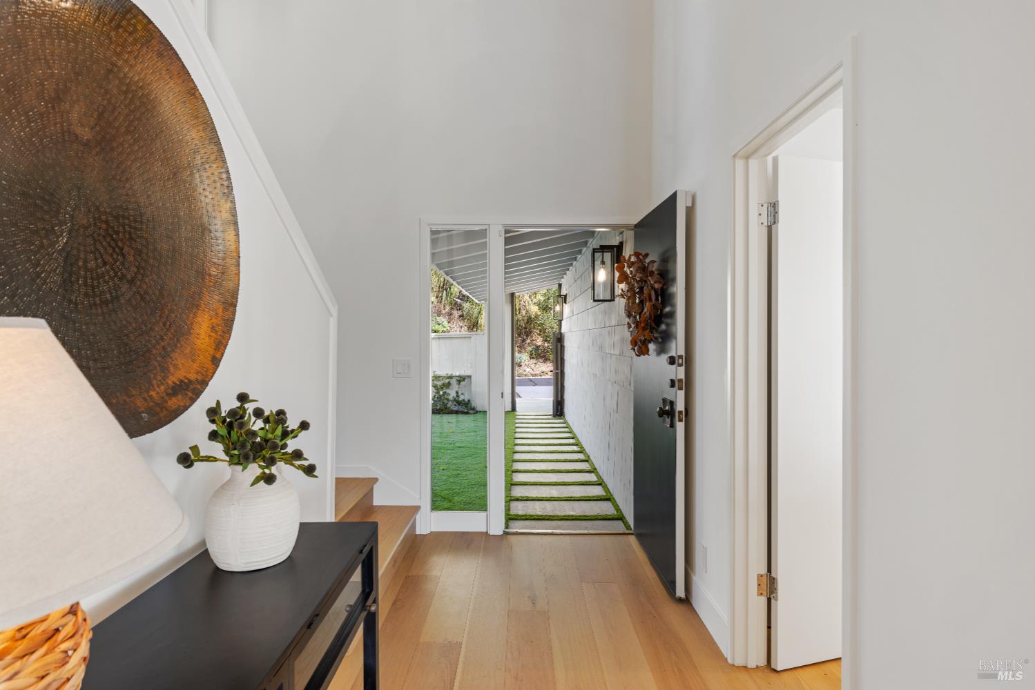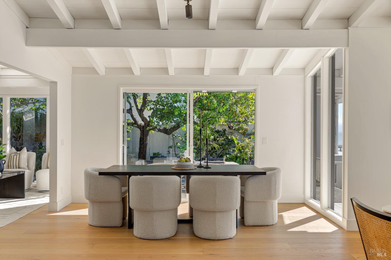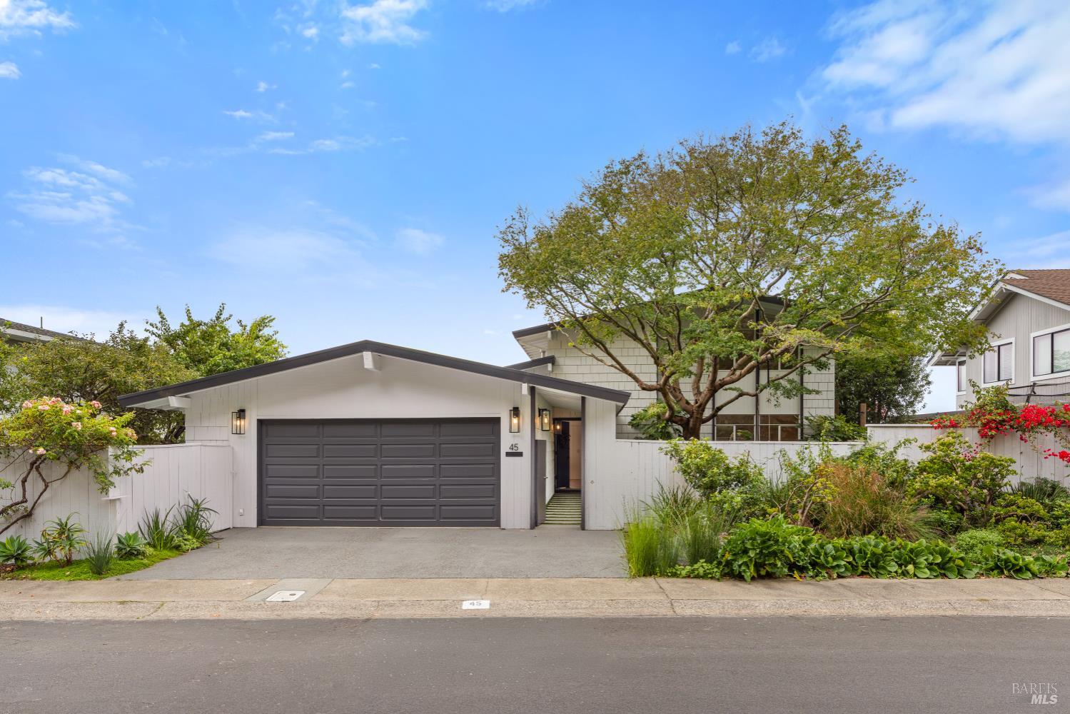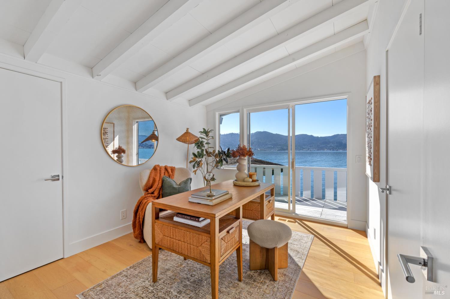 Situated along one of Belvedere's most exclusive waterfront streets, this inviting waterfront residence captures views of San Francisco, the Golden Gate Bridge, Sausalito, and Mount Tamalpais. Exuding a beach-inspired mid-century vibe, the home is designed for effortless indoor-outdoor living, with open, light-filled interiors that flow naturally to expansive decks, a gated yard with a turf lawn, outdoor dining areas, and a private dock, creating the ideal setting for relaxed waterfront living. New white oak hardwood floors on both levels. The light-filled living room features soaring vaulted ceilings, floor-to-ceiling windows that frame breathtaking views, a fireplace, and access to the expansive waterfront deck. Positioned to capture stunning water views, the dining room features large windows and sliding glass doors that open to the outdoors. The updated kitchen features quartz countertops, a peninsula with counter seating, and stainless steel appliances. Rare main-level primary suite with a private deck, a walk-in closet, and captivating views. A comfortable guest bedroom, a full bath, a laundry room, and a powder room complete the main level. The upper level features three bedrooms and a full bath. Attached two-car garage.