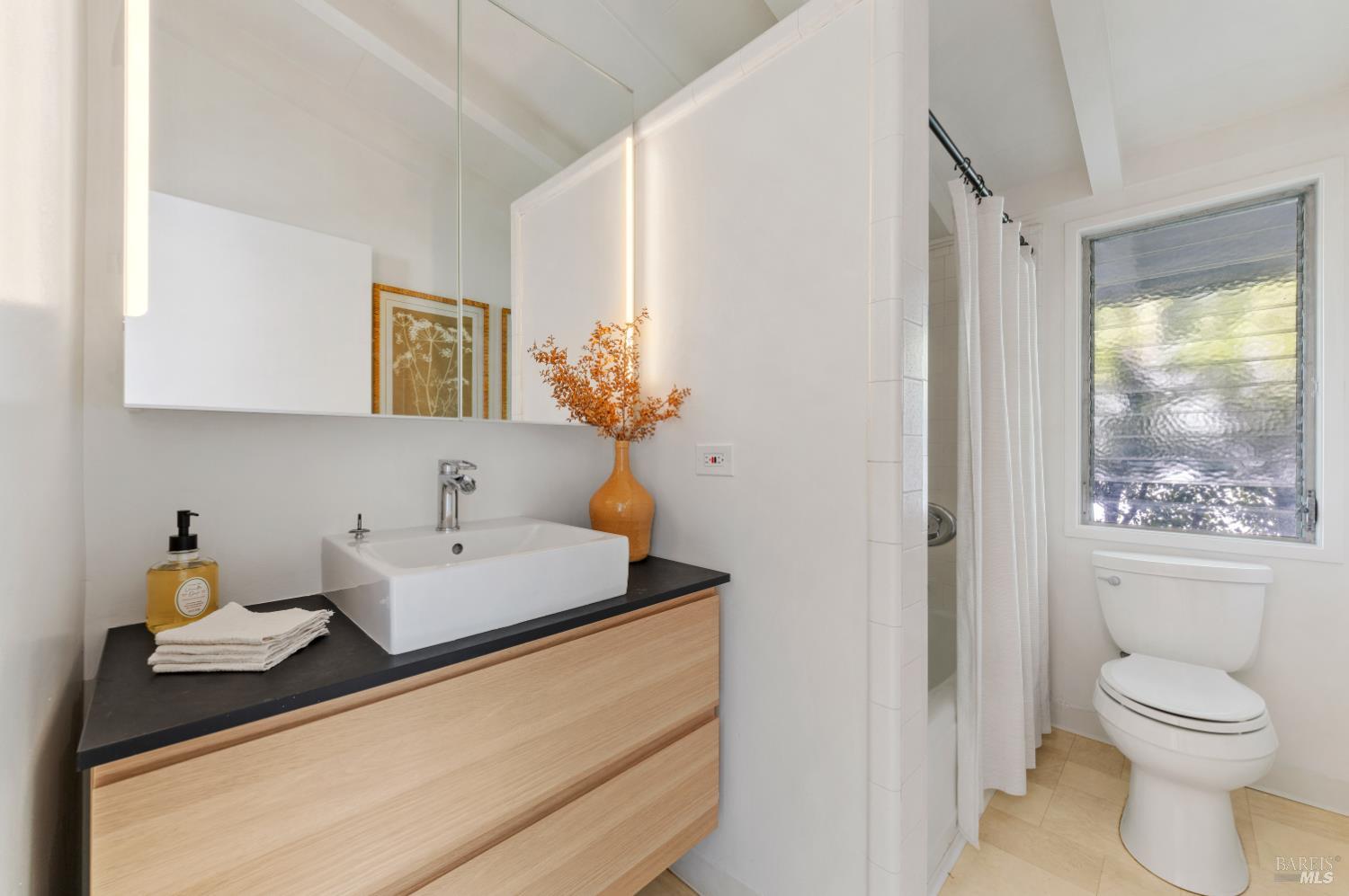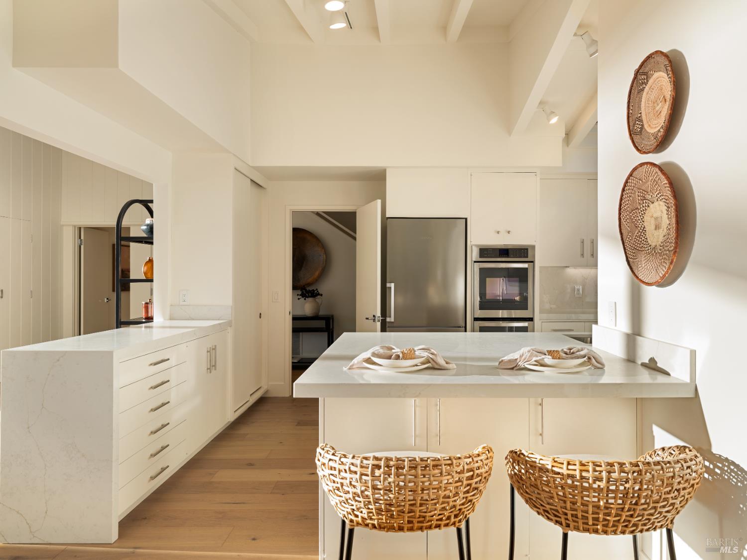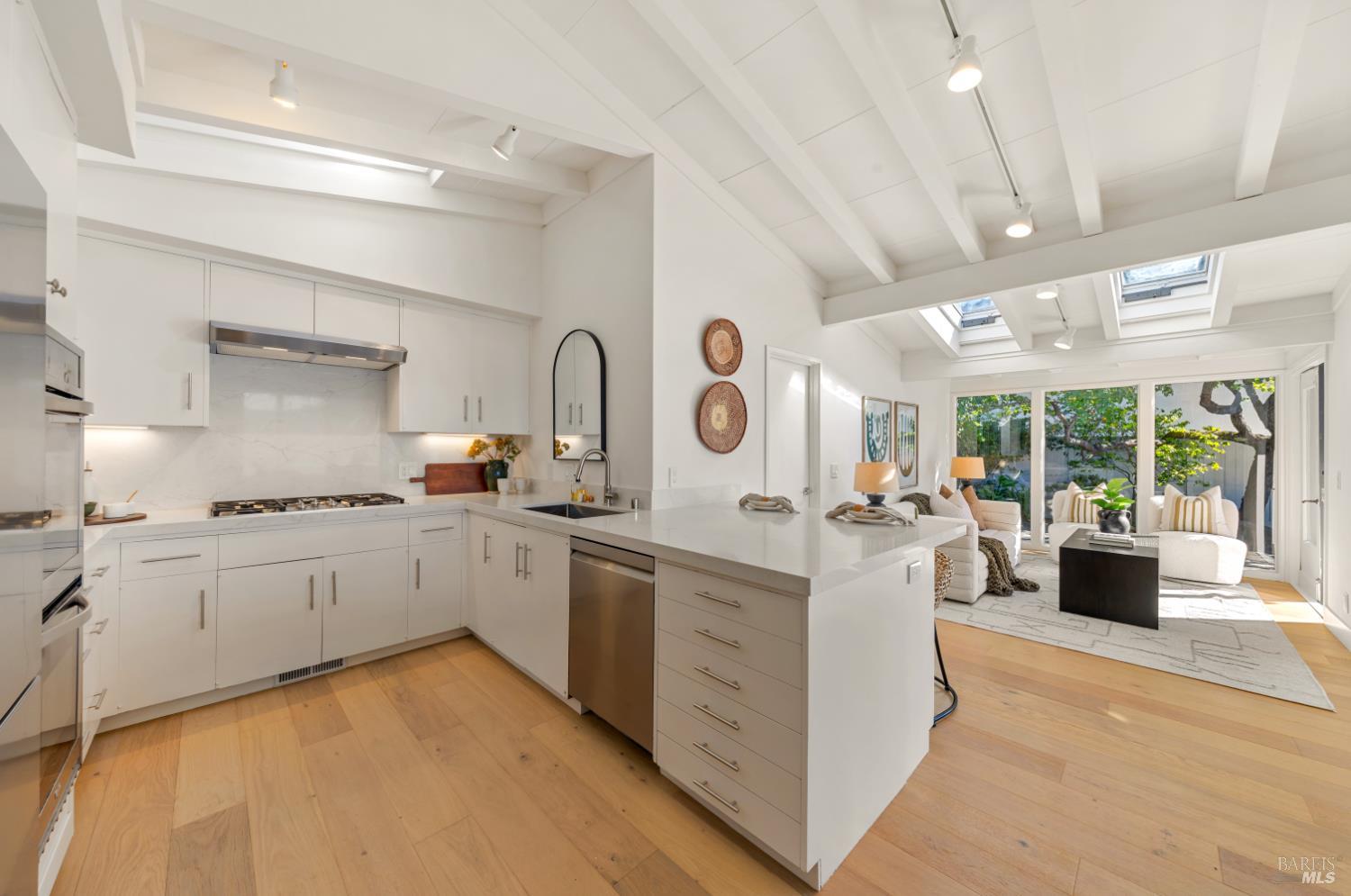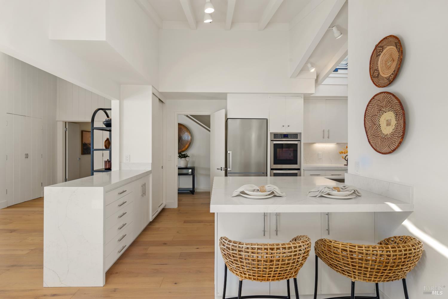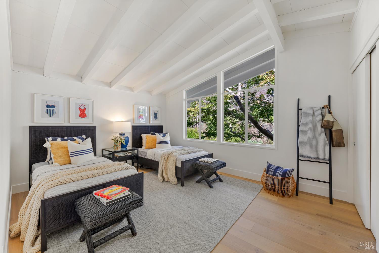 Situated along one of Belvedere's most exclusive waterfront streets, this inviting waterfront residence captures views of San Francisco, the Golden Gate Bridge, Sausalito, and Mount Tamalpais. Exuding a beach-inspired mid-century vibe, the home is designed for effortless indoor-outdoor living, with open, light-filled interiors that flow naturally to expansive decks, a gated yard with a turf lawn, outdoor dining areas, and a private dock, creating the ideal setting for relaxed waterfront living. New white oak hardwood floors on both levels. The light-filled living room features soaring vaulted ceilings, floor-to-ceiling windows that frame breathtaking views, a fireplace, and access to the expansive waterfront deck. Positioned to capture stunning water views, the dining room features large windows and sliding glass doors that open to the outdoors. The updated kitchen features quartz countertops, a peninsula with counter seating, and stainless steel appliances. Rare main-level primary suite with a private deck, a walk-in closet, and captivating views. A comfortable guest bedroom, a full bath, a laundry room, and a powder room complete the main level. The upper level features three bedrooms and a full bath. Attached two-car garage.