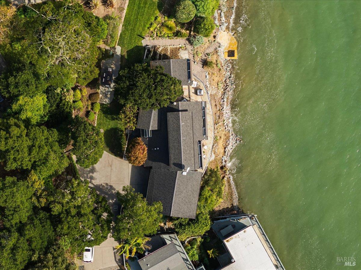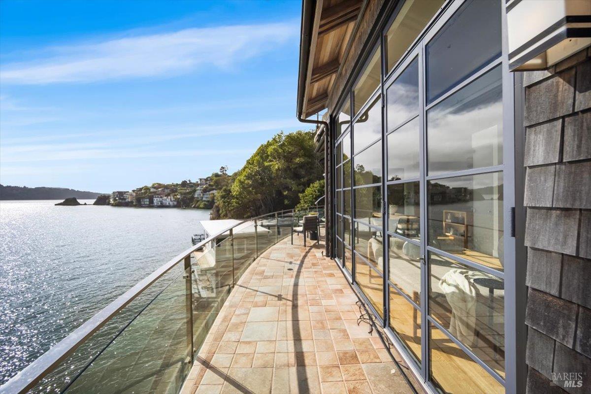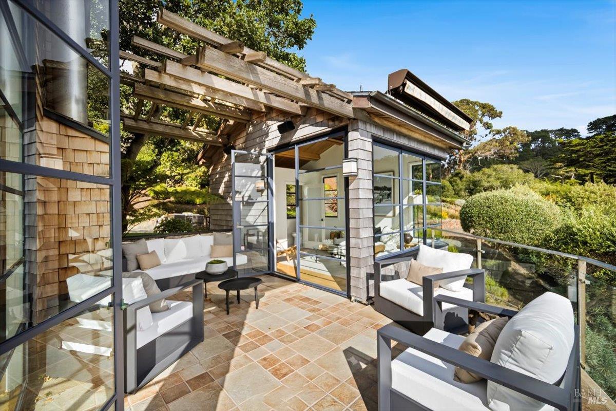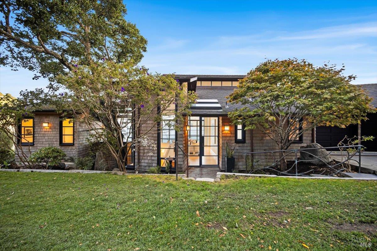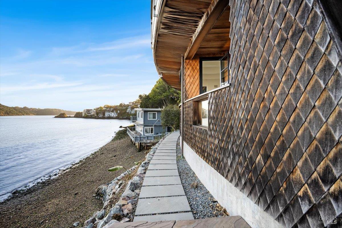 Rarely does a home of this architectural integrity become available. Inspired by Frank Lloyd Wright's Taliesin West and Fallingwater, this one-of-a-kind Tiburon retreat was designed by a local architect and her husband as their dream coastal sanctuary. Completed in 2001 with Mayta & Jensen Inc., the home embodies Wright's philosophy of organic architecture, living in harmony with its surroundings and evolving with light, air, and time. Cedar shingles have weathered to a silvery patina, blending naturally into the landscape. Expansive windows frame sweeping views across to Angel Island, filling the interiors with warmth and movement throughout the day. A breezeway connects the main living area to a tranquil office, creating a seamless transition between work and rest. The chef's kitchen and living spaces have been gracefully updated, honoring the original design while enhancing flow. Thoughtful details include a steam shower, built-in vacuum system, and herb garden, echoing the home's coastal setting. A private beach below is perfect for launching kayaks or sunset bonfires. Just minutes from downtown Tiburon, this must-see home offers timeless design, rare waterfront access, and an effortless connection between architecture and nature.