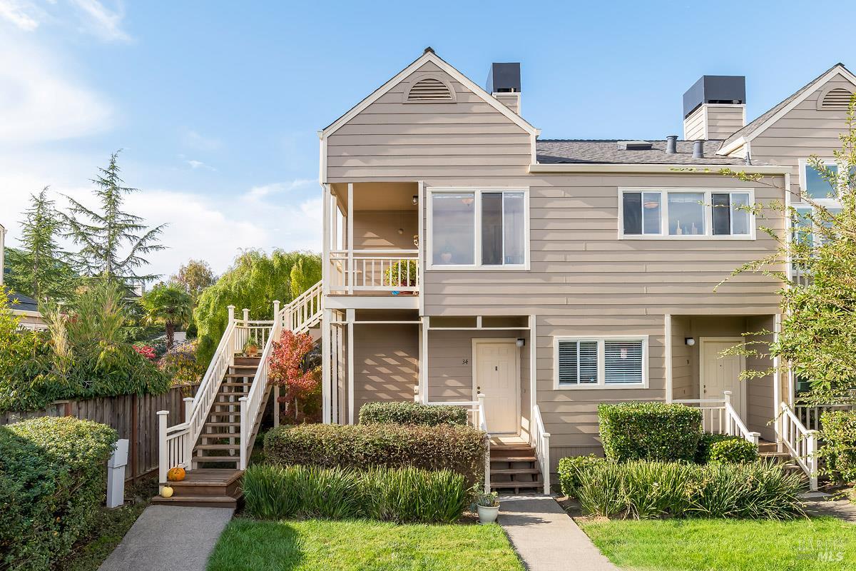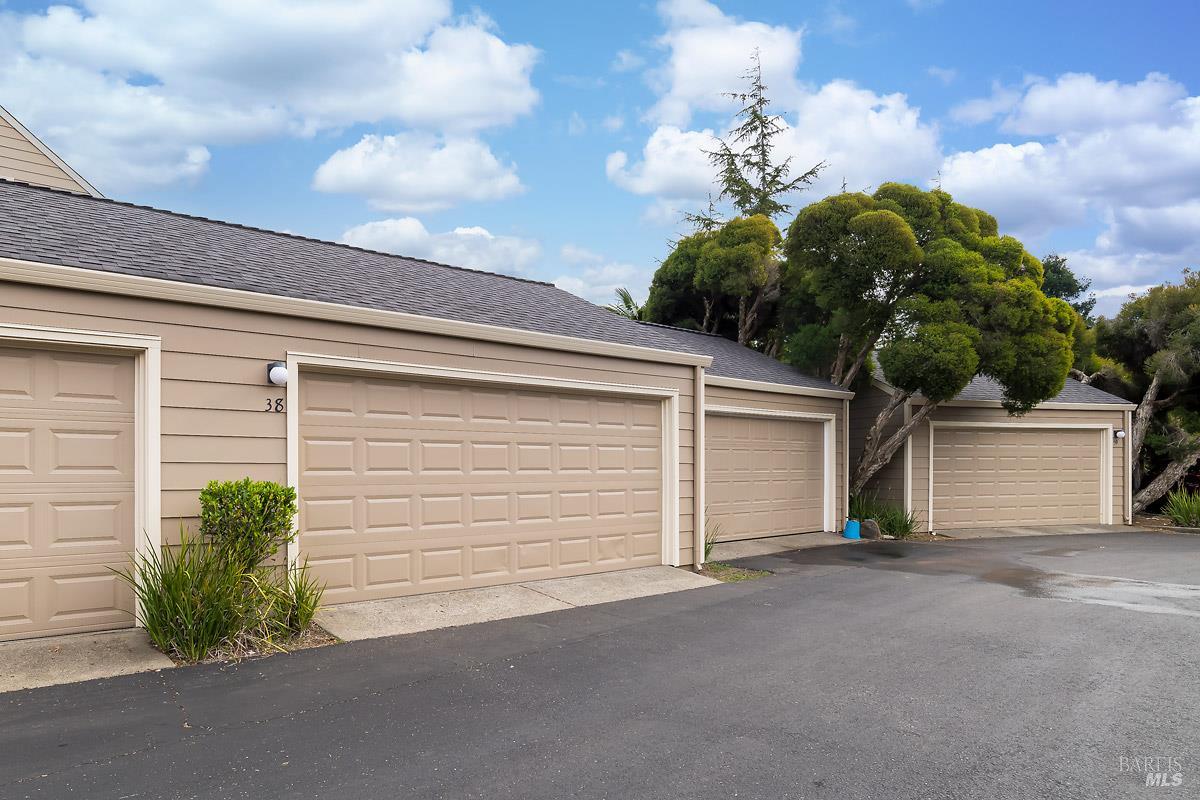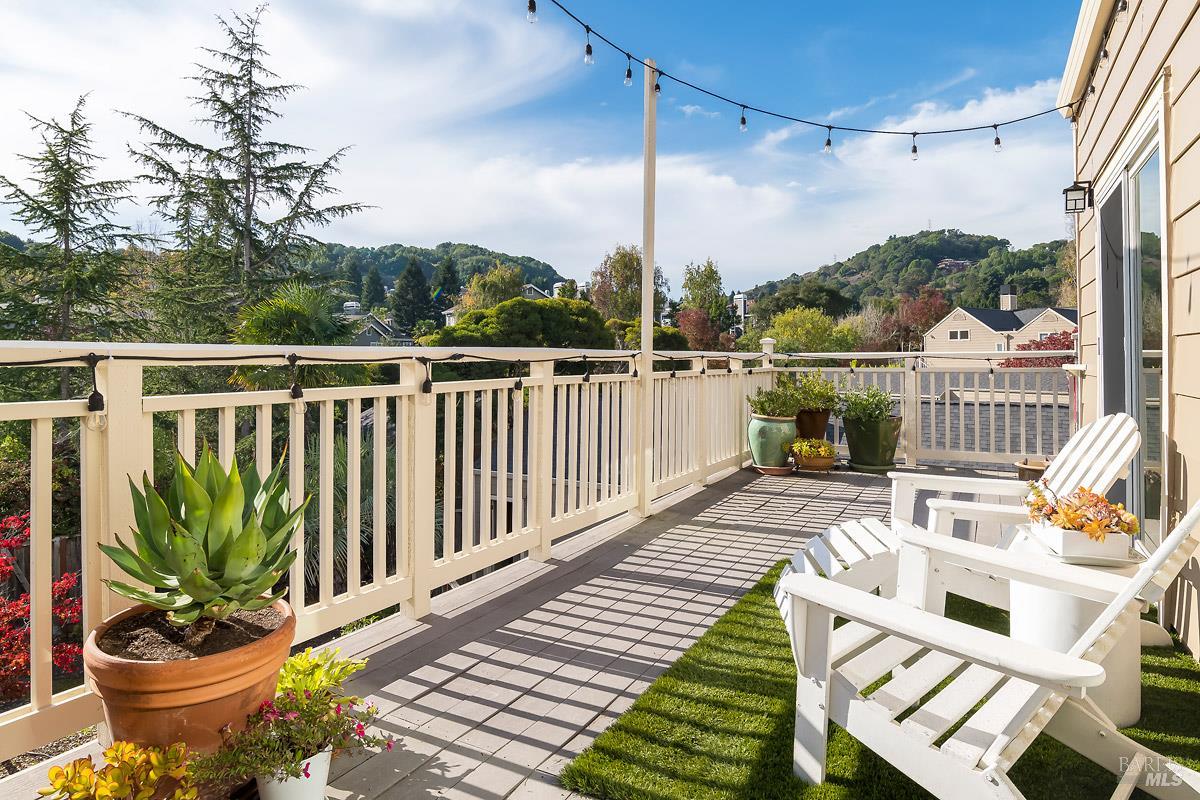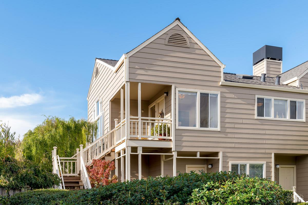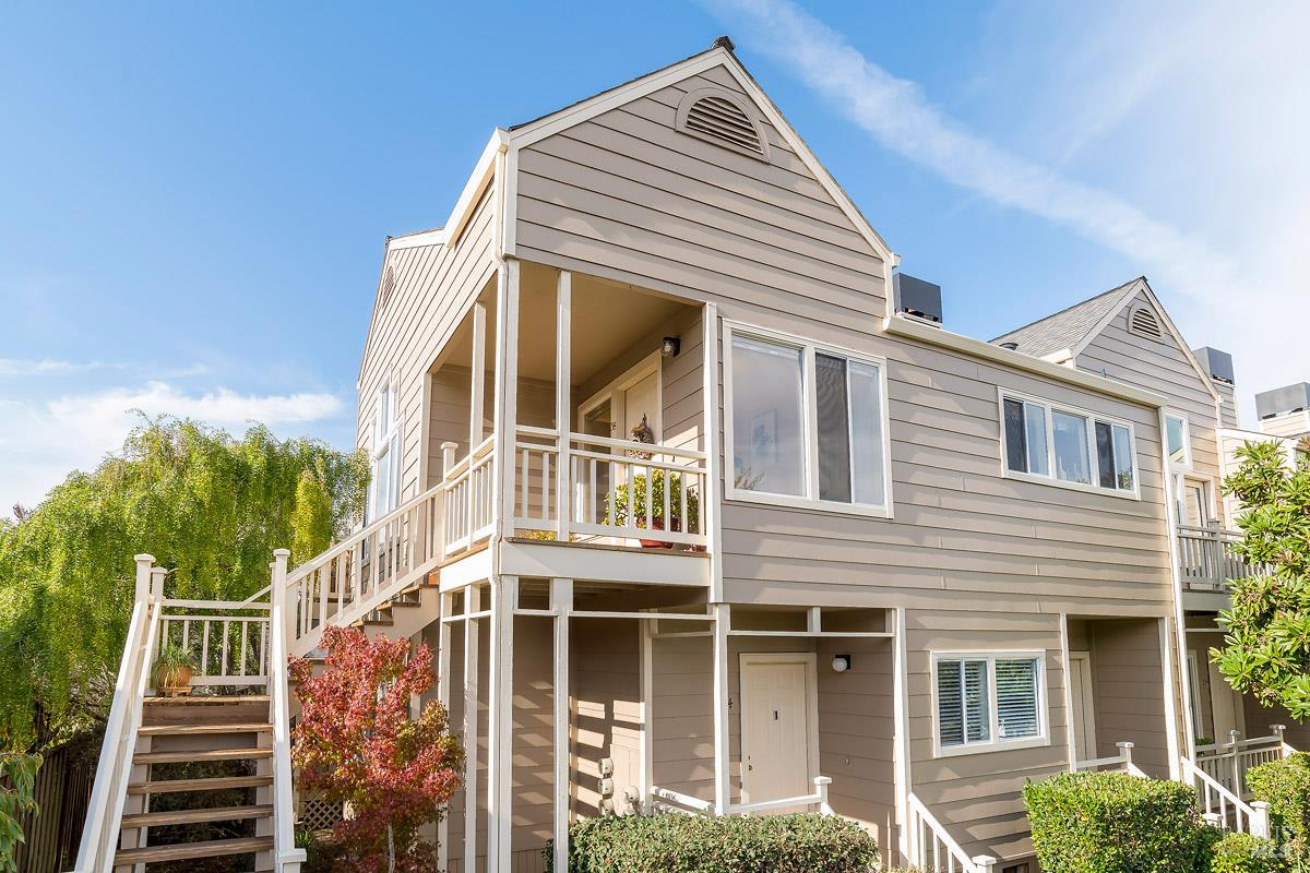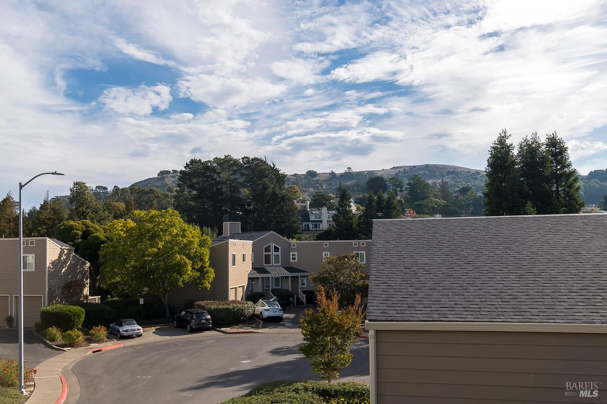 Classy, light filled, upper end condo all on one level at Meadowcreek. Enjoy the fabulous S facing views of Ring Mt, the hills and greenery from every room of this open and airy unit. Original owners have meticulously maintained and upgraded this property. Tucked away at the end of a cul-de-sac for utmost privacy. Features vaulted ceilings, large sliding doors, and skylights bringing in natural light. Living room and the two bedrooms have sliding glass doors for easy access to the large back deck - ideal for morning coffee or relaxing in the afternoons. Kitchen with views of Ring Mt includes granite countertops, tile backsplash, custom cabinets with pullouts, under mounted lights, and stainless steel appliances. Kitchen with large island opening to formal dining room. Enjoy the cozy wood-burning fireplace in the spacious living room. Primary bedroom has ensuite bathroom. Second bedroom currently used as an office with custom built-ins and a hall full bathroom. Two car detached garage at street level in back of condo. Charming backyard and garden that is beautifully landscaped. Solid HOA. Pristine condition. Enjoy the 1.6 acre Meadowcreek Park a few steps away.