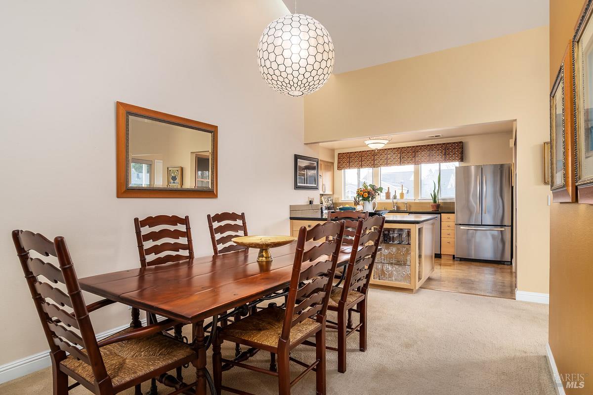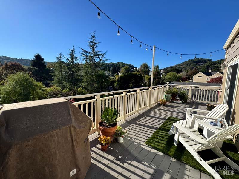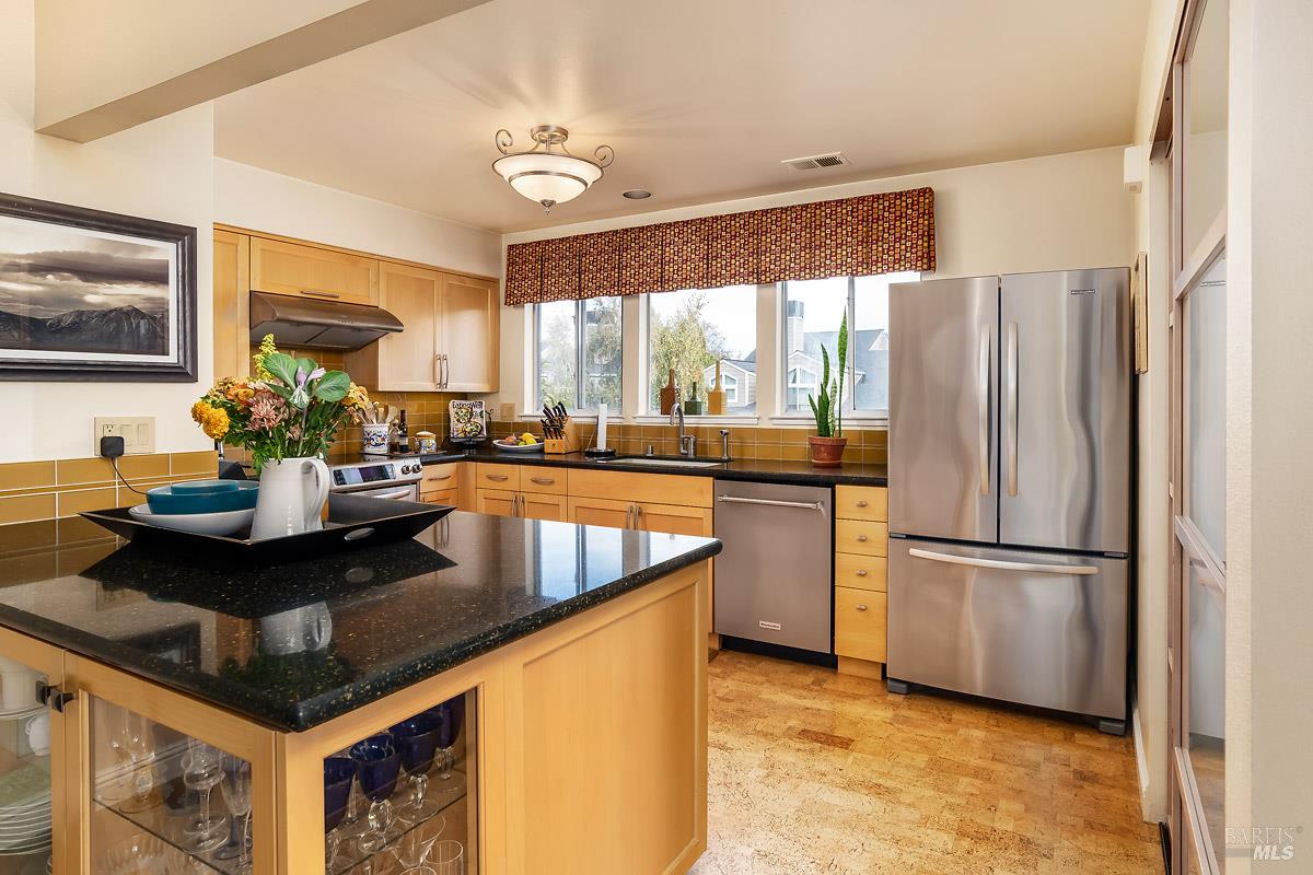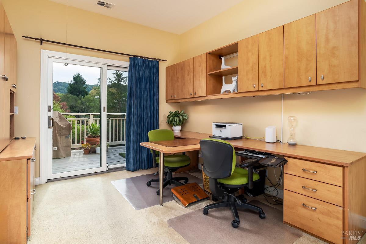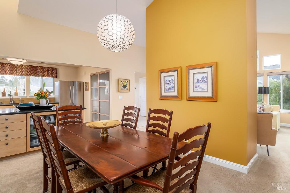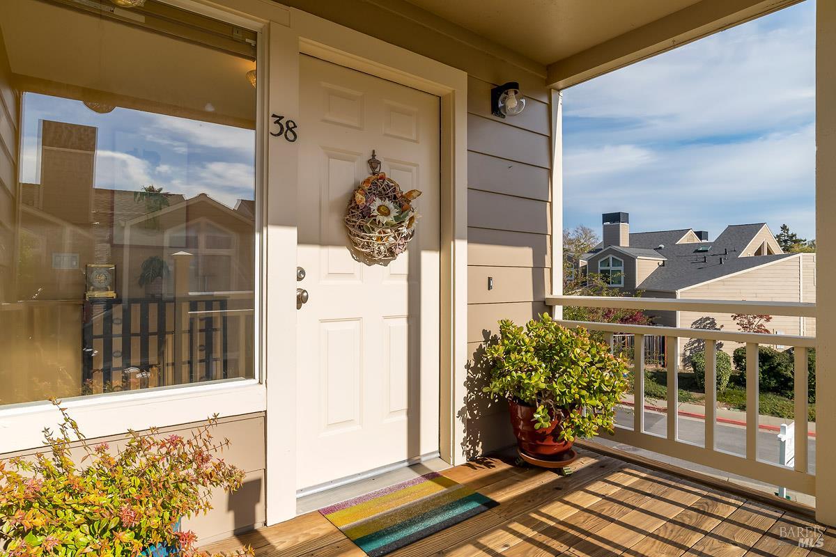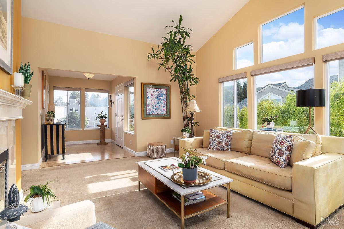 Classy, light filled, upper end condo all on one level at Meadowcreek. Enjoy the fabulous S facing views of Ring Mt, the hills and greenery from every room of this open and airy unit. Original owners have meticulously maintained and upgraded this property. Tucked away at the end of a cul-de-sac for utmost privacy. Features vaulted ceilings, large sliding doors, and skylights bringing in natural light. Living room and the two bedrooms have sliding glass doors for easy access to the large back deck - ideal for morning coffee or relaxing in the afternoons. Kitchen with views of Ring Mt includes granite countertops, tile backsplash, custom cabinets with pullouts, under mounted lights, and stainless steel appliances. Kitchen with large island opening to formal dining room. Enjoy the cozy wood-burning fireplace in the spacious living room. Primary bedroom has ensuite bathroom. Second bedroom currently used as an office with custom built-ins and a hall full bathroom. Two car detached garage at street level in back of condo. Charming backyard and garden that is beautifully landscaped. Solid HOA. Pristine condition. Enjoy the 1.6 acre Meadowcreek Park a few steps away.