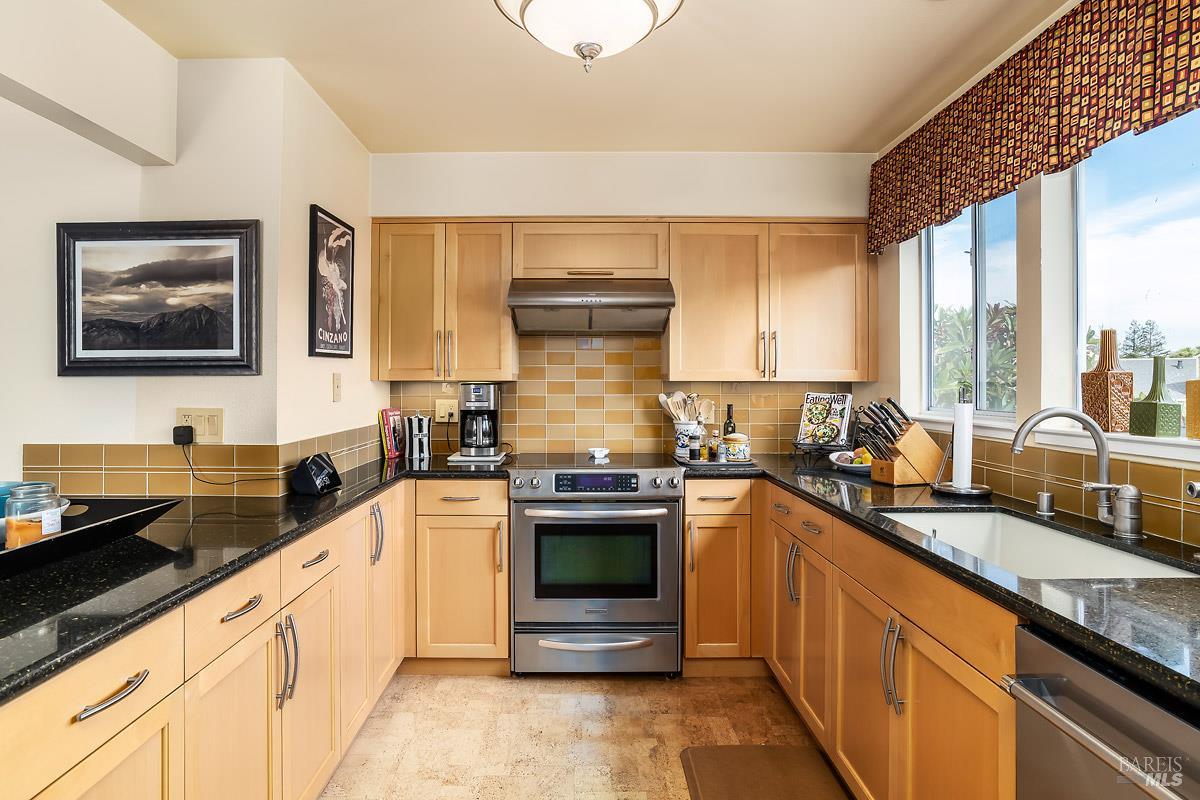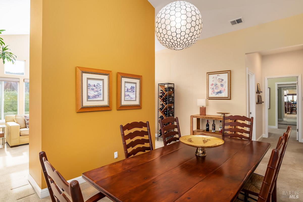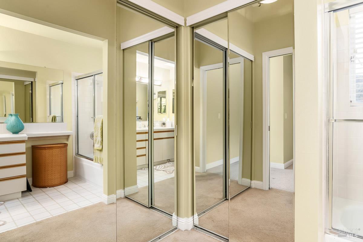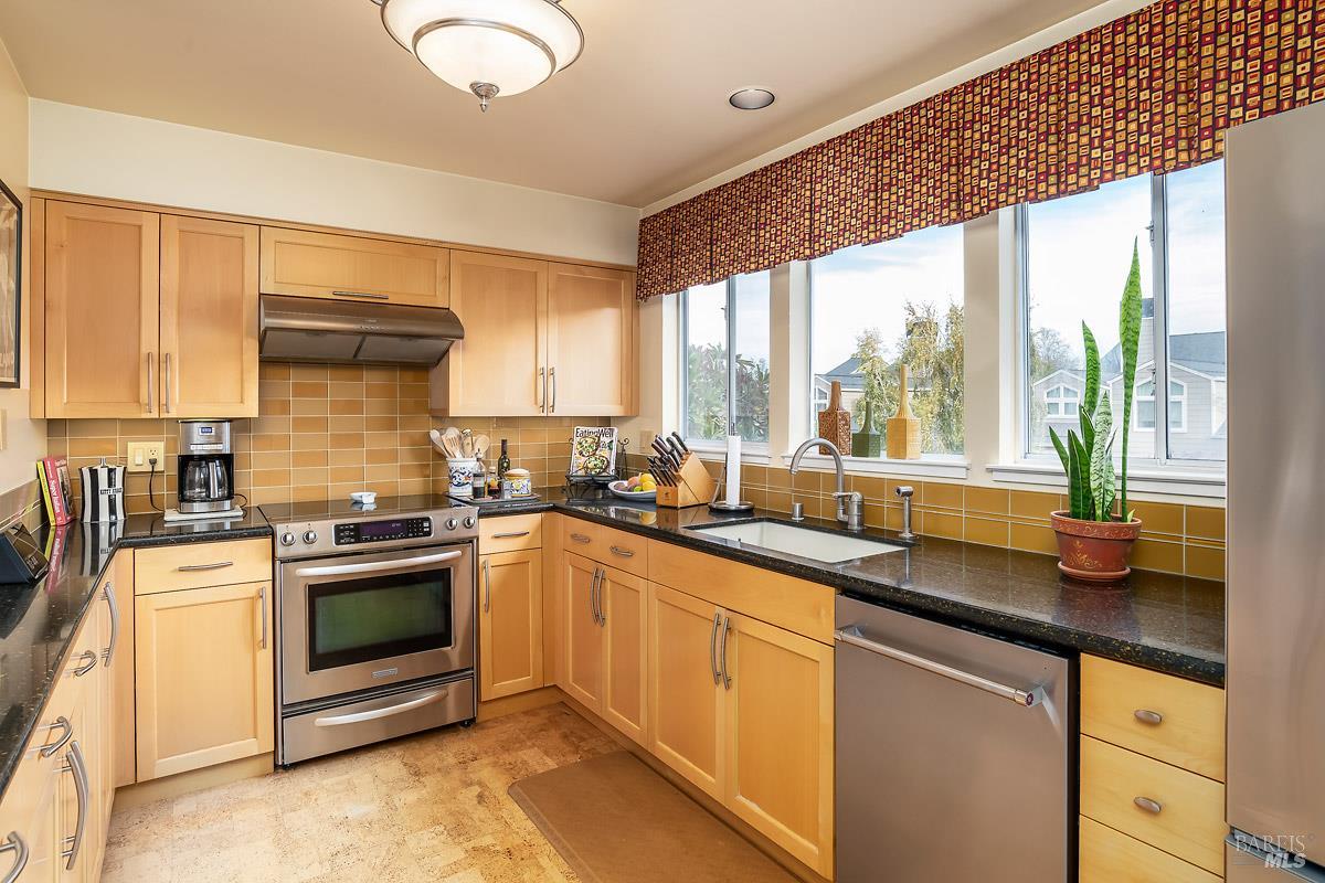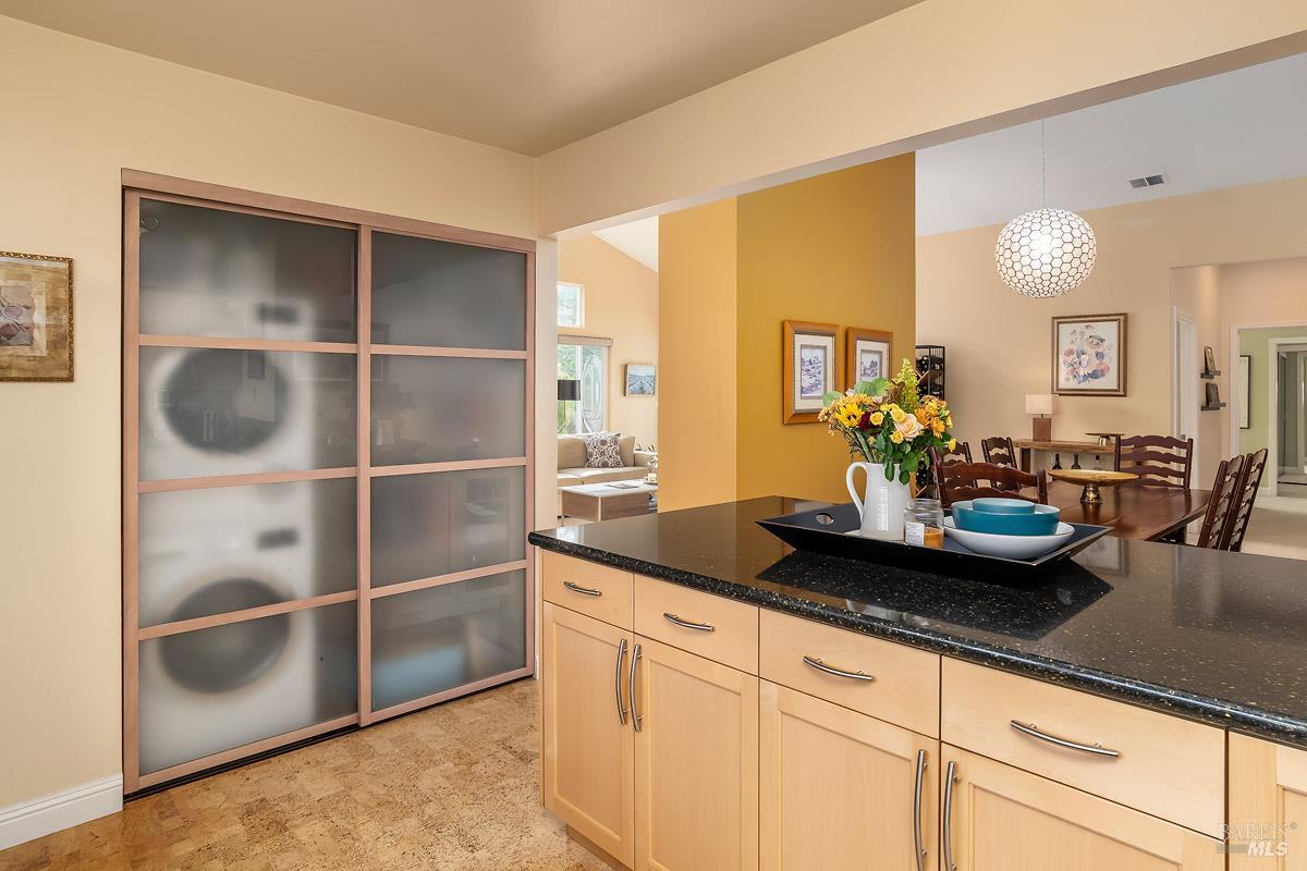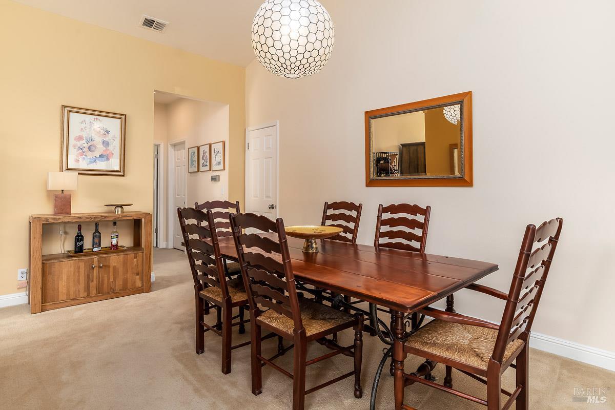 Classy, light filled, upper end condo all on one level at Meadowcreek. Enjoy the fabulous S facing views of Ring Mt, the hills and greenery from every room of this open and airy unit. Original owners have meticulously maintained and upgraded this property. Tucked away at the end of a cul-de-sac for utmost privacy. Features vaulted ceilings, large sliding doors, and skylights bringing in natural light. Living room and the two bedrooms have sliding glass doors for easy access to the large back deck - ideal for morning coffee or relaxing in the afternoons. Kitchen with views of Ring Mt includes granite countertops, tile backsplash, custom cabinets with pullouts, under mounted lights, and stainless steel appliances. Kitchen with large island opening to formal dining room. Enjoy the cozy wood-burning fireplace in the spacious living room. Primary bedroom has ensuite bathroom. Second bedroom currently used as an office with custom built-ins and a hall full bathroom. Two car detached garage at street level in back of condo. Charming backyard and garden that is beautifully landscaped. Solid HOA. Pristine condition. Enjoy the 1.6 acre Meadowcreek Park a few steps away.