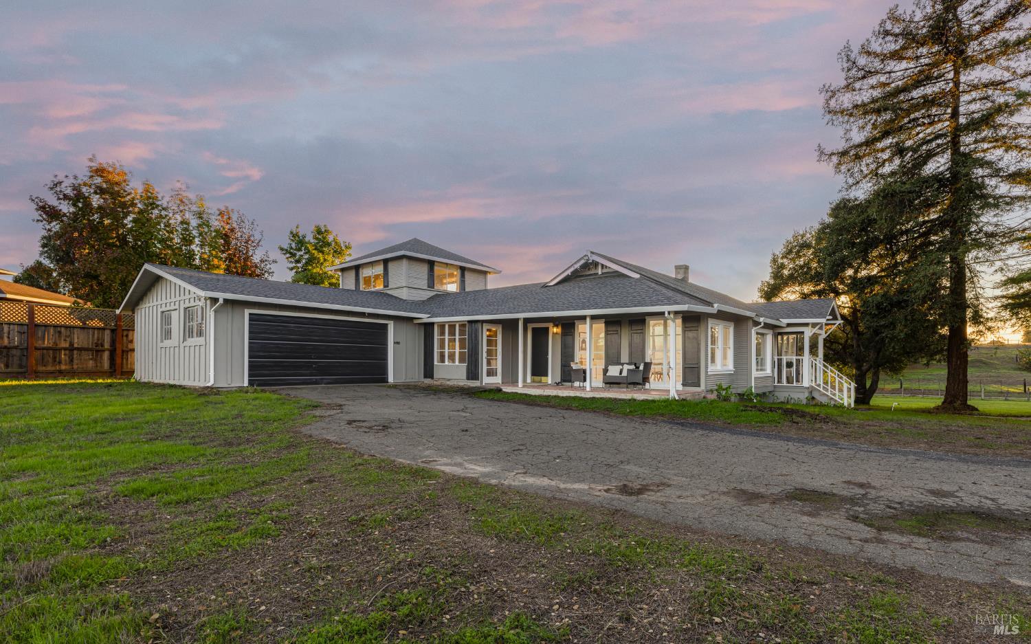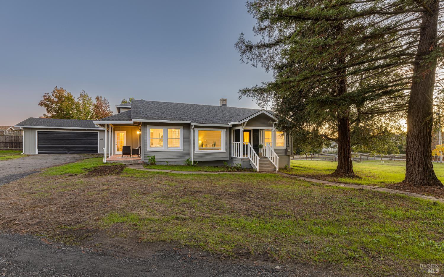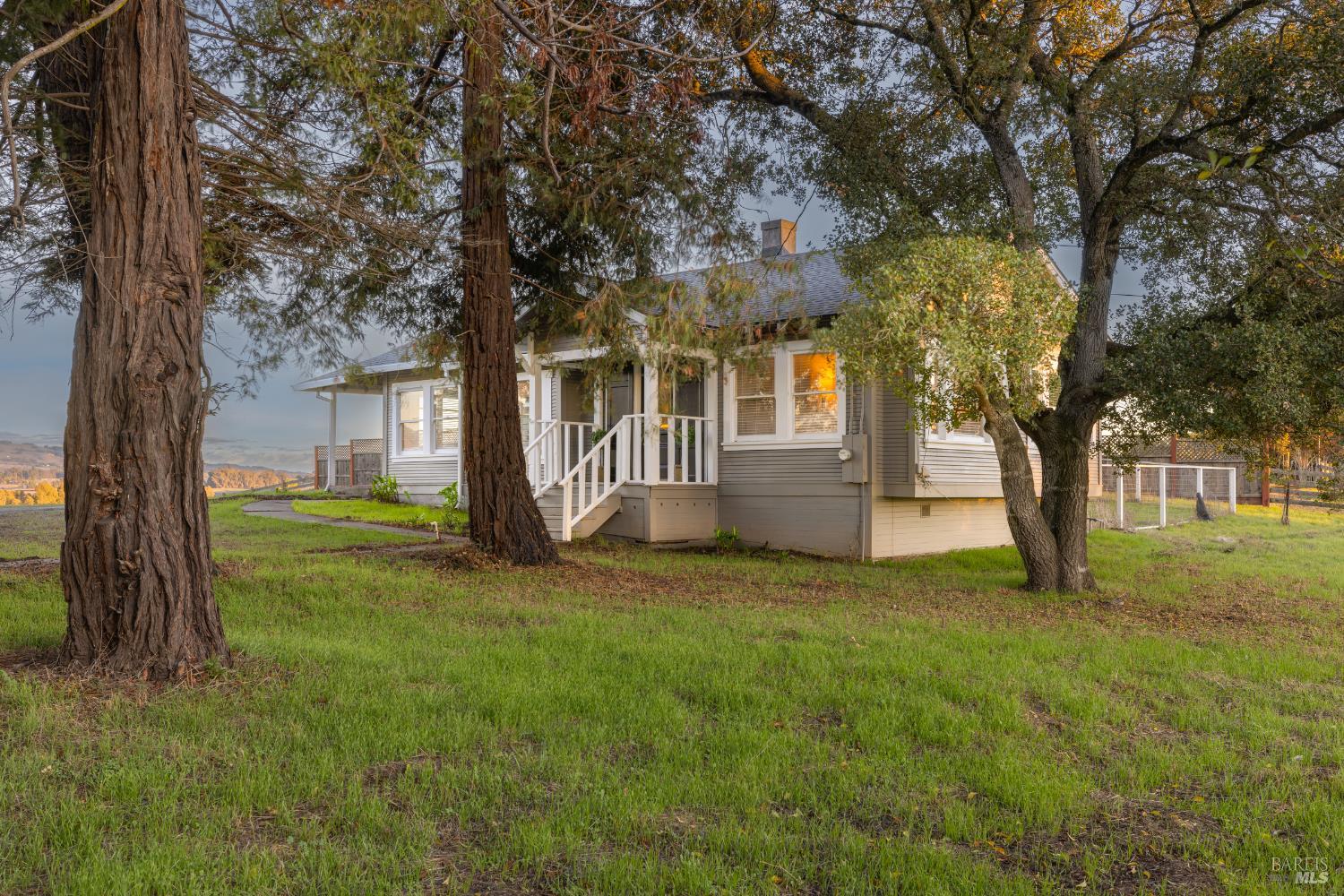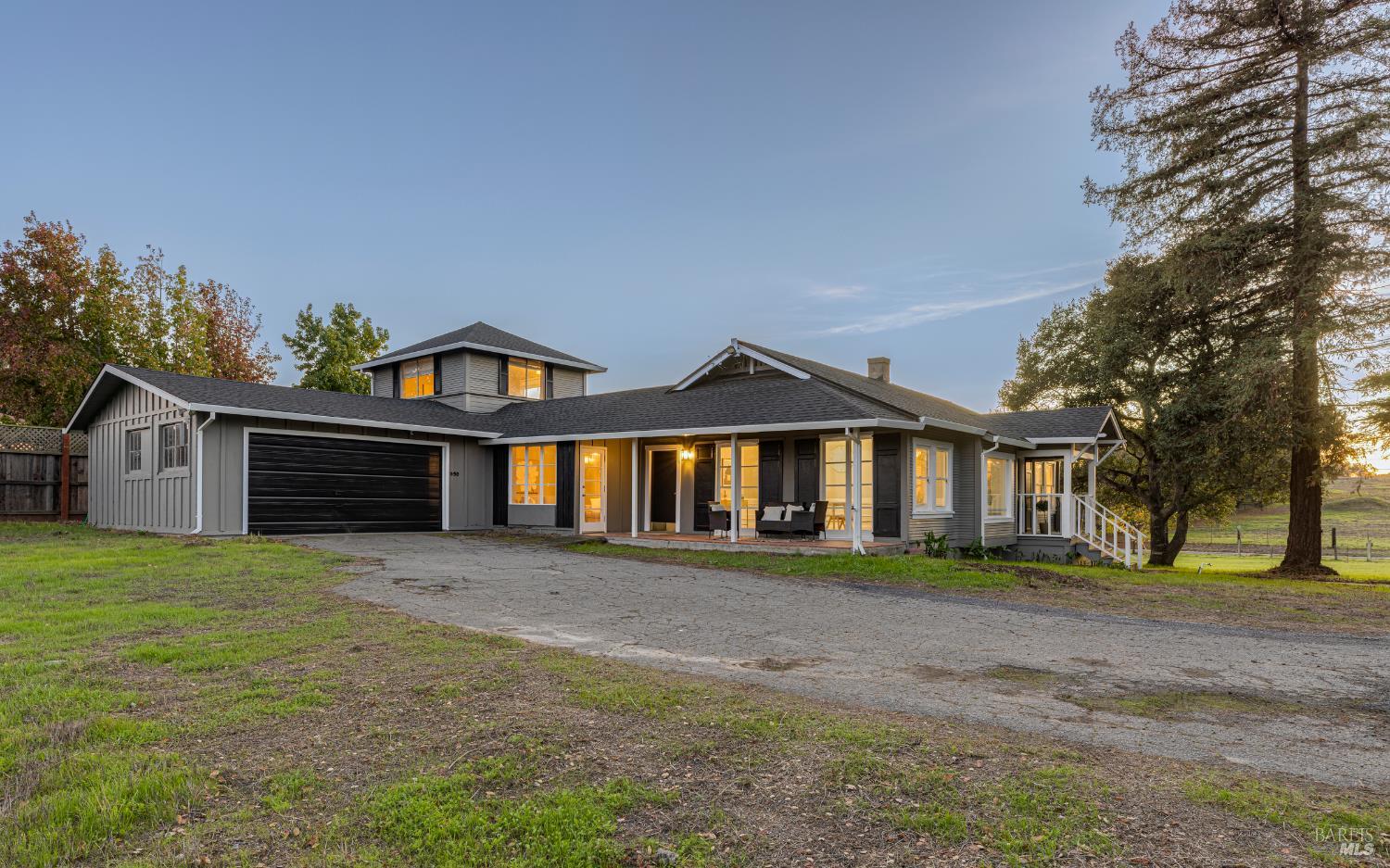 Welcome home to the charming story-book town of Penngrove! Enjoy country living in Sonoma County's world-renowned wine region w/incredible near panoramic views and a tree-lined driveway in this updated 1935 built Farmhouse (mostly single level) 3-bedroom, 2-bathroom home (only one room on upper level). This home is flooded w/natural light and features 1,887 square feet of living space on 1.21 acres (mostly flat & usable). Features include a newer roof and well, two covered porches, laminate floors, formal dining room w/custom wall, ceiling and window trim finishes, French doors, Living room w/front entry, fireplace, custom trim surrounding doors and windows and perimeter fencing. Two bedrooms are located on the main level at either side of the home with two remodeled bathrooms. The kitchen features an eat-in room surrounded by windows, a double-sink w/window, stainless-steel appliances, ceiling fan and plenty of cabinet space. The Family room includes custom built-ins, a ceiling fan, storage closet and access to the garage and exterior. The primary bedroom is located on the main level and features built-in shelves and a remodeled primary bathroom with a tiled shower over the bathtub. A spiral staircase leads to the only room upstairs with incredible views of the Sonoma mountains.