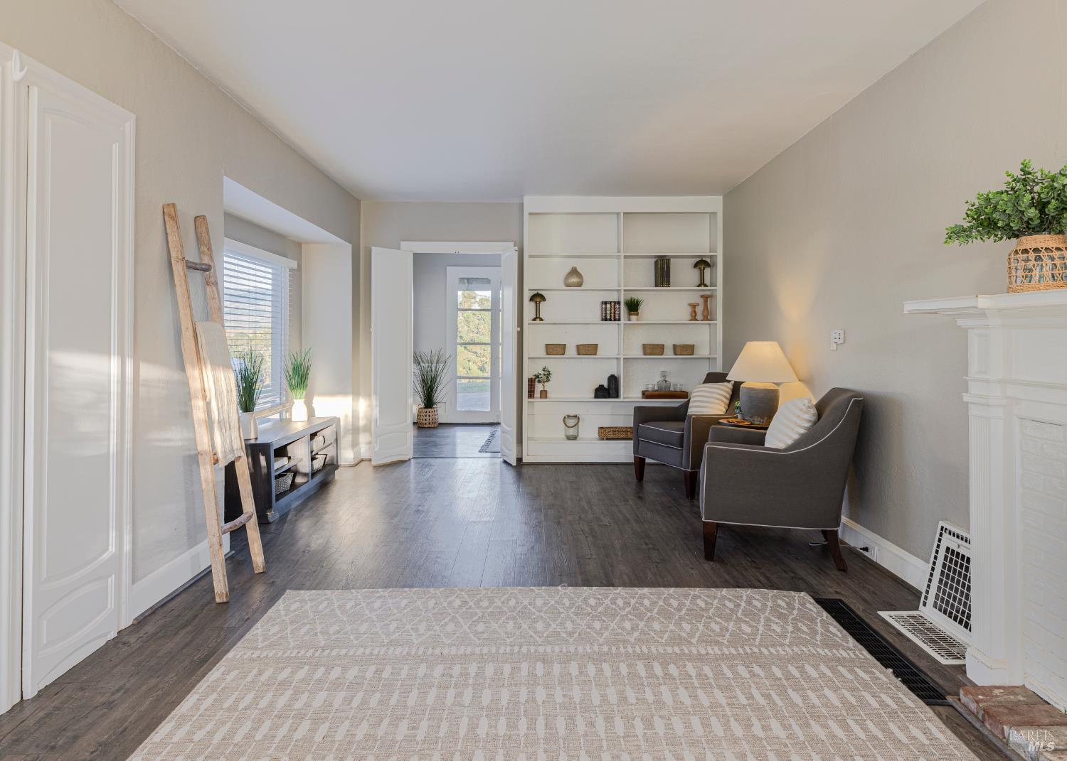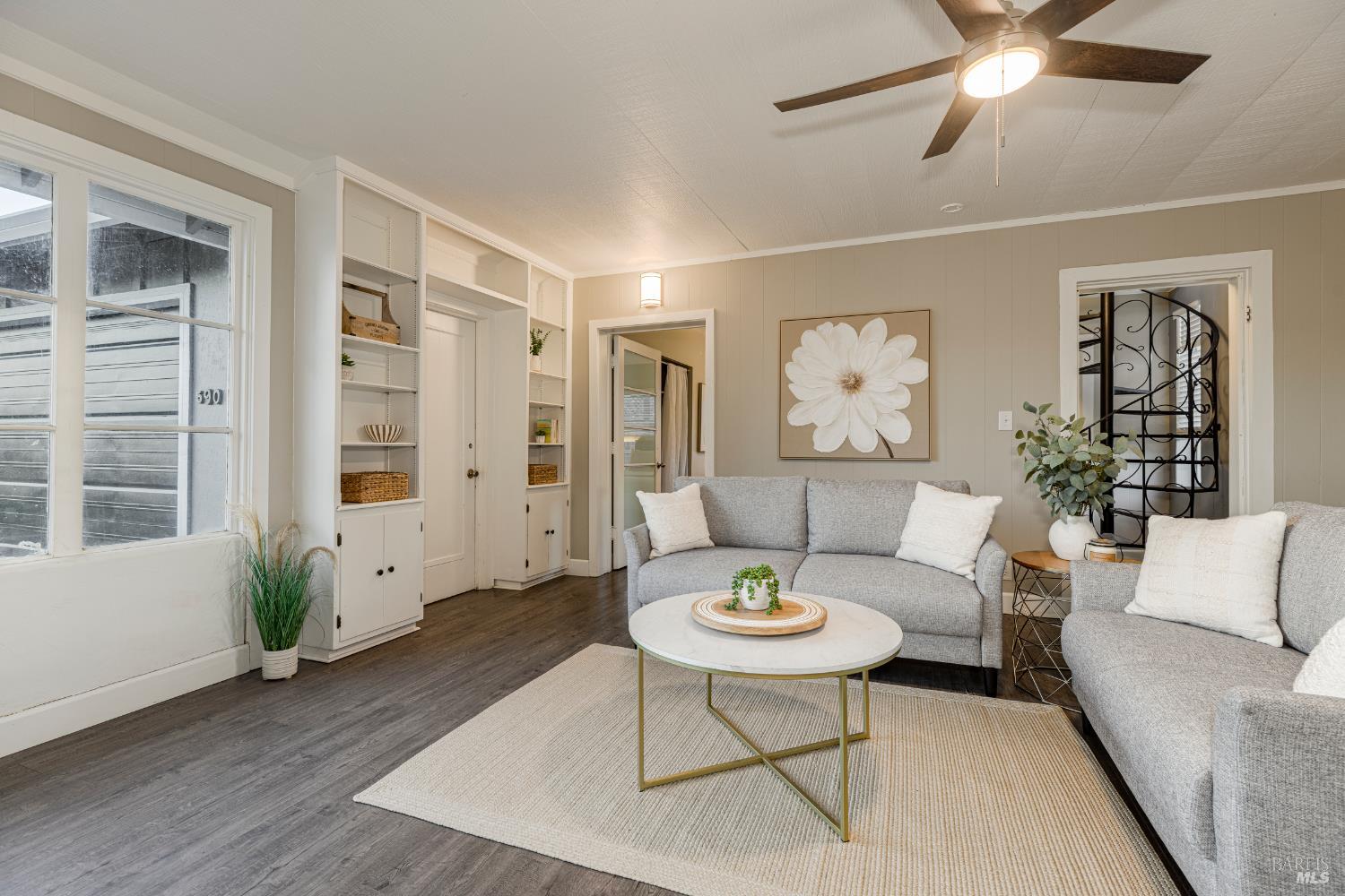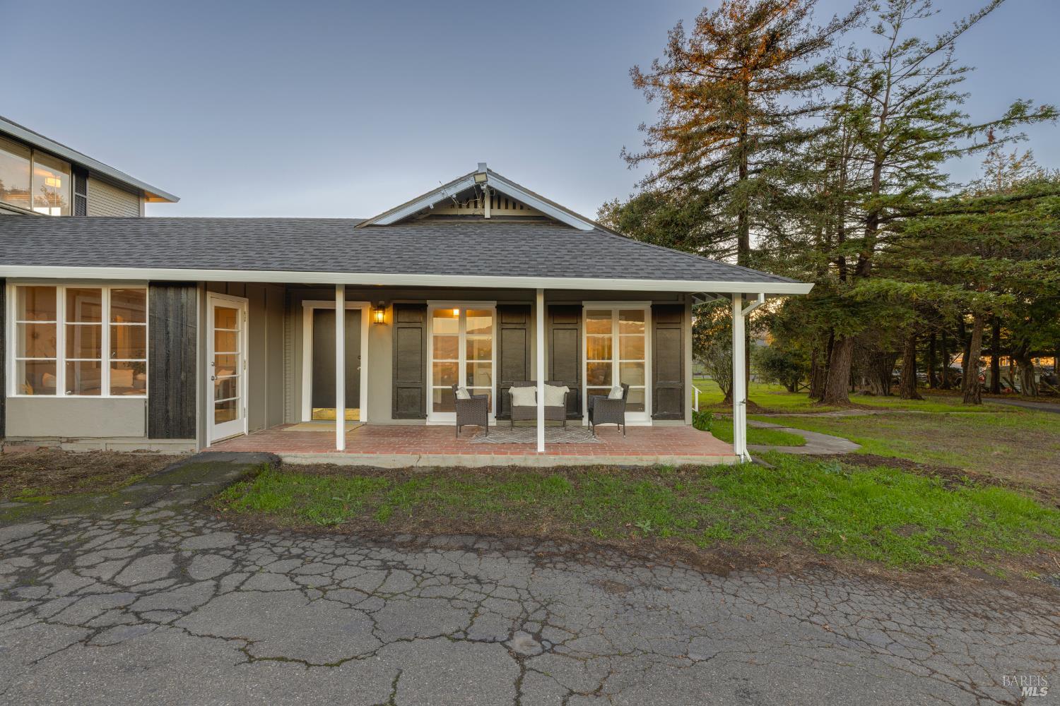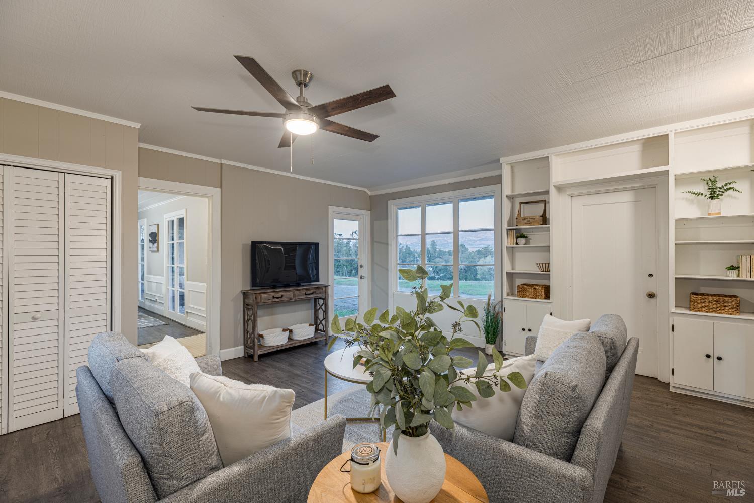 Welcome home to the charming story-book town of Penngrove! Enjoy country living in Sonoma County's world-renowned wine region w/incredible near panoramic views and a tree-lined driveway in this updated 1935 built Farmhouse (mostly single level) 3-bedroom, 2-bathroom home (only one room on upper level). This home is flooded w/natural light and features 1,887 square feet of living space on 1.21 acres (mostly flat & usable). Features include a newer roof and well, two covered porches, laminate floors, formal dining room w/custom wall, ceiling and window trim finishes, French doors, Living room w/front entry, fireplace, custom trim surrounding doors and windows and perimeter fencing. Two bedrooms are located on the main level at either side of the home with two remodeled bathrooms. The kitchen features an eat-in room surrounded by windows, a double-sink w/window, stainless-steel appliances, ceiling fan and plenty of cabinet space. The Family room includes custom built-ins, a ceiling fan, storage closet and access to the garage and exterior. The primary bedroom is located on the main level and features built-in shelves and a remodeled primary bathroom with a tiled shower over the bathtub. A spiral staircase leads to the only room upstairs with incredible views of the Sonoma mountains.