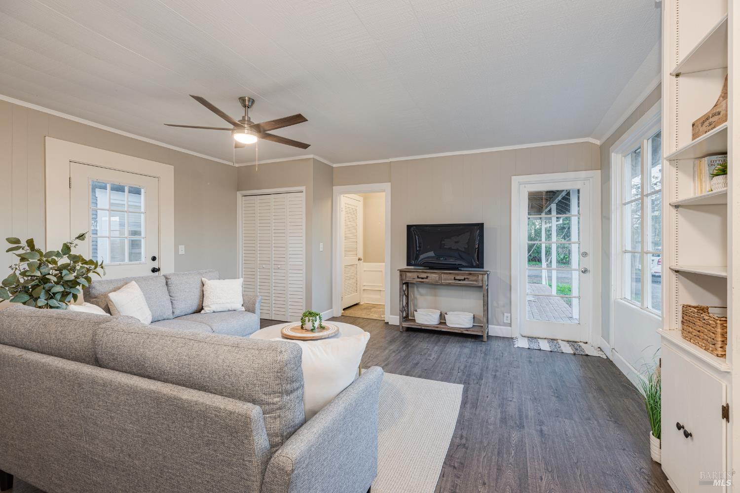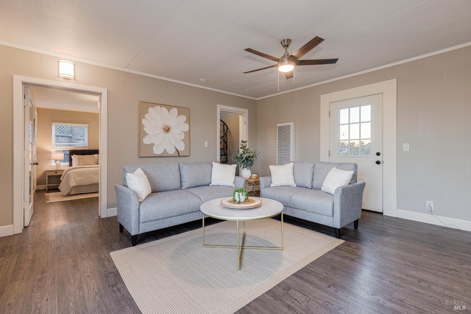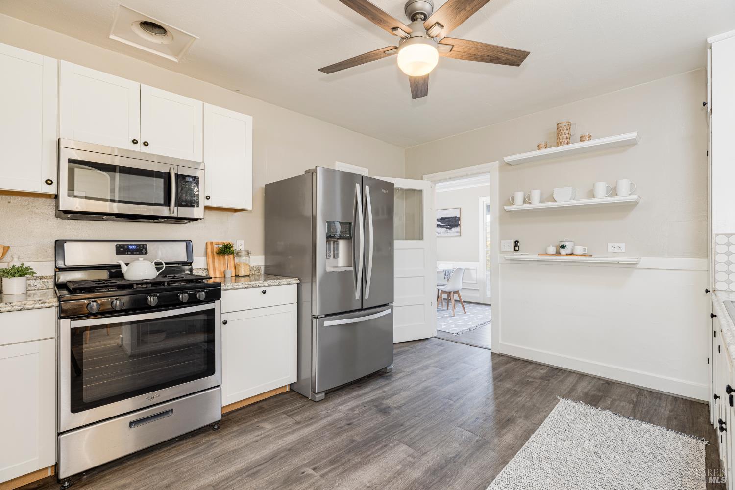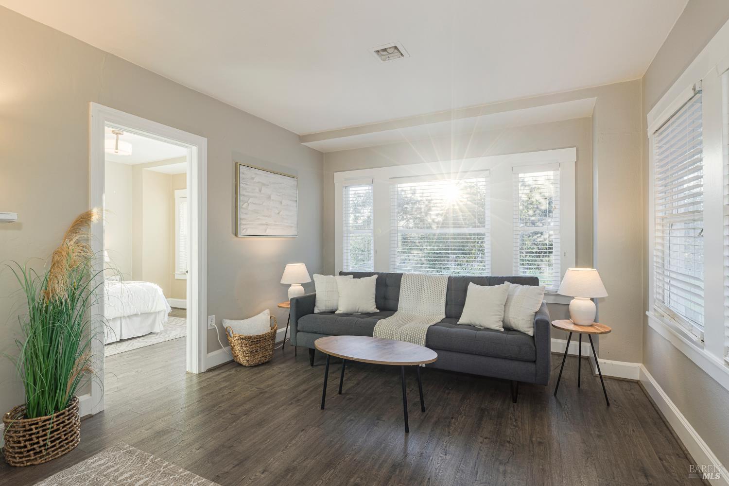 Welcome home to the charming story-book town of Penngrove! Enjoy country living in Sonoma County's world-renowned wine region w/incredible near panoramic views and a tree-lined driveway in this updated 1935 built Farmhouse (mostly single level) 3-bedroom, 2-bathroom home (only one room on upper level). This home is flooded w/natural light and features 1,887 square feet of living space on 1.21 acres (mostly flat & usable). Features include a newer roof and well, two covered porches, laminate floors, formal dining room w/custom wall, ceiling and window trim finishes, French doors, Living room w/front entry, fireplace, custom trim surrounding doors and windows and perimeter fencing. Two bedrooms are located on the main level at either side of the home with two remodeled bathrooms. The kitchen features an eat-in room surrounded by windows, a double-sink w/window, stainless-steel appliances, ceiling fan and plenty of cabinet space. The Family room includes custom built-ins, a ceiling fan, storage closet and access to the garage and exterior. The primary bedroom is located on the main level and features built-in shelves and a remodeled primary bathroom with a tiled shower over the bathtub. A spiral staircase leads to the only room upstairs with incredible views of the Sonoma mountains.