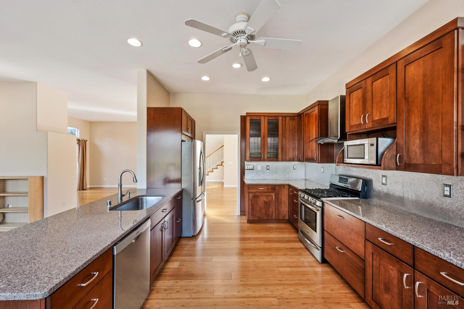 Built in 1998 by the award-winning builder Christopherson Homes, this popular 2,330 square foot Dickson floor plan functions like that of a single level with the primary suite, 2nd bedroom and full bath downstairs ~ and 2 bedrooms and a full bath upstairs. Soaring 10-foot ceilings and abundant windows fill the entire home with natural light. A newer custom kitchen showcases beautiful cabinetry with pull-out shelving and under and over cabinet (indirect) lighting, quartz slab counters and stainless steel appliances. Additional highlights include extensive bamboo flooring downstairs * New roof installed in late 2021 * Updated Furnace, Air Conditioner and Water Heater in 2017. The rear yard's multi-tiered deck (overlooking the well-manicured residents' only greenbelt) is perfect for outdoor entertaining - with a relaxing hot tub to enjoy at the end of the day.