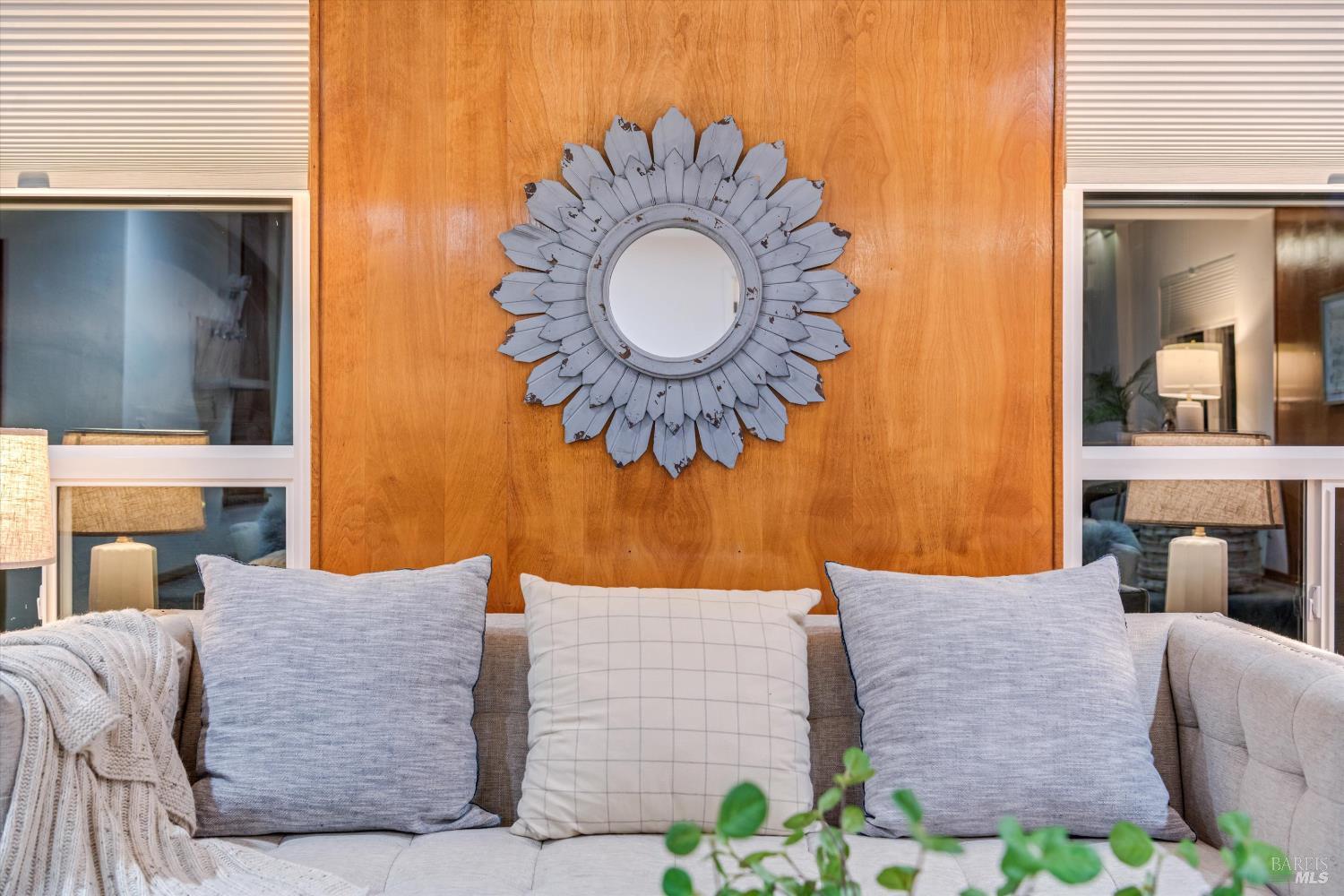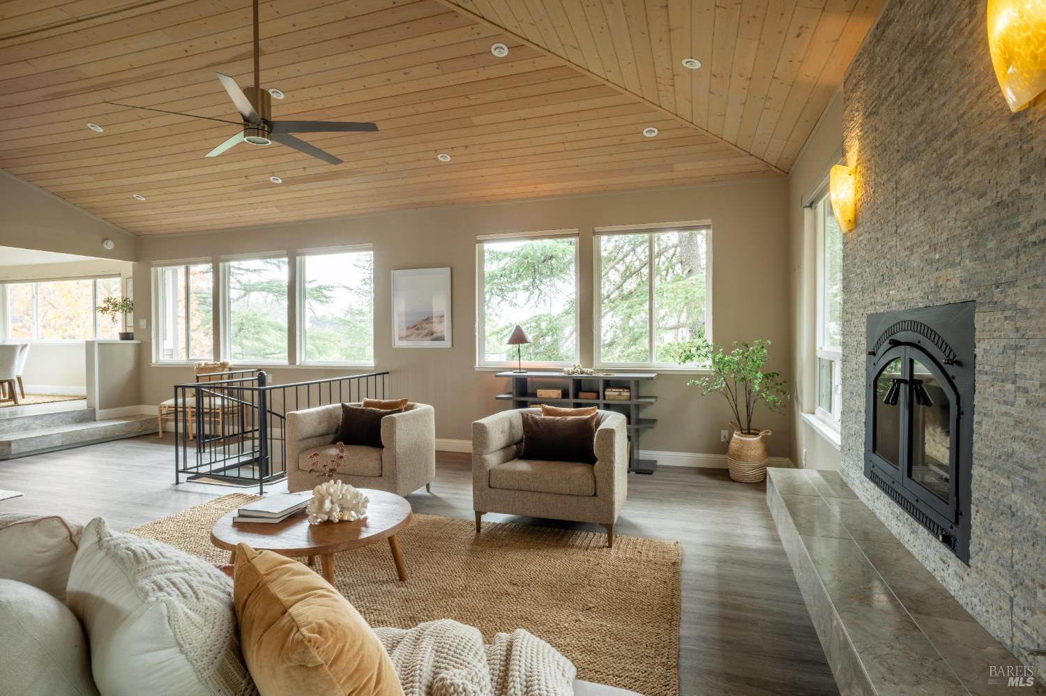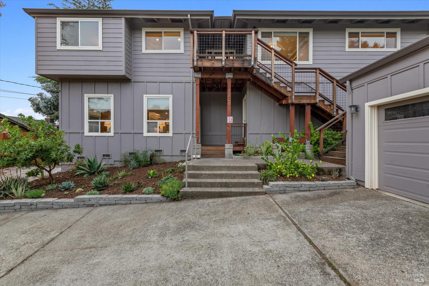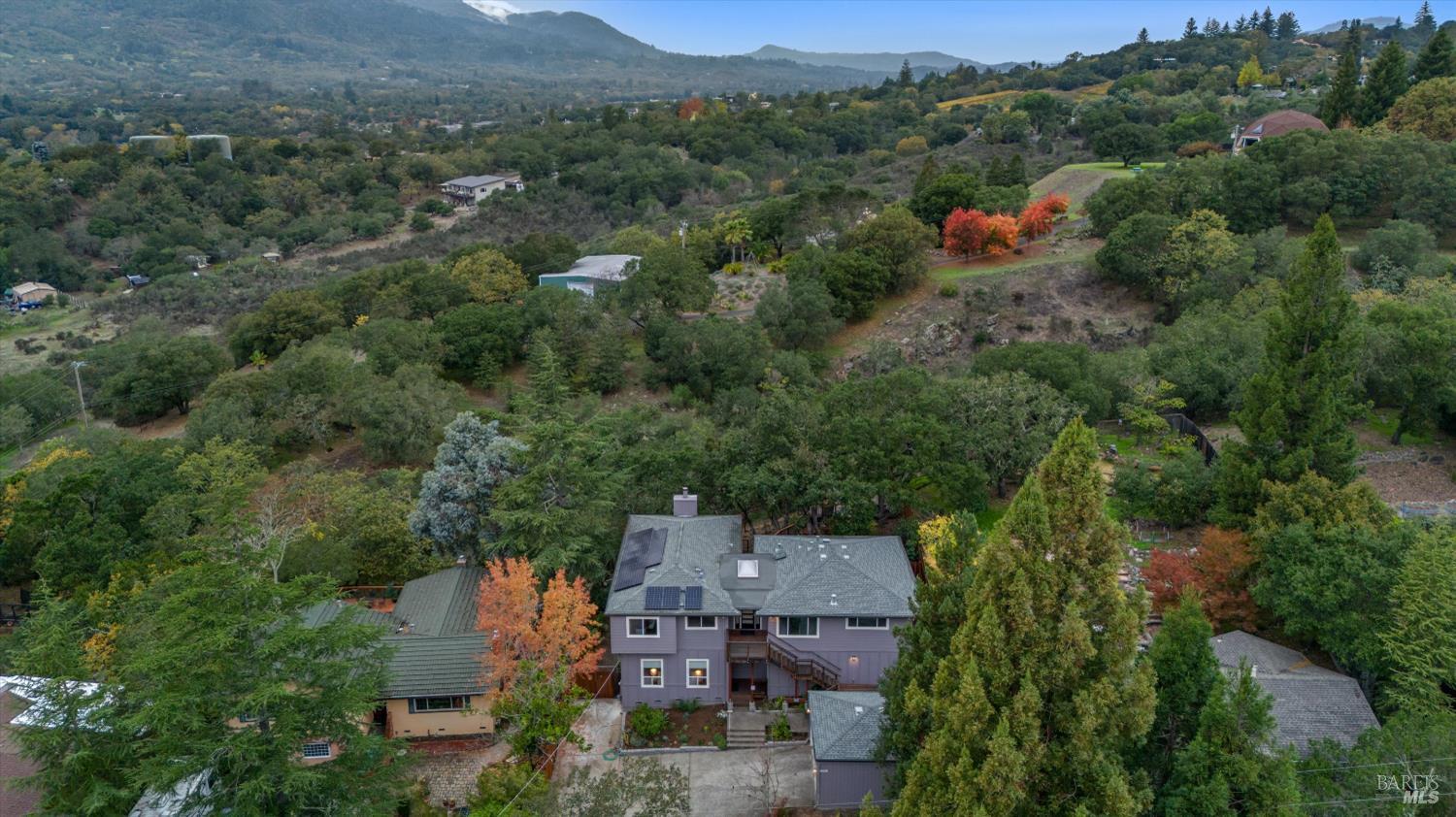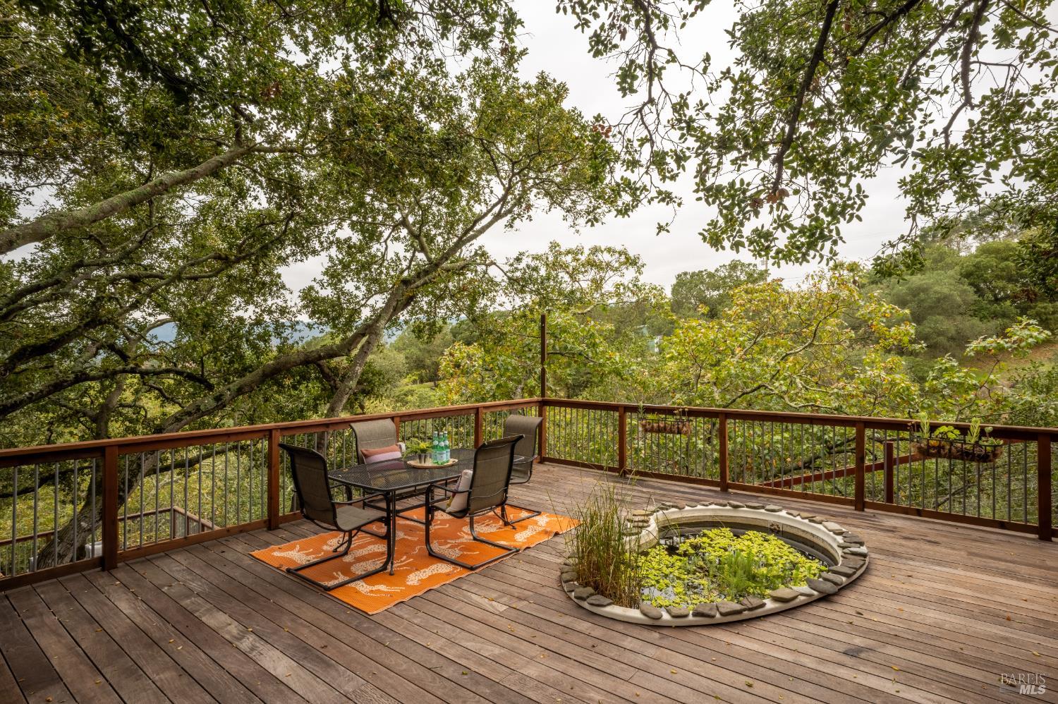 Harmoniously set on .26 acres in Sonoma Valley's oak-studded hills, this meticulously updated 2,930 sq ft retreat offers privacy with sweeping Sonoma Mountain views. The reverse floor plan maximizes vistas from main living spaces, featuring a remodeled kitchen with granite counters, wood cabinetry, travertine flooring, and stainless steel appliances. Step outside to expansive hardwood decking amongst the treetopsan elevated stage for memorable gatherings. Four bedrooms and four baths provide spacious accommodations, each with unique views. The lower level features an additional living area and bar, creating a speakeasy-style entertaining area, plus a separate cedar sauna. Recent updates include newer roof, solar panels, HVAC, marble fireplace, custom kitchen and baths, ipe decking, and tongue-and-groove wood ceilings. The thoughtful layout offers potential for a private lower-level suite. A detached two-car garage with space for storage. Located in a walkable area close to renowned restaurants, wineries, farmers market, and wonderful neighbors.