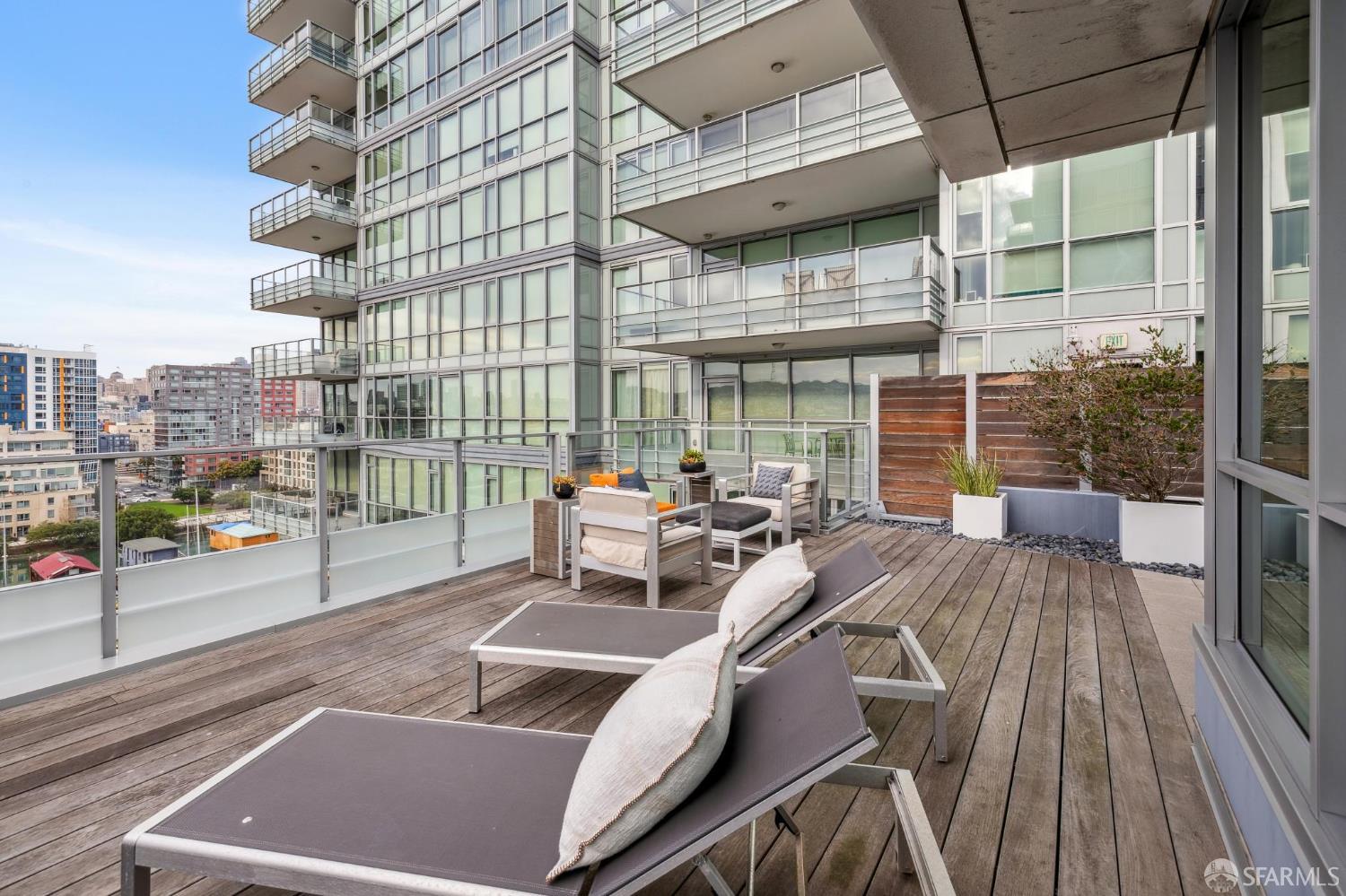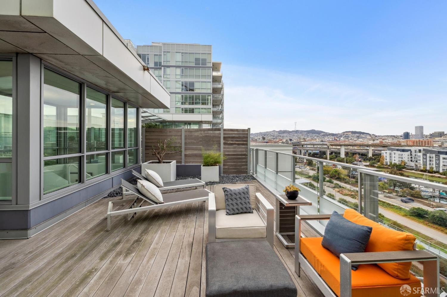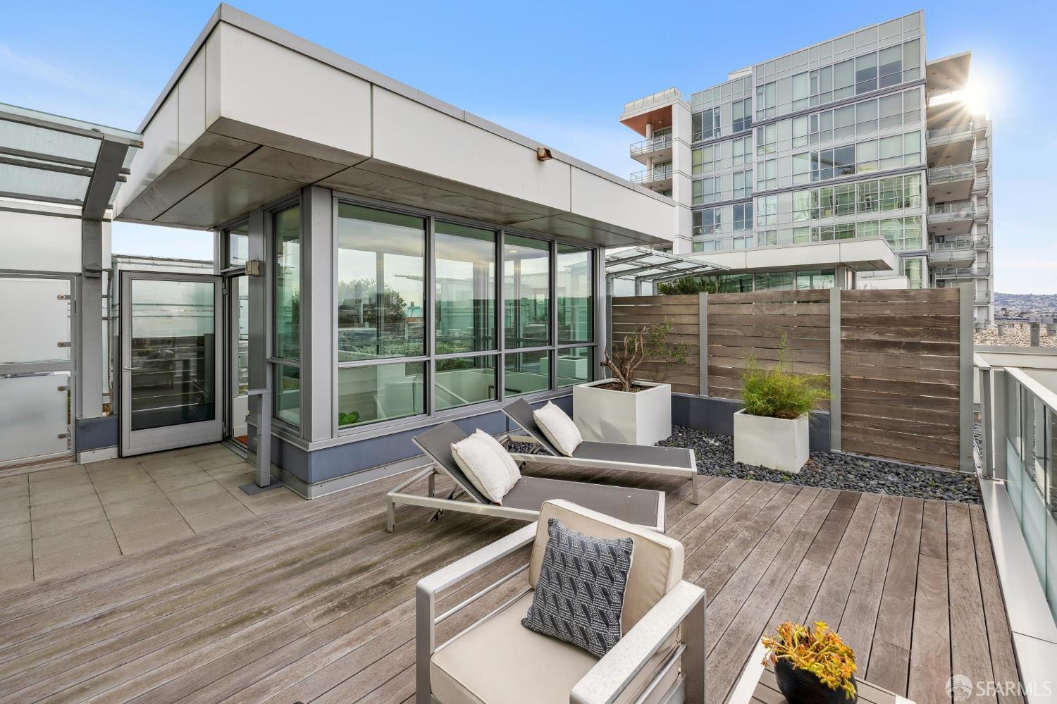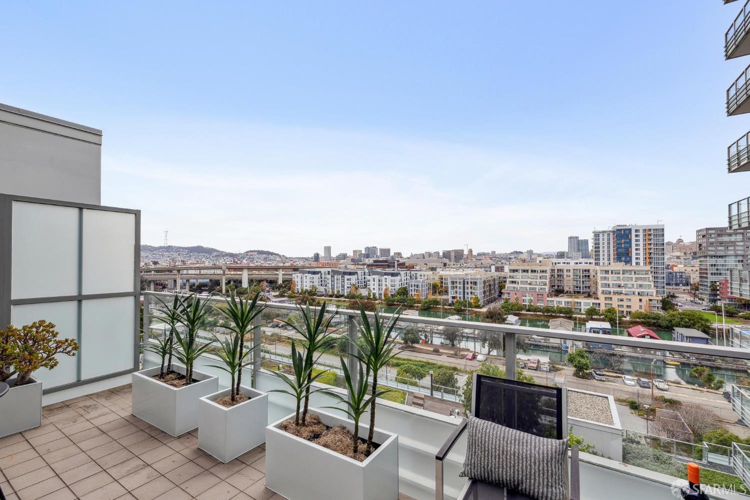 Experience sophisticated city living in this stunning 2-bedroom, 2-bath, view residence at The Arden. Beautiful engineered bamboo hardwood floors flow throughout the open-concept layout, where floor-to-ceiling windows frame sweeping city and Mission Creek views. The modern kitchen, designed for both style and function, anchors the living space and opens to a private balcony. The primary bedroom has an en suite bath with soaking tub and glass enclosed shower. A rare private deeded roof deck on the second level expands your living space perfect for relaxing, entertaining, or enjoying golden sunsets over the skyline. Residents enjoy resort-style amenities, including a 75-foot lap pool, spa, gym, sauna, BBQ lounge, clubhouse, roof deck, and 24-hour front desk attendees. Deeded parking with an EV charger and a private storage closet add convenience and value. Located in the vibrant and thriving Mission Bay Neighborhood, moments from Chase Center, Oracle Park, UCSF, and the city's best dining and parks, this home offers the ultimate in urban luxury and convenience. Mission Bay truly has it all from adjacent dog park to host of 3 professional sports teams to new restaurants and green spaces. Love where you live!