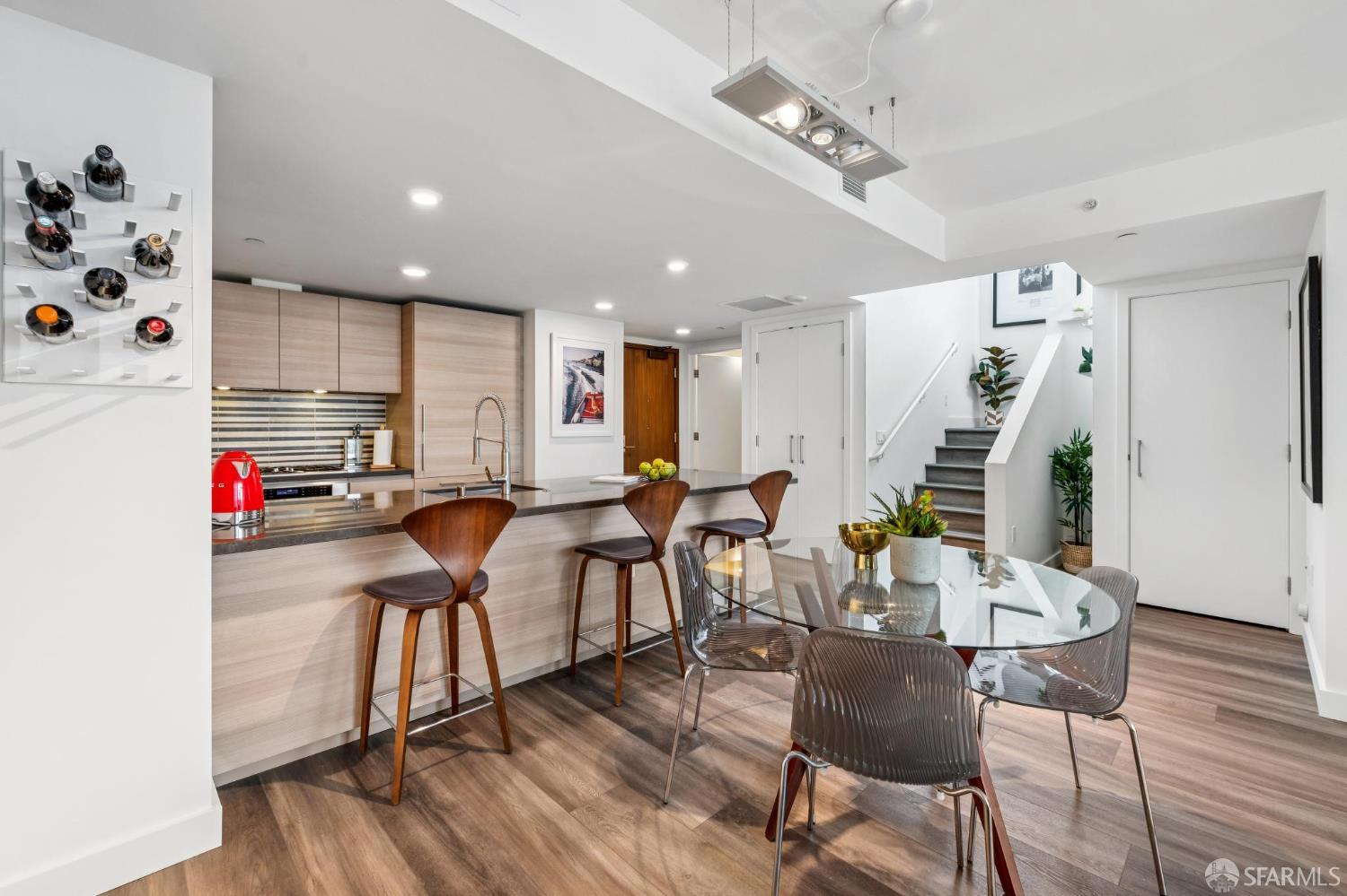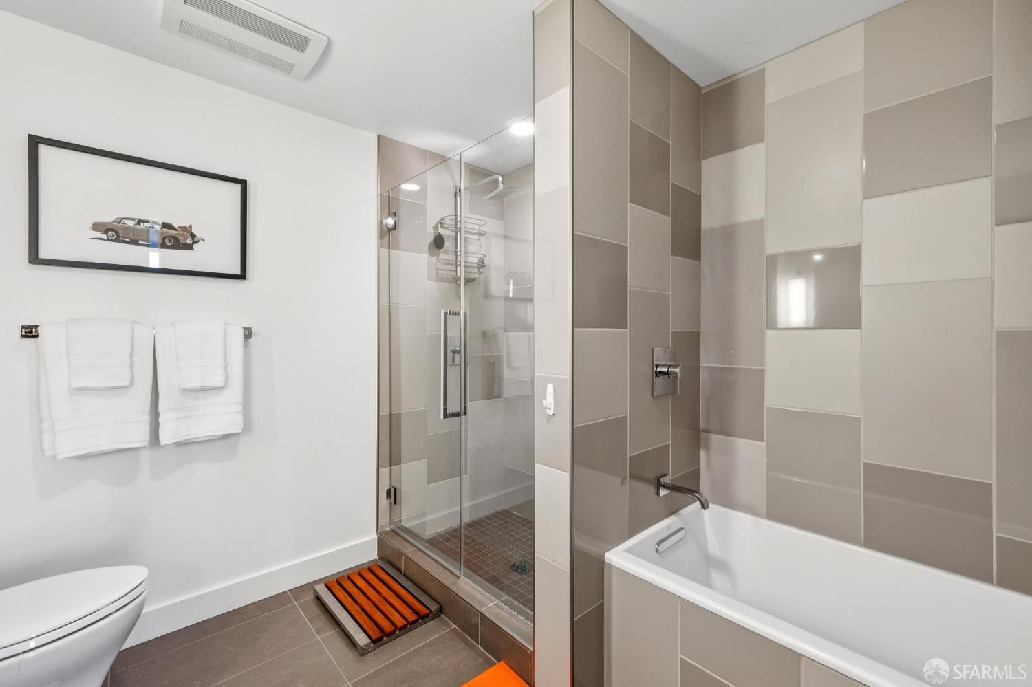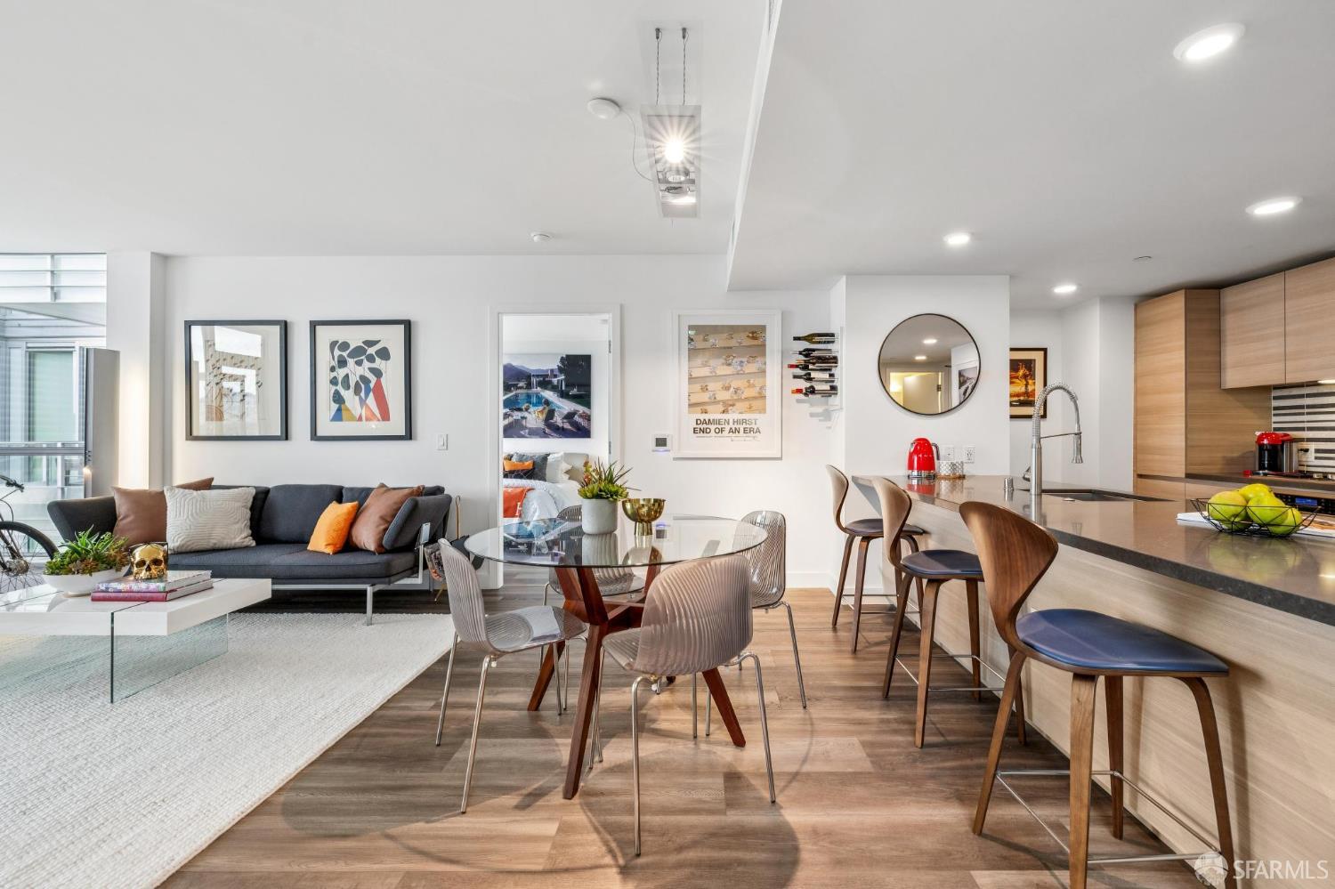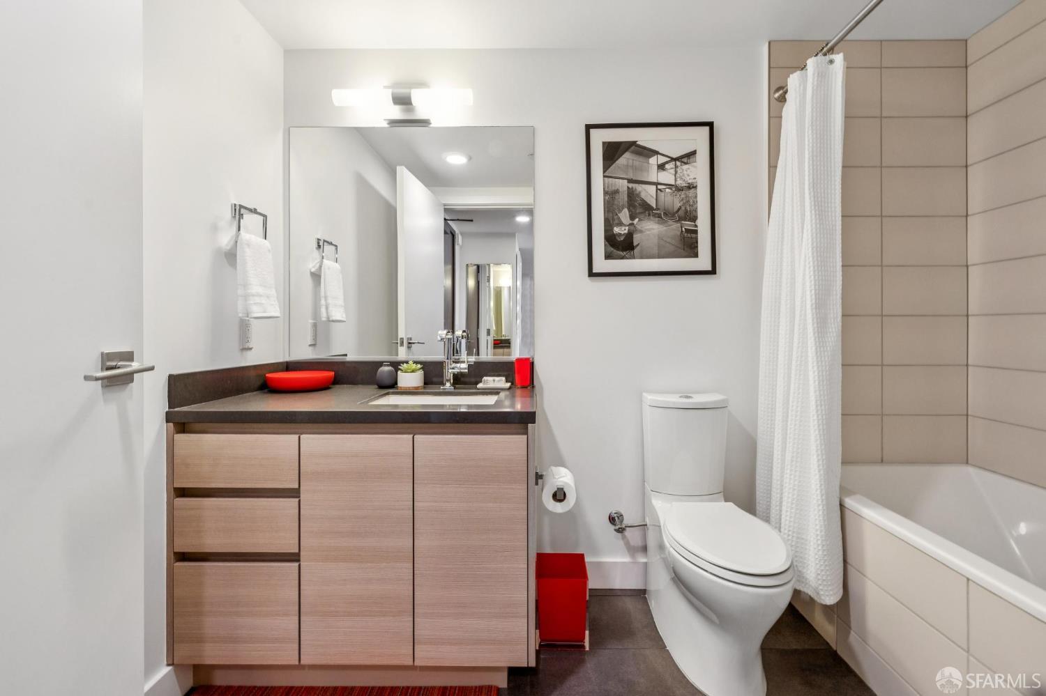 Experience sophisticated city living in this stunning 2-bedroom, 2-bath, view residence at The Arden. Beautiful engineered bamboo hardwood floors flow throughout the open-concept layout, where floor-to-ceiling windows frame sweeping city and Mission Creek views. The modern kitchen, designed for both style and function, anchors the living space and opens to a private balcony. The primary bedroom has an en suite bath with soaking tub and glass enclosed shower. A rare private deeded roof deck on the second level expands your living space perfect for relaxing, entertaining, or enjoying golden sunsets over the skyline. Residents enjoy resort-style amenities, including a 75-foot lap pool, spa, gym, sauna, BBQ lounge, clubhouse, roof deck, and 24-hour front desk attendees. Deeded parking with an EV charger and a private storage closet add convenience and value. Located in the vibrant and thriving Mission Bay Neighborhood, moments from Chase Center, Oracle Park, UCSF, and the city's best dining and parks, this home offers the ultimate in urban luxury and convenience. Mission Bay truly has it all from adjacent dog park to host of 3 professional sports teams to new restaurants and green spaces. Love where you live!