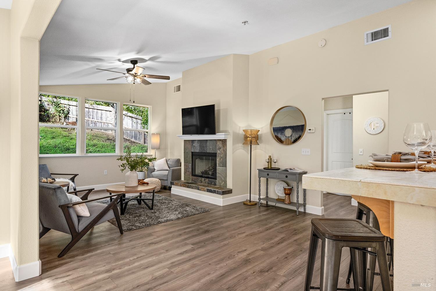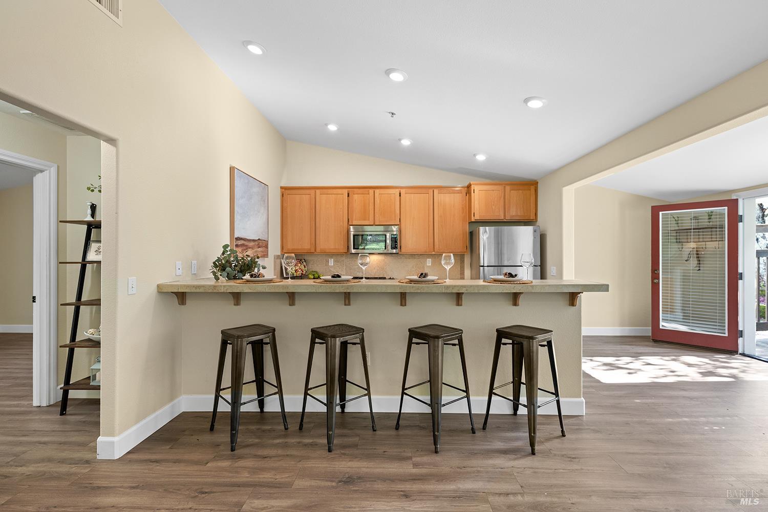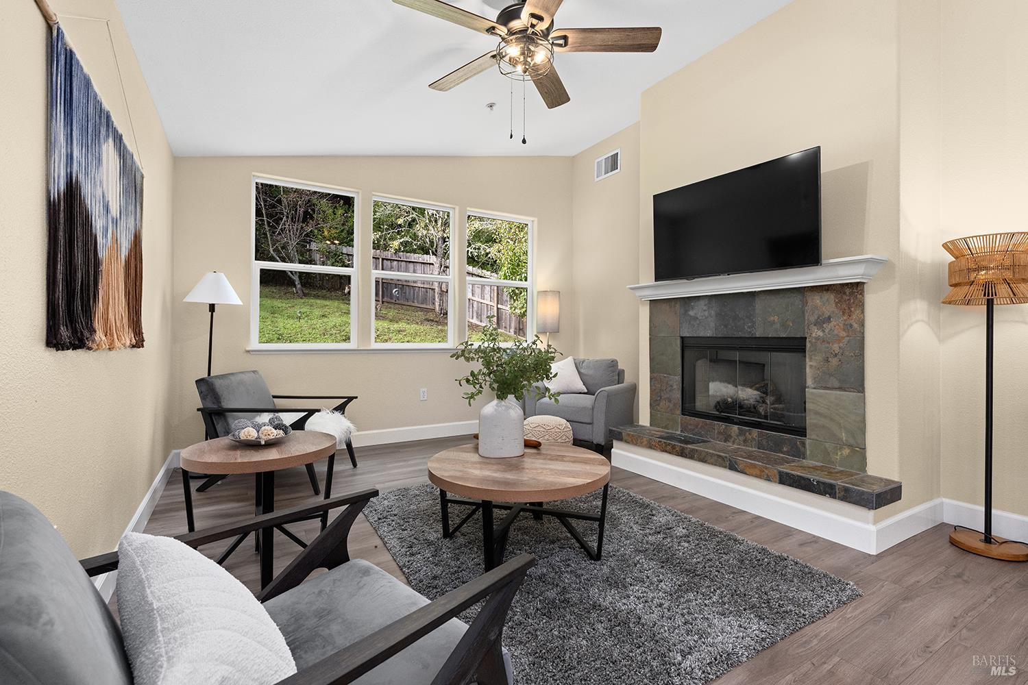 This pristine tastefully appointed very private single-story 2 bedroom end unit is located in the lively Harmony Village Community of Occidental, a place where music and art flourish. Boasting 1,158+/- square feet with soaring ceilings, a warm and cozy gas fireplace, amply sized bedrooms, and a kitchen and bathroom adorned in natural stone, this home is a short distance from fine dining, artisan shops, wine tasting, groceries, churches, schools, the stunning Sonoma Coast and the renowned Russian River Resort area. Walls of glass frame a spacious outdoor living area with lots of patio area suitable for joyful entertaining while enjoying pleasant views of lush green native woodlands. Don't miss the detached two car garage. Come enjoy a rural atmosphere where most conveniences are just a moment away.