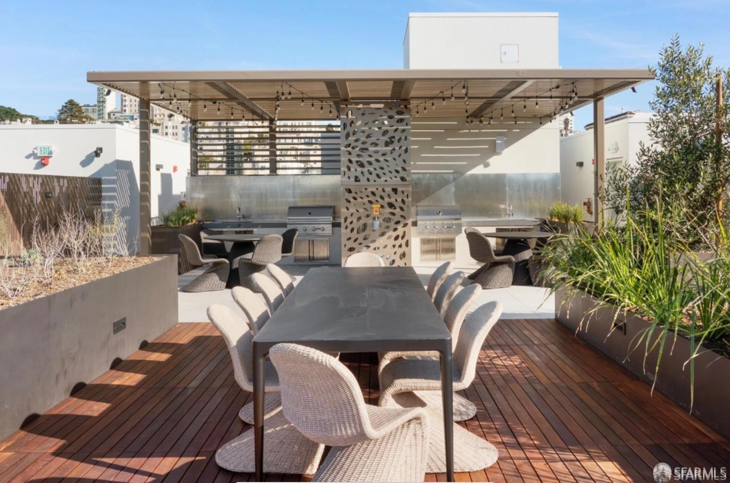 Brand new Residence 103 with incredible Private 460 sq ft patio attached to the living room ideal for outdoor living and entertaining. The Belvedere features a panoramic Golden Gate view bridge and SF skyline roof deck spanning the Entire roof with numerous seating areas for coffee, dining and two large BBQs. This unit is truly turn-key with Custom closets and custom motorized shades newly installed. Both bedrooms are en-suite with an additional 1/2 bath for guests. The high-end kitchen includes Miele appliances and a large, gorgeous Quartzite island flowing to the living space. In-unit washer/dryer, additional storage, bicycle storage and trash service included in rent. This unit uniquely provides the best of both worlds of elegant outdoor living spaces with its own large exclusive patio surrounded by trees and access to an expansive roof deck. Parking is available for an additional fee. The Belvedere offers front desk service, in a perfectly located walking area with the restaurants and shops of Union Street, Polk Street of Russian Hill, and the Marina just minutes away.