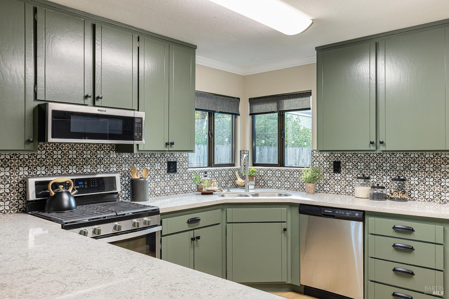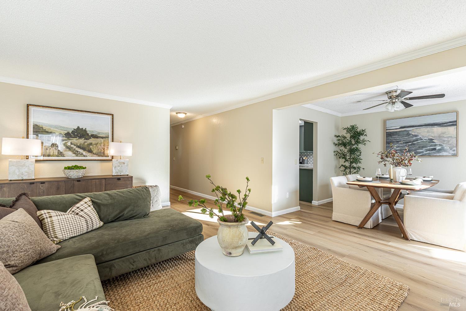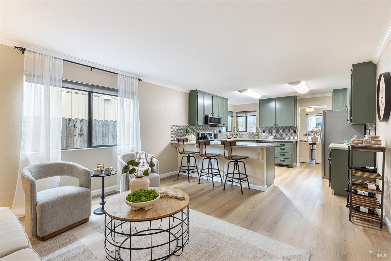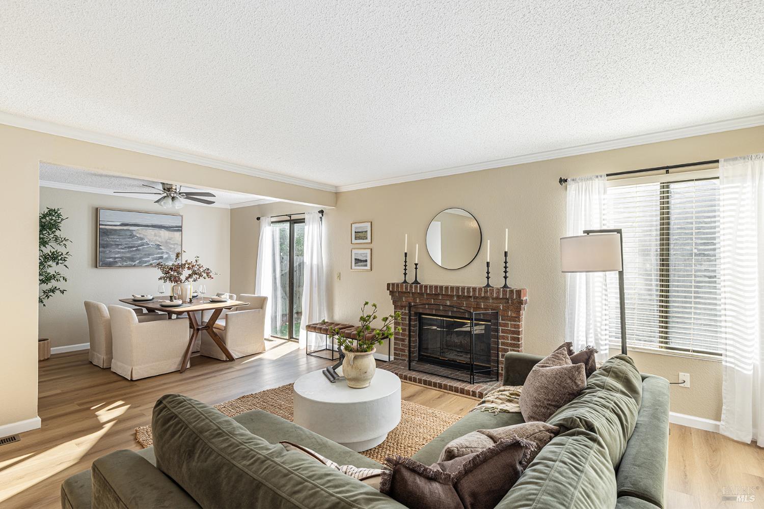 Located just minutes from Sonoma State University, this multi-level home offers space, comfort, and charm. Step inside to a welcoming open foyer that flows into the spacious country kitchen a large, informal space designed for both cooking and gathering. With newer cabinets and flooring, it's perfect for sharing meals, conversation, and connection. Whether you're sitting at the kitchen counter or cooking up something delicious, everyone can be part of the action. The living room features a cozy wood-burning fireplace surrounded by windows, creating a warm, light-filled retreat on the main level. Upstairs, you'll find the primary bedroom at the front of the home, complete with vaulted ceilings, a unique circular window, generous closet space, and an ensuite bathroom. Beyond that are three additional bedrooms each nicely sized and situated toward the back of the home for added privacy and flexibility. Rounding out the property is a two-car garage and a backyard with a grassy area and a small patio perfect for relaxing or entertaining.