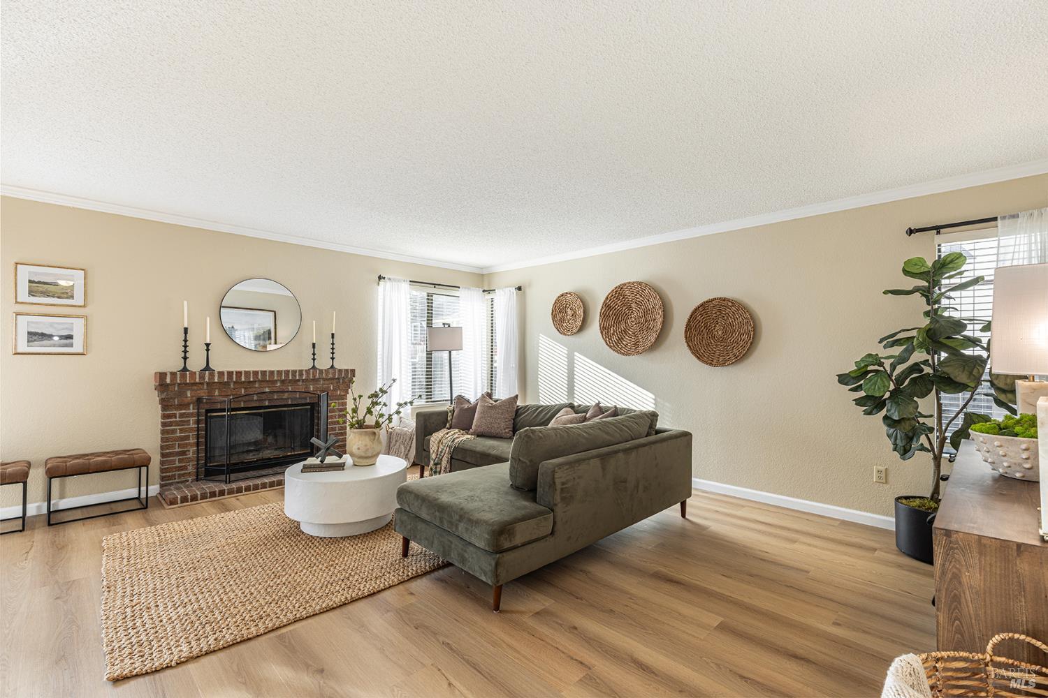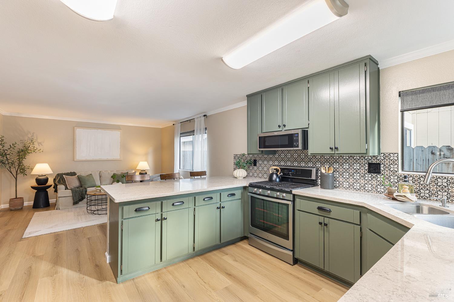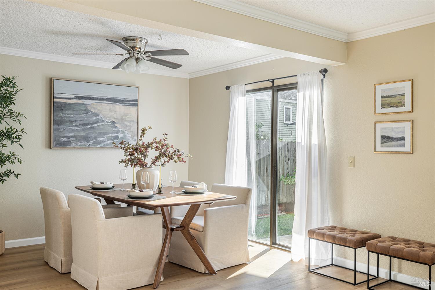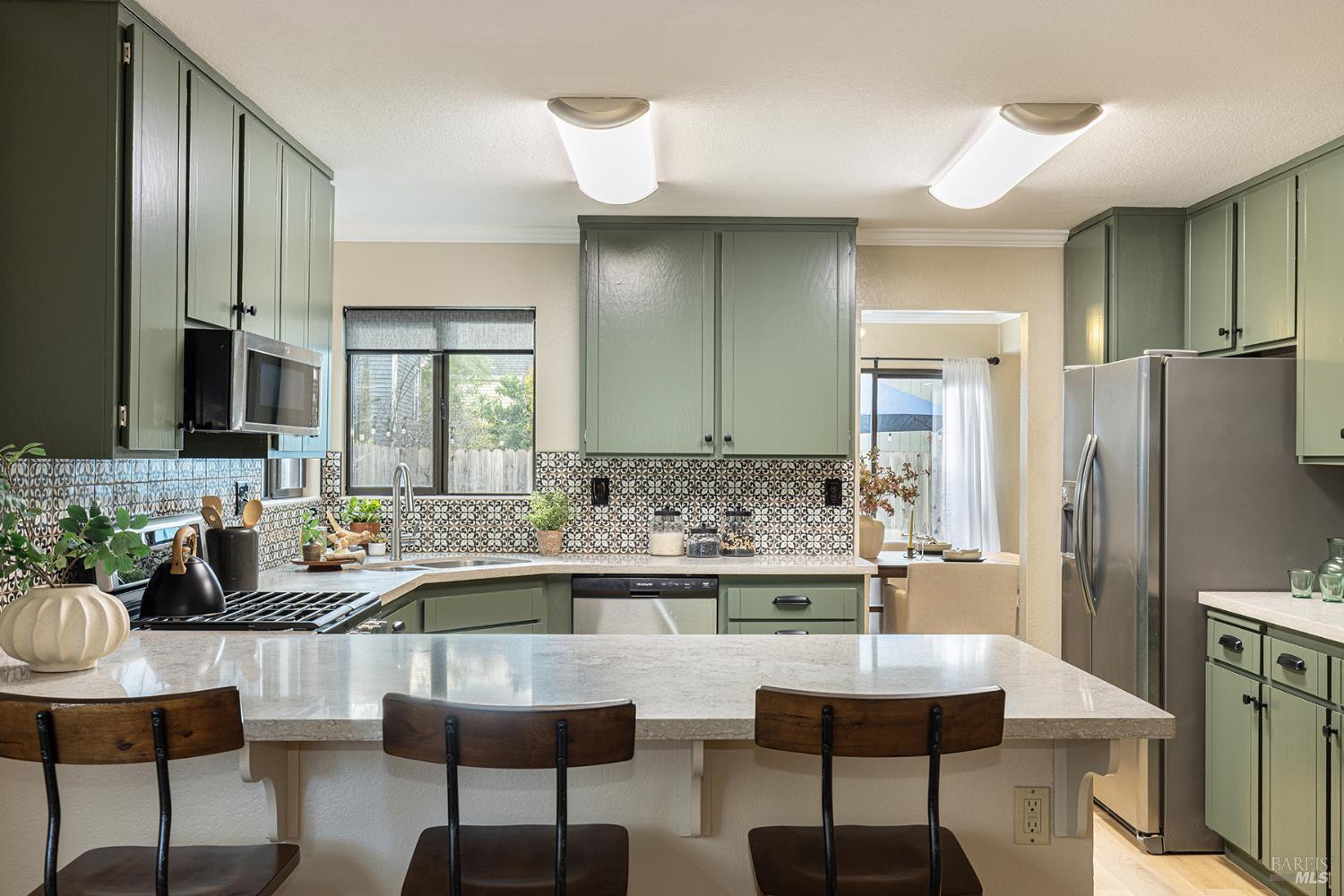 Located just minutes from Sonoma State University, this multi-level home offers space, comfort, and charm. Step inside to a welcoming open foyer that flows into the spacious country kitchen a large, informal space designed for both cooking and gathering. With newer cabinets and flooring, it's perfect for sharing meals, conversation, and connection. Whether you're sitting at the kitchen counter or cooking up something delicious, everyone can be part of the action. The living room features a cozy wood-burning fireplace surrounded by windows, creating a warm, light-filled retreat on the main level. Upstairs, you'll find the primary bedroom at the front of the home, complete with vaulted ceilings, a unique circular window, generous closet space, and an ensuite bathroom. Beyond that are three additional bedrooms each nicely sized and situated toward the back of the home for added privacy and flexibility. Rounding out the property is a two-car garage and a backyard with a grassy area and a small patio perfect for relaxing or entertaining.