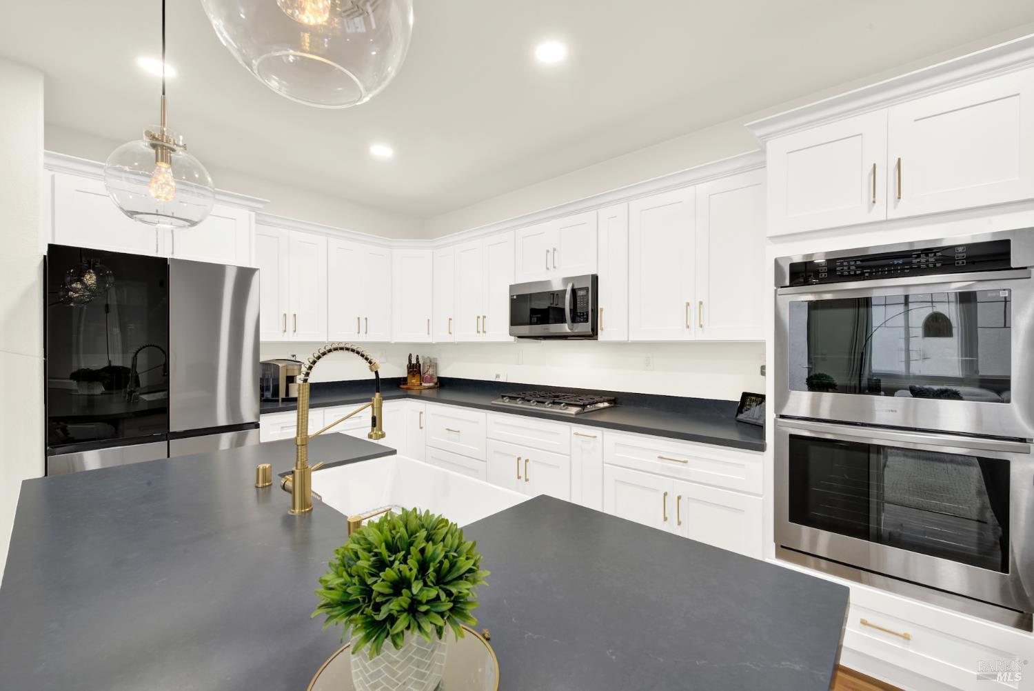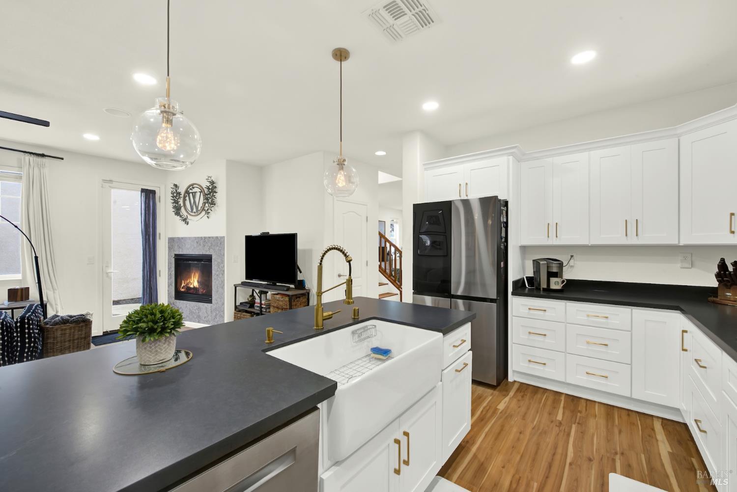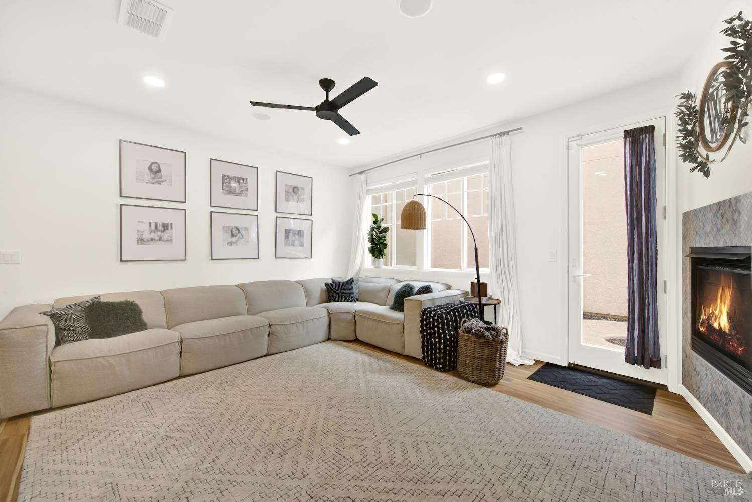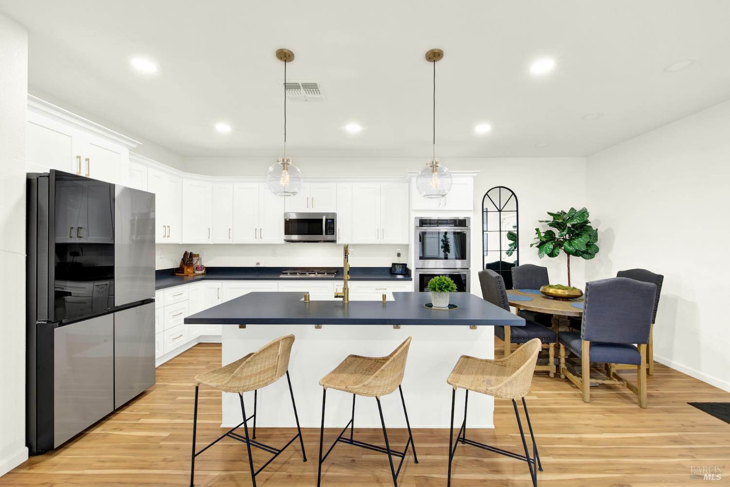 Modern at its best! Introducing 4-bedroom, 2.5-bath home in charming Cordelia. Built in 2005 and thoughtfully remodeled this 2,257 sq ft residence sits in one of Fairfield's most desired neighborhoods, just steps from scenic walking trails, Ridgeview Park, and top-rated Oakbrook Elementary.*Inside, you'll find a remodeled kitchen (2023) featuring stainless steel appliances, a double oven, quartz countertops, a spacious island with seating for three, pantry, and elegant Crate & Barrel lighting. The kitchen flows into the family room, where natural light pours in and built-in Bluetooth ceiling speakers set the tone for cooking, entertaining, or unwinding.*The home showcases updated hardwood flooring (2023), fresh interior paint, recessed lighting, and designer upgrades throughoutincluding Restoration Hardware lighting on the staircase and updated downstairs bathroom (2025). Dual gas fireplaces add warmth in both the family room and the spacious primary suite.*Upstairs, the primary bedroom offers a cozy fireplace, and a bright en-suite with updated mirrors, walk-in closet, soaking tub, shower stall. Two of the front-facing bedrooms enjoy beautiful mountain and sunset views, bringing in incredible natural light. Don't miss out!