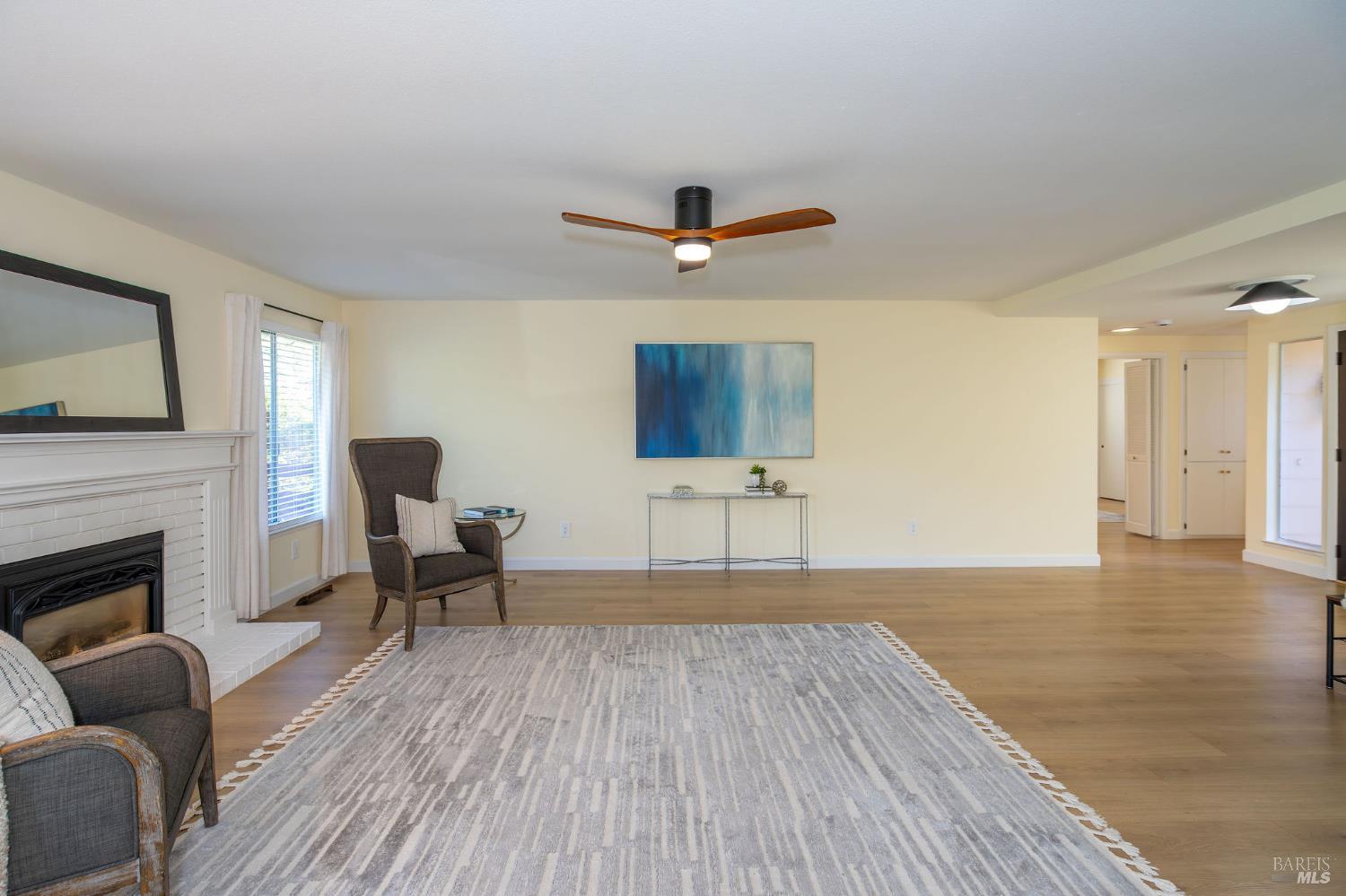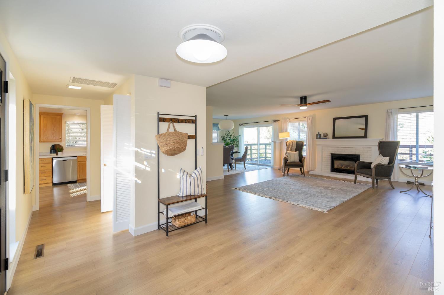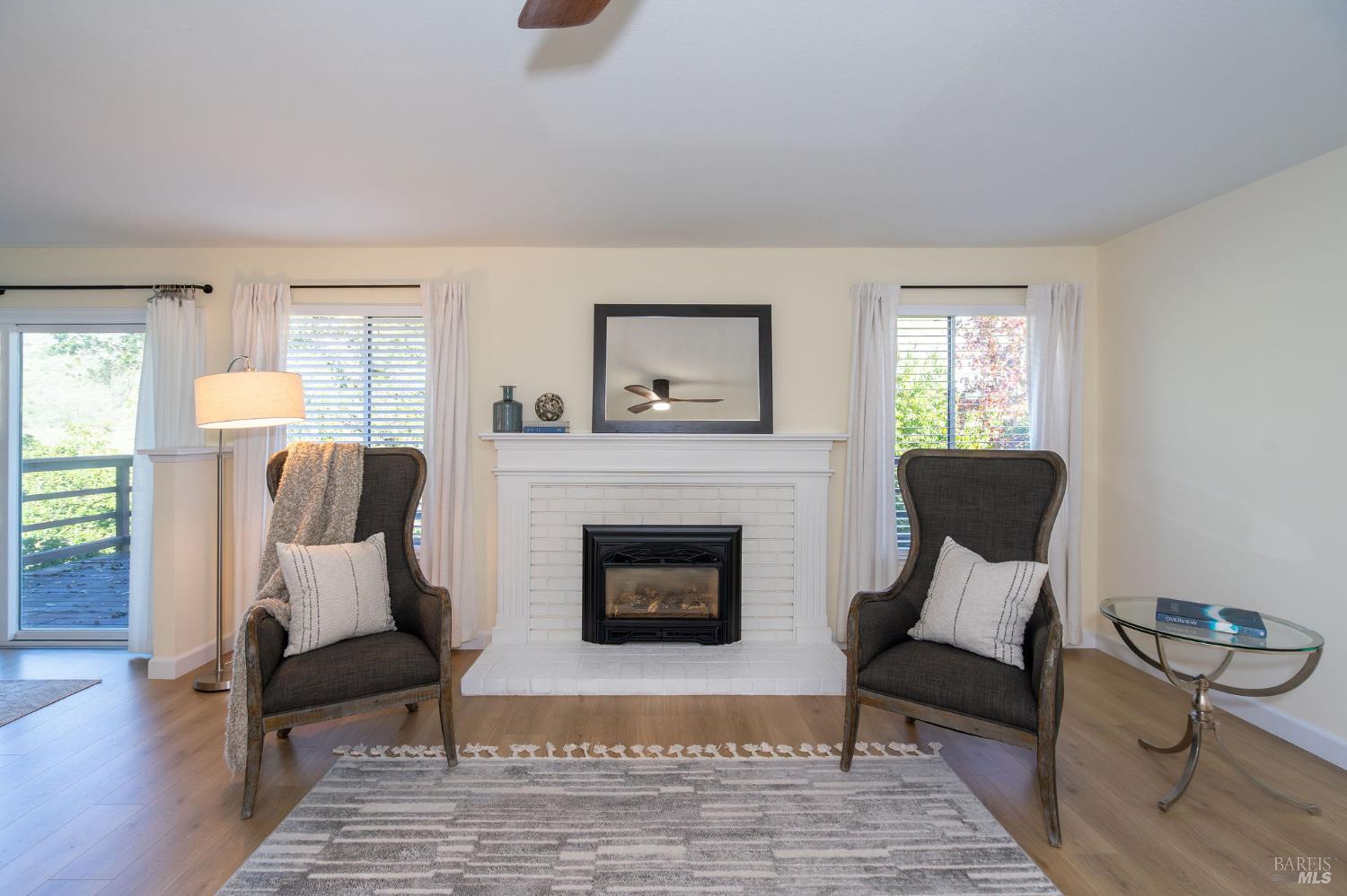 This highly desirable 3-bedroom, 2-bath Juniper model is tucked down a quiet driveway amid majestic oaks and maples, offering stunning views of two State Parks, vineyards, and mountains. Enjoy fall colors from the charming front courtyard, then step inside to an open, spacious living room with gas fireplace and scenic windows. Updates include new paint, bathrooms, fridge, range, washer and dryer, with newer flooring, lighting, electrical panel, and attic insulation. The large kitchen with breakfast area flows to a generous deck, perfect for entertaining. Two-car garage and move-in ready. Near West Rec Center with pool, tennis, fitness, and just a short drive to Oakmont Golf Courses. Don't miss this special home!