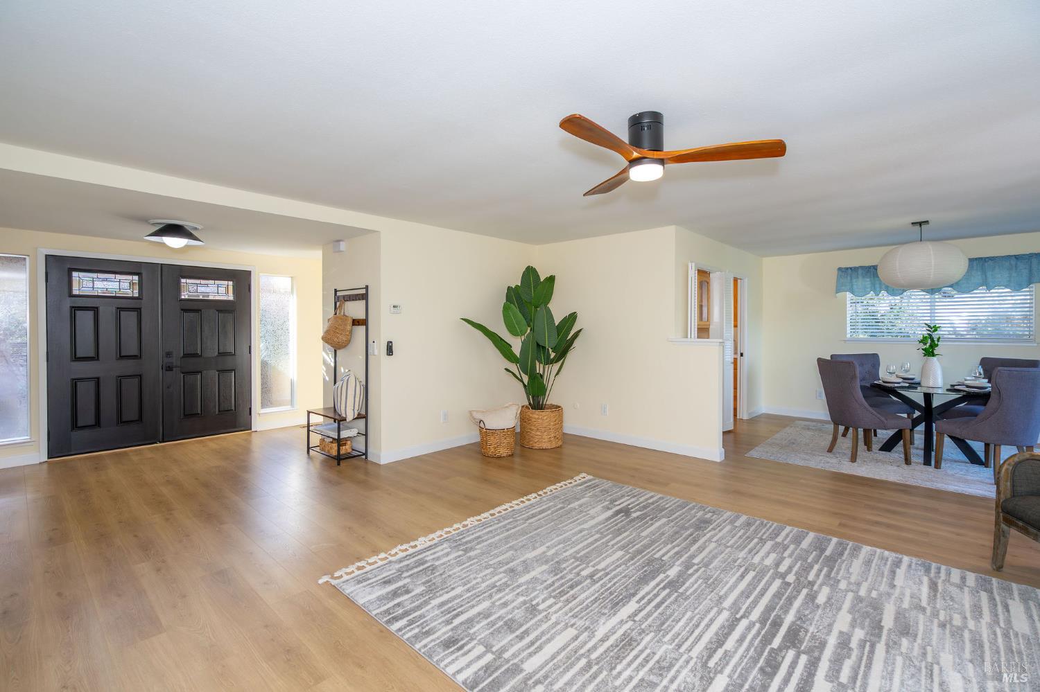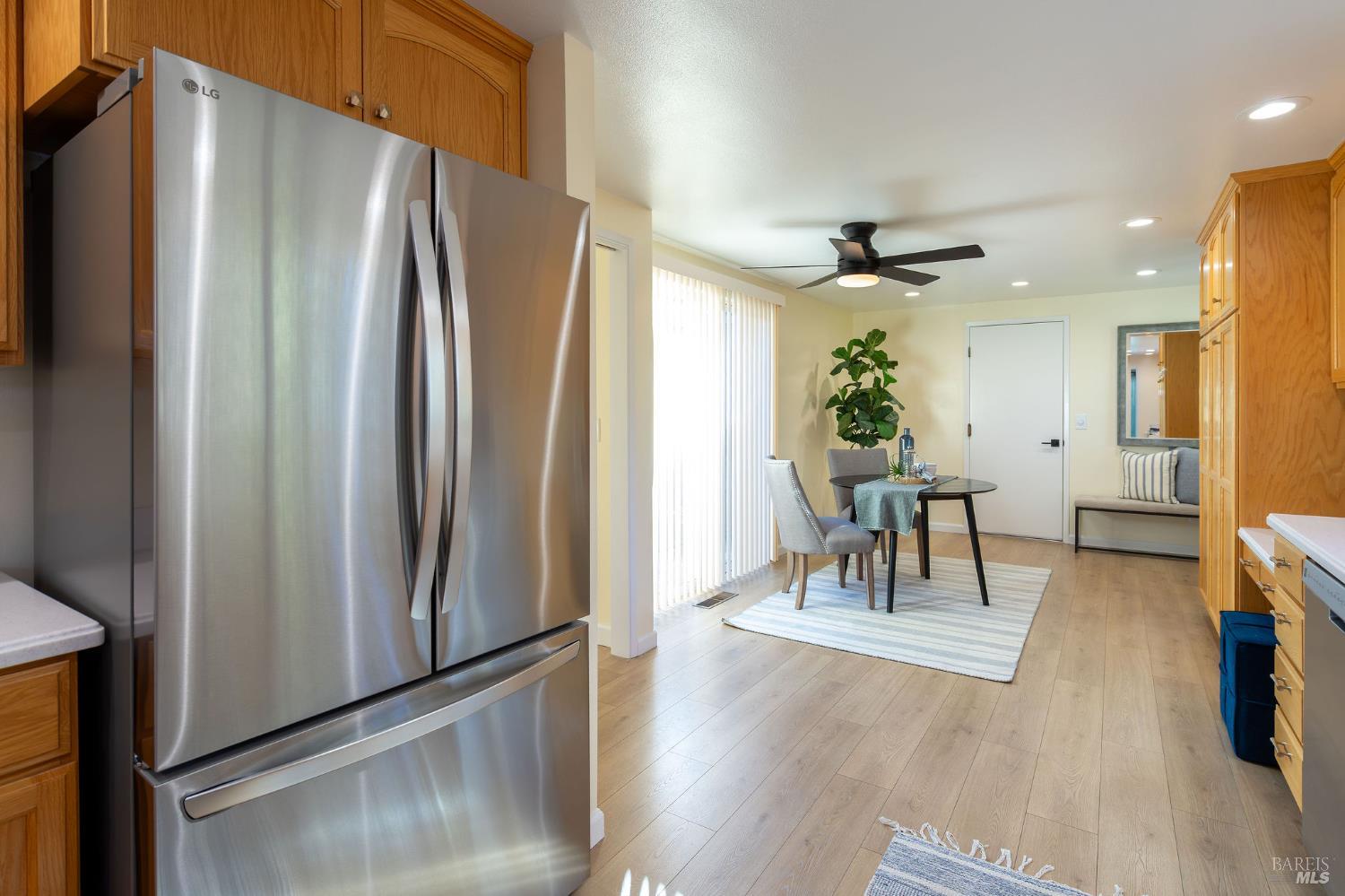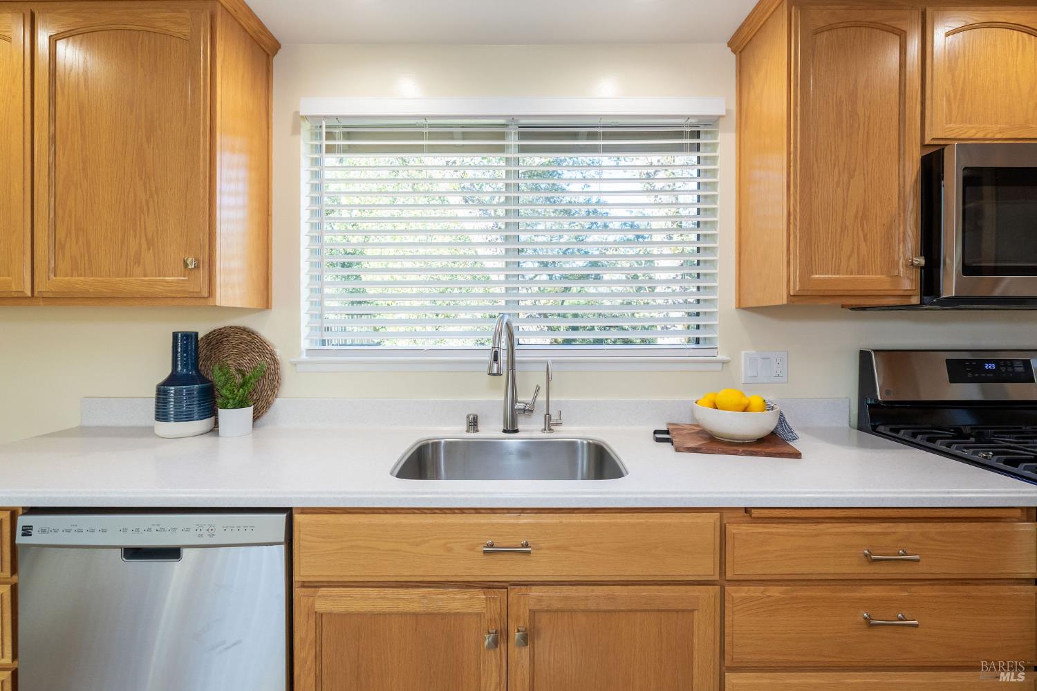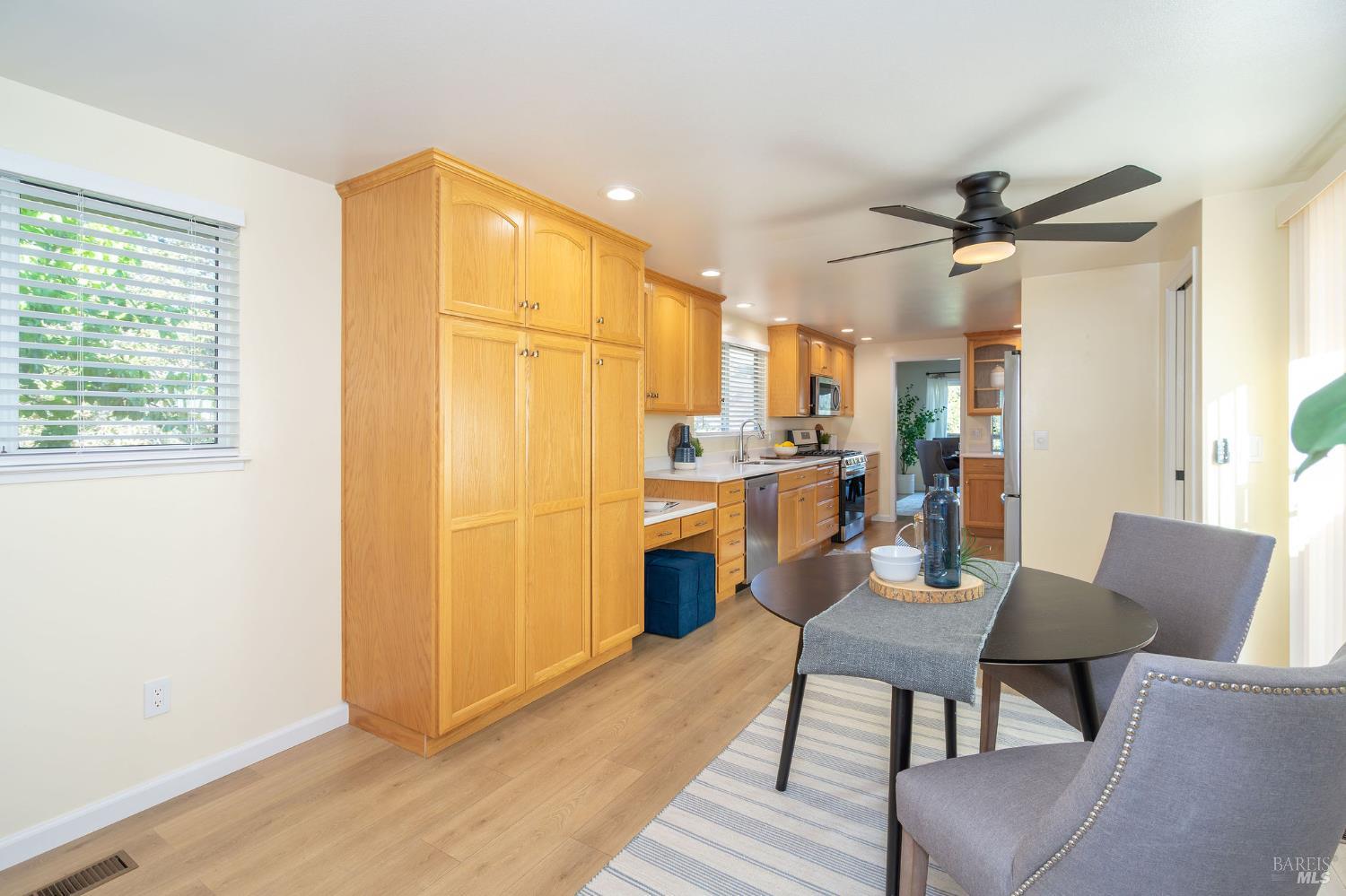 This highly desirable 3-bedroom, 2-bath Juniper model is tucked down a quiet driveway amid majestic oaks and maples, offering stunning views of two State Parks, vineyards, and mountains. Enjoy fall colors from the charming front courtyard, then step inside to an open, spacious living room with gas fireplace and scenic windows. Updates include new paint, bathrooms, fridge, range, washer and dryer, with newer flooring, lighting, electrical panel, and attic insulation. The large kitchen with breakfast area flows to a generous deck, perfect for entertaining. Two-car garage and move-in ready. Near West Rec Center with pool, tennis, fitness, and just a short drive to Oakmont Golf Courses. Don't miss this special home!