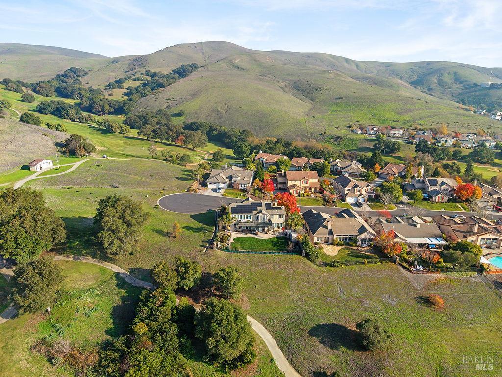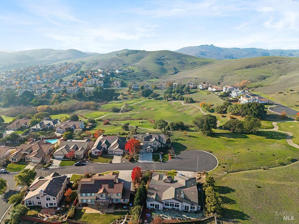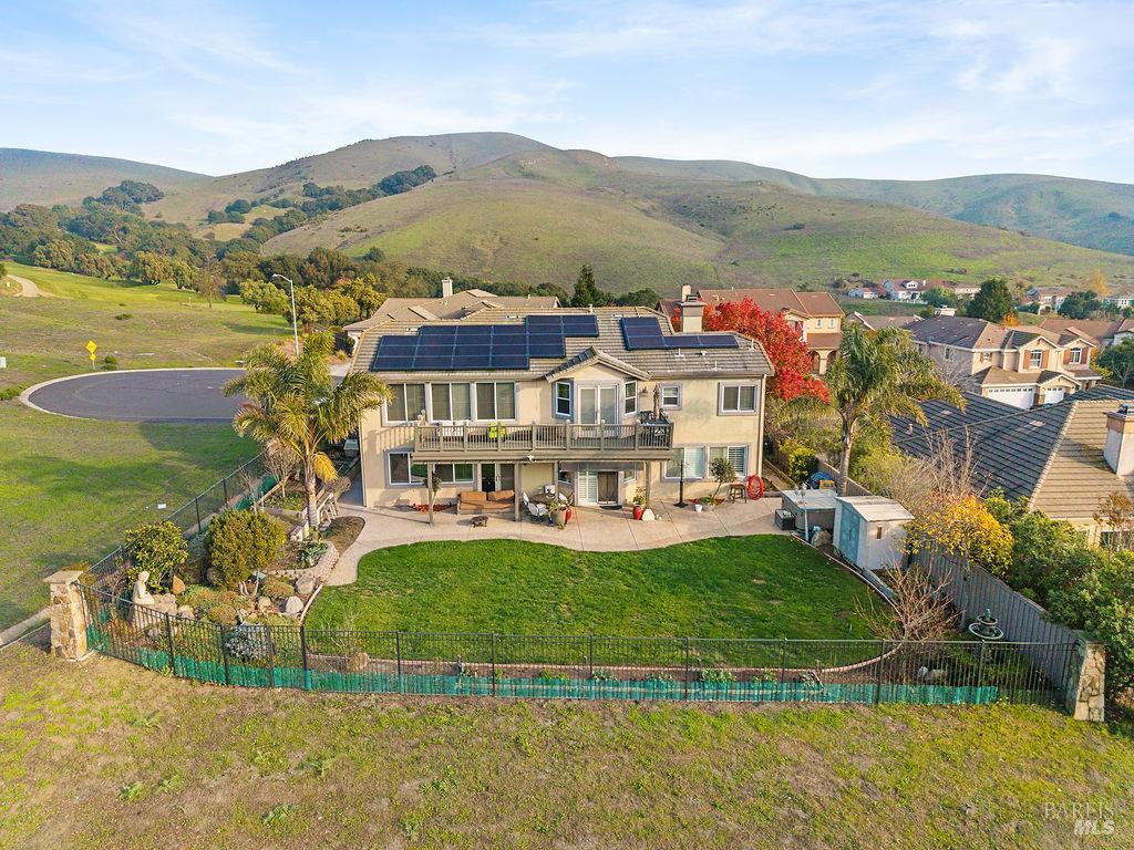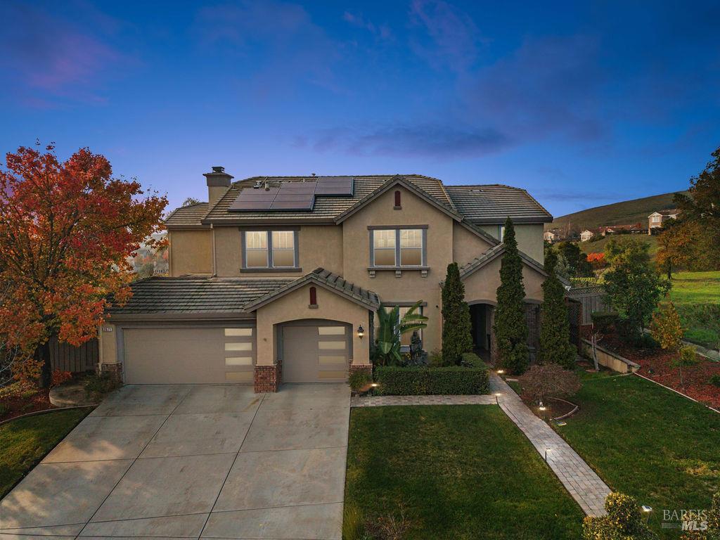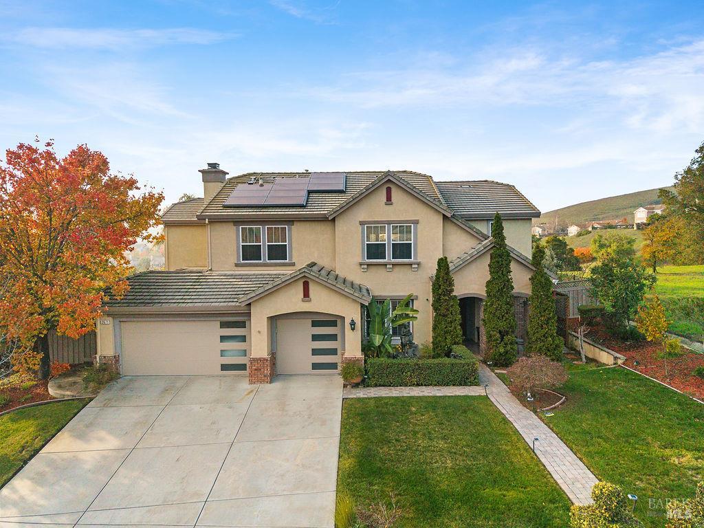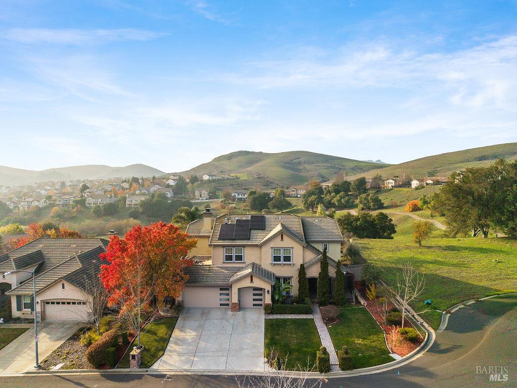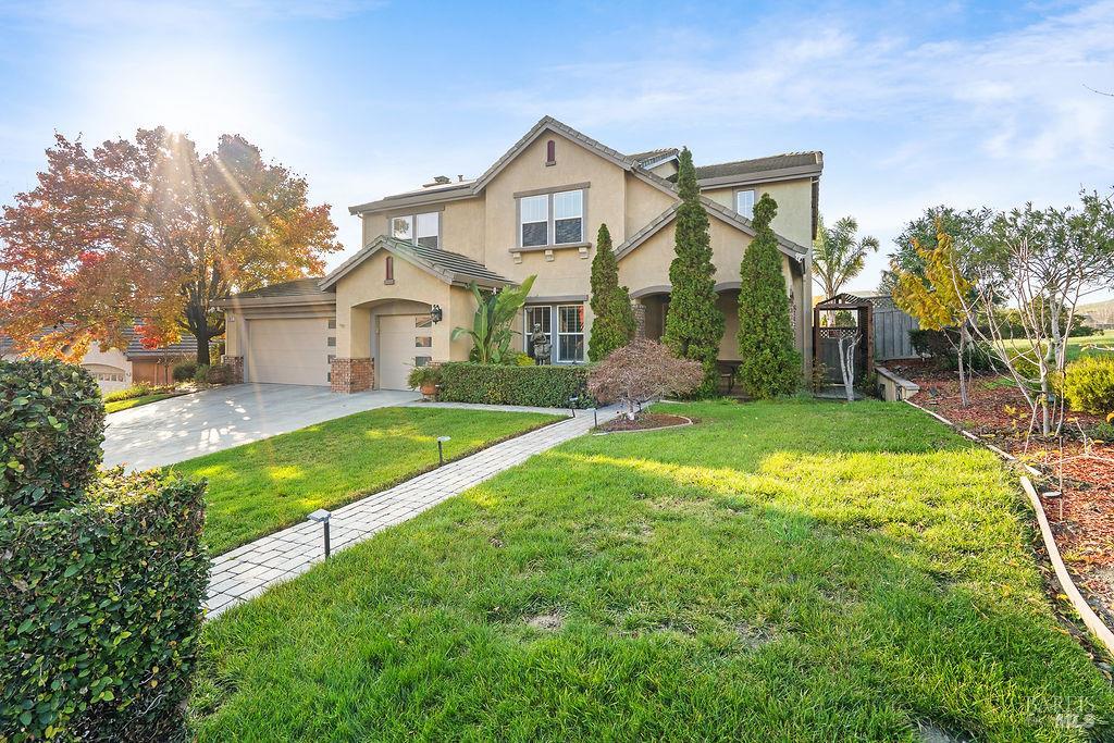 Welcome to resort-style living in the desirable Hiddenbrooke community! Tucked away at the end of a peaceful cul-de-sac, this home overlooks the canyon and offers stunning views of the Arnold Palmer-designed 16th hole and the surrounding natural hillside. This well-designed residence features 3,455 square feet of living space, including three bedrooms plus a versatile multi-purpose room. The kitchen boasts custom cabinetry, stone countertops, plantation shutters, stainless steel appliances, a bar-top counter, and a breakfast area with easy access to the outdoors. A separate formal dining room is highlighted by custom molding, French doors, and plantation shutters. Expansive rear windows fill the spacious living room with natural light and picturesque views. French doors with plantation shutters open to the outdoor patio, while the adjacent family room offers a cozy wood-burning fireplace with a custom mantel and built-in shelving. A full bath and a large laundry room with cabinets and a sink complete the main level. Upstairs, you'll find the generous multi-purpose room with built-in cabinetsideal for a home office or game room. The primary en-suite retreat includes a fireplace, soaking tub, glass-enclosed shower, dual vanities, and dual closets. Step outside onto your private deck to enjoy your morning coffee while taking in views of golfers and local wildlife. Outdoor living is equally inviting with nicely landscaped front and back yards, perfect for relaxing in the spa or grilling for guests. Additional features include a three-car garage with epoxy floors, finished walls, and built-in cabinets, leased solar, a water filtration system, and a tankless water heater. Enjoy Hiddenbrooke's golf course walking trails, The Mat Yoga Studio, J&O's specialty grocery store, and sweeping views of the surrounding hillsthis home truly offers the best of Hiddenbrooke living.