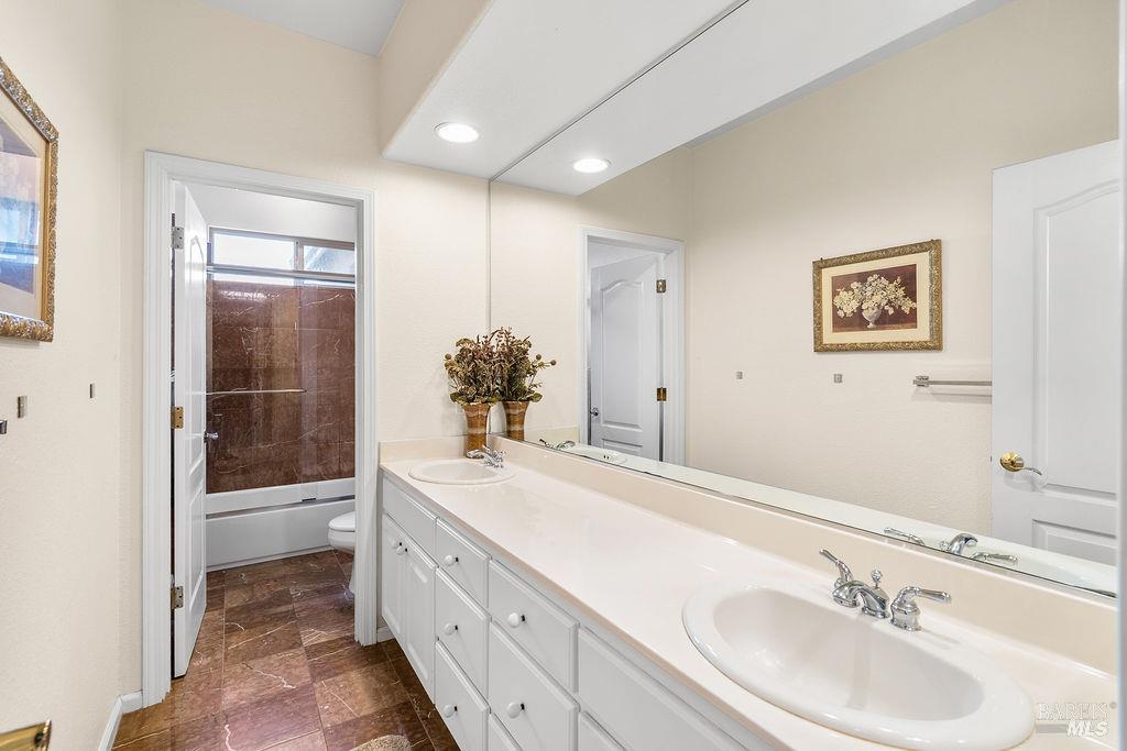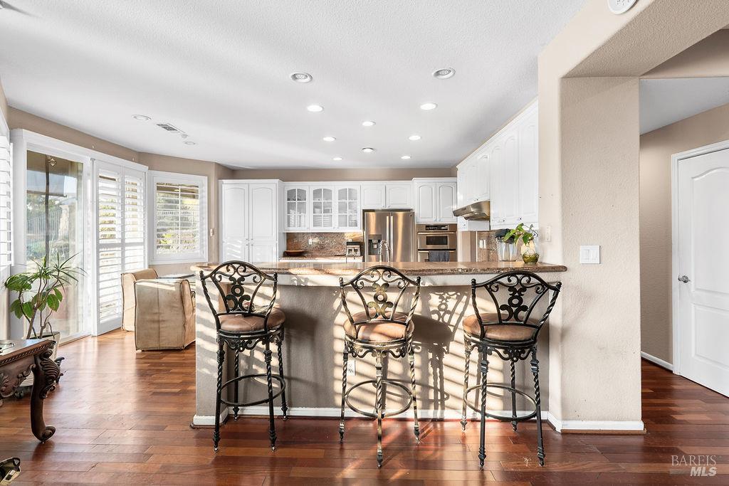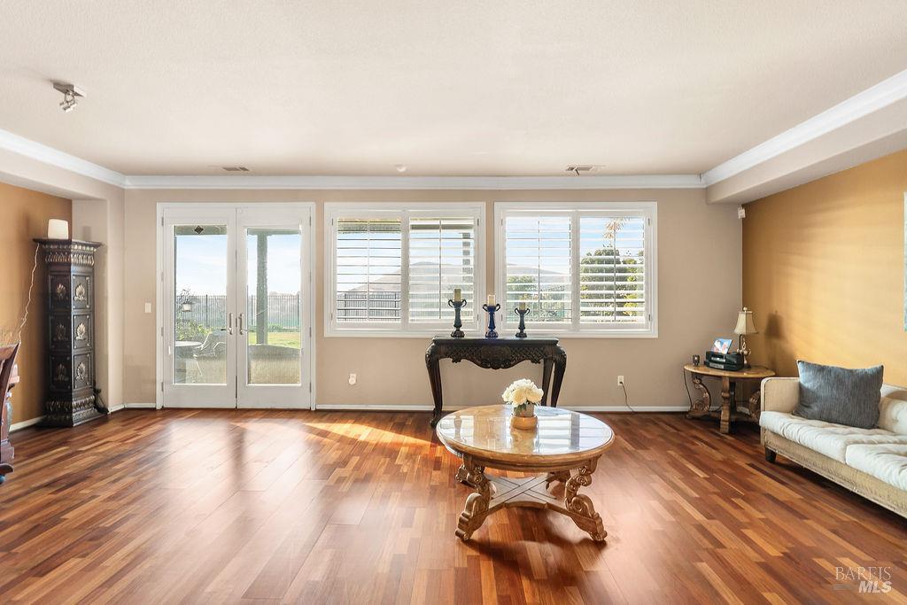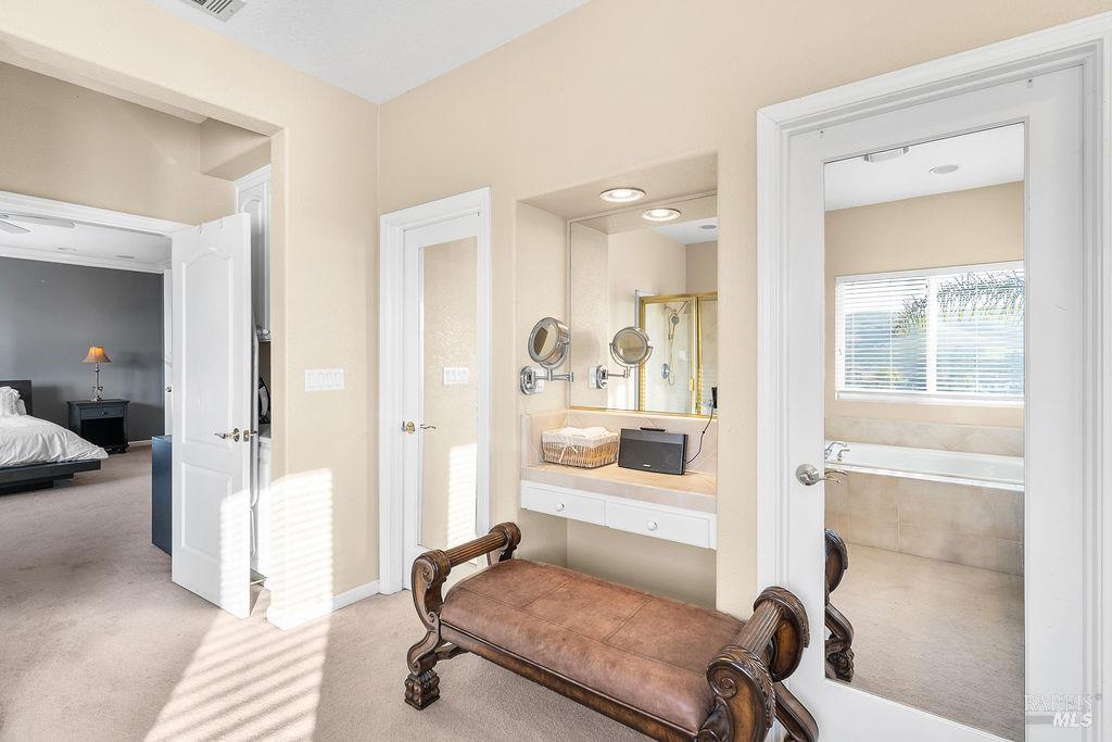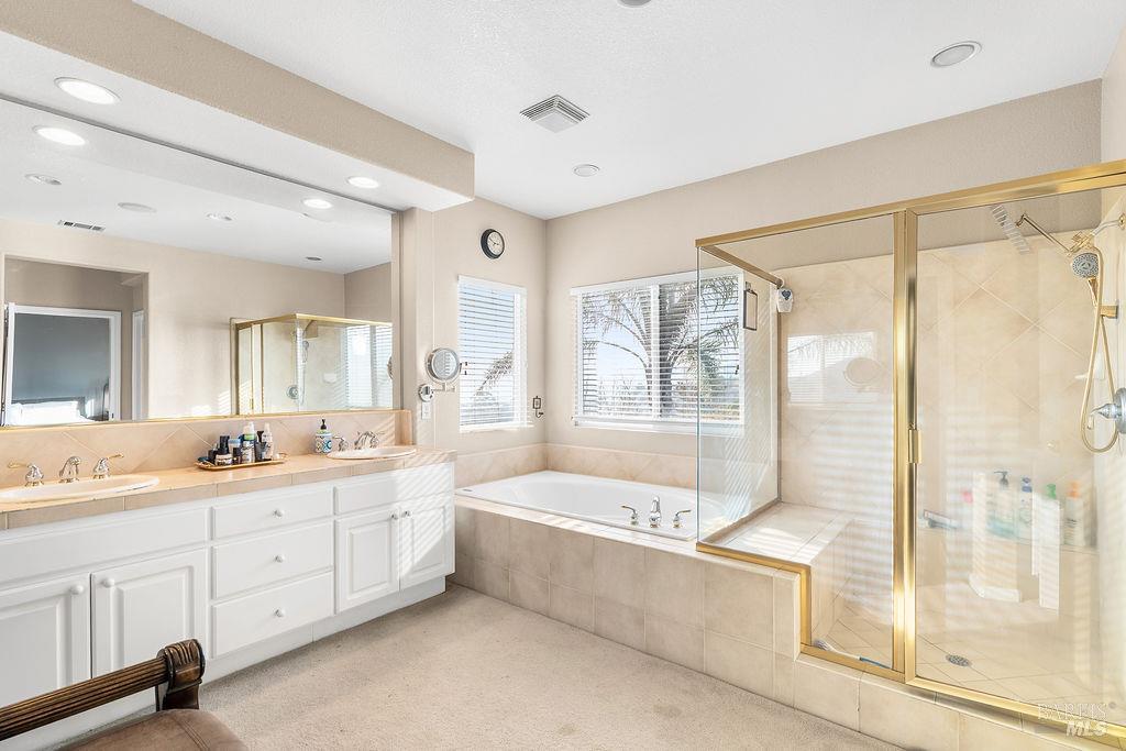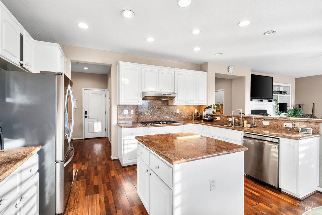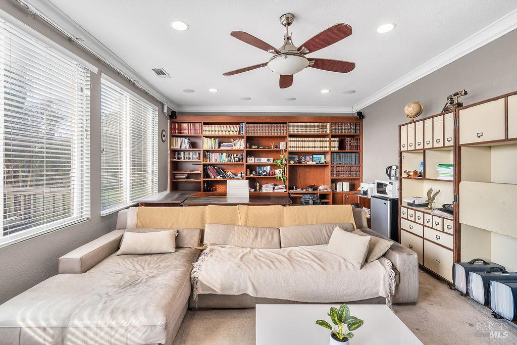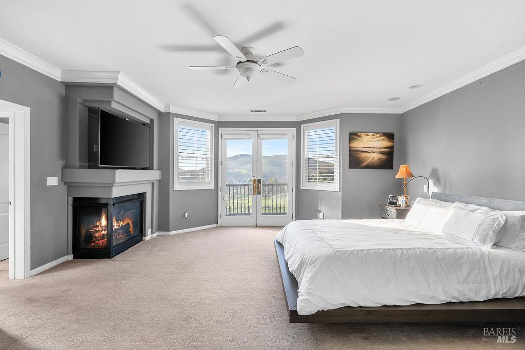 Welcome to resort-style living in the desirable Hiddenbrooke community! Tucked away at the end of a peaceful cul-de-sac, this home overlooks the canyon and offers stunning views of the Arnold Palmer-designed 16th hole and the surrounding natural hillside. This well-designed residence features 3,455 square feet of living space, including three bedrooms plus a versatile multi-purpose room. The kitchen boasts custom cabinetry, stone countertops, plantation shutters, stainless steel appliances, a bar-top counter, and a breakfast area with easy access to the outdoors. A separate formal dining room is highlighted by custom molding, French doors, and plantation shutters. Expansive rear windows fill the spacious living room with natural light and picturesque views. French doors with plantation shutters open to the outdoor patio, while the adjacent family room offers a cozy wood-burning fireplace with a custom mantel and built-in shelving. A full bath and a large laundry room with cabinets and a sink complete the main level. Upstairs, you'll find the generous multi-purpose room with built-in cabinetsideal for a home office or game room. The primary en-suite retreat includes a fireplace, soaking tub, glass-enclosed shower, dual vanities, and dual closets. Step outside onto your private deck to enjoy your morning coffee while taking in views of golfers and local wildlife. Outdoor living is equally inviting with nicely landscaped front and back yards, perfect for relaxing in the spa or grilling for guests. Additional features include a three-car garage with epoxy floors, finished walls, and built-in cabinets, leased solar, a water filtration system, and a tankless water heater. Enjoy Hiddenbrooke's golf course walking trails, The Mat Yoga Studio, J&O's specialty grocery store, and sweeping views of the surrounding hillsthis home truly offers the best of Hiddenbrooke living.