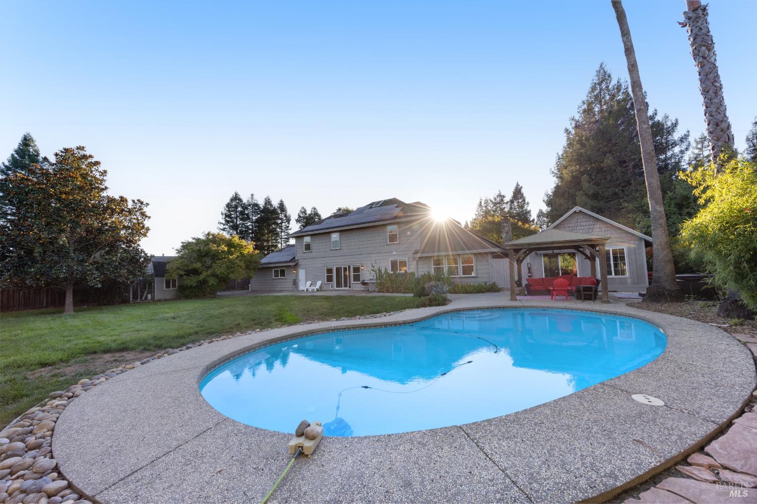 Experience your own slice of paradise and modern luxury in this beautifully upgraded 4-bedroom, 3-bath NW Santa Rosa Estate, professionally staged, offering approximately 2,207 sq.ft. of refined living space PLUS a detached 430 sq.ft Pool House/Game Room on a picturesque 1.05-acre lot designed for beauty, comfort, and connection. Every space feels open and inviting, with light dancing across elegant new floors and tasteful designer finishes throughout. The gourmet kitchen serves as the heart of the home, showcasing quartz countertops, soft-close cabinetry, Moen sink, and premium Thor appliances, complemented by a stylish dining area with coordinating quartz buffet. The main level features a guest bedroom and full bath, while upstairs, the serene primary suite offers a cozy fireplace, expansive walk-in closet, and a spa inspired bathroom with dual vanities and a beautifully tiled shower with dual-head fixtures. Step outside to your private oasis with a sparkling pool, shaded gazebo, lush lawn, mature trees, and a spacious pool house/game room perfect for entertaining. Enjoy incredible, peaceful views from every angle. A detached lofted shed, 3-car garage with brand new garage doors, and solar panels complete this extraordinary property.