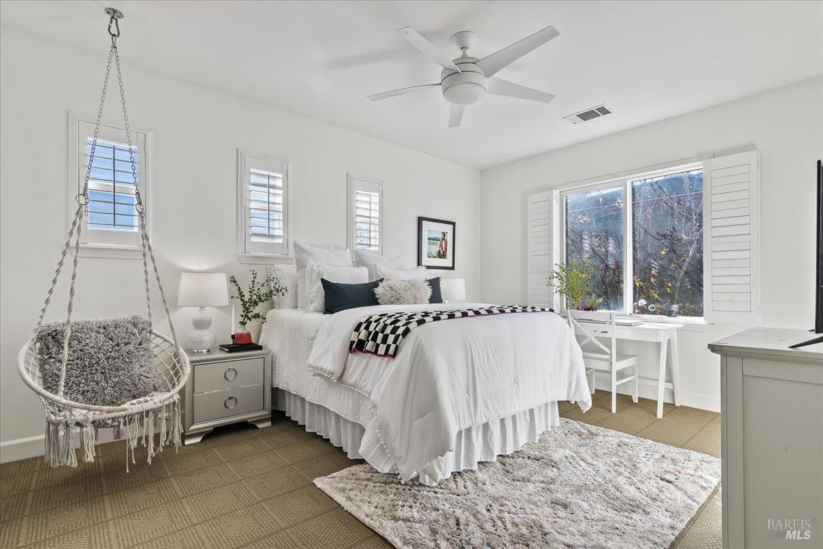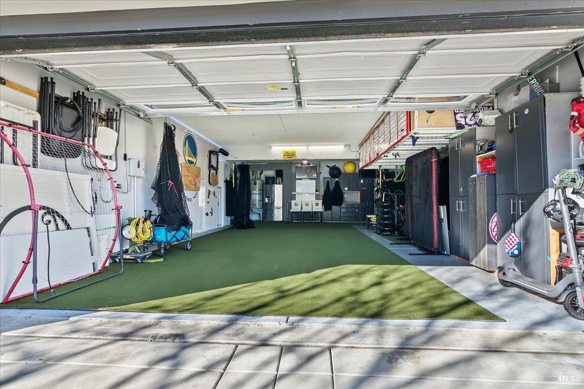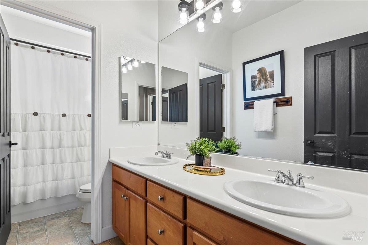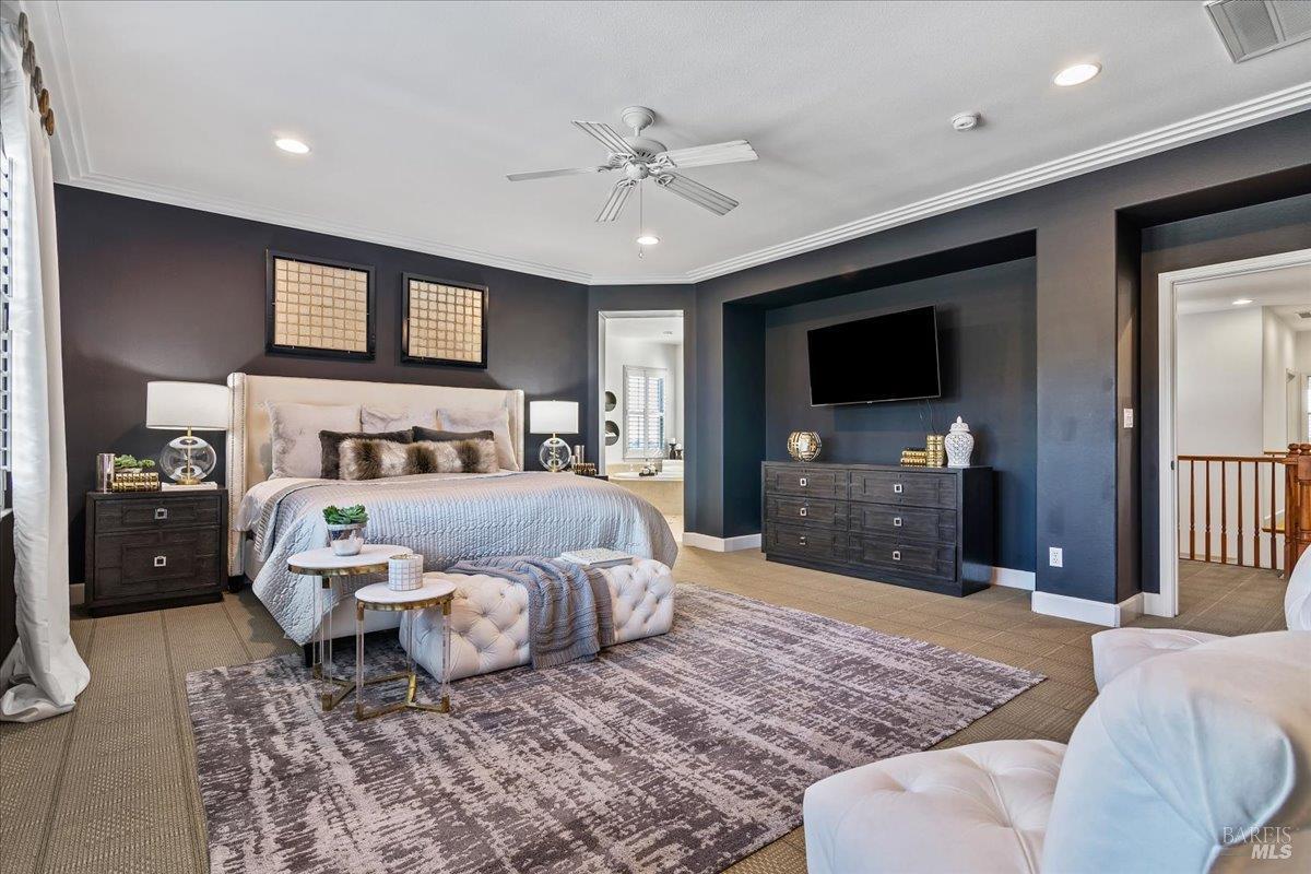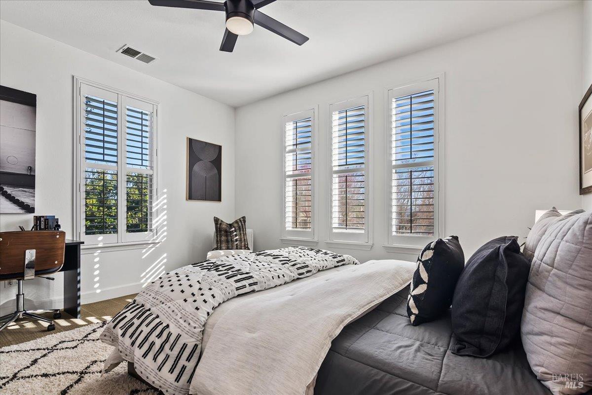 Step into a world of modern elegance with this remarkable 3,508 sq. ft. residence, perfectly curated for those who love to entertain and live boldly. Every detail speaks to refined taste and contemporary flair. From formal gatherings to casual soires, this home offers versatile living and dining areas designed to impress. A downstairs guest suite ensures comfort for visitors, while the upstairs retreat/media room creates the ultimate space for relaxation or movie nights. The heart of the home boasts a chef-inspired designer kitchen featuring under-cabinet lighting for a sleek ambiance, expansive island for culinary creativity, a 6-burner gas cooktop, double ovens, microwave and a new Samsung smart refrigerator for cutting-edge convenience. Custom design touches elevate your interiors with acoustic fluted wood accents, flocked designer wallpaper, and updated lighting fixtures throughout. A fully enclosed wet bar, strategically placed near the kitchen & family areas, makes entertaining effortless. Step outside to your private paradise spanning a lot size of 12,920 square feet, backing up to open space and Lake Herman to provide abundant privacy and space. This backyard oasis features a 5-year-old newly installed saltwater pool & spa with a spillover water feature and baja ledge, a covered patio for year-round enjoyment, and an upper-level turf area, perfect for Bocce Ball or lounging. Enjoy smart and sustainable living with a fully finished tandem 4-car garage with a 220 EV charger, powered by a paid-off 54-panel solar system from Freedom Forever. Additional highlights include a freshly painted interior, an exterior refresh in 2019, Hunter Douglas shutters & professionally tinted windows, a newer water heater and recessed lighting throughout. This home is more than a residence, it's a statement of style, sustainability, and sophistication. Perfect for the discerning buyer who demands the best in design and functionality.
