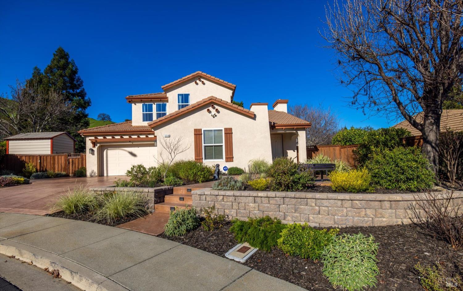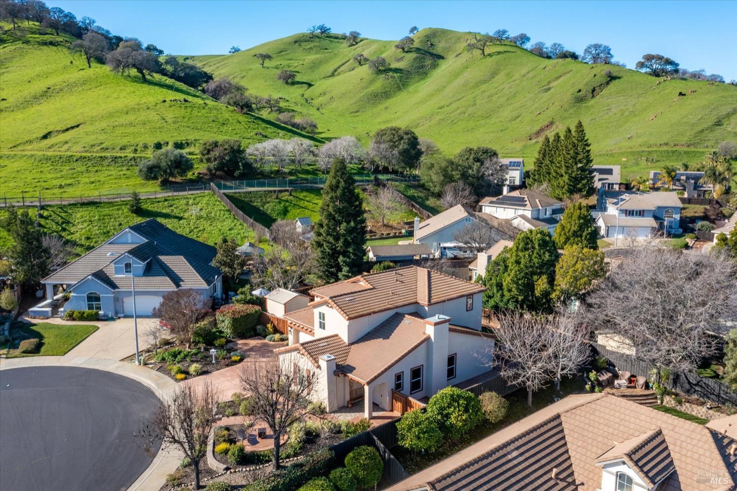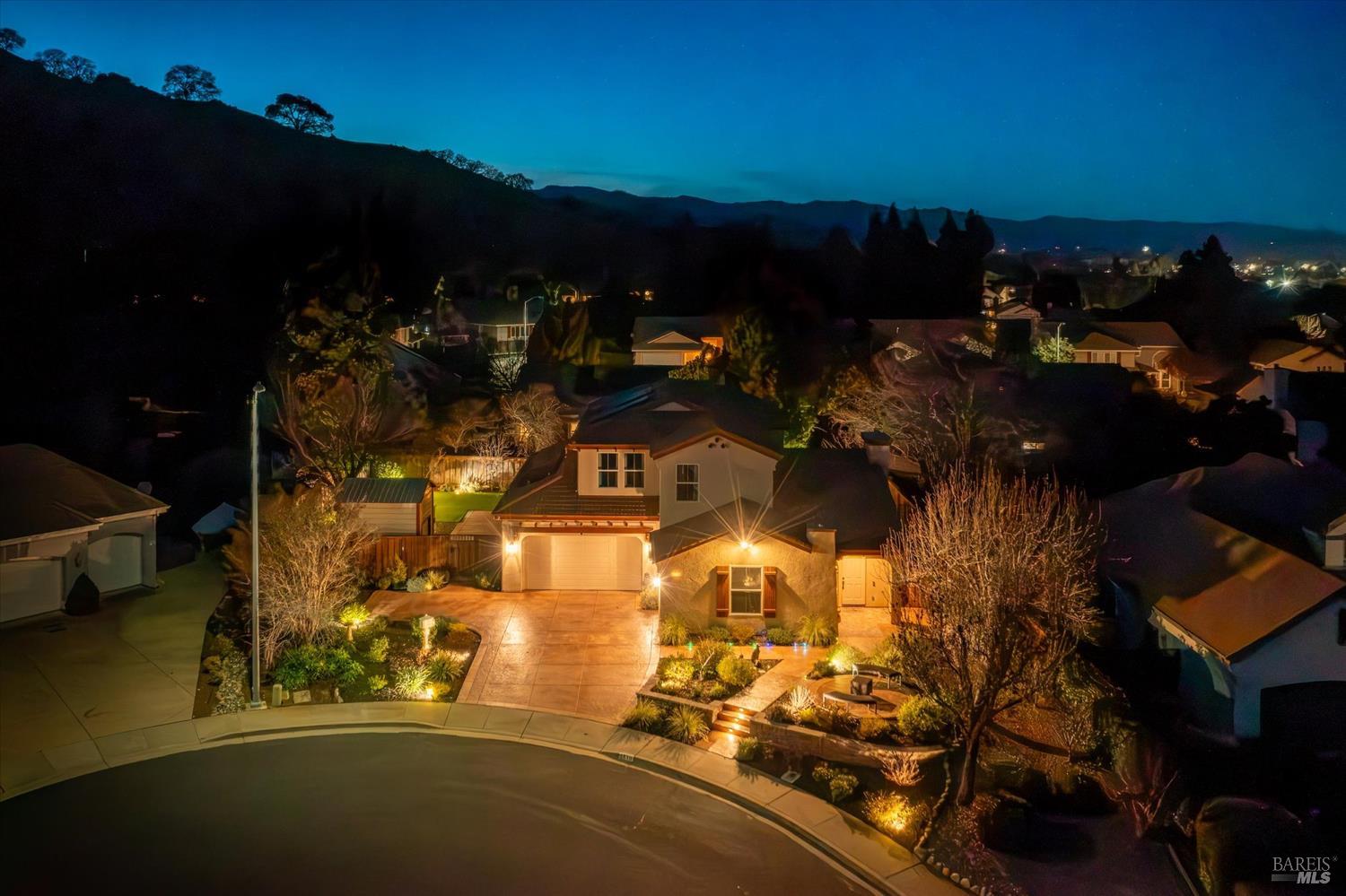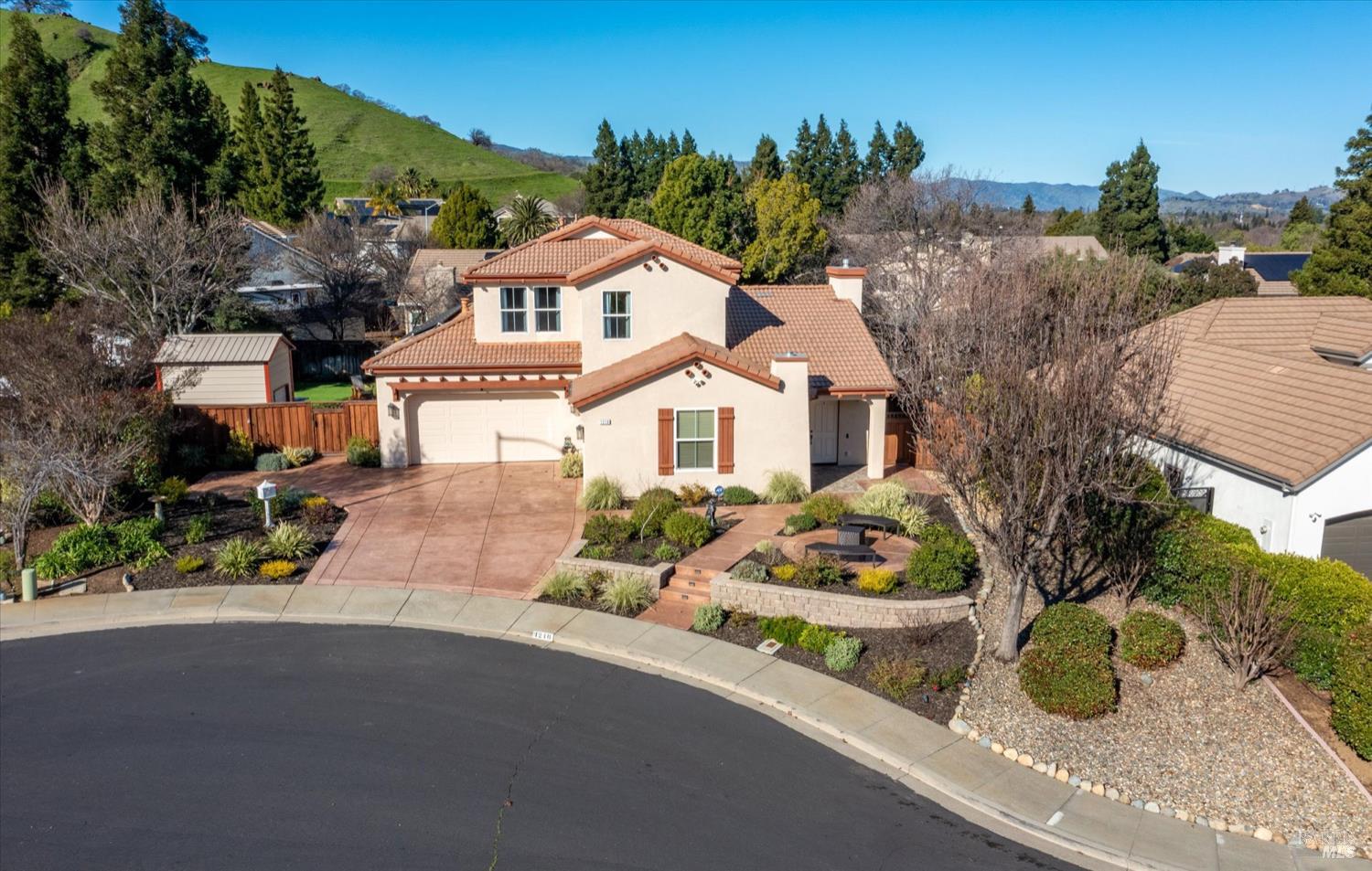 Executive-style living meets thoughtful design in this exceptional 4 bedroom 3 full bath home, ideally located at the end of a quiet court. A highly desirable downstairs bedroom and full bath offers flexibility for guests, multi-generational living, or a private home office. Enjoy breathtaking views of the surrounding hills from nearly every window, including the backyard-creating a serene backdrop for daily living and entertaining. The open, light-filled floor plan is complemented by the convenience of an upstairs laundry room and generous bedroom space throughout. The extra-large kitchen is a standout feature, designed for both everyday living and entertaining. It offers abundant cabinetry, generous counter space, extensive storage and spacious walk-in pantry-providing exceptional functionality rarely found. The kitchen opens seamlessly to the main living areas and back yard, all framed by breathtaking views of the surrounding hills. This home is enhanced with modern efficiencies, including Tesla batteries for back up energy storage, providing peace of mind and added value. The meticulous redesigned manicured lot showcases stamped concrete, custom nightscape lighting and an incredible custom freestanding shed, perfect for additional storage or hobby use. A 3 car garage adds practicality while the premium back-of-court location offers privacy and a sense of exclusivity. Combining elevated style, smart functionality and stunning surroundings, this home delivers executive living at its finest!