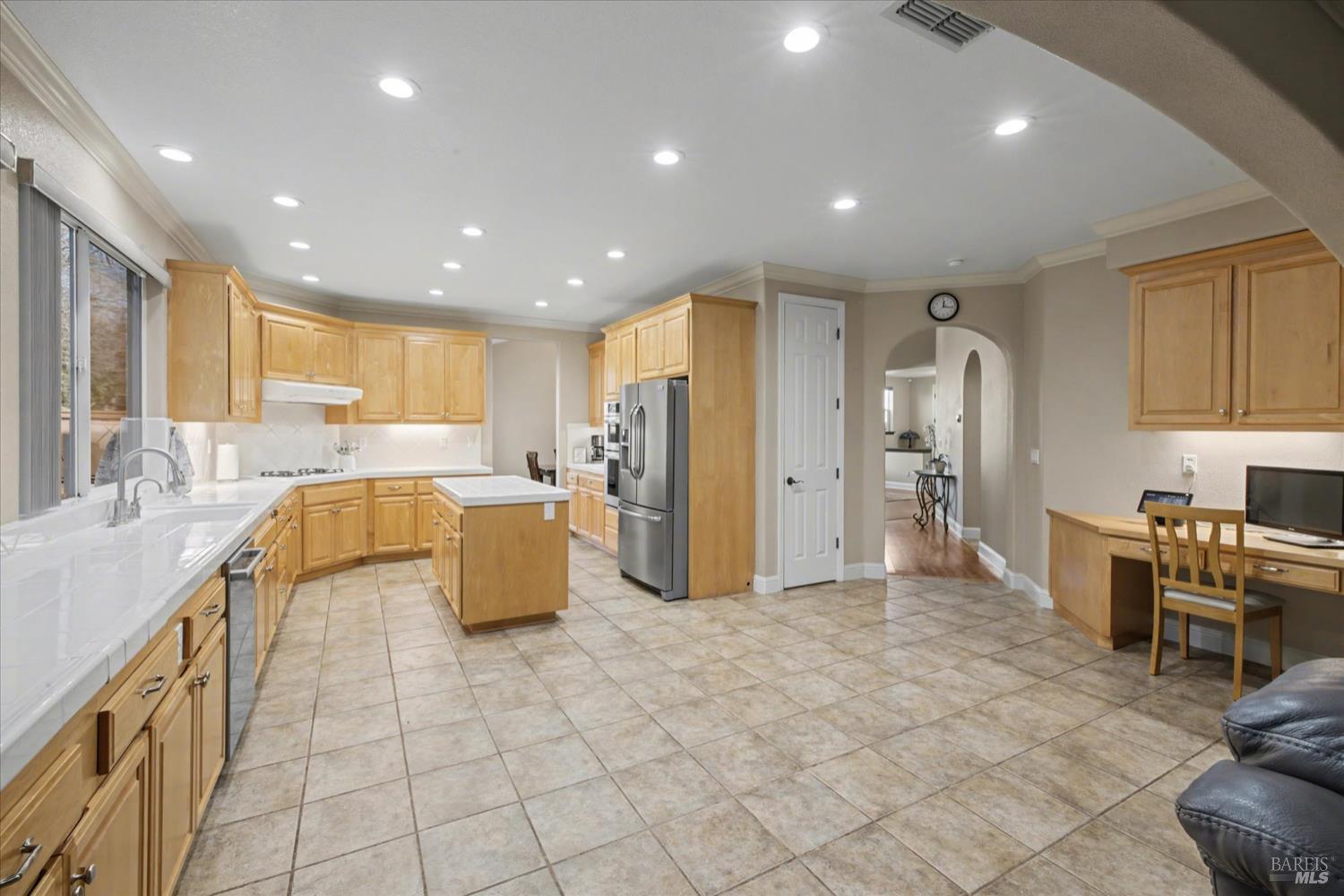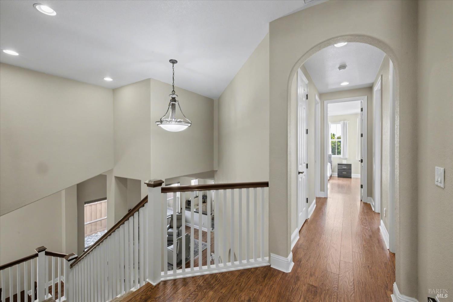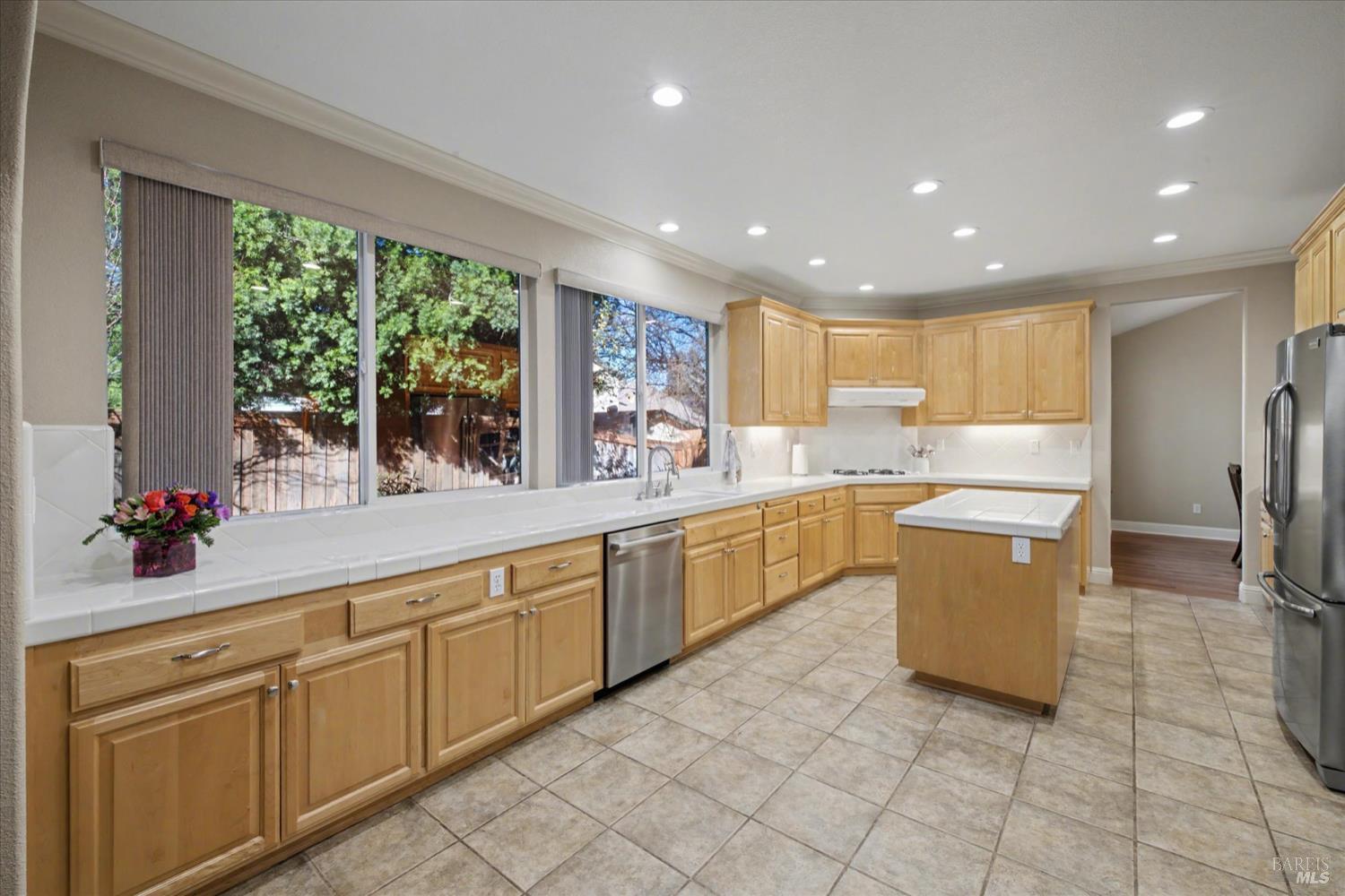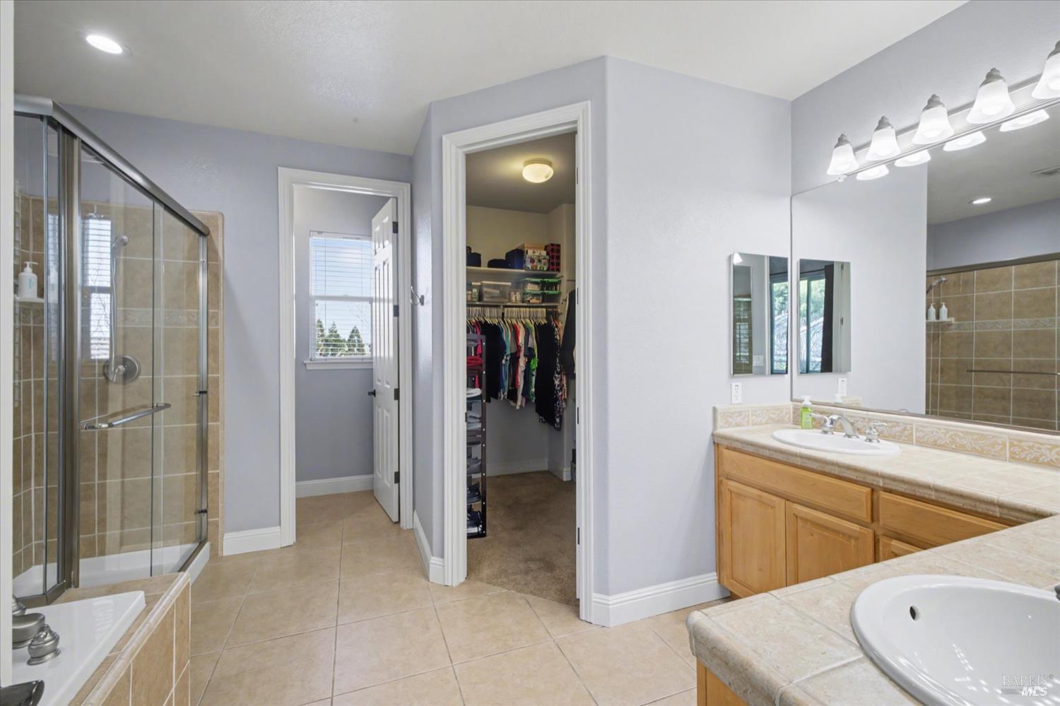 Executive-style living meets thoughtful design in this exceptional 4 bedroom 3 full bath home, ideally located at the end of a quiet court. A highly desirable downstairs bedroom and full bath offers flexibility for guests, multi-generational living, or a private home office. Enjoy breathtaking views of the surrounding hills from nearly every window, including the backyard-creating a serene backdrop for daily living and entertaining. The open, light-filled floor plan is complemented by the convenience of an upstairs laundry room and generous bedroom space throughout. The extra-large kitchen is a standout feature, designed for both everyday living and entertaining. It offers abundant cabinetry, generous counter space, extensive storage and spacious walk-in pantry-providing exceptional functionality rarely found. The kitchen opens seamlessly to the main living areas and back yard, all framed by breathtaking views of the surrounding hills. This home is enhanced with modern efficiencies, including Tesla batteries for back up energy storage, providing peace of mind and added value. The meticulous redesigned manicured lot showcases stamped concrete, custom nightscape lighting and an incredible custom freestanding shed, perfect for additional storage or hobby use. A 3 car garage adds practicality while the premium back-of-court location offers privacy and a sense of exclusivity. Combining elevated style, smart functionality and stunning surroundings, this home delivers executive living at its finest!