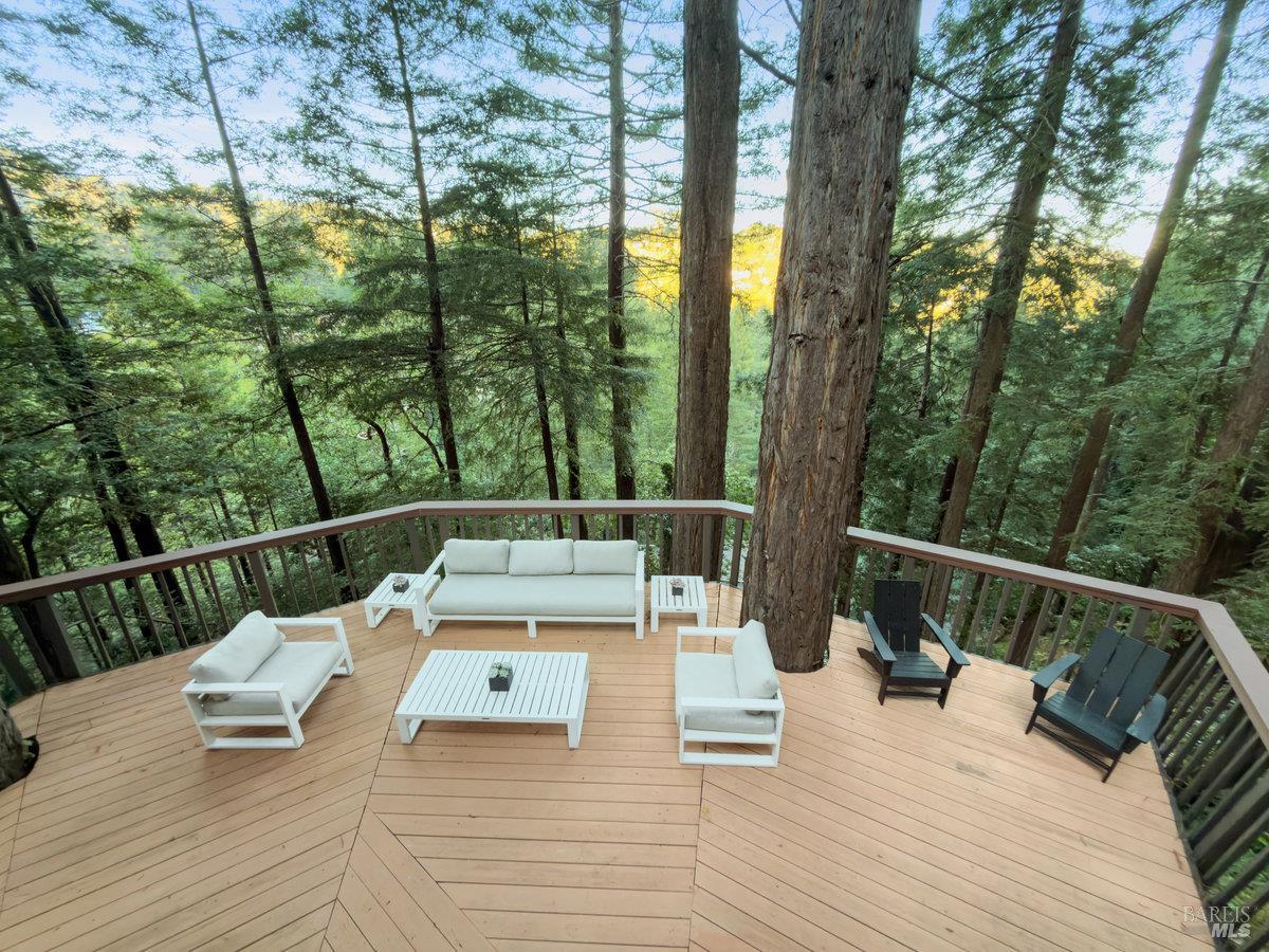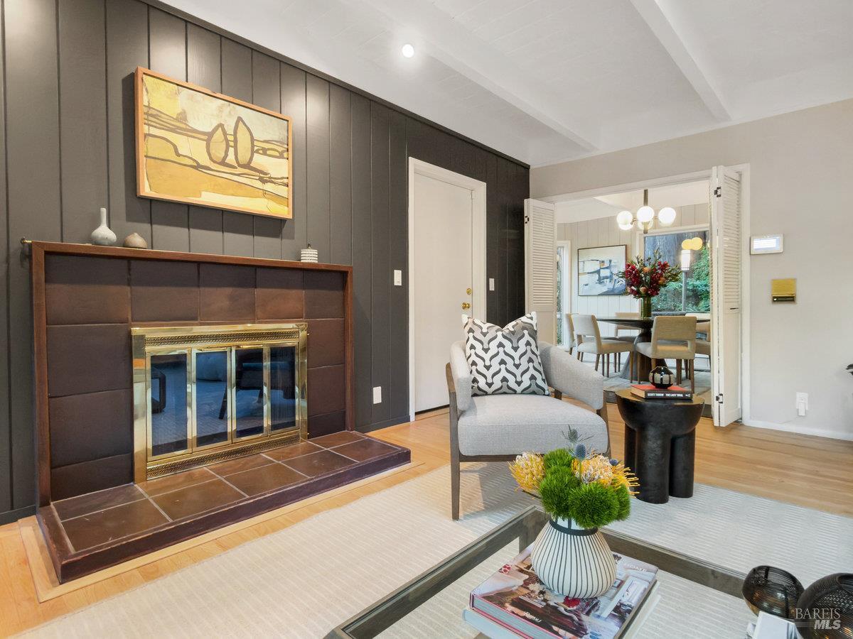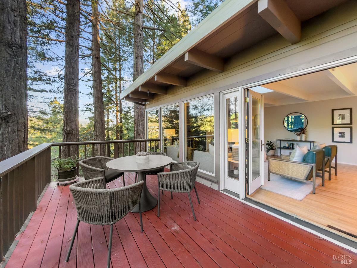 Architecturally distinctive 3BD/2BA residence on a rare street-to-street lot in stunning Mill Valley location. Main level features vaulted ceilings, skylights, wood floors, fireplace, adjacent living/dining flow, and updated kitchen. Large windows and glass doors frame serene redwood trees and mature garden views, providing abundant natural light and a strong connection to the surrounding landscape. French doors open to expansive wraparound decks ideal for indoor-outdoor living. The lower level includes den with wet bar, 3rd bedroom, full bath, and vintage sauna, direct access to additional deck ideal for in-law, guest, au pair, or possible primary suite. Meandering garden paths, custom recirculating stream and waterfall, exceptional privacy. Meticulously maintained with opportunity for personalization. Close to downtown, schools, trails.