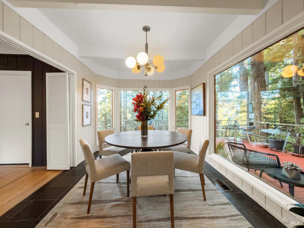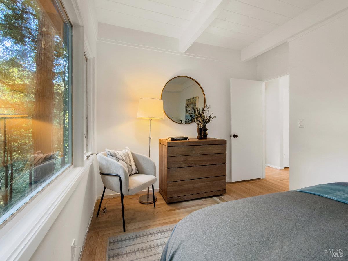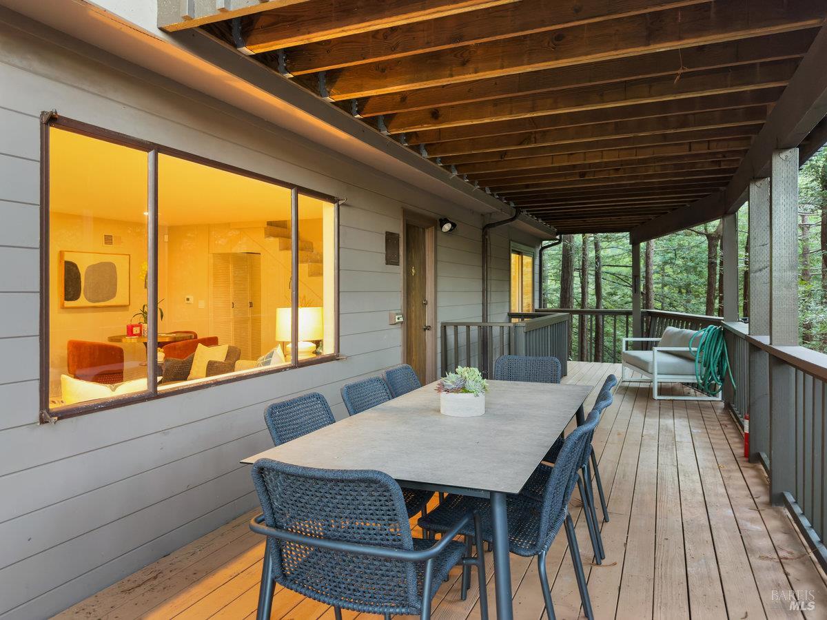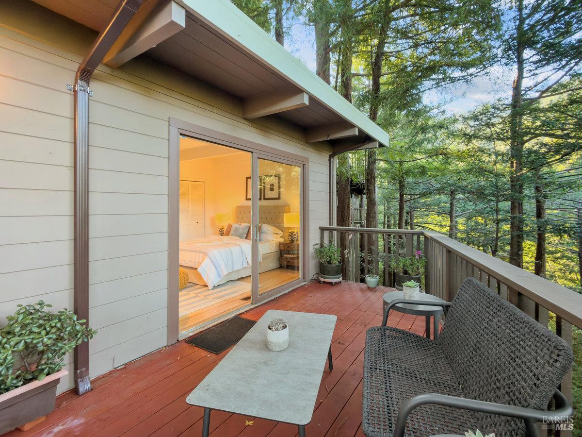 Architecturally distinctive 3BD/2BA residence on a rare street-to-street lot in stunning Mill Valley location. Main level features vaulted ceilings, skylights, wood floors, fireplace, adjacent living/dining flow, and updated kitchen. Large windows and glass doors frame serene redwood trees and mature garden views, providing abundant natural light and a strong connection to the surrounding landscape. French doors open to expansive wraparound decks ideal for indoor-outdoor living. The lower level includes den with wet bar, 3rd bedroom, full bath, and vintage sauna, direct access to additional deck ideal for in-law, guest, au pair, or possible primary suite. Meandering garden paths, custom recirculating stream and waterfall, exceptional privacy. Meticulously maintained with opportunity for personalization. Close to downtown, schools, trails.