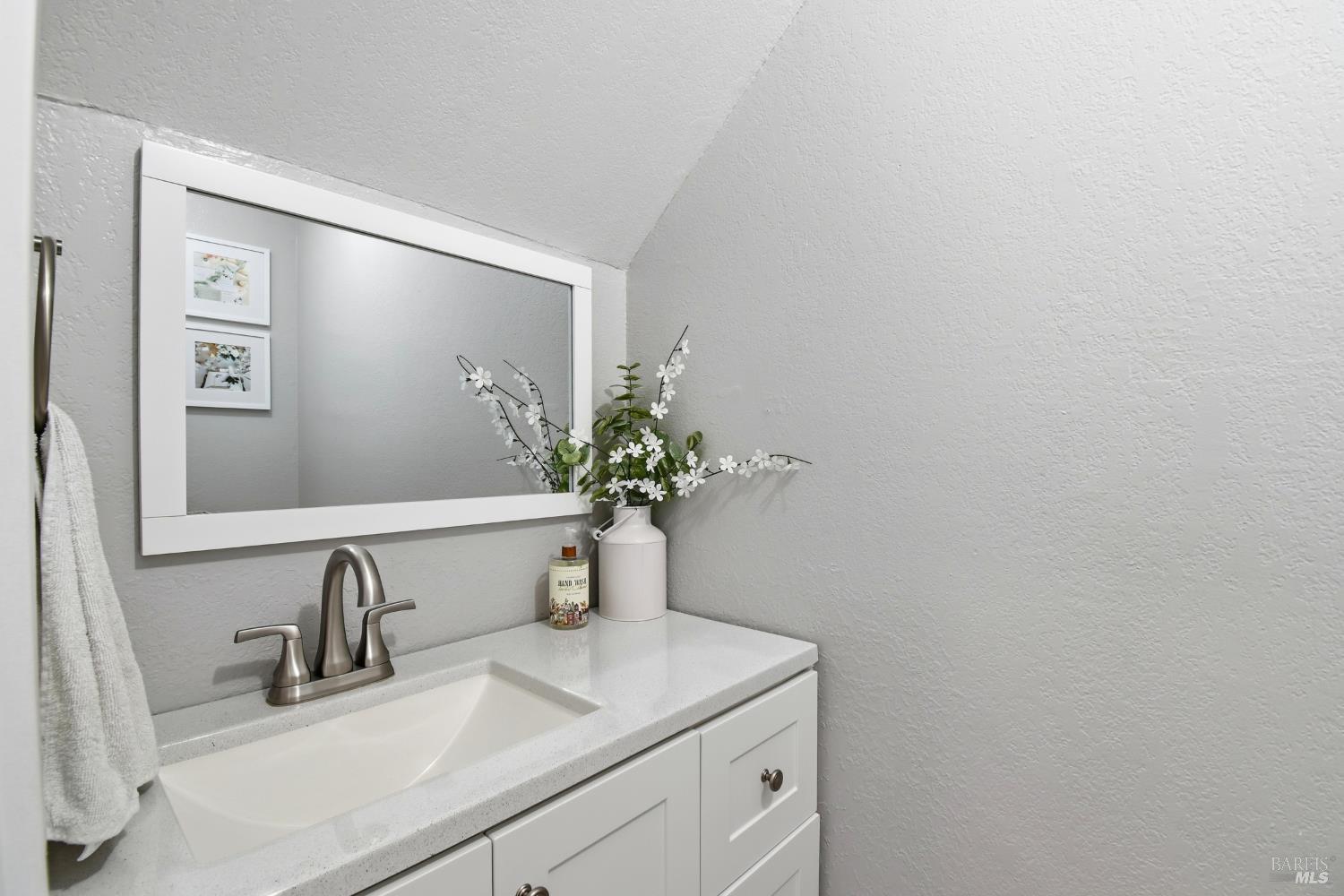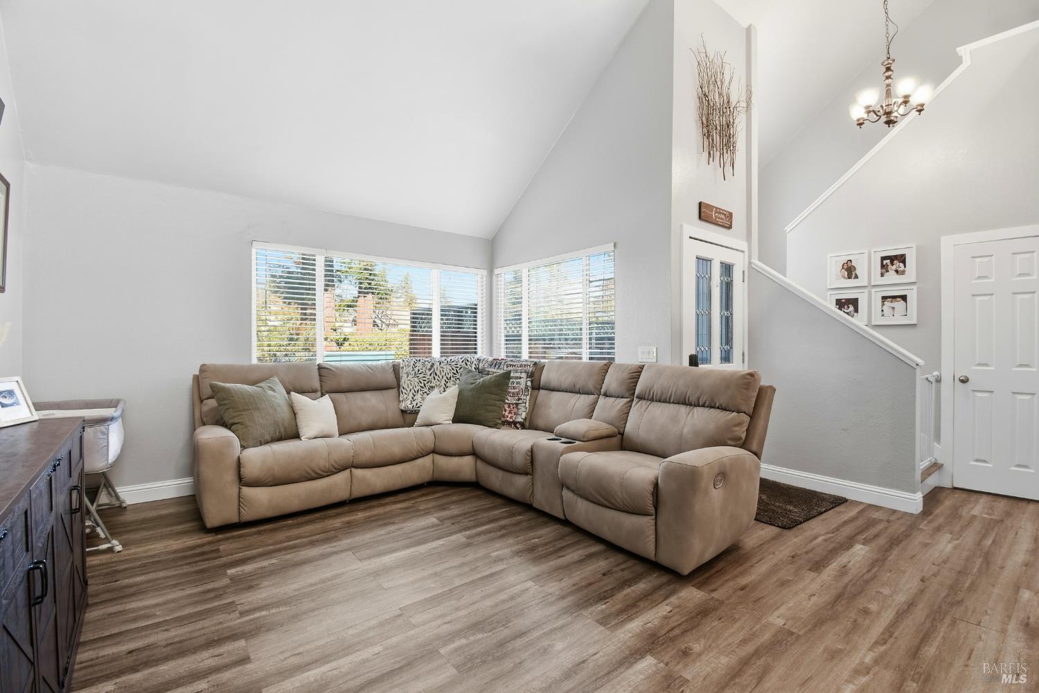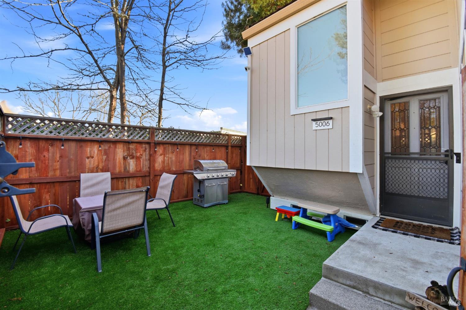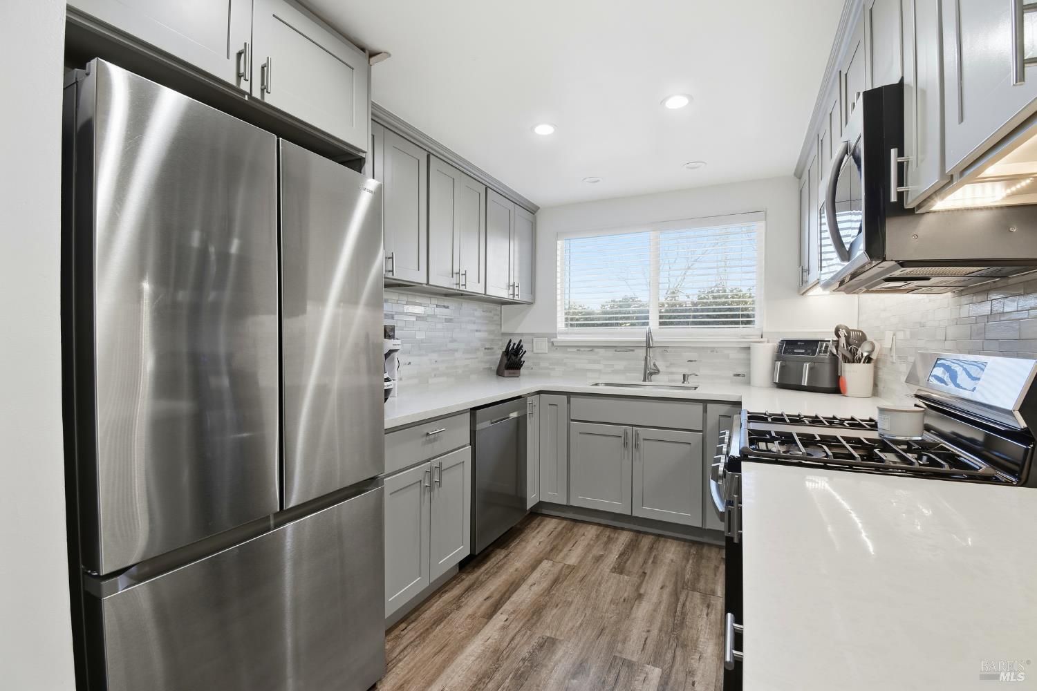 Excellent end-unit home in a great location, just a short distance to Foxtail Golf Course and Hahn Elementary School. Features include a newer dual-zone heating system and a remodeled kitchen with quartz countertops, tile backsplash, and newer stainless steel appliances. The home offers vinyl flooring throughout, recessed lighting, and soaring cathedral ceilings that enhance the open feel. The primary bedroom includes large mirrored closet doors, while an upstairs office space is highlighted by a skylight, ideal for working from home. The upstairs full bathroom features tile flooring, a double-sink vanity with quartz countertops, and a tub with decorative tile and a shower over. The downstairs one-half bath also includes tile flooring and a vanity with quartz countertops. Enjoy the private, enclosed front patio area with a newly built fence and turf decking, ideal for outdoor relaxation. The home also has a two-car garage. HOA dues are $650/monthly and this covers insurance on the structure, maintenance on the exterior, maintenance on the grounds, management, the roof, sewer, trash and water. Come check out your new home in Rohnert Park today!